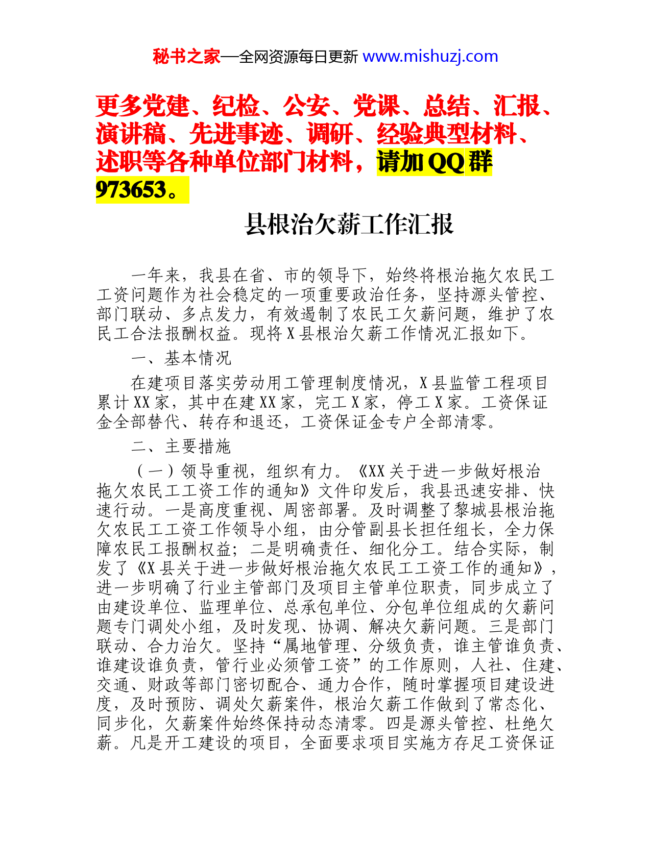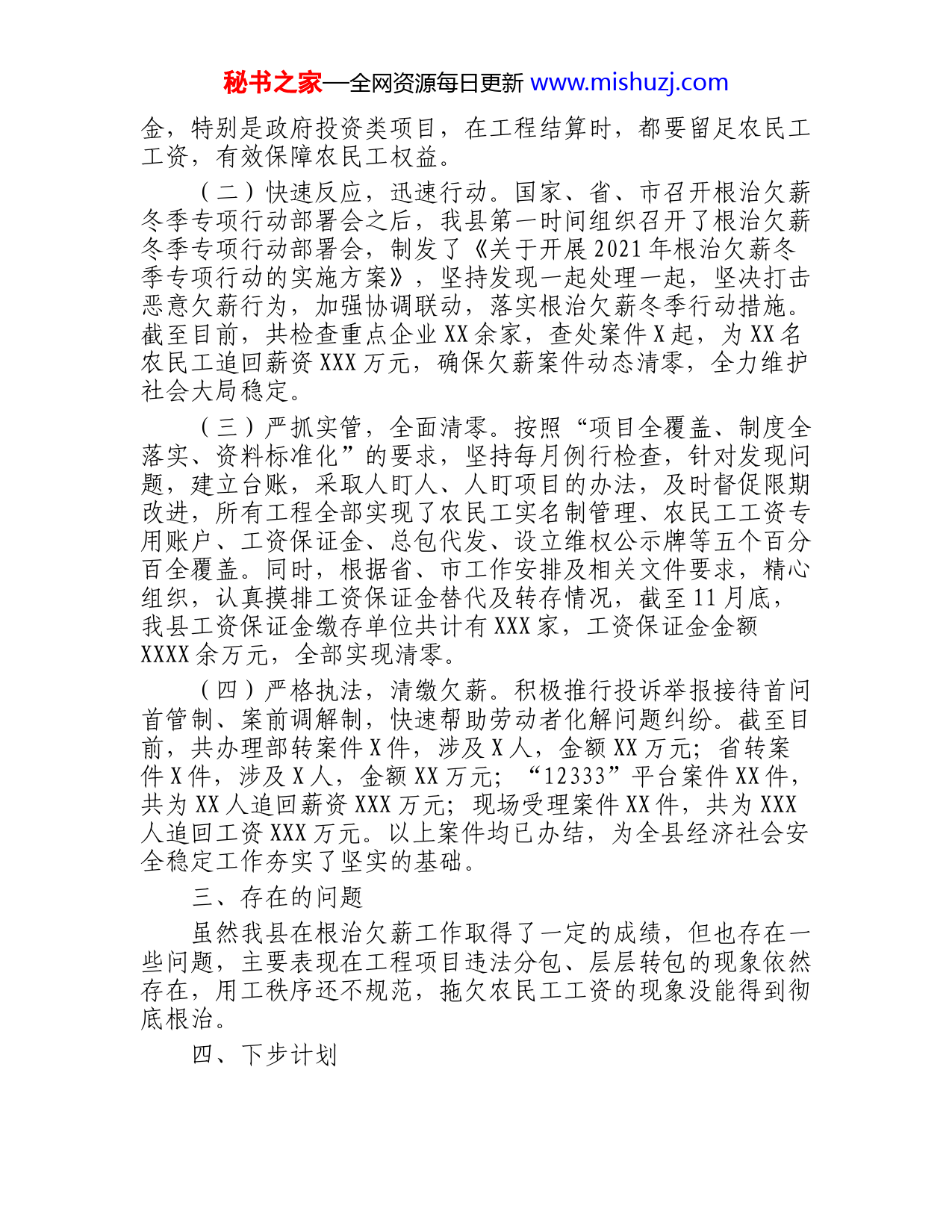 秘书之家—全网资源每日更新www.mishuzj.com更多党建、纪检、公安、党课、总结、汇报、演讲稿、先进事迹、调研、经验典型材料、述职等各种单位部门材料,请加QQ群973653。县根治欠薪工作汇报一年来,我县在省、市的领导下,始终将根治拖欠农民工工资问题作为社会稳定的一项重要政治任务,坚持源头管控、部门联动、多点发力,有效遏制了农民工欠薪问题,维护了农民工合法报酬权益。现将X县根治欠薪工作情况汇报如下。一、基本情况在建项目落实劳动用工管理制度情况,X县监管工程项目累计XX家,其中在建XX家,完工X家,停工X家。工资保证金全部替代、转存和退还,工资保证金专户全部清零。二、主要措施(一)领导重视,组织有力。《XX关于进一步做好根治拖欠农民工工资工作的通知》文件印发后,我县迅速安排、快速行动。一是高度重视、周密部署。及时调整了黎城县根治拖欠农民工工资工作领导小组,由分管副县长担任组长,全力保障农民工报酬权益;二是明确责任、细化分工。结合实际,制发了《X县关于进一步做好根治拖欠农民工工资工作的通知》,进一步明确了行业主管部门及项目主管单位职责,同步成立了由建设单位、监理单位、总承包单位、分包单位组成的欠薪问题专门调处小组,及时发现、协调、解决欠薪问题。三是部门联动、合力治欠。坚持“属地管理、分级负责,谁主管谁负责、谁建设谁负责,管行业必须管工资”的工作原则,人社、住建、交通、财政等部门密切配合、通力合作,随时掌握项目建设进度,及时预防、调处欠薪案件,根治欠薪工作做到了常态化、同步化,欠薪案件始终保持动态清零。四是源头管控、杜绝欠薪。凡是开工建设的项目,全面要求项目实施方存足工资保证秘书之家—全网资源每日更新www.mishuzj.com金,特别是政府投资类项目,在工程结算时,都要留足农民工工资,有效保障农民工权益。(二)快速反应,迅速行动。国家、省、市召开根治欠薪冬季专项行动部署会之后,我县第一时间组织召开了根治欠薪冬季专项行动部署会,制发了《关于开展2021年根治欠薪冬季专项行动的实施方案》,坚持发现一起处理一起,坚决打击恶意欠薪行为,加强协调联动,落实根治欠薪冬季行动措施。截至目前,共检查重点企业XX余家,查处案件X起,为XX名农民工追回薪资XXX万元,确保欠薪案件动态清零,全力维护社会大局稳定。(三)严抓实管,全面清零。按照“项目全覆盖、制度全落实、资料标准化”的要求,坚持每月例行检查,针对发现问题,建立台账,采取人盯人、人盯项目的办法,及时督促限期改进,所有工程全部实现了农民工实名制管理、农民工工资专用账户、工资保证金、总包代发、设立维权公示牌等五个百分百全覆盖。同时,根据省、市工作安排及相关文件要求,精心组织,认真摸排工资保证金替代及转存情况,截至11月底,我县工资保证金缴存单位共计有XXX家,工资保证金金额XXXX余万元,全部实现清零。(四)严格执法,清缴欠薪。积极推行投诉举报接待首问首管制、案前调解制,快速帮助劳动者化解问题纠纷。截至目前,共办理部转案件X件,涉及X人,金额XX万元;省转案件X件,涉及X人,金额XX万元;“12333”平台案件XX件,共为XX人追回薪资XXX万元;现场受理案件XX件,共为XXX人追回工资XXX万元。以上案件均已办结,为全县经济社会安全稳定工作夯实了坚实的基础。三、存在的问题虽然我县在根治欠薪工作取得了一定的成绩,但也存在一些问题,主要表现在工程项目违法分包、层层转包的现象依然存在,用工秩序还不规范,拖欠农民工工资的现象没能得到彻底根治。四、下步计划秘书之家—全网资源每日更新www.mishuzj.com年末是农民工欠薪案件高发阶段,我县将坚持以防范为主,综合治理,从源头上防止发生欠薪问题。结合我县实际,着重做好以下四方面工作:一是进一步加大排查力度。结合欠薪特点,治欠组成员单位联合执法,持续聚焦重点区域、重点企业、重点项目,开展欠薪隐患排查化解。对发现的风险隐患,分类精准施策,定人定岗定责,防止新的欠薪案件发生。二是进一步抓好执法监管。以推动保障农民工工资支付制度落实为抓手,下大力气抓好工程建设领域等源头治理工作,切实保障民工合法权益。三是进一步完善制度建设。加快建立健全根治欠薪工作制度建设,畅通农民工维权途径,严格落实根治欠新各项制度措施。四是进一步加强部门制约。按照国家拖欠农民工工资“黑名单”管理暂行办法开展联合惩戒,努力形成不敢欠薪、不能欠薪,不要欠薪的社会氛围。根治欠薪工作事关基层群众的切身利益,事关经济社会的稳定大局。我县将以此次汇报会为契机,坚定信心、持续发力,全面治欠保支,让广大农民工过上一个安心年、放心年。更多党建、纪检、公安、党课、总结、汇报、演讲稿、先进事迹、调研、经验典型材料、述职等各种单位部门材料,请加QQ群973653。