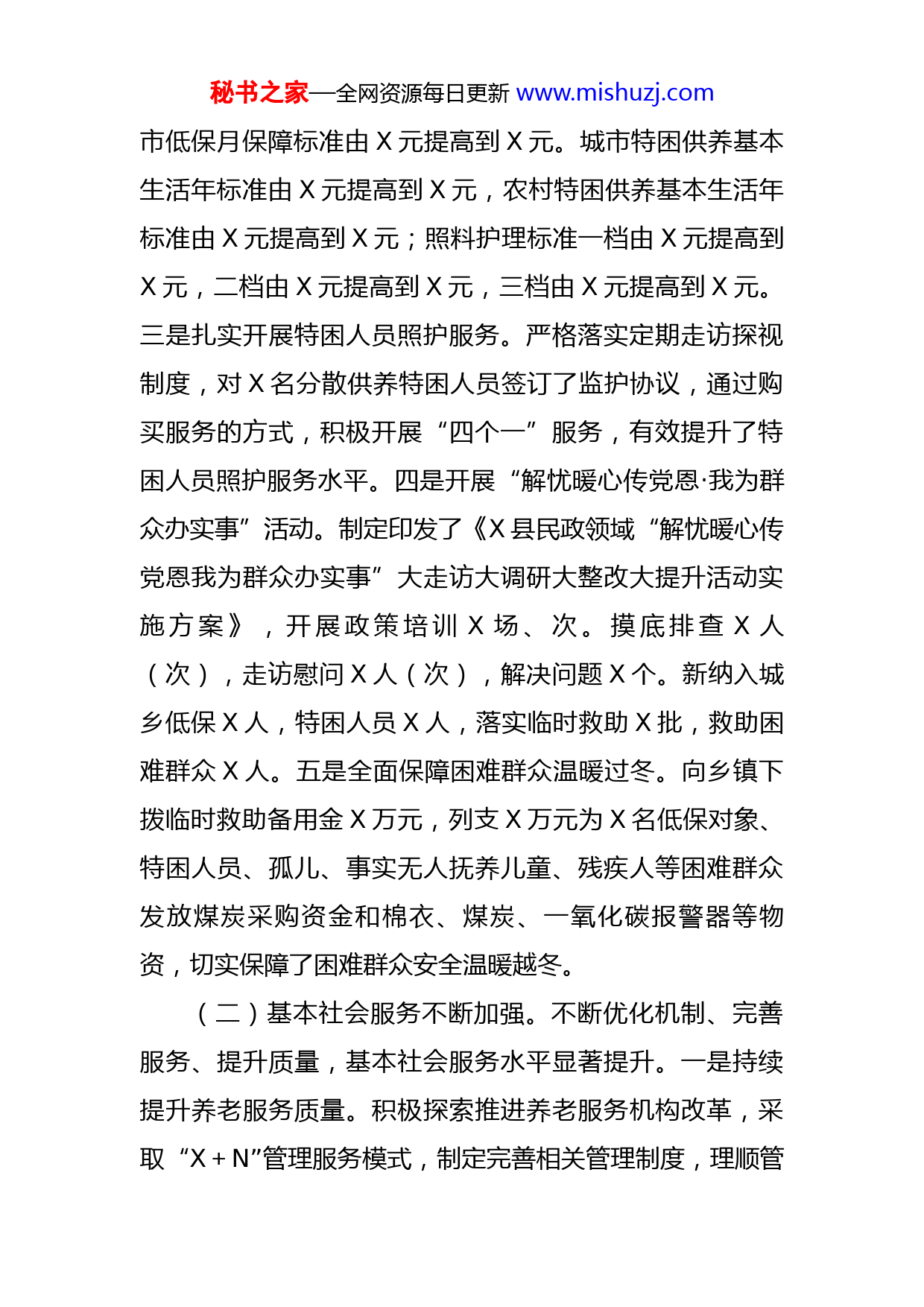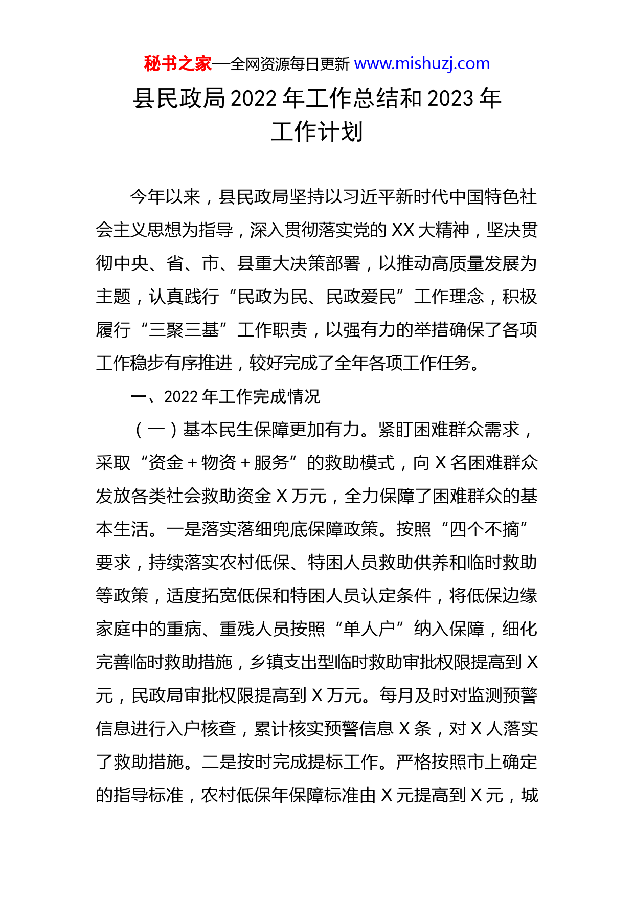 秘书之家—全网资源每日更新www.mishuzj.com县民政局2022年工作总结和2023年工作计划今年以来,县民政局坚持以习近平新时代中国特色社会主义思想为指导,深入贯彻落实党的XX大精神,坚决贯彻中央、省、市、县重大决策部署,以推动高质量发展为主题,认真践行“民政为民、民政爱民”工作理念,积极履行“三聚三基”工作职责,以强有力的举措确保了各项工作稳步有序推进,较好完成了全年各项工作任务。一、2022年工作完成情况(一)基本民生保障更加有力。紧盯困难群众需求,采取“资金+物资+服务”的救助模式,向X名困难群众发放各类社会救助资金X万元,全力保障了困难群众的基本生活。一是落实落细兜底保障政策。按照“四个不摘”要求,持续落实农村低保、特困人员救助供养和临时救助等政策,适度拓宽低保和特困人员认定条件,将低保边缘家庭中的重病、重残人员按照“单人户”纳入保障,细化完善临时救助措施,乡镇支出型临时救助审批权限提高到X元,民政局审批权限提高到X万元。每月及时对监测预警信息进行入户核查,累计核实预警信息X条,对X人落实了救助措施。二是按时完成提标工作。严格按照市上确定的指导标准,农村低保年保障标准由X元提高到X元,城秘书之家—全网资源每日更新www.mishuzj.com市低保月保障标准由X元提高到X元。城市特困供养基本生活年标准由X元提高到X元,农村特困供养基本生活年标准由X元提高到X元;照料护理标准一档由X元提高到X元,二档由X元提高到X元,三档由X元提高到X元。三是扎实开展特困人员照护服务。严格落实定期走访探视制度,对X名分散供养特困人员签订了监护协议,通过购买服务的方式,积极开展“四个一”服务,有效提升了特困人员照护服务水平。四是开展“解忧暖心传党恩·我为群众办实事”活动。制定印发了《X县民政领域“解忧暖心传党恩我为群众办实事”大走访大调研大整改大提升活动实施方案》,开展政策培训X场、次。摸底排查X人(次),走访慰问X人(次),解决问题X个。新纳入城乡低保X人,特困人员X人,落实临时救助X批,救助困难群众X人。五是全面保障困难群众温暖过冬。向乡镇下拨临时救助备用金X万元,列支X万元为X名低保对象、特困人员、孤儿、事实无人抚养儿童、残疾人等困难群众发放煤炭采购资金和棉衣、煤炭、一氧化碳报警器等物资,切实保障了困难群众安全温暖越冬。(二)基本社会服务不断加强。不断优化机制、完善服务、提升质量,基本社会服务水平显著提升。一是持续提升养老服务质量。积极探索推进养老服务机构改革,采取“X+N”管理服务模式,制定完善相关管理制度,理顺管秘书之家—全网资源每日更新www.mishuzj.com理体制。核调工作人员X名,加大政府购买服务力度,充实服务人员X名,对集中供养特困人员开展日常服务,完成养老护理员岗前培训X名。积极探索“智慧民政”服务模式,筹措资金X多万元,建成集居家养老、社区养老、机构养老、智能照护、社会救助等为一体的“智慧民政”平台。二是全面规范婚姻登记管理。严格落实婚姻登记员持证上岗制度、婚姻登记告知制度,补录历史数据X条,配备高拍设备,推进“互联网+婚姻服务”,健全完善婚姻登记信息系统功能,进一步提升部门间信息共享质量和水平,为实现婚姻登记“跨省通办”奠定基础。三是及时整改殡葬领域问题。督查反馈的X县怀宝山公墓建设有关问题即将整改完成,项目已经省民政厅批复,正在办理土地招拍挂相关手续。及时召开全县专项整治工作会议,印发工作方案,整肃殡葬服务市场秩序,履行监管责任。四是不断强化特殊困难群体关爱。深入贯彻国家、省市会议精神,及时成立了县未成年人保护工作领导小组并召开第一次全体会议,印发了《X县未成年人保护工作领导小组工作规则》等X个文件。(三)基层社会治理能力持续提升。发挥党建引领优势,联动社会各方力量,深入推进基层治理创新。一是基层治理效能不断增强。修订完善城乡社区自治章程、村规民约和社区公约。努力推动城市基层党建“X+X”文件任务秘书之家—全网资源每日更新www.mishuzj.com落实,制定了社区优化调整方案并经县政府批复印发实施。二是社会组织健康有序发展。建成X县社会组织共享党群服务中心。联合行业主管单位对全县X个社会组织进行了专项监督检查,注销社会组织X家。目前,共有社会组织X个,党支部X个。三是加强流浪乞讨人员救助管理。扎实推进生活无着流浪乞讨人员救助管理服务质量大提升专项行动深入开展,制定印发了《X县流浪乞讨人员救助管理工作联席会议制度》,开展街面巡查和综合治理行动,实施救助、送返流浪乞讨人员共X人(次)。其中:护送返乡X人,购票返乡X人,解决户籍安置X人,纳入特困供养X人,给予生活救助X人。四是社工站建设有序稳妥推进。研究制定了《X县城市社区社会工作服务站省级试点工作实施方案》,积极申报建设中街、北街社区X个社工站。(四)民政基础设施建设持续推进。坚持把民政基础设施建设作为推进工作的重要抓手,按照“重点突破、补齐短板、统筹谋划、统一标准、定位清晰、职责明确”的原则,精心编制《X县“十四五”民政事业发展规划》,将初步谋划的重点项目申报纳入全市“十四五”民政事业发展规划。积极申报X县养老服务中心、X县养老机构消防安全改造提升