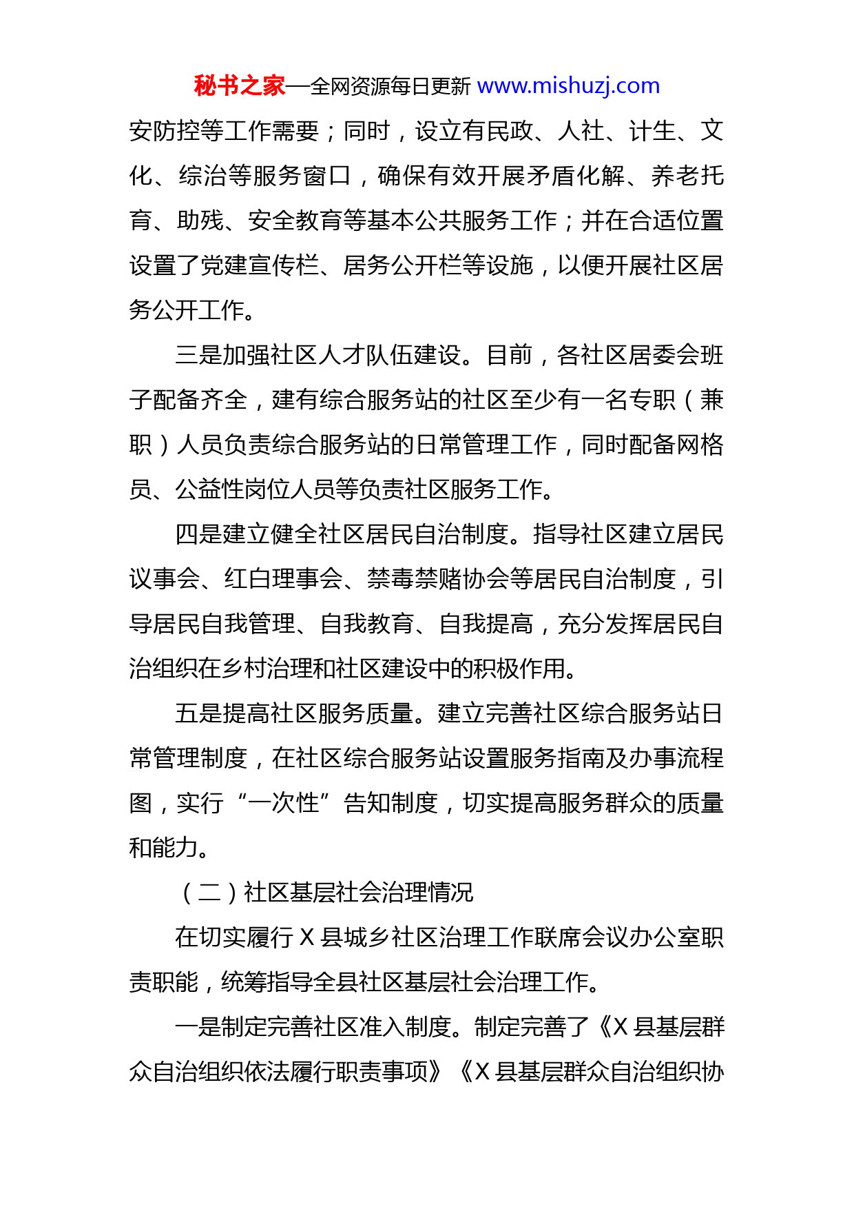 秘书之家—全网资源每日更新www.mishuzj.com县民政局城市基层党建工作开展情况汇报根据会议安排,现将县民政局关于社区基层治理等方面的工作情况汇报如下:一、工作职责根据《中共X县委组织部关于印发的通知》文件要求,县民政局主要职责有:“指导城市社区居委会换届选举,抓好居委会规范化建设,制定社区准入制度和减负增效清单;抓好易地扶贫搬迁新市民社区化公共服务有关工作”等方面。二、工作开展情况(一)居委会规范化建设情况一是规范基层群众自治组织机构设置。对在居委会设立的工作机构和加挂的各种牌子进行规范清理,指导社区居委会做好居务监督委员会、综治维稳信访工作站、服务中心、警务室、计生服务站及相关职能部门需加挂的其他标识牌的规范设置工作。二是推进社区机构规范化建设。截止目前,在全县X个城市社区中,除城北社区、河东社区未实行规范化建设外,其他X个城市社区综合服务站面积不低于每百户X平方米,并配有标准的服务台及必备的办公设施,基本满足开展社区党建、社区服务、社区就业、社区文化、社区治秘书之家—全网资源每日更新www.mishuzj.com安防控等工作需要;同时,设立有民政、人社、计生、文化、综治等服务窗口,确保有效开展矛盾化解、养老托育、助残、安全教育等基本公共服务工作;并在合适位置设置了党建宣传栏、居务公开栏等设施,以便开展社区居务公开工作。三是加强社区人才队伍建设。目前,各社区居委会班子配备齐全,建有综合服务站的社区至少有一名专职(兼职)人员负责综合服务站的日常管理工作,同时配备网格员、公益性岗位人员等负责社区服务工作。四是建立健全社区居民自治制度。指导社区建立居民议事会、红白理事会、禁毒禁赌协会等居民自治制度,引导居民自我管理、自我教育、自我提高,充分发挥居民自治组织在乡村治理和社区建设中的积极作用。五是提高社区服务质量。建立完善社区综合服务站日常管理制度,在社区综合服务站设置服务指南及办事流程图,实行“一次性”告知制度,切实提高服务群众的质量和能力。(二)社区基层社会治理情况在切实履行X县城乡社区治理工作联席会议办公室职责职能,统筹指导全县社区基层社会治理工作。一是制定完善社区准入制度。制定完善了《X县基层群众自治组织依法履行职责事项》《X县基层群众自治组织协秘书之家—全网资源每日更新www.mishuzj.com助政府工作事项》“两清单”,明确社区基层群众自治组织职责,规范行政行为,确保基层群众自治组织职责清晰、权责一致,切实保障基层群众自治权利。充分发挥基层群众自治组织的能力作用,全面清理基层群众自治组织承担的不合理负担,不断提升城市社区治理能力水平。二是制定完善社区减负增效清单。制定了《X县社区公共服务指导目录》《X县社区代办政务指导目录》“两目录”,从服务项目、法律依据、服务内容和政策规定、责任部门方面作了明确的规定。其中,《X县社区公共服务指导目录》有X项事务,《X县社区代办政务服务指导目录》有X项代办政务服务,涉及有卫生健康服务、社会服务、就业和社会保险服务、农业生产服务、公共安全服务,文化、体育、教育服务,人居环境服务六大类的内容。三是建立健全社区准入退出监管制度。明确社区居委会“两项清单”中的工作职责,对有关部门未纳入“两项清单”内容,又确实需要基层群众自治组织协助办理的事项,建立一套完整的准入退出监管制度,严格按照申请、核准、退出、监督管理的程序办理,经审批同意后方可进入。(三)易地扶贫搬迁新市民社区公共服务有关工作情况秘书之家—全网资源每日更新www.mishuzj.com一是严格按照相关要求,抓好易地扶贫搬迁新市民的后续保障工作,确保符合保障条件的新市民应保尽保,应救尽救。截止X年X月,全县易地扶贫搬迁新市民中,在册享受安置地城低保的共有X户X人,其中脱贫户X人(脱贫不稳定户X人),边缘易致贫户X人;享受新市民特困供养政策的有X人;享受孤困儿童生活救助的共有孤儿X人、事实无人抚养儿童X人;实施临时救助的共有X户X人;享受新市民高龄津贴的共有X人;享受重度残疾人护理补贴政策的共有X户X人。二是推进新市民普惠殡葬服务建设。重新修订完善《X县惠民殡葬保障(暂行)实施办法》,将易地扶贫搬迁新市民纳入殡葬普惠减免(补助)范畴,对辖区内符合条件的新市民,减免其遗体接运费、集中治丧点灵堂租用费、遗体冷藏费等。三是积极引进外地社会组织进入新市民社区开展社会工作,同时培育本地社工组织。X年,引进了贵阳市云岩区合一社会工作服务中心在蟠桃园社区建设社工作站,社工站内配有项目负责人X名,项目社工X名,志愿者X人,以X第二届善行贵州公益项目大赛活动资金为支持,运用优势视角和增能赋权等理论对蟠桃园社区的老年人、妇女、儿童、残疾人和低保贫困户开展服务,促进新市民社区的和谐发展。截止X年X月,该社工站通过发动社区居秘书之家—全网资源每日更新www.mishuzj.com民加入社会组织,在街道备案成立的社区社会组织共有X个,已初步构建社区与外部的互助体系,完成了社区社会组织特定人群服务X项,参与社区社会决策X个案例,开展活动X余次,受益人数已达到X多人。X年X月,我县正在筹备建立本土社会工作服务机构,即“X县意佳社
