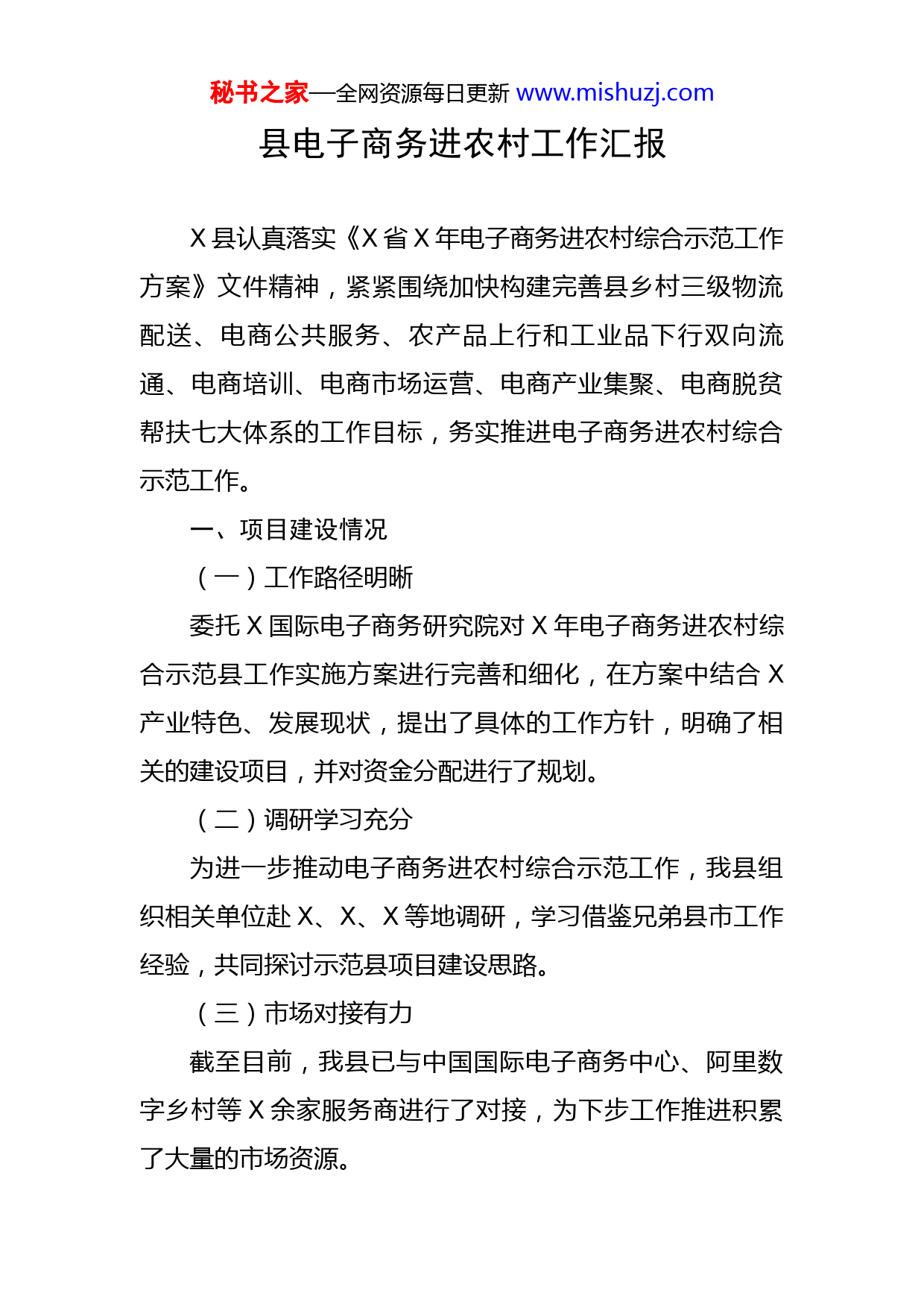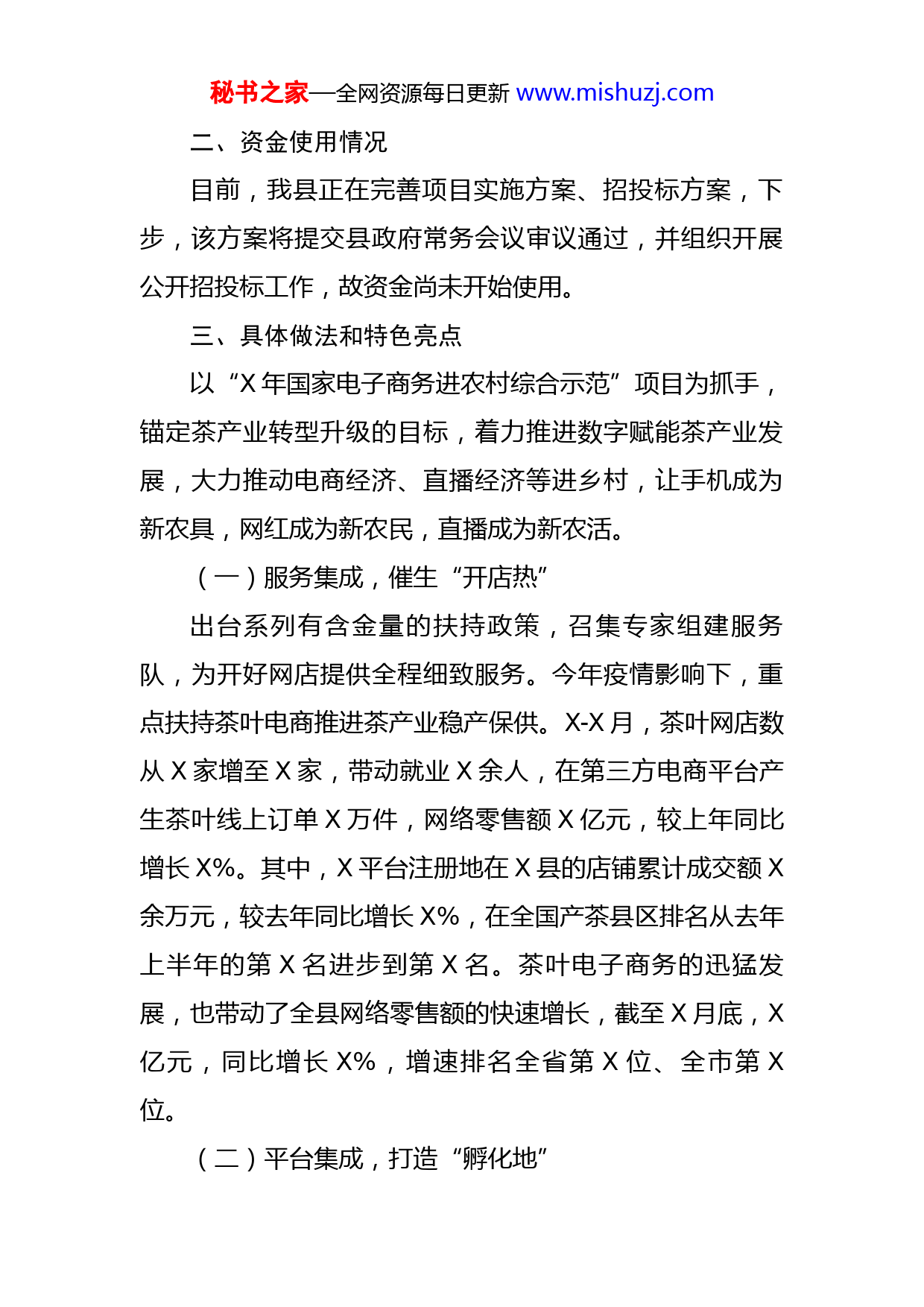秘书之家—全网资源每日更新www.mishuzj.com县电子商务进农村工作汇报X县认真落实《X省X年电子商务进农村综合示范工作方案》文件精神,紧紧围绕加快构建完善县乡村三级物流配送、电商公共服务、农产品上行和工业品下行双向流通、电商培训、电商市场运营、电商产业集聚、电商脱贫帮扶七大体系的工作目标,务实推进电子商务进农村综合示范工作。一、项目建设情况(一)工作路径明晰委托X国际电子商务研究院对X年电子商务进农村综合示范县工作实施方案进行完善和细化,在方案中结合X产业特色、发展现状,提出了具体的工作方针,明确了相关的建设项目,并对资金分配进行了规划。(二)调研学习充分为进一步推动电子商务进农村综合示范工作,我县组织相关单位赴X、X、X等地调研,学习借鉴兄弟县市工作经验,共同探讨示范县项目建设思路。(三)市场对接有力截至目前,我县已与中国国际电子商务中心、阿里数字乡村等X余家服务商进行了对接,为下步工作推进积累了大量的市场资源。秘书之家—全网资源每日更新www.mishuzj.com二、资金使用情况目前,我县正在完善项目实施方案、招投标方案,下步,该方案将提交县政府常务会议审议通过,并组织开展公开招投标工作,故资金尚未开始使用。三、具体做法和特色亮点以“X年国家电子商务进农村综合示范”项目为抓手,锚定茶产业转型升级的目标,着力推进数字赋能茶产业发展,大力推动电商经济、直播经济等进乡村,让手机成为新农具,网红成为新农民,直播成为新农活。(一)服务集成,催生“开店热”出台系列有含金量的扶持政策,召集专家组建服务队,为开好网店提供全程细致服务。今年疫情影响下,重点扶持茶叶电商推进茶产业稳产保供。X-X月,茶叶网店数从X家增至X家,带动就业X余人,在第三方电商平台产生茶叶线上订单X万件,网络零售额X亿元,较上年同比增长X%。其中,X平台注册地在X县的店铺累计成交额X余万元,较去年同比增长X%,在全国产茶县区排名从去年上半年的第X名进步到第X名。茶叶电子商务的迅猛发展,也带动了全县网络零售额的快速增长,截至X月底,X亿元,同比增长X%,增速排名全省第X位、全市第X位。(二)平台集成,打造“孵化地”秘书之家—全网资源每日更新www.mishuzj.com打造X个电商集聚发展平台,建筑面积达X万平方米,规模居XX第一,政府给予场地租金、装修、宽带等补助,共集聚网店X余家,直接带动就业X余人。一批电商企业脱颖而出,成为行业龙头,如拼多多平台绿茶类目中,X绿茶占总销量的X%以上,销量前十茶企中X占据X席,其中X公司位居榜首。同时,积极培育人才孵化平台,建立电子商务创业导师团,开展多形式农村电商人才培训,累计完成电子商务各类培训X余人次,举办青年创业项目大赛等活动X余场。一批优秀青年成为全国典范,X、X获评中国农村电商致富带头人,X获评全国农村青年致富带头人。(三)节会集成,提升“人气值”为进一步扩宽销售渠道,提升X香茶品牌影响力,降低疫情对茶产业造成的不利影响,X县积极把握直播经济新机遇、抢抓直播带货新风口,先后组织开展“第X届中国(国际)茶商大会·X香茶网络茶叶节”、“X春茶节X香茶专场”、“淘宝村播计划·县长来了”、“中秋有礼·X特色产品专场”等直播活动,累计曝光率X亿多次,在线观看人数X万,带动农产品销售X万元。“X香茶”成为X茶叶类目全网首例通过线上联动也是首次最快的地标名片打造案例。目前,全县茶叶直播电商有X余家,X成为阿里全省首批“淘宝直播村播学院”共建单位。X茶叶市场成秘书之家—全网资源每日更新www.mishuzj.com为新兴直播基地,每个集市日有X余人直播带货,日均销售茶叶X万余斤,销售额X余万元,其中,X的茶青、干茶销售单价增长X%,有力地促进了农民增收。四、存在的问题(一)人才支撑力量薄弱在推进电子商务进农村综合示范项目过程中,具有专业知识和实践经验,能为项目建设提高专业指导、业务咨询、第三方服务的专家咨询力量紧缺。同时,在我县能够承接项目建设的企业、人才缺乏,项目建设不能很好的与县域产业发展相结合、共促进。(二)县域特色彰显不足就该项目而言,现有的工作模式、项目体系、成功经验,大多数是在中西部省份产生的,与我省、我县电子商务发展水平匹配度不高,难以展现县域电商经济发展特色,急需探讨出一条符合我省发展特色的国家电子商务进农村综合示范项目建设路径。(三)资金使用方向不明对于项目资金使用,尚未有细化的使用方向,导致项目推进过程中顾虑大,建议省商务厅出台更加细化的资金使用方向文件,更好的指导县市区推进项目建设。五、下步工作思路和目标(一)务实推进项目建设秘书之家—全网资源每日更新www.mishuzj.com计划于X年一季度完成项目实施方案、招投标方案提交县政府常务会议审议通过;二季度完成项目招投标,确定承建商;三季度开展项目建设;四季度完成项目中期建设主要目标,并总结提炼项目建设经验。(二)确定项目建设方案计划将项目分为公共服务体系建设、市场体系建设两个子项目进行公开招投标,分别确定两个项目承建商进行建设。其中:公共服务体系建设包含:农村电商公共服务体系、电子商务培训体系建设、电子商务直播中心基地、电子商务大数据中心;市场体系建设包含:农产品上行及工业品下行体系、农村电子商务市场