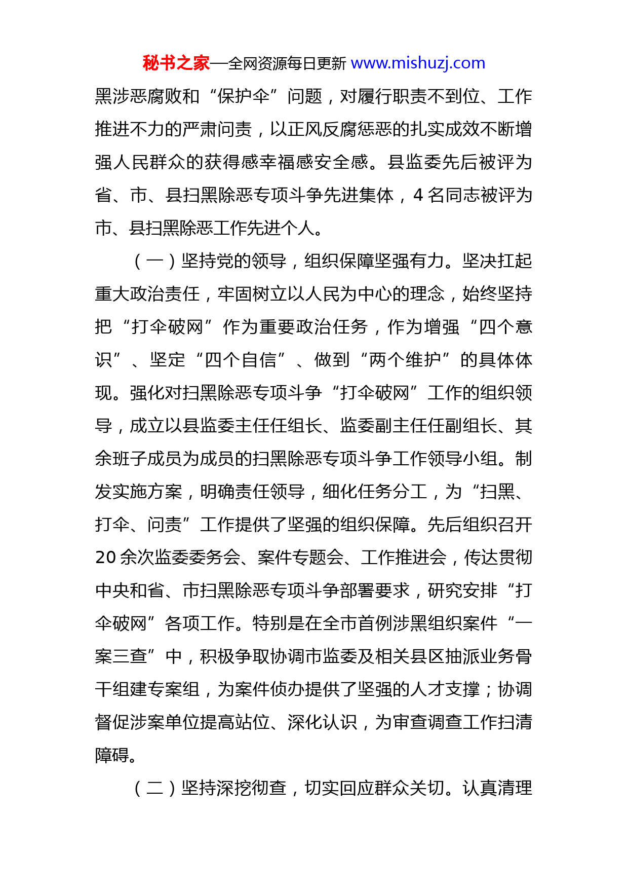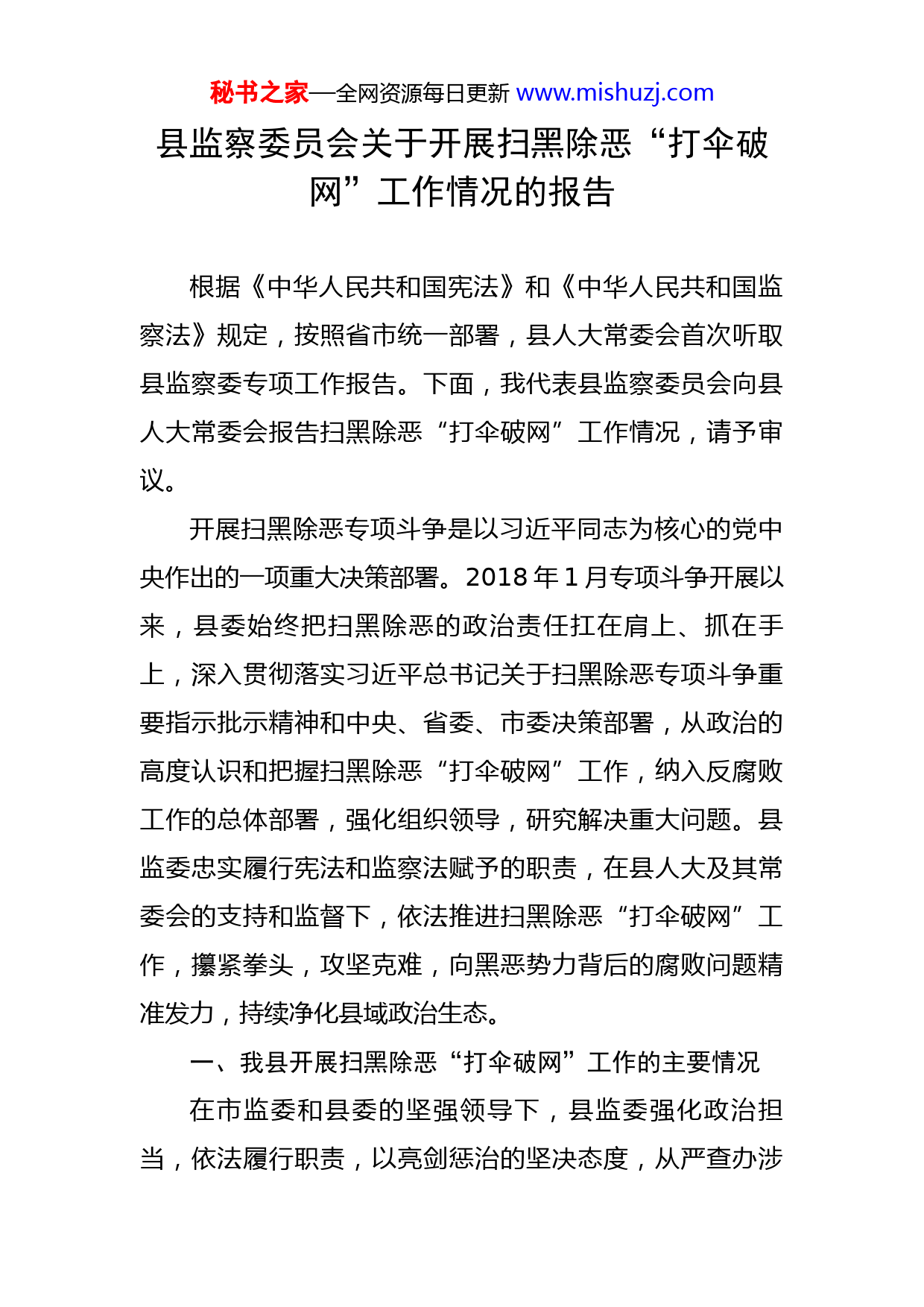 秘书之家—全网资源每日更新www.mishuzj.com县监察委员会关于开展扫黑除恶“打伞破网”工作情况的报告根据《中华人民共和国宪法》和《中华人民共和国监察法》规定,按照省市统一部署,县人大常委会首次听取县监察委专项工作报告。下面,我代表县监察委员会向县人大常委会报告扫黑除恶“打伞破网”工作情况,请予审议。开展扫黑除恶专项斗争是以习近平同志为核心的党中央作出的一项重大决策部署。2018年1月专项斗争开展以来,县委始终把扫黑除恶的政治责任扛在肩上、抓在手上,深入贯彻落实习近平总书记关于扫黑除恶专项斗争重要指示批示精神和中央、省委、市委决策部署,从政治的高度认识和把握扫黑除恶“打伞破网”工作,纳入反腐败工作的总体部署,强化组织领导,研究解决重大问题。县监委忠实履行宪法和监察法赋予的职责,在县人大及其常委会的支持和监督下,依法推进扫黑除恶“打伞破网”工作,攥紧拳头,攻坚克难,向黑恶势力背后的腐败问题精准发力,持续净化县域政治生态。一、我县开展扫黑除恶“打伞破网”工作的主要情况在市监委和县委的坚强领导下,县监委强化政治担当,依法履行职责,以亮剑惩治的坚决态度,从严查办涉秘书之家—全网资源每日更新www.mishuzj.com黑涉恶腐败和“保护伞”问题,对履行职责不到位、工作推进不力的严肃问责,以正风反腐惩恶的扎实成效不断增强人民群众的获得感幸福感安全感。县监委先后被评为省、市、县扫黑除恶专项斗争先进集体,4名同志被评为市、县扫黑除恶工作先进个人。(一)坚持党的领导,组织保障坚强有力。坚决扛起重大政治责任,牢固树立以人民为中心的理念,始终坚持把“打伞破网”作为重要政治任务,作为增强“四个意识”、坚定“四个自信”、做到“两个维护”的具体体现。强化对扫黑除恶专项斗争“打伞破网”工作的组织领导,成立以县监委主任任组长、监委副主任任副组长、其余班子成员为成员的扫黑除恶专项斗争工作领导小组。制发实施方案,明确责任领导,细化任务分工,为“扫黑、打伞、问责”工作提供了坚强的组织保障。先后组织召开20余次监委委务会、案件专题会、工作推进会,传达贯彻中央和省、市扫黑除恶专项斗争部署要求,研究安排“打伞破网”各项工作。特别是在全市首例涉黑组织案件“一案三查”中,积极争取协调市监委及相关县区抽派业务骨干组建专案组,为案件侦办提供了坚强的人才支撑;协调督促涉案单位提高站位、深化认识,为审查调查工作扫清障碍。(二)坚持深挖彻查,切实回应群众关切。认真清理秘书之家—全网资源每日更新www.mishuzj.com全县监察系统内查处的干部涉黑涉恶案件,制发工作提示函51份,推动政法机关及乱点乱象治理牵头单位全面清理、及时移送近年查处的相关问题线索148件。严格落实“两个一律”“一线双核”“一案三查”要求,依法严查快处干部涉黑涉恶腐败、充当黑恶势力“保护伞”、推动工作不力等典型案件,成功查办XX市首例黑社会性质组织犯罪“保护伞”案件,查处干部13人,有力维护一方平安,受到社会高度赞扬。2018年以来,全面贯彻“三个区分开来”精神,坚持精准惩治、严管厚爱结合,批评教育帮助和处理干部94人次,其中涉黑涉恶29人、充当“保护伞”15人次,移送司法机关3人,乡科级及以上干部34人次,切实让黑恶势力无“伞”可遮、无处可藏,让人民群众感受到实实在在的获得感幸福感安全感。同时,为保证案件质量,协调法检两院审判、公诉业务骨干对涉黑涉恶案件“一案三查”情况开展三轮“回头看”,确保问题清楚、定性准确、处理到位、程序合法。(三)坚持统筹联动,压紧压实各方责任。建立深挖彻查“保护伞”问题线索协调联动机制,会同县扫黑办、县公安局等单位召开扫黑除恶案件线索分析研判会6次。持续加强与政法机关、自然资源、生态环保、交通运输、水利等行业主管部门的沟通联络,推行涉黑涉恶案件“双专班”办案模式,实行问题线索双向移交,确保扫黑除恶秘书之家—全网资源每日更新www.mishuzj.com与“打伞破网”同频共振。坚持把扫黑除恶专项斗争和乱点乱象整治作为日常监督、综合监督检查的重点事项,积极整合派驻监察组常态督导、督导组专项督导等监督力量,实行委领导包片包案督导,加强对有关单位落实扫黑除恶专项斗争工作情况的督导检查和明察暗访,重点发现在扫黑除恶专项斗争中站位不高、重视不够、责任不清、措施不力、工作不实、效果不好等问题,累计开展追责问责50人次,推动整改乱点乱象问题600余个,持续释放强大震慑。(四)坚持标本兼治,深入推进以案促改。坚持常态促长效,治标更治本,扎实抓好“后半篇”文章。注重发挥典型案例的警示警醒作用,督促指导县公安局等单位召开警示教育大会2场次,把相关涉黑涉恶腐败案件纳入全县典型案例巡展内容,相关问题录入全省第一批公开曝光典型案例,通过以身边人、身边事教育引导广大干部廉洁履职、秉公行权,自觉同黑恶势力划清界限,知敬畏、守底线。充分运用《监察建议书》,督促案发单位及相关部门专题剖析查原因、建章立制堵漏洞,实现查处一案、治理一片的效果。2018年以来,共向县公安局、房管局、自规局、文广旅局等单位发出《监察建议书》12份,指出问题28个、提出建议36条,均得到全面