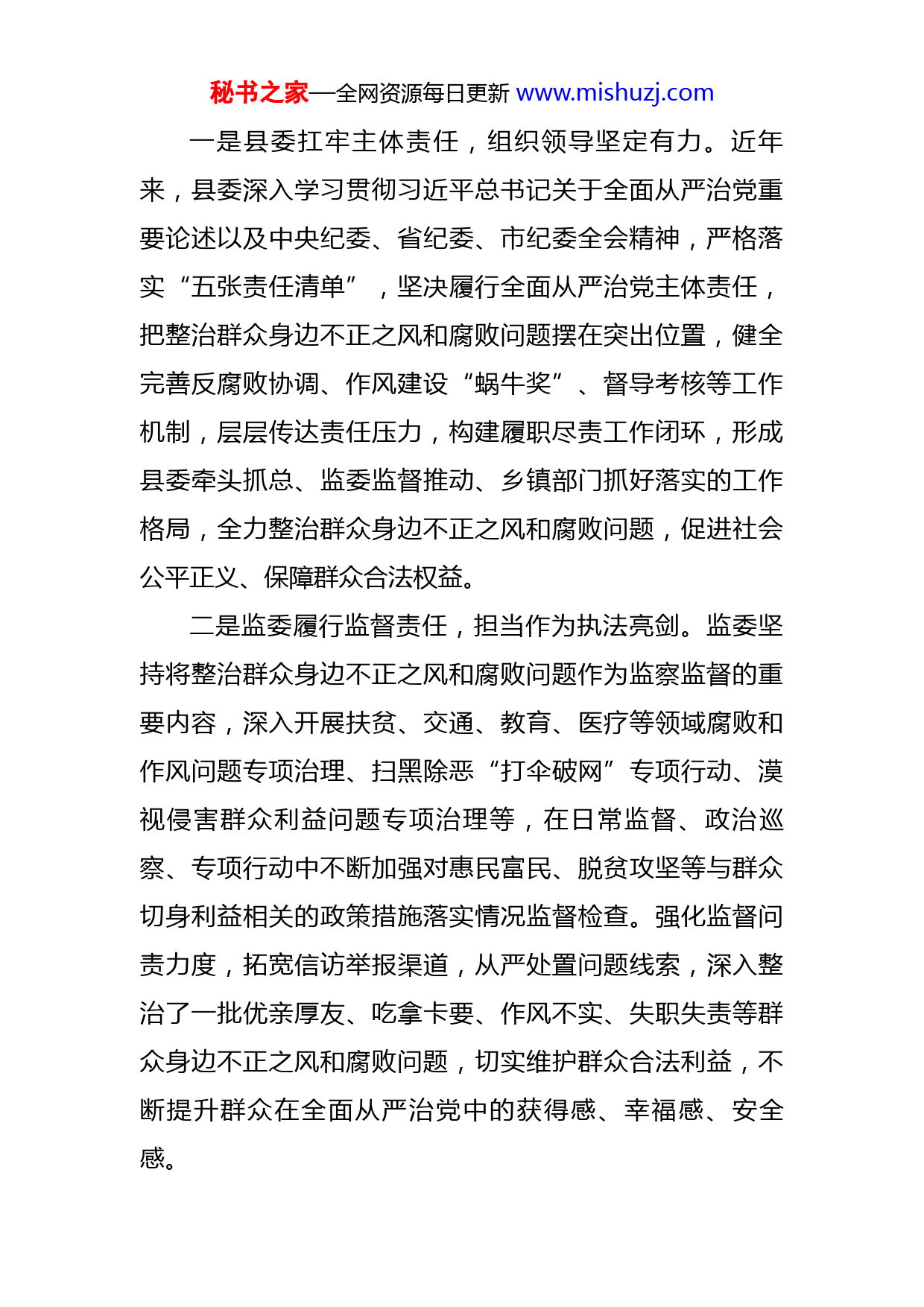 秘书之家—全网资源每日更新www.mishuzj.com县监察委员会关于开展整治群众身边不正之风和腐败问题工作情况的报告根据党中央关于地方监委向本级人大常委会报告专项工作的决策部署,依据《中华人民共和国宪法》和《中华人民共和国监察法》规定,按照本次会议安排,县人大常委会首次听取县监委专项工作报告。下面,我代表XX县监察委员会报告整治群众身边不正之风和腐败问题专项工作,请审议。一、工作开展情况整治群众身边不正之风和腐败问题,是习近平总书记反复强调的大事,是一项关系到人心向背、关系到党的执政基础、关系到人民福祉的重要工作。党的十九大以来,在县委的坚强领导下,县监委始终牢记以人民为中心的发展思想,认真履行宪法和监察法赋予的职责,发挥纪委监委合署办公优势,把整治群众身边不正之风和腐败问题作为重要政治任务,以高质量监督推动基层治理提质增效,精准发力惩治微腐蝇贪,有效遏制群众身边腐败和作风问题。2020年以来,全县共开展各类专项监督和治理活动47项,查处群众身边不正之风和腐败问题69起,给予党纪政务处分96人,移送检察机关审查起诉34人。(一)强化政治担当,坚决履行“两个责任”秘书之家—全网资源每日更新www.mishuzj.com一是县委扛牢主体责任,组织领导坚定有力。近年来,县委深入学习贯彻习近平总书记关于全面从严治党重要论述以及中央纪委、省纪委、市纪委全会精神,严格落实“五张责任清单”,坚决履行全面从严治党主体责任,把整治群众身边不正之风和腐败问题摆在突出位置,健全完善反腐败协调、作风建设“蜗牛奖”、督导考核等工作机制,层层传达责任压力,构建履职尽责工作闭环,形成县委牵头抓总、监委监督推动、乡镇部门抓好落实的工作格局,全力整治群众身边不正之风和腐败问题,促进社会公平正义、保障群众合法权益。二是监委履行监督责任,担当作为执法亮剑。监委坚持将整治群众身边不正之风和腐败问题作为监察监督的重要内容,深入开展扶贫、交通、教育、医疗等领域腐败和作风问题专项治理、扫黑除恶“打伞破网”专项行动、漠视侵害群众利益问题专项治理等,在日常监督、政治巡察、专项行动中不断加强对惠民富民、脱贫攻坚等与群众切身利益相关的政策措施落实情况监督检查。强化监督问责力度,拓宽信访举报渠道,从严处置问题线索,深入整治了一批优亲厚友、吃拿卡要、作风不实、失职失责等群众身边不正之风和腐败问题,切实维护群众合法利益,不断提升群众在全面从严治党中的获得感、幸福感、安全感。秘书之家—全网资源每日更新www.mishuzj.com三是健全完善工作机制,推动治理常态长效。深入贯彻落实监察体制改革要求,抓实工作举措,全面推进乡镇监察办规范化建设,创新推出村级监察工作联络站“动态循环双重监督”机制,常态化开展交叉监督,全面提升基层精准发现、处置问题能力。制定《关于深化精准监督推进基层监督制度化规范化常态化的实施方案》,明确41项具体工作措施,进一步夯实监督基础。聚焦“三资”管理、扶贫攻坚、工程项目等重点领域,出台《XX县村级“小微权力”三级监督责任清单》《XX县村级“小微权力”负面清单》等制度,细化权力运行流程,完善监督长效机制,有效遏制侵害群众利益的“微腐败”发生。(二)强化基层监督,持续提升基层治理效能一是持续深化巡察监督,解决群众急难愁盼问题。聚焦政治巡察定位,进一步发挥巡察联系群众的桥梁纽带作用,坚持上下一体谋划、联动协同,实现XX届县委任期内巡察全覆盖目标。2017年以来,共完成14轮次对88家单位和261个村(社)党组织的巡察任务,发现问题4965个,整改完成率99.83%,推动解决雁过拔毛、优亲厚友、违规领取津补贴等群众身边不正之风和腐败问题427个;发现并处置问题线索123件,给予诫勉谈话22人、党纪政务处分32人;追回各类违规资金771万元,挽回经济损失3872万元。聚焦打赢三大攻坚战,发现并解秘书之家—全网资源每日更新www.mishuzj.com决突出问题267个,有效保障了上级重大决策部署在基层落地见效。做深做实巡察整改“后半篇文章”,探索推行巡察整改“五步法”“量化评估办法”等新模式,着力打造巡察整改闭环,相关做法得到省纪委领导批示肯定,并在全市推广。二是持续深化清廉村居建设,提升群众“满意指数”。实施清廉村居建设三年行动计划,有效净化农村基层政治生态,服务保障脱贫攻坚与乡村振兴战略有效衔接。积极推动村(社)治理体系现代化,探索推广“纪律学堂”、村干部廉洁履职量化管理、村级小微权力“三级监督”等特色做法,织密基层监督“一张网”,有效提升监督质效。在全县261个村(社)设立监察工作联络站,充实村社廉情信息员796人,常态化开展交叉监督,发挥“前哨”和“探头”作用,切实管牢村级“小微权力”。全面打造廉洁文化矩阵,全方位挖掘提炼具有XX特色的廉洁文化元素,培育打造了XX镇XX村X氏清廉文化、XXX乡XX村博士文化、XX乡XXX村父子御史文化等一批廉洁文化阵地,逐渐形成一乡一品、一村一品的清廉文化印记,浓厚全县“以清为美、以廉为荣”的社会氛围。三是持续化解基层涉纪信访,及时回应群众关切。针对我县涉纪信访量相对较大的现状,由县监委主任“主抓直管”,把信访举报工作牢牢抓在手上,全力构建统一领秘