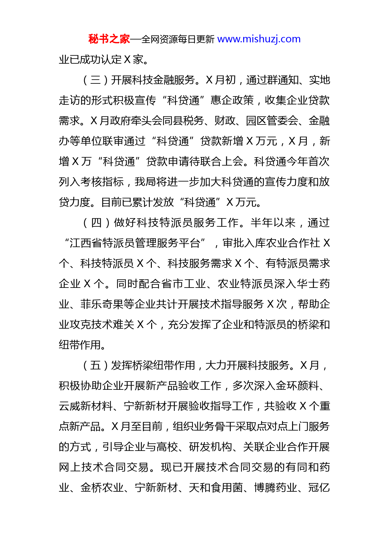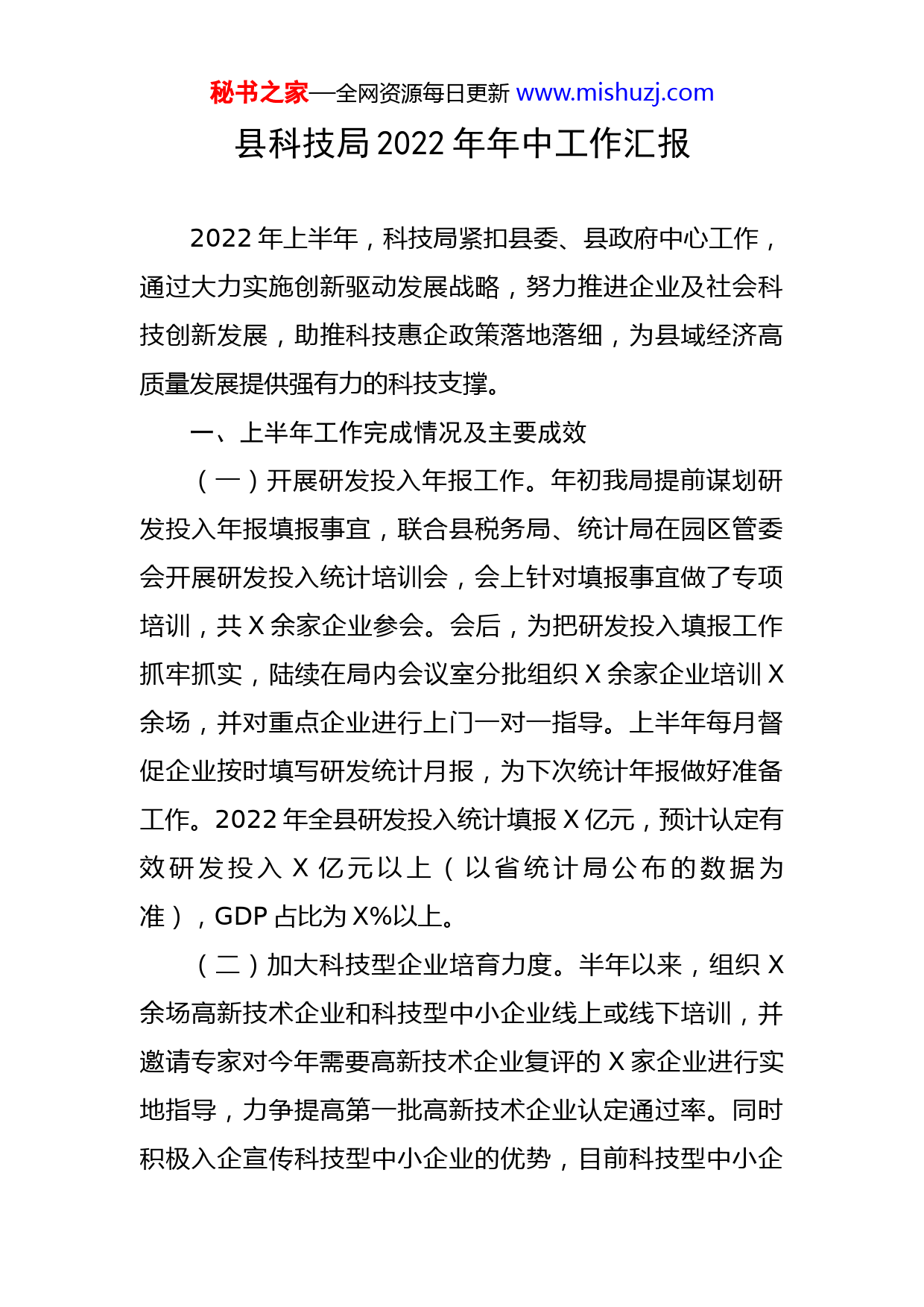 秘书之家—全网资源每日更新www.mishuzj.com县科技局2022年年中工作汇报2022年上半年,科技局紧扣县委、县政府中心工作,通过大力实施创新驱动发展战略,努力推进企业及社会科技创新发展,助推科技惠企政策落地落细,为县域经济高质量发展提供强有力的科技支撑。一、上半年工作完成情况及主要成效(一)开展研发投入年报工作。年初我局提前谋划研发投入年报填报事宜,联合县税务局、统计局在园区管委会开展研发投入统计培训会,会上针对填报事宜做了专项培训,共X余家企业参会。会后,为把研发投入填报工作抓牢抓实,陆续在局内会议室分批组织X余家企业培训X余场,并对重点企业进行上门一对一指导。上半年每月督促企业按时填写研发统计月报,为下次统计年报做好准备工作。2022年全县研发投入统计填报X亿元,预计认定有效研发投入X亿元以上(以省统计局公布的数据为准),GDP占比为X%以上。(二)加大科技型企业培育力度。半年以来,组织X余场高新技术企业和科技型中小企业线上或线下培训,并邀请专家对今年需要高新技术企业复评的X家企业进行实地指导,力争提高第一批高新技术企业认定通过率。同时积极入企宣传科技型中小企业的优势,目前科技型中小企秘书之家—全网资源每日更新www.mishuzj.com业已成功认定X家。(三)开展科技金融服务。X月初,通过群通知、实地走访的形式积极宣传“科贷通”惠企政策,收集企业贷款需求。X月政府牵头会同县税务、财政、园区管委会、金融办等单位联审通过“科贷通”贷款新增X万元,X月,新增X万“科贷通”贷款申请待联合上会。科贷通今年首次列入考核指标,我局将进一步加大科贷通的宣传力度和放贷力度。目前已累计发放“科贷通”X万元。(四)做好科技特派员服务工作。半年以来,通过“江西省特派员管理服务平台”,审批入库农业合作社X个、科技特派员X个、科技服务需求X个、有特派员需求企业X个。同时配合省市工业、农业特派员深入华士药业、菲乐奇果等企业共计开展技术指导服务X次,帮助企业攻克技术难关X个,充分发挥了企业和特派员的桥梁和纽带作用。(五)发挥桥梁纽带作用,大力开展科技服务。X月,积极协助企业开展新产品验收工作,多次深入金环颜料、云威新材料、宁新新材开展验收指导工作,共验收X个重点新产品。X月至目前,组织业务骨干采取点对点上门服务的方式,引导企业与高校、研发机构、关联企业合作开展网上技术合同交易。现已开展技术合同交易的有同和药业、金桥农业、宁新新材、天和食用菌、博腾药业、冠亿秘书之家—全网资源每日更新www.mishuzj.com砂轮X个企业,目前已达X亿元,力争达到X亿元以上。X月,积极和市局沟通,协助博腾药业、紫宸科技申报省级企业技术创新中心。X月,协助金环颜料申报金环颜料申报省“双千人才”及省“学科学术带头人”,同和药业申报省“双千团队”,结果待公示。(六)党的建设工作。一是抓责任制落实,把党建工作摆在重要位置。定期召开党建工作会议,研究解决党建工作中的重大问题。年初,党组认真分析了我局党建工作的现状,结合实际,制定了年度党建工作计划,对党建工作进行了安排部署,明确了全年党建工作的目标和任务,为党建工作扎实有效开展奠定了坚实的基础。二是抓学习教育,深化党员干部理论武装。2022年上半年以来,以建立学习型党支部为突破口,巩固党史学习教育成果,提高广大党员干部的政治思想理论水平,每月认真开展好“三会一课”、主题党日活动以及主题培训教育,同时针对我局科技业务工作开展灵活多样的形式组织学习,保证我局的学习教育落在实处,形成了讲学习、爱学习、自觉学习的好风气。三是抓组织建设,构筑坚强战斗堡垒。我局坚持以加强领导班子和党员队伍建设为重点,充分发挥了党组的领导核心作用、党支部的战斗堡垒作用和党员的先锋模范作用。积极开展“双进双服务”工作,在疫情防控和城市创建等工作中,我局党员都冲锋在前,形成了一个组秘书之家—全网资源每日更新www.mishuzj.com织健全、班子团结、工作协调、开拓进取、廉洁高效的战斗集体。(七)城市创建工作。每天安排人员对责任网格、街道进行值勤,纠正发现的不文明现象。每周五下午组织干部职工对责任网格、街道等区域开展环境卫生整治活动。不定期向责任网格、街道发放创文明城宣传材料,引导大家从自己做起,说文明话,办文明事,做文明人。通过一系列活动,使居民的文明意识、健康意识等得到了较大的提高。二、存在的问题及原因分析(一)高新技术企业认定通过率低。现在高新技术企业由税务初审,对财务数据审核严格,淘汰率高,全省高新技术企业认定通过率低,导致飞宇竹材、百丈山环保、大华燃气、定海水利去年高新复评未通过。近两年受疫情影响,有些企业经营不善没有利润,享受不到高新技术企业带来的税收减免等优惠政策,主动放弃申报高企,选择享受中小微企业优惠政策。(二)省级及以上研发平台及创新载体新增难。省厅每年给我市只有X个省级企业技术创新中心指标,我县已有X个省级研发平台,去年赣锋锂业获批江西金属锂生产与锂材加工企业技术创新中心,今年新增省级以上研发平台难度较大。秘书之家—全网资源每日更新www.mishuzj.com(三)研发投入填报仍存在不规范问题。虽然我局开展了多场研发