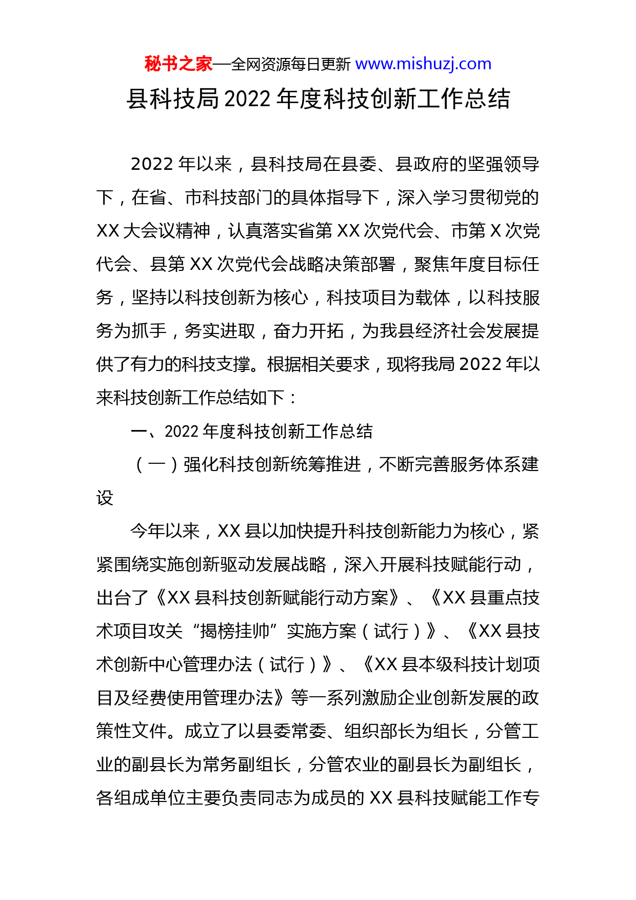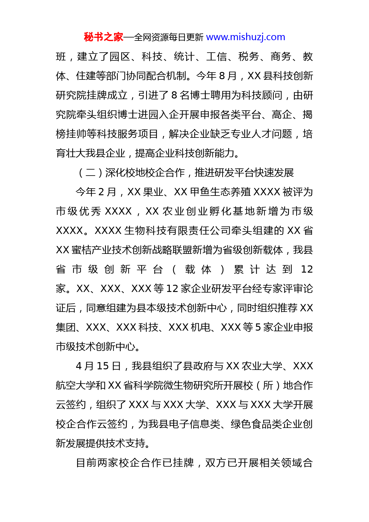 秘书之家—全网资源每日更新www.mishuzj.com县科技局2022年度科技创新工作总结2022年以来,县科技局在县委、县政府的坚强领导下,在省、市科技部门的具体指导下,深入学习贯彻党的XX大会议精神,认真落实省第XX次党代会、市第X次党代会、县第XX次党代会战略决策部署,聚焦年度目标任务,坚持以科技创新为核心,科技项目为载体,以科技服务为抓手,务实进取,奋力开拓,为我县经济社会发展提供了有力的科技支撑。根据相关要求,现将我局2022年以来科技创新工作总结如下:一、2022年度科技创新工作总结(一)强化科技创新统筹推进,不断完善服务体系建设今年以来,XX县以加快提升科技创新能力为核心,紧紧围绕实施创新驱动发展战略,深入开展科技赋能行动,出台了《XX县科技创新赋能行动方案》、《XX县重点技术项目攻关“揭榜挂帅”实施方案(试行)》、《XX县技术创新中心管理办法(试行)》、《XX县本级科技计划项目及经费使用管理办法》等一系列激励企业创新发展的政策性文件。成立了以县委常委、组织部长为组长,分管工业的副县长为常务副组长,分管农业的副县长为副组长,各组成单位主要负责同志为成员的XX县科技赋能工作专秘书之家—全网资源每日更新www.mishuzj.com班,建立了园区、科技、统计、工信、税务、商务、教体、住建等部门协同配合机制。今年8月,XX县科技创新研究院挂牌成立,引进了8名博士聘用为科技顾问,由研究院牵头组织博士进园入企开展申报各类平台、高企、揭榜挂帅等科技服务项目,解决企业缺乏专业人才问题,培育壮大我县企业,提高企业科技创新能力。(二)深化校地校企合作,推进研发平台快速发展今年2月,XX果业、XX甲鱼生态养殖XXXX被评为市级优秀XXXX,XX农业创业孵化基地新增为市级XXXX。XXXX生物科技有限责任公司牵头组建的XX省XX蜜桔产业技术创新战略联盟新增为省级创新载体,我县省市级创新平台(载体)累计达到12家。XX、XXX、XXX等12家企业研发平台经专家评审论证后,同意组建为县本级技术创新中心,同时组织推荐XX集团、XXX、XXX科技、XXX机电、XXX等5家企业申报市级技术创新中心。4月15日,我县组织了县政府与XX农业大学、XXX航空大学和XX省科学院微生物研究所开展校(所)地合作云签约,组织了XXX与XXX大学、XXX与XXX大学开展校企合作云签约,为我县电子信息类、绿色食品类企业创新发展提供技术支持。目前两家校企合作已挂牌,双方已开展相关领域合秘书之家—全网资源每日更新www.mishuzj.com作。其中,XXX柔性引进XXX大学5人(教授3人,副教授2人)就水产罐头、龟鳖胶、龟鳖酱等产品配方、生产工艺和企业标准开展了合作,项目总投入265万元,9月,甲鱼蛋生产已完工,产值约800万元,龟鳖胶和龟鳖酱还处于在研阶段。XXX与XXX大学院士专家团队围绕XX蜜桔品种优选、XX蜜桔病虫害防治(黄龙病)、生产作业标准、人才培育等四个方面内容开展了科技合作,目前正在开展柑橘木虱、橘小实蝇、蓟马、柑桔红蜘蛛等主要害虫(螨)的生防真菌高效抗逆菌株筛选及杀虫剂研发,并就XX蜜桔品种选育、病虫害防止、樱桃里种植及蔬菜种苗等事宜与XXX教授团队进行了沟通。(三)引进科技创新人才,开展“揭榜挂帅”攻关分别组织申报2022年省、市“揭榜挂帅”重大技术需求3项和7项,已获批市级“揭榜挂帅”项目4项,下半年已征集第二批县级“揭榜挂帅”技术需求5项。9月16日,组织县领导、专家、企业代表等共60人参加2022XX智库峰会暨国家级大院大所产业技术及高端人才进XX专场对接活动,举办“院士专家抚州行·百名博士进百家企业”XX专场对接活动。活动期间,邀请了中科院院士XXX、国家杰出青年XXX、XXX教授等各领域专家博士18人,共签约完成10项合作协议,举行了院士专家座谈秘书之家—全网资源每日更新www.mishuzj.com会、XXX院士团队XXX工作站揭牌仪式等活动。其中4个揭榜挂帅项目(包括蜜桔产业发展中心的“XX蜜桔品质改良育种”项目,XX实业的“绿色环保高性能的竹木生态板研发项目”、XX半导体的“高纯度、大尺寸碳化硅(SiC)晶片开发”和XX药业的“达格列净片制剂研究技术”)总研发投入资金达6800万元,给予揭榜单位资金2420万元。(四)加快科技型企业梯次培育,不断提升服务效能今年1月,我县召开了“高新技术企业申报业务培训会”,深入XXX科技、XX汽车零部件有限公司、XX科技、XXX等企业现场指导。4月7日,组织25家企业参加2022年高新技术企业认定管理工作会,会后联合县税务局一起对XXX等4家三年到期重报企业和XXX科技等5家新申报的企业进行了现场指导。为进一步规范企业账目设置、提升账目质量、提高企业高企申报成功率,4月28日、29日,我局还对部分企业的研发辅助账及“研发费用”账目进行了督查指导。6月22日,以“送服务、问需求、解难题”为主题,我局再次联合县税务局对申报今年第一批高企的企业进行了座谈,为企业在申报高企工作中存在的问题特别是税务问题进行现场解答。通过政策宣传、项目扶持、专项培训、专题座谈、现场辅导、挖掘培育等措施,全力推进高新技术企业、科技秘书之家—全网资源每日更新www.mishuzj.com型中小企业和高成长性企业的培育、申报工作。先后组织XXX、XXX、XXX等9家企业分两批次申报国家高新技术企业,目前XXX、XXX、XXX、XX和XXX材料等5家企业已通过专家评审,进入XX省2022年拟报备高新技术企业