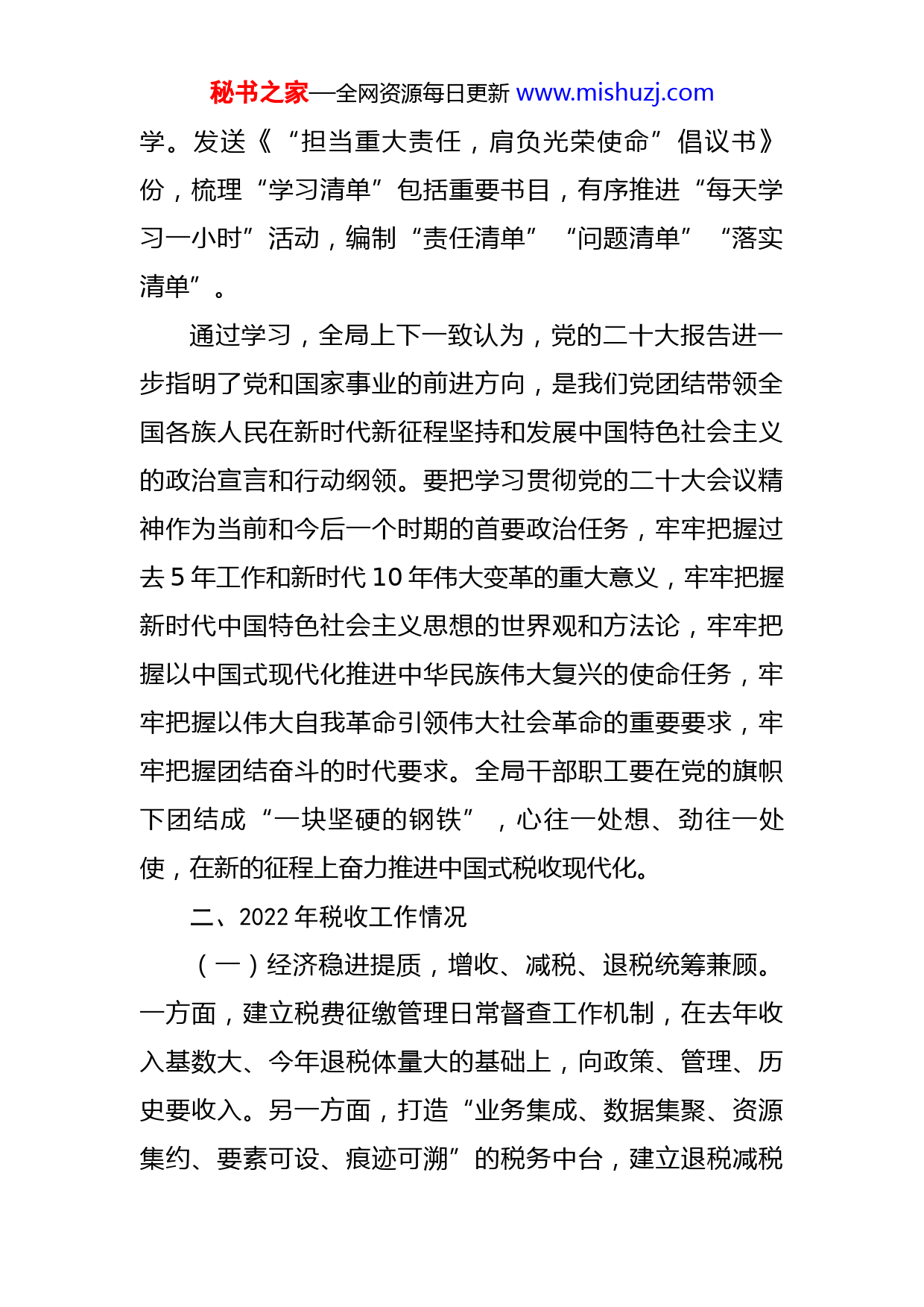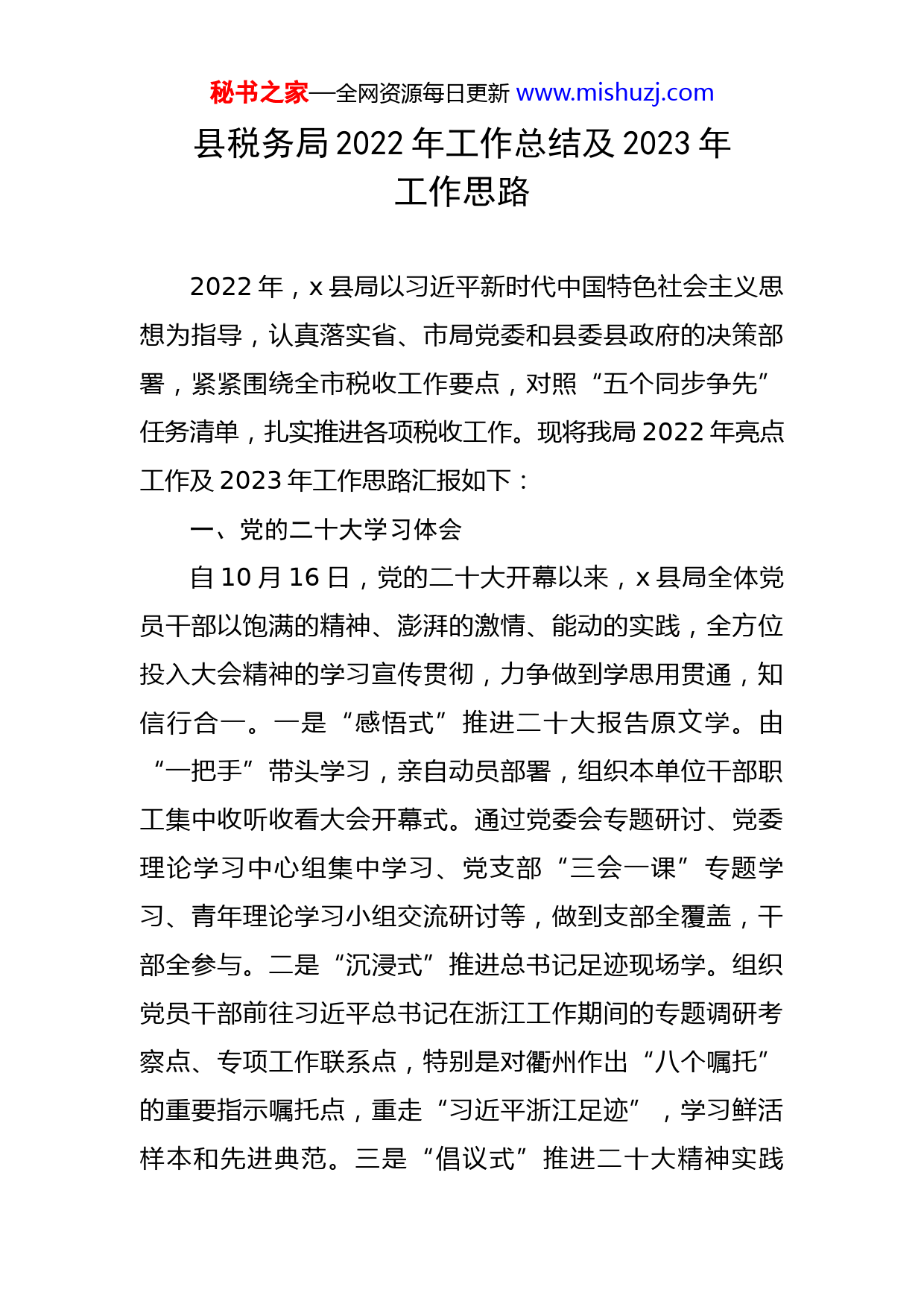 秘书之家—全网资源每日更新www.mishuzj.com县税务局2022年工作总结及2023年工作思路2022年,x县局以习近平新时代中国特色社会主义思想为指导,认真落实省、市局党委和县委县政府的决策部署,紧紧围绕全市税收工作要点,对照“五个同步争先”任务清单,扎实推进各项税收工作。现将我局2022年亮点工作及2023年工作思路汇报如下:一、党的二十大学习体会自10月16日,党的二十大开幕以来,x县局全体党员干部以饱满的精神、澎湃的激情、能动的实践,全方位投入大会精神的学习宣传贯彻,力争做到学思用贯通,知信行合一。一是“感悟式”推进二十大报告原文学。由“一把手”带头学习,亲自动员部署,组织本单位干部职工集中收听收看大会开幕式。通过党委会专题研讨、党委理论学习中心组集中学习、党支部“三会一课”专题学习、青年理论学习小组交流研讨等,做到支部全覆盖,干部全参与。二是“沉浸式”推进总书记足迹现场学。组织党员干部前往习近平总书记在浙江工作期间的专题调研考察点、专项工作联系点,特别是对衢州作出“八个嘱托”的重要指示嘱托点,重走“习近平浙江足迹”,学习鲜活样本和先进典范。三是“倡议式”推进二十大精神实践秘书之家—全网资源每日更新www.mishuzj.com学。发送《“担当重大责任,肩负光荣使命”倡议书》份,梳理“学习清单”包括重要书目,有序推进“每天学习一小时”活动,编制“责任清单”“问题清单”“落实清单”。通过学习,全局上下一致认为,党的二十大报告进一步指明了党和国家事业的前进方向,是我们党团结带领全国各族人民在新时代新征程坚持和发展中国特色社会主义的政治宣言和行动纲领。要把学习贯彻党的二十大会议精神作为当前和今后一个时期的首要政治任务,牢牢把握过去5年工作和新时代10年伟大变革的重大意义,牢牢把握新时代中国特色社会主义思想的世界观和方法论,牢牢把握以中国式现代化推进中华民族伟大复兴的使命任务,牢牢把握以伟大自我革命引领伟大社会革命的重要要求,牢牢把握团结奋斗的时代要求。全局干部职工要在党的旗帜下团结成“一块坚硬的钢铁”,心往一处想、劲往一处使,在新的征程上奋力推进中国式税收现代化。二、2022年税收工作情况(一)经济稳进提质,增收、减税、退税统筹兼顾。一方面,建立税费征缴管理日常督查工作机制,在去年收入基数大、今年退税体量大的基础上,向政策、管理、历史要收入。另一方面,打造“业务集成、数据集聚、资源集约、要素可设、痕迹可溯”的税务中台,建立退税减税秘书之家—全网资源每日更新www.mishuzj.com政策落实“集中受理、智慧分流、网格办理”的工作闭环,精准识别管户,缩短清分任务时间50%以上,退税减税政策平均办理时间压缩至1个工作日以内。(二)服务便民高效,共建、共抓、共享组合发力。以落实省局“税务网格员+乡镇(街道)村务员”揭榜挂帅试点项目为契机,在全省率先全面建成覆盖乡镇村社的全域税收志愿者服务体系。(三)队伍实干争先,严管、尚德、厚爱同步实施。一是抓常教育引导,筑牢“思想根基”和“业务基础”同步筑牢。实施党员理论学习和干部业务提升双工程,开展“周一夜学夜考”,每周排名通报,开辟党员“初心驿站”,组建“初心驿站”团队,建立《忆初心、践初心》电子记录手册。针对新入职公务员,抓好办税服务厅廉洁从税“第一个站点”建设,完善干部培养、轮岗、选拔、使用的监督管理闭环;针对青年干部,开展职业生涯规划大赛,由谈使命引向政治自觉、谈初心引向思想自觉、谈发展引向行动自觉,谈目标引向人生自觉。二是抓细日常管理,“苗头思想”和“细微行为”联系分析。出台《党支部工作考核办法》《“先锋积分、比学赶超”党员积分管理办法》,建立“党员行为积分+民主评议积分”的先锋积分体系,形成党员干部履职争先争积分的向上向善氛围。三是抓严监督约束,“八小时内”和“八小时外”贯秘书之家—全网资源每日更新www.mishuzj.com通管理。落实一体化综合监督,出台《“六治六提六争”作风建设的行动方案》,构筑纪法监督、内审监督、支部监督网络,同时积极运用纳税人缴费人外部监督和社会舆论民主监督,拓宽监督渠道,发挥聚合监督作用。“严管、尚德、厚爱”一体推进,惩治震慑、制度约束、提高觉悟一体发力,极大激发党员干部的纪律意识与战斗意识,在聚气聚力中,省局对我局在落实中央巡视整改暨税收重点工作督查整改推进会中的会风会纪情况予以正面通报。三、2023年工作思路、重点任务和主要举措(一)聚焦党建统领,做“党建评议同步争先”的扛旗手。一是贯彻落实党的二十大会议精神。在全局持续激发学习宣传贯彻党的二十大会议精神热潮,切实把学习成果转化为担当作为、干事创业的强大动力和实际行动,积极发挥税收职能作用,为加快构建新发展格局、着力推动高质量发展贡献税务力量。二是深入推进“双强争创,双建争先”工程。以“党建强基工程”为具体抓手,持续落实“纵合横通强党建”机制制度体系,推动基层党建工作质量整体提升,深入开展“蓝色税务”溯源“红色基因”活动,归纳总结支部工作法,全力争创县级五星级支部全覆盖。三要持续深化纪检监察体制改革试点。优化完善“六项监督法”,深入推进一体