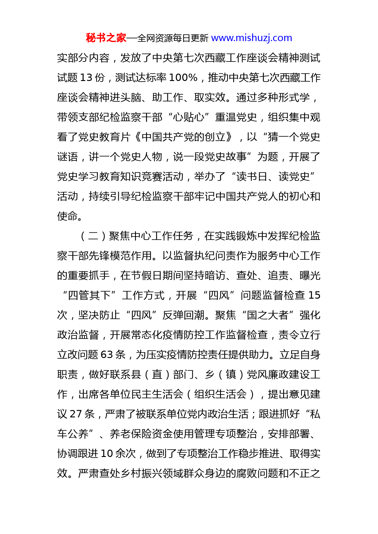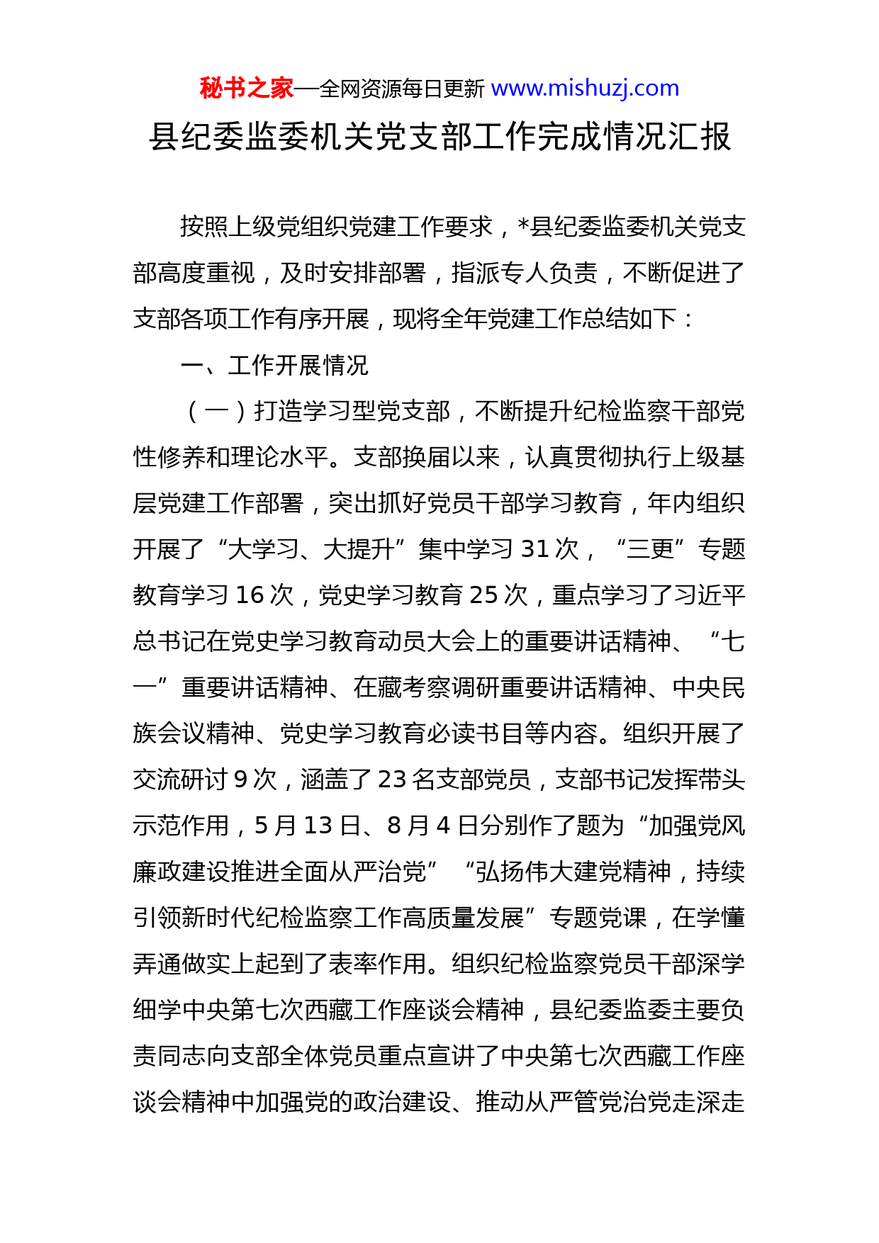 秘书之家—全网资源每日更新www.mishuzj.com县纪委监委机关党支部工作完成情况汇报按照上级党组织党建工作要求,县纪委监委机关党支部高度重视,及时安排部署,指派专人负责,不断促进了支部各项工作有序开展,现将全年党建工作总结如下:一、工作开展情况(一)打造学习型党支部,不断提升纪检监察干部党性修养和理论水平。支部换届以来,认真贯彻执行上级基层党建工作部署,突出抓好党员干部学习教育,年内组织开展了“大学习、大提升”集中学习31次,“三更”专题教育学习16次,党史学习教育25次,重点学习了习近平总书记在党史学习教育动员大会上的重要讲话精神、“七一”重要讲话精神、在藏考察调研重要讲话精神、中央民族会议精神、党史学习教育必读书目等内容。组织开展了交流研讨9次,涵盖了23名支部党员,支部书记发挥带头示范作用,5月13日、8月4日分别作了题为“加强党风廉政建设推进全面从严治党”“弘扬伟大建党精神,持续引领新时代纪检监察工作高质量发展”专题党课,在学懂弄通做实上起到了表率作用。组织纪检监察党员干部深学细学中央第七次西藏工作座谈会精神,县纪委监委主要负责同志向支部全体党员重点宣讲了中央第七次西藏工作座谈会精神中加强党的政治建设、推动从严管党治党走深走秘书之家—全网资源每日更新www.mishuzj.com实部分内容,发放了中央第七次西藏工作座谈会精神测试试题13份,测试达标率100%,推动中央第七次西藏工作座谈会精神进头脑、助工作、取实效。通过多种形式学,带领支部纪检监察干部“心贴心”重温党史,组织集中观看了党史教育片《中国共产党的创立》,以“猜一个党史谜语,讲一个党史人物,说一段党史故事”为题,开展了党史学习教育知识竞赛活动,举办了“读书日、读党史”活动,持续引导纪检监察干部牢记中国共产党人的初心和使命。(二)聚焦中心工作任务,在实践锻炼中发挥纪检监察干部先锋模范作用。以监督执纪问责作为服务中心工作的重要抓手,在节假日期间坚持暗访、查处、追责、曝光“四管其下”工作方式,开展“四风”问题监督检查15次,坚决防止“四风”反弹回潮。聚焦“国之大者”强化政治监督,开展常态化疫情防控工作监督检查,责令立行立改问题63条,为压实疫情防控责任提供助力。立足自身职责,做好联系县(直)部门、乡(镇)党风廉政建设工作,出席各单位民主生活会(组织生活会),提出意见建议27条,严肃了被联系单位党内政治生活;跟进抓好“私车公养”、养老保险资金使用管理专项整治,安排部署、协调跟进10余次,做到了专项整治工作稳步推进、取得实效。严肃查处乡村振兴领域群众身边的腐败问题和不正之秘书之家—全网资源每日更新www.mishuzj.com风,牵头查办某村群众身边的“微腐败”问题,对相关责任人进行立案审查,目前,案件在进一步办理中,在以有力的监督服务中心工作中发挥了先锋模范作用。(三)突出强化党的政治建设,发挥机关党支部政治引领作用。按照2021年基层党建工作要点要求,把抓规范作为提高纪委监委机关党支部工作质量的基础保障,组织相关同志对机关日常规章制度进行“回头看”,进一步完善了干部考勤、保密制度、请销假等管理制度,形成以制度管人、按流程办事的良好工作局面。持续强化纪委监委机关支部队伍建设,严肃党内组织生活,抓实机关支部“三会一课”、组织生活会等组织制度,召开了11次支部委员会,3次党员大会,2次专题党课,主题党日活动11次,研究支部工作开展,推动形成了全体支部党员干部人人争学的良好氛围。深化“八星党支部”创建工作,安排专人负责创星工作,对照八个方面开展自查自评,对活动阵地混用等不符合标准化规范化要求的情况正在进一步研究解决。把加强支部政治建设作为筑实意识形态屏障的重要举措,召开了共产党员不得信仰宗教专题学习研讨会,传达学习了《西藏自治区关于违反政治纪律行为的处分规定》《关于重申严禁共产党员信仰宗教和参与“萨嘎达瓦”宗教活动的通知》,全体党员签订了“不信教、不参教”承诺书。在县纪委常委会领导下,组成5个专项督导秘书之家—全网资源每日更新www.mishuzj.com组,坚决纠治各单位办公场所、机关食堂车辆停放点、干部周转房悬挂宗教饰品、放置宗教物品、党员干部信仰宗教等违反政治纪律的行为,立行立改问题82条,做到了整治工作到位、思想认识入脑。对我支部2名党员入党程序不规范、缺少政审材料等问题,督促积极与直属机关工委对接,目前,1名同志已整改完成,另1名同志已向其入党时所在支部发函衔接,确保按要求完成违规违纪发展党员问题整改工作。(四)贯彻落实《条例》规定,努力推动形成党建业务双促进工作格局。纪委监委机关党支部认真贯彻“党建+学习”模式,提高支部党员政治站位。通过主题党日、思想讨论、市纪委测试平台知识竞赛等形式,带动机关支部党员联系实际学,对党章党规党纪等业务内容开展学习,切实加强支部党员政治历练、实践锻炼、专业训练。深化贯彻“党建+平台”模式,以县委组织部门开展的创先争优强基础惠民生活动第十批驻村工作队综合业务培训班”、入党积极分子培训等活动为契机,安排支部党员上台讲,不少支部党员实现了从“不敢讲”“不能讲”到敢讲、会讲的转变。深化贯彻“党建+监