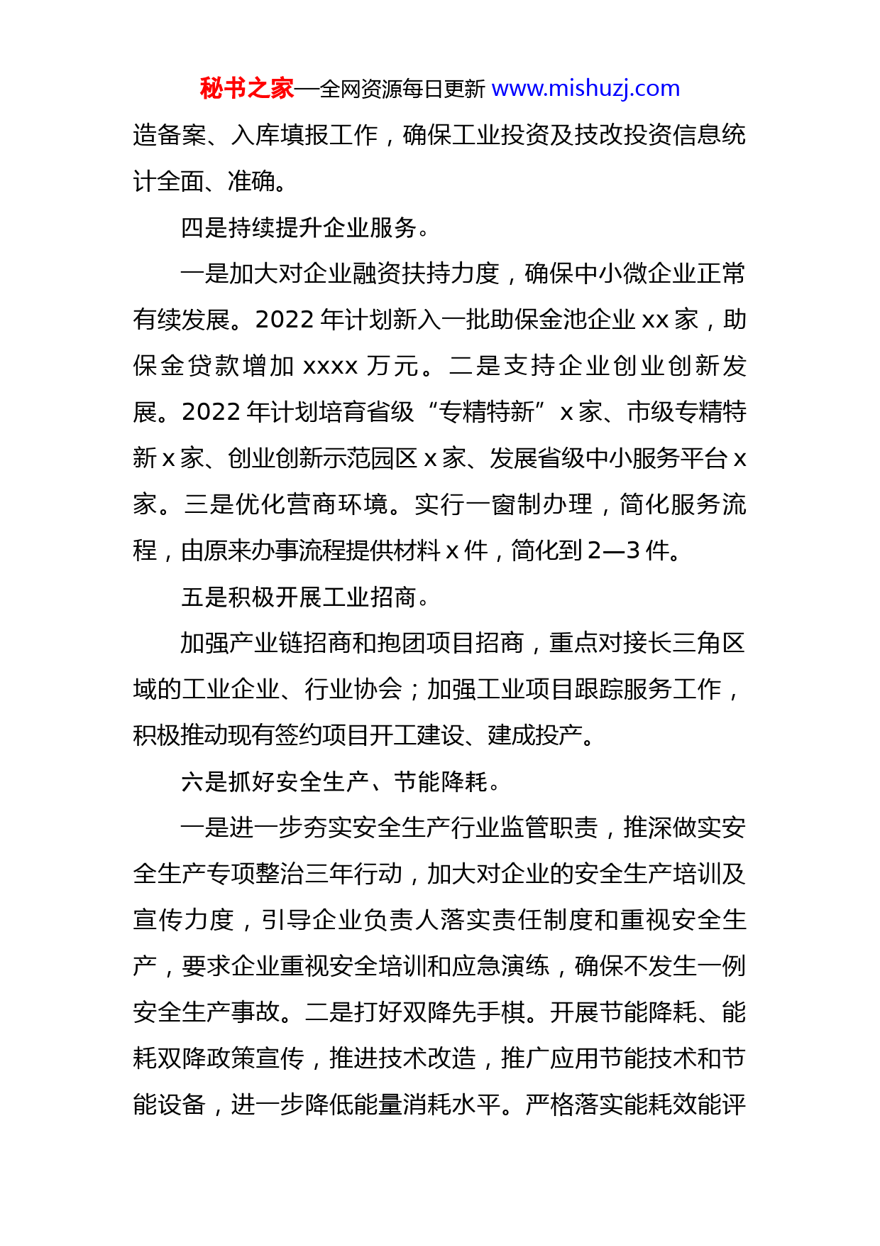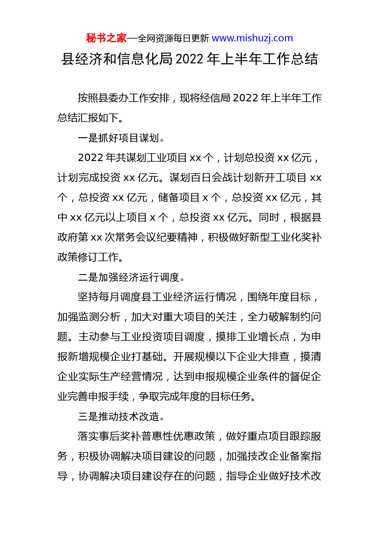秘书之家—全网资源每日更新www.mishuzj.com县经济和信息化局2022年上半年工作总结按照县委办工作安排,现将经信局2022年上半年工作总结汇报如下。一是抓好项目谋划。2022年共谋划工业项目xx个,计划总投资xx亿元,计划完成投资xx亿元。谋划百日会战计划新开工项目xx个,总投资xx亿元,储备项目x个,总投资xx亿元,其中xx亿元以上项目x个,总投资xx亿元。同时,根据县政府第xx次常务会议纪要精神,积极做好新型工业化奖补政策修订工作。二是加强经济运行调度。坚持每月调度县工业经济运行情况,围绕年度目标,加强监测分析,加大对重大项目的关注,全力破解制约问题。主动参与工业投资项目调度,摸排工业增长点,为申报新增规模企业打基础。开展规模以下企业大排查,摸清企业实际生产经营情况,达到申报规模企业条件的督促企业完善申报手续,争取完成年度的目标任务。三是推动技术改造。落实事后奖补普惠性优惠政策,做好重点项目跟踪服务,积极协调解决项目建设的问题,加强技改企业备案指导,协调解决项目建设存在的问题,指导企业做好技术改秘书之家—全网资源每日更新www.mishuzj.com造备案、入库填报工作,确保工业投资及技改投资信息统计全面、准确。四是持续提升企业服务。一是加大对企业融资扶持力度,确保中小微企业正常有续发展。2022年计划新入一批助保金池企业xx家,助保金贷款增加xxxx万元。二是支持企业创业创新发展。2022年计划培育省级“专精特新”x家、市级专精特新x家、创业创新示范园区x家、发展省级中小服务平台x家。三是优化营商环境。实行一窗制办理,简化服务流程,由原来办事流程提供材料x件,简化到2—3件。五是积极开展工业招商。加强产业链招商和抱团项目招商,重点对接长三角区域的工业企业、行业协会;加强工业项目跟踪服务工作,积极推动现有签约项目开工建设、建成投产。六是抓好安全生产、节能降耗。一是进一步夯实安全生产行业监管职责,推深做实安全生产专项整治三年行动,加大对企业的安全生产培训及宣传力度,引导企业负责人落实责任制度和重视安全生产,要求企业重视安全培训和应急演练,确保不发生一例安全生产事故。二是打好双降先手棋。开展节能降耗、能耗双降政策宣传,推进技术改造,推广应用节能技术和节能设备,进一步降低能量消耗水平。严格落实能耗效能评秘书之家—全网资源每日更新www.mishuzj.com估机制,能耗执法检查工作。一手抓新(续)建项的能耗审核审批,严把项目审批关,严禁高耗能项目上马;一手抓落后产能的淘汰工作,关停一批高耗能企业、拉闸限电控制一批高耗能企业、通过利益导向机制鼓励支持一批企业,不断为我县的经济可持续发展注入新动能。七、继续抓好党建引领工作。常态化开展好“三个以案”警示教育活动,深化、巩固好党史教育成果,推深做实“两学一做”常态化制度化,全面落实意识形态工作责任制,不断增强“四个意识”、坚定“四个自信”、做到“两个维护”,切实提高政治站位,强化思想自觉、政治自觉、行动自觉,把“三个以案”警示教育作为一项重大政治任务抓实抓细,抓紧抓好,为完成年度工作目标任务提供根本保证。