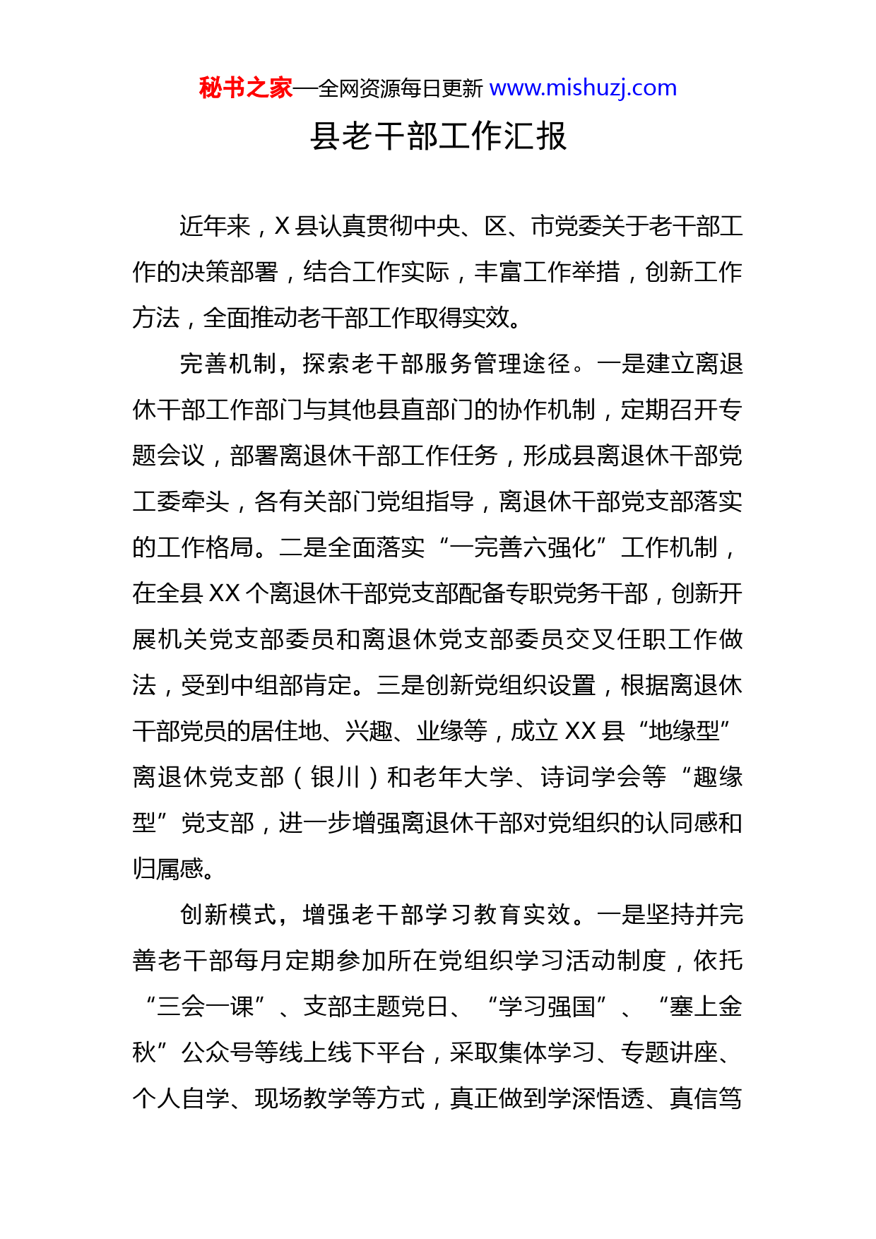 秘书之家—全网资源每日更新www.mishuzj.com县老干部工作汇报近年来,X县认真贯彻中央、区、市党委关于老干部工作的决策部署,结合工作实际,丰富工作举措,创新工作方法,全面推动老干部工作取得实效。完善机制,探索老干部服务管理途径。一是建立离退休干部工作部门与其他县直部门的协作机制,定期召开专题会议,部署离退休干部工作任务,形成县离退休干部党工委牵头,各有关部门党组指导,离退休干部党支部落实的工作格局。二是全面落实“一完善六强化”工作机制,在全县XX个离退休干部党支部配备专职党务干部,创新开展机关党支部委员和离退休党支部委员交叉任职工作做法,受到中组部肯定。三是创新党组织设置,根据离退休干部党员的居住地、兴趣、业缘等,成立XX县“地缘型”离退休党支部(银川)和老年大学、诗词学会等“趣缘型”党支部,进一步增强离退休干部对党组织的认同感和归属感。创新模式,增强老干部学习教育实效。一是坚持并完善老干部每月定期参加所在党组织学习活动制度,依托“三会一课”、支部主题党日、“学习强国”、“塞上金秋”公众号等线上线下平台,采取集体学习、专题讲座、个人自学、现场教学等方式,真正做到学深悟透、真信笃秘书之家—全网资源每日更新www.mishuzj.com行,确保学习全覆盖。二是定期邀请自治区“塞上金秋”等宣讲团,对全县离退休干部党支部书记、老党员进行集中宣讲,引导基层离退休干部党组织学习教育有方向、不跑偏。三是坚持从实际出发组织和开展学习活动,对年老体弱、行动不便的离退休干部,采取送学上门、视频课等灵活的学习方式,切实做到离退休干部党的意识不弱化、党员标准不降低、党内生活不脱离。近年来全县共举办各类专题辅导、学习会XX余场次,教育培训离退休干部XX余人次。关心关怀,做好老干部服务管理工作。一是认真落实离退休干部阅读文件、听报告、参加重要会议和重大活动等制度,定期组织老干部对我县重点项目进行观摩,推动形成集思广益、凝聚合力、促进发展的良好氛围。二是积极开展走访慰问、困难帮扶、精神抚慰、心理疏导等精准化、亲情化服务,加强与老干部“点对点”联系沟通,更好满足老同志对美好生活的需要。三是积极探索加强退休干部管理服务办法,坚持落实好惠及离退休干部及遗孀的相关政策,为困难离休干部、无固定收入离休干部遗孀缴发放生活补贴、缴纳医疗保险、发放生活困难补助金等。用心用情,丰富老干部业余精神生活。一是整合宣传资源,办好《XX诗苑》刊物,共出版《XX诗苑》XX期,累计发表各类诗词XXXX多首。成立延安精神研究会,在秘书之家—全网资源每日更新www.mishuzj.com全区率先创办《XX延安精神研究》通讯,累计发表文章XXXX篇。二是全面推进学习阵地建设,发挥好老年大学作用,目前,县老年大学有注册学员XX多名,开设书法班、绘画班、太极拳等XX个教学班,为全县培养了一批老年优秀文艺人才,编排了一批高质量文艺节目,出版了一批通俗易懂诗词作品。三是积极培树典型,及时进行宣传报道,发挥好典型的引导、示范和带动作用,先后涌现出任登全、王洪喜、周志远等一批在全区乃至全国有影响力的老干部先锋模范。
