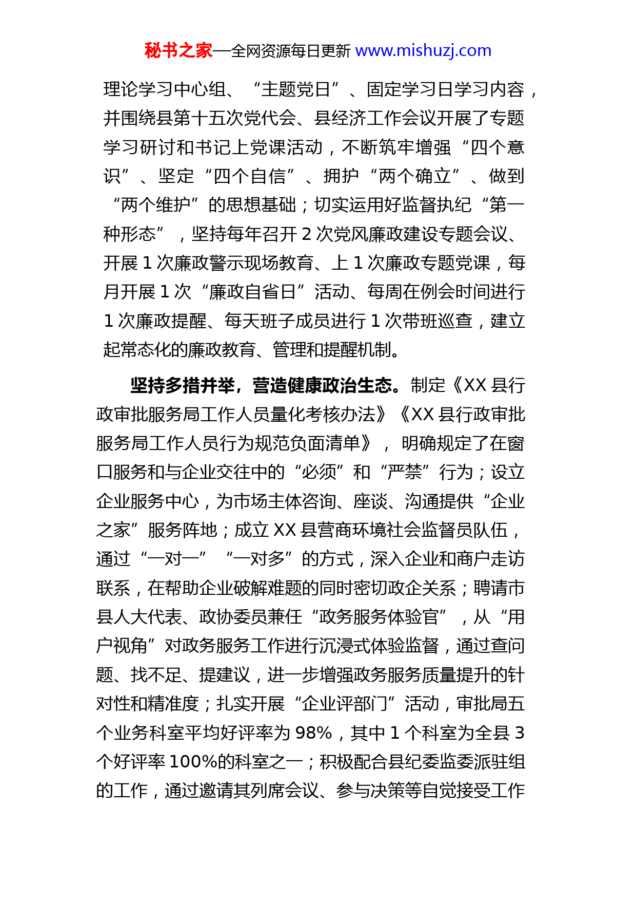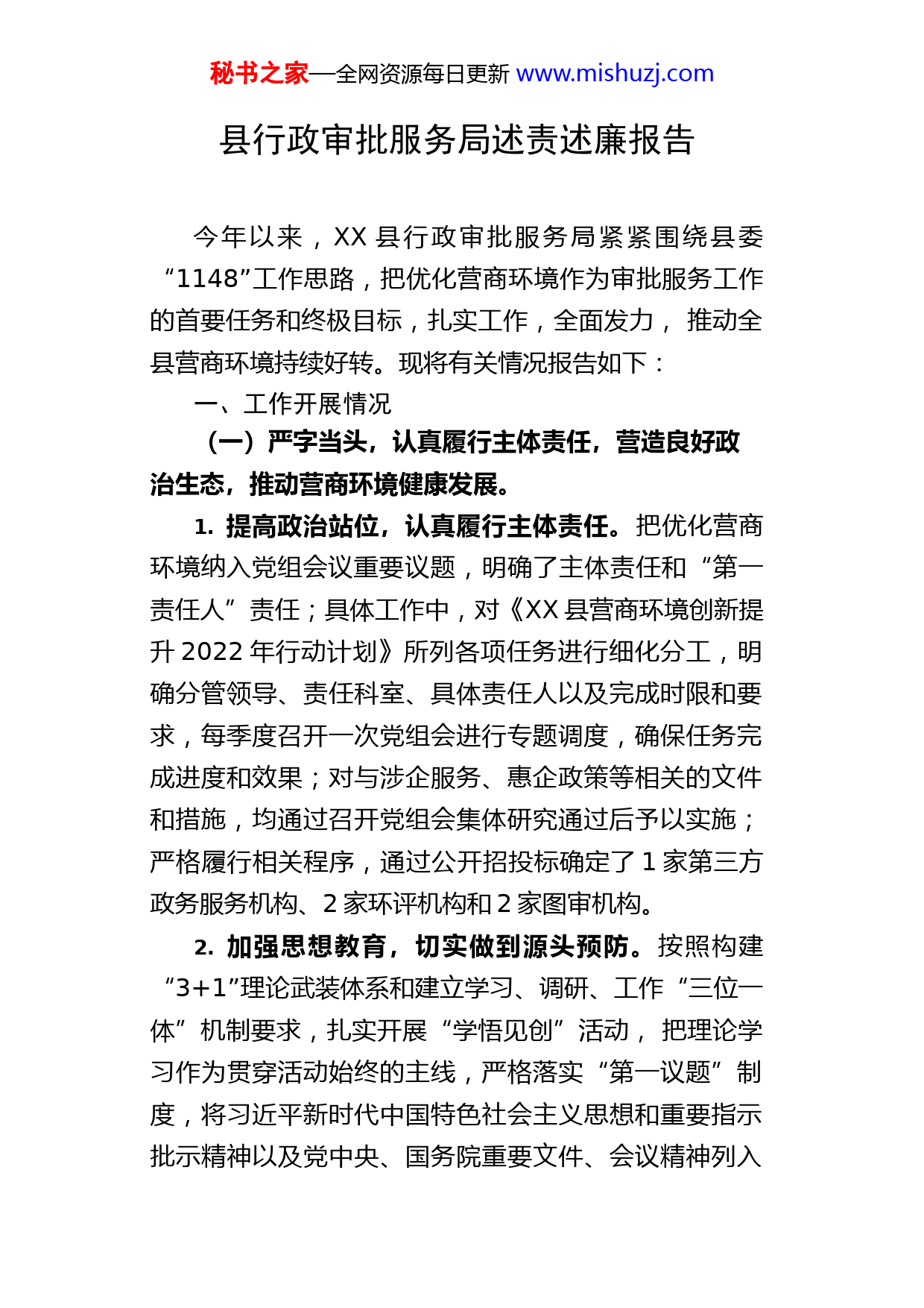 秘书之家—全网资源每日更新www.mishuzj.com县行政审批服务局述责述廉报告今年以来,XX县行政审批服务局紧紧围绕县委“1148”工作思路,把优化营商环境作为审批服务工作的首要任务和终极目标,扎实工作,全面发力,推动全县营商环境持续好转。现将有关情况报告如下:一、工作开展情况(一)严字当头,认真履行主体责任,营造良好政治生态,推动营商环境健康发展。1.提高政治站位,认真履行主体责任。把优化营商环境纳入党组会议重要议题,明确了主体责任和“第一责任人”责任;具体工作中,对《XX县营商环境创新提升2022年行动计划》所列各项任务进行细化分工,明确分管领导、责任科室、具体责任人以及完成时限和要求,每季度召开一次党组会进行专题调度,确保任务完成进度和效果;对与涉企服务、惠企政策等相关的文件和措施,均通过召开党组会集体研究通过后予以实施;严格履行相关程序,通过公开招投标确定了1家第三方政务服务机构、2家环评机构和2家图审机构。2.加强思想教育,切实做到源头预防。按照构建“3+1”理论武装体系和建立学习、调研、工作“三位一体”机制要求,扎实开展“学悟见创”活动,把理论学习作为贯穿活动始终的主线,严格落实“第一议题”制度,将习近平新时代中国特色社会主义思想和重要指示批示精神以及党中央、国务院重要文件、会议精神列入秘书之家—全网资源每日更新www.mishuzj.com理论学习中心组、“主题党日”、固定学习日学习内容,并围绕县第十五次党代会、县经济工作会议开展了专题学习研讨和书记上党课活动,不断筑牢增强“四个意识”、坚定“四个自信”、拥护“两个确立”、做到“两个维护”的思想基础;切实运用好监督执纪“第一种形态”,坚持每年召开2次党风廉政建设专题会议、开展1次廉政警示现场教育、上1次廉政专题党课,每月开展1次“廉政自省日”活动、每周在例会时间进行1次廉政提醒、每天班子成员进行1次带班巡查,建立起常态化的廉政教育、管理和提醒机制。坚持多措并举,营造健康政治生态。制定《XX县行政审批服务局工作人员量化考核办法》《XX县行政审批服务局工作人员行为规范负面清单》,明确规定了在窗口服务和与企业交往中的“必须”和“严禁”行为;设立企业服务中心,为市场主体咨询、座谈、沟通提供“企业之家”服务阵地;成立XX县营商环境社会监督员队伍,通过“一对一”“一对多”的方式,深入企业和商户走访联系,在帮助企业破解难题的同时密切政企关系;聘请市县人大代表、政协委员兼任“政务服务体验官”,从“用户视角”对政务服务工作进行沉浸式体验监督,通过查问题、找不足、提建议,进一步增强政务服务质量提升的针对性和精准度;扎实开展“企业评部门”活动,审批局五个业务科室平均好评率为98%,其中1个科室为全县3个好评率100%的科室之一;积极配合县纪委监委派驻组的工作,通过邀请其列席会议、参与决策等自觉接受工作秘书之家—全网资源每日更新www.mishuzj.com指导和监督。3.强化廉洁自律,构建新型政商关系。理清政商交往边界,积极发挥“关键少数”作用,不断增强应对“糖衣炮弹”的防御力,把“亲而有度、清而有为”作为与企业打交道的行为准则,自觉遵守政治、组织、廉洁、群众、工作、生活六大纪律以及《临沂市领导干部“八小时之外”活动监督管理办法》,做到一心为企、两袖清风,坚守纪法底线,保持关系清白,积极构建“亲清”政商关系和亲商、扶商的良好氛围。(二)细处着眼,落实各项改革举措,助力企业健康发展,促进营商环境持续优化。一是在企业开办领域。对印章刻制、税控设备发放、双向寄递等事项提供免费服务,实现企业开办“零费用”;打造“企业开办”一件事服务,将设立登记、印章刻制、社保登记、银行开户等8个事项合并为一个环节办理,实现开办企业常态化0.5个工作日办结,压缩办事环节87.5%,精简办事材料90%,办理用时减少83%;在全市率先实施企业信用修复适用“简易注销”改革,将涉及部门和环节由5个压缩至1个,申请材料从11份压缩至2份,大大提升了市场主体注销便利化水平,典型经验在市委改革办公众号刊发推广;成功争取市场主体住所(经营场所)标准化登记省级改革试点,有效杜绝了虚假登记、通过登记地址无法联系等问题,提高了登记注册质量。二是在政务服务领域。建立审批事项“零基础”模板秘书之家—全网资源每日更新www.mishuzj.com和服务指南,推动审批程序公开透明;创新实行“每日一题、每周一案、每月一法、每季一考”普法学习模式,持续提升工作人员依法审批意识和水平;依法做好上级下放权限承接和“市县同权”改革工作,建立“县级一口受理、市级后台审批、县级统一发证”的全程在线审批新模式,实现企业群众办事“大事不出县”;推行独任审批师制度,变“多层审查”为“扁平式”一人审批,做到“简易事极简办”;畅通吐槽找茬、好差评、“办不成事”窗口、12345热线等意见建议反馈渠道,自觉接受群众和社会监督;开展企业全生命周期服务改革,强化审管联动,实现审批事项闭环管理;提升改造县、镇、村三级便民服务场所,打造“1530政务服务圈”,方便企业群众“就近办”;完成“爱山东”政务服务平台省级试点,建立“网上中介”超市,成立县镇两级政务服务“智能云客服”队
