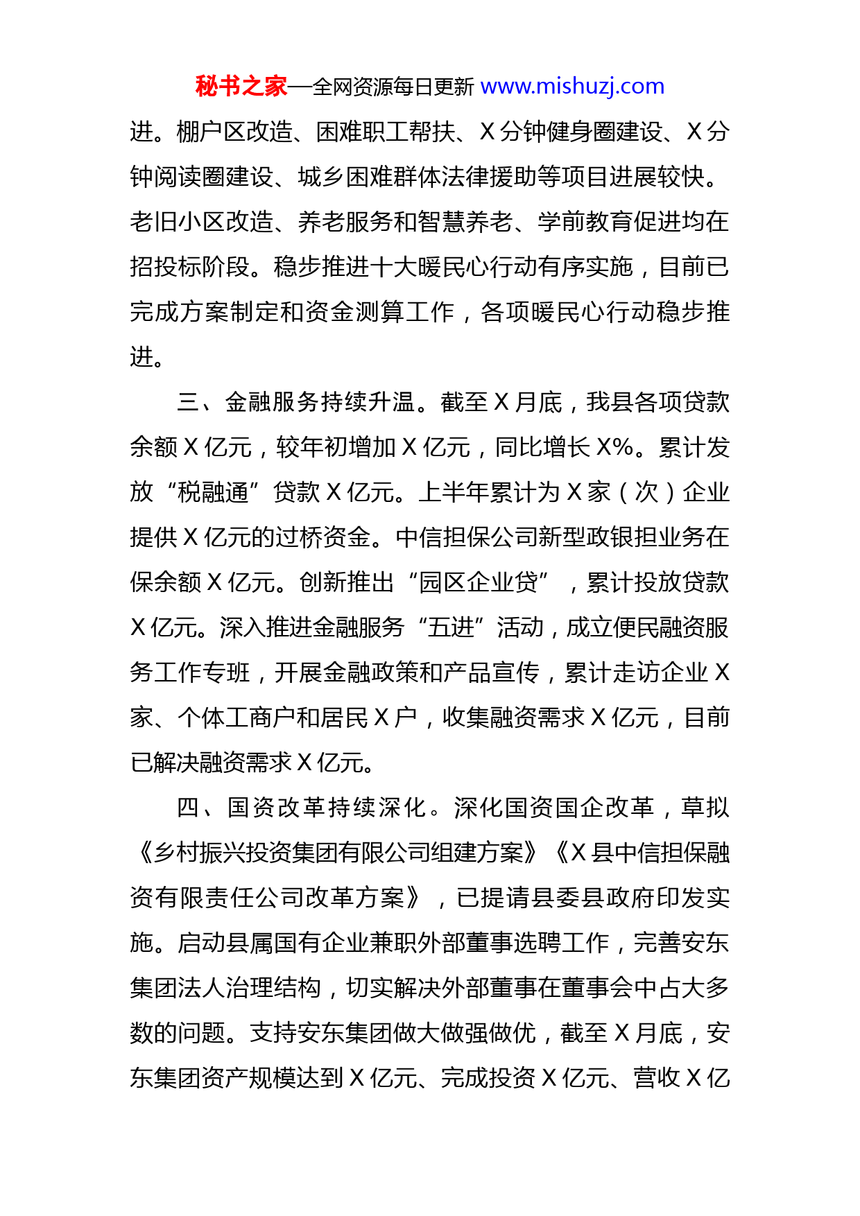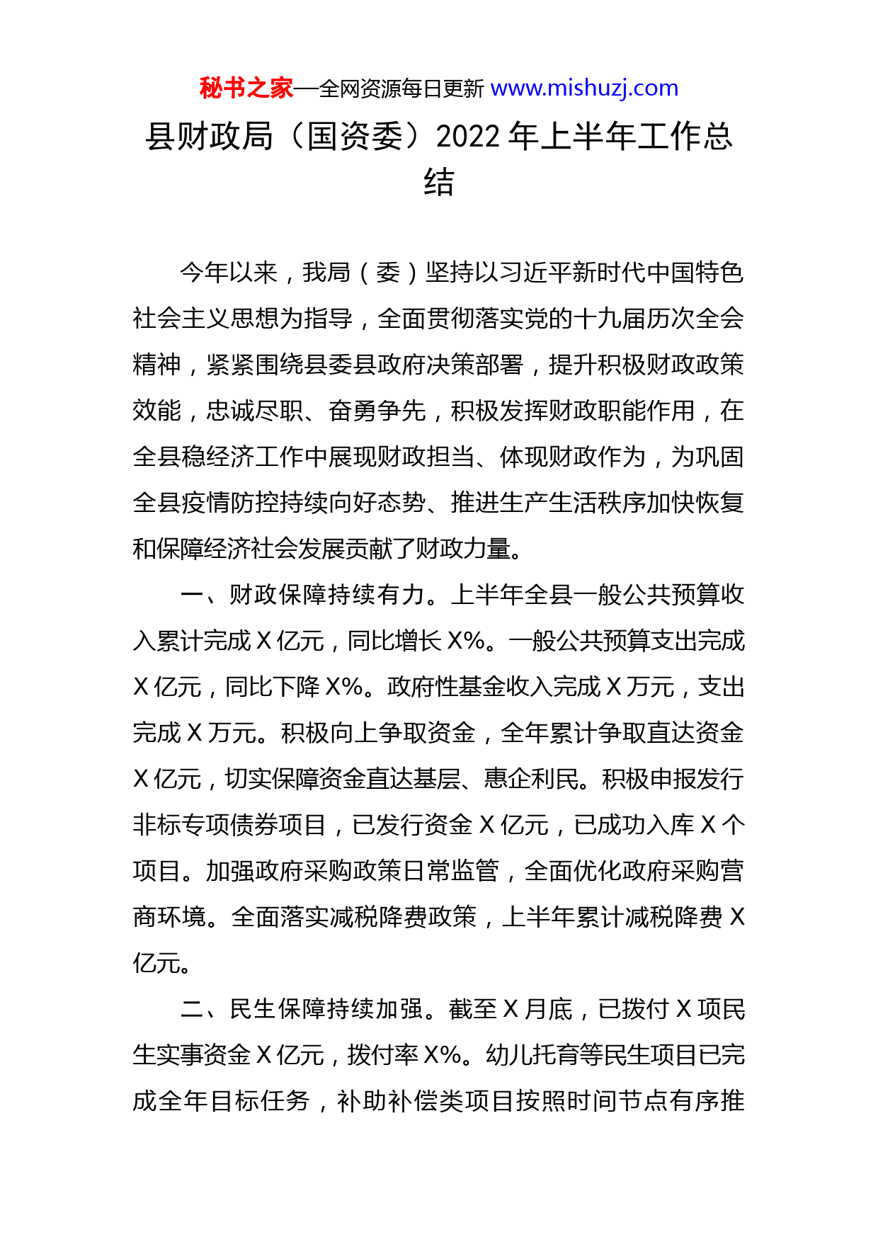秘书之家—全网资源每日更新www.mishuzj.com县财政局(国资委)2022年上半年工作总结今年以来,我局(委)坚持以习近平新时代中国特色社会主义思想为指导,全面贯彻落实党的十九届历次全会精神,紧紧围绕县委县政府决策部署,提升积极财政政策效能,忠诚尽职、奋勇争先,积极发挥财政职能作用,在全县稳经济工作中展现财政担当、体现财政作为,为巩固全县疫情防控持续向好态势、推进生产生活秩序加快恢复和保障经济社会发展贡献了财政力量。一、财政保障持续有力。上半年全县一般公共预算收入累计完成X亿元,同比增长X%。一般公共预算支出完成X亿元,同比下降X%。政府性基金收入完成X万元,支出完成X万元。积极向上争取资金,全年累计争取直达资金X亿元,切实保障资金直达基层、惠企利民。积极申报发行非标专项债券项目,已发行资金X亿元,已成功入库X个项目。加强政府采购政策日常监管,全面优化政府采购营商环境。全面落实减税降费政策,上半年累计减税降费X亿元。二、民生保障持续加强。截至X月底,已拨付X项民生实事资金X亿元,拨付率X%。幼儿托育等民生项目已完成全年目标任务,补助补偿类项目按照时间节点有序推秘书之家—全网资源每日更新www.mishuzj.com进。棚户区改造、困难职工帮扶、X分钟健身圈建设、X分钟阅读圈建设、城乡困难群体法律援助等项目进展较快。老旧小区改造、养老服务和智慧养老、学前教育促进均在招投标阶段。稳步推进十大暖民心行动有序实施,目前已完成方案制定和资金测算工作,各项暖民心行动稳步推进。三、金融服务持续升温。截至X月底,我县各项贷款余额X亿元,较年初增加X亿元,同比增长X%。累计发放“税融通”贷款X亿元。上半年累计为X家(次)企业提供X亿元的过桥资金。中信担保公司新型政银担业务在保余额X亿元。创新推出“园区企业贷”,累计投放贷款X亿元。深入推进金融服务“五进”活动,成立便民融资服务工作专班,开展金融政策和产品宣传,累计走访企业X家、个体工商户和居民X户,收集融资需求X亿元,目前已解决融资需求X亿元。四、国资改革持续深化。深化国资国企改革,草拟《乡村振兴投资集团有限公司组建方案》《X县中信担保融资有限责任公司改革方案》,已提请县委县政府印发实施。启动县属国有企业兼职外部董事选聘工作,完善安东集团法人治理结构,切实解决外部董事在董事会中占大多数的问题。支持安东集团做大做强做优,截至X月底,安东集团资产规模达到X亿元、完成投资X亿元、营收X亿秘书之家—全网资源每日更新www.mishuzj.com元、净利润X万元、税收X万元。五、基层党建持续抓牢。进一步健全工作机制,开展作风建设警示教育活动,切实转变工作作风。组织党员干部参加财政职工大讲堂,用身边的人和事教育全体党员干部。加强会计师行业党组织建设,成立安徽天弈会计师事务所党支部,为X第一家会计师事务所党支部。抓好国有企业党支部(党总支)参与重大事项决策试点工作,组建县级试点工作组和工作专班,构建“县委组织部—县财政(国资)工委—安东集团党委—试点子公司党支部”四级协调机制。