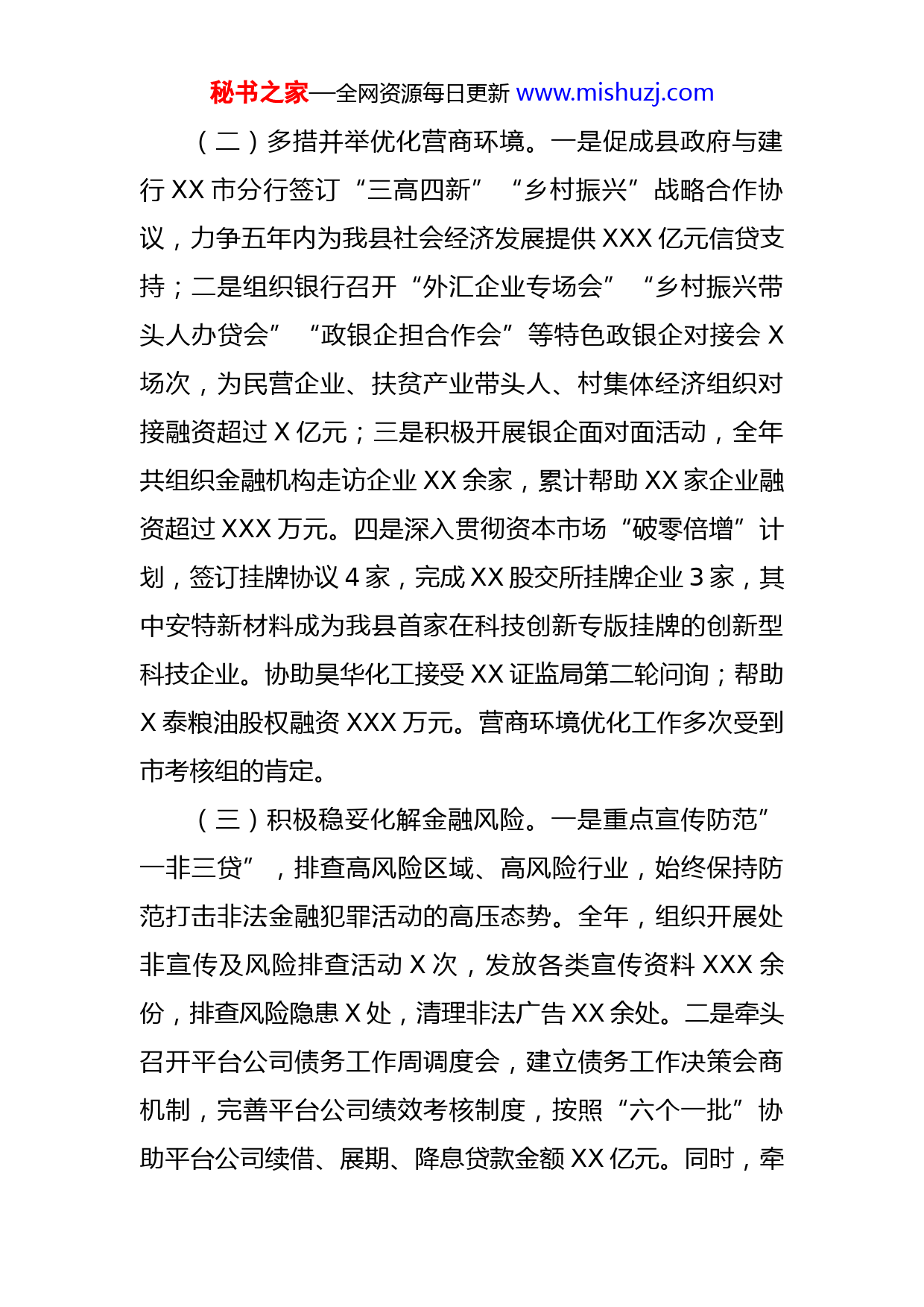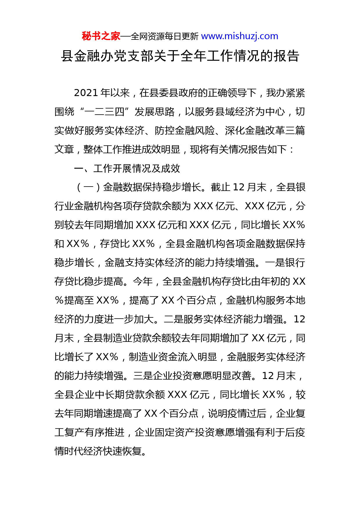 秘书之家—全网资源每日更新www.mishuzj.com县金融办党支部关于全年工作情况的报告2021年以来,在县委县政府的正确领导下,我办紧紧围绕“一二三四”发展思路,以服务县域经济为中心,切实做好服务实体经济、防控金融风险、深化金融改革三篇文章,整体工作推进成效明显,现将有关情况报告如下:一、工作开展情况及成效(一)金融数据保持稳步增长。截止12月末,全县银行业金融机构各项存贷款余额为XXX亿元、XXX亿元,分别较去年同期增加XXX亿元和XXX亿元,同比增长XX%和XX%,存贷比XX%,全县金融机构各项金融数据保持稳步增长,金融支持实体经济的能力持续增强。一是银行存贷比稳步提高。今年,全县金融机构存贷比由年初的XX%提高至XX%,提高了XX个百分点,金融机构服务本地经济的力度进一步加大。二是服务实体经济能力增强。12月末,全县制造业贷款余额较去年同期增加了XX亿元,同比增长了XX%,制造业资金流入明显,金融服务实体经济的能力持续增强。三是企业投资意愿明显改善。12月末,全县企业中长期贷款余额XXX亿元,同比增长XX%,较去年同期增速提高了XX个百分点,说明疫情过后,企业复工复产有序推进,企业固定资产投资意愿增强有利于后疫情时代经济快速恢复。秘书之家—全网资源每日更新www.mishuzj.com(二)多措并举优化营商环境。一是促成县政府与建行XX市分行签订“三高四新”“乡村振兴”战略合作协议,力争五年内为我县社会经济发展提供XXX亿元信贷支持;二是组织银行召开“外汇企业专场会”“乡村振兴带头人办贷会”“政银企担合作会”等特色政银企对接会X场次,为民营企业、扶贫产业带头人、村集体经济组织对接融资超过X亿元;三是积极开展银企面对面活动,全年共组织金融机构走访企业XX余家,累计帮助XX家企业融资超过XXX万元。四是深入贯彻资本市场“破零倍增”计划,签订挂牌协议4家,完成XX股交所挂牌企业3家,其中安特新材料成为我县首家在科技创新专版挂牌的创新型科技企业。协助昊华化工接受XX证监局第二轮问询;帮助X泰粮油股权融资XXX万元。营商环境优化工作多次受到市考核组的肯定。(三)积极稳妥化解金融风险。一是重点宣传防范”一非三贷”,排查高风险区域、高风险行业,始终保持防范打击非法金融犯罪活动的高压态势。全年,组织开展处非宣传及风险排查活动X次,发放各类宣传资料XXX余份,排查风险隐患X处,清理非法广告XX余处。二是牵头召开平台公司债务工作周调度会,建立债务工作决策会商机制,完善平台公司绩效考核制度,按照“六个一批”协助平台公司续借、展期、降息贷款金额XX亿元。同时,牵秘书之家—全网资源每日更新www.mishuzj.com头起草平台公司市场化转型改革方案,推动建立现代化、市场化的国有企业。三是加快推进非法集资陈案“快侦、快审、快执、快结”,不断提高陈案化解率、挽损率和群众满意度。截至目前,我县非法集资陈案XX件,全部完成移交、审结,审结率达到100%。(四)全力推进金融改革创新。一是牵头设立煤炭产业信贷风险补偿基金,推动全县煤炭企业“技改扩能”,首笔XXX万元煤炭企业技改贷款已落地,计划年内完成技改验收。二是积极开展产业引导基金调研工作,形成了《关于政府产业引导基金助力园区创业大会战的调研报告》,探索我县产业发展新思路,推动金融创新发展和县域产业转型升级。三是自去年12月份,产业资源聚集灵活用工平台公司落地互联网产业园以来,经多方努力,引入灵活用工平台公司X家,实现营业收入XX亿元,累计缴纳税收突破XXX万元。二、存在问题(一)信贷支持有待加强。截止12月末,全县金融机构存贷比XX%,虽然我县银行存贷比逐年提高,但存贷比远远落后全市平均水平XX%,南部5县市排名倒数第一,存贷比长期失衡,不利于我县经济社会快速发展。(二)风险防范依然严峻。现阶段,平台公司债务规模庞大、融资成本高企、“造血功能”不强都是制约政府秘书之家—全网资源每日更新www.mishuzj.com债务风险能否成功化解的关键因素,全县债务风险防范仍然面临较大压力。(三)服务体系有待完善。民营企业融资难、融资贵的问题依然突出,主要原因是融资门槛高,融资方式单一,多元化、多层次的融资需求供给体系尚未完全建立。三、下一步工作措施(一)多措并举,增强服务实体经济能力。针对园区重点企业、重点产业,继续组织金融机构上门服务,直接对接企业融资需求;根据产业特色、企业特点,组织金融机构召开政银企专场对接会,做到精准对接;着力推动昊华化工完成省证监局上市辅导;胜利化工年内完成XX股交所挂牌,引导挂牌企业充分利用资本市场,提高股权融资占比,改善企业融资结构。(二)着力防控,维护地方金融风险安全。定期开展金融环境集中整治活动,严厉打击非法集资、金融欺诈、非法金融机构等各类金融违法行为,切实做到对各类风险打早打小,维护地方金融安全稳定;尽快出台平台公司改革转型方案,在严防债务风险的同时,加速平台公司市场化转型,提高平台公司的“造血”能力和抗风险能力,进一步改善平台公司治理结构,确保不发生系统性、区域性金融风险。(三)积极探索,推进金融领域改革创新。推动建立秘书之家—全网资源每日更新www.mishuzj.com政府产业引导基金,引导社会资本和金融资本投资我县重点产业、重点企业,推动县域产业转型升级;引进