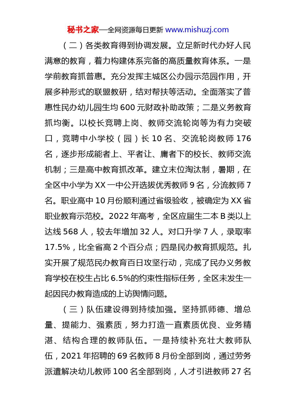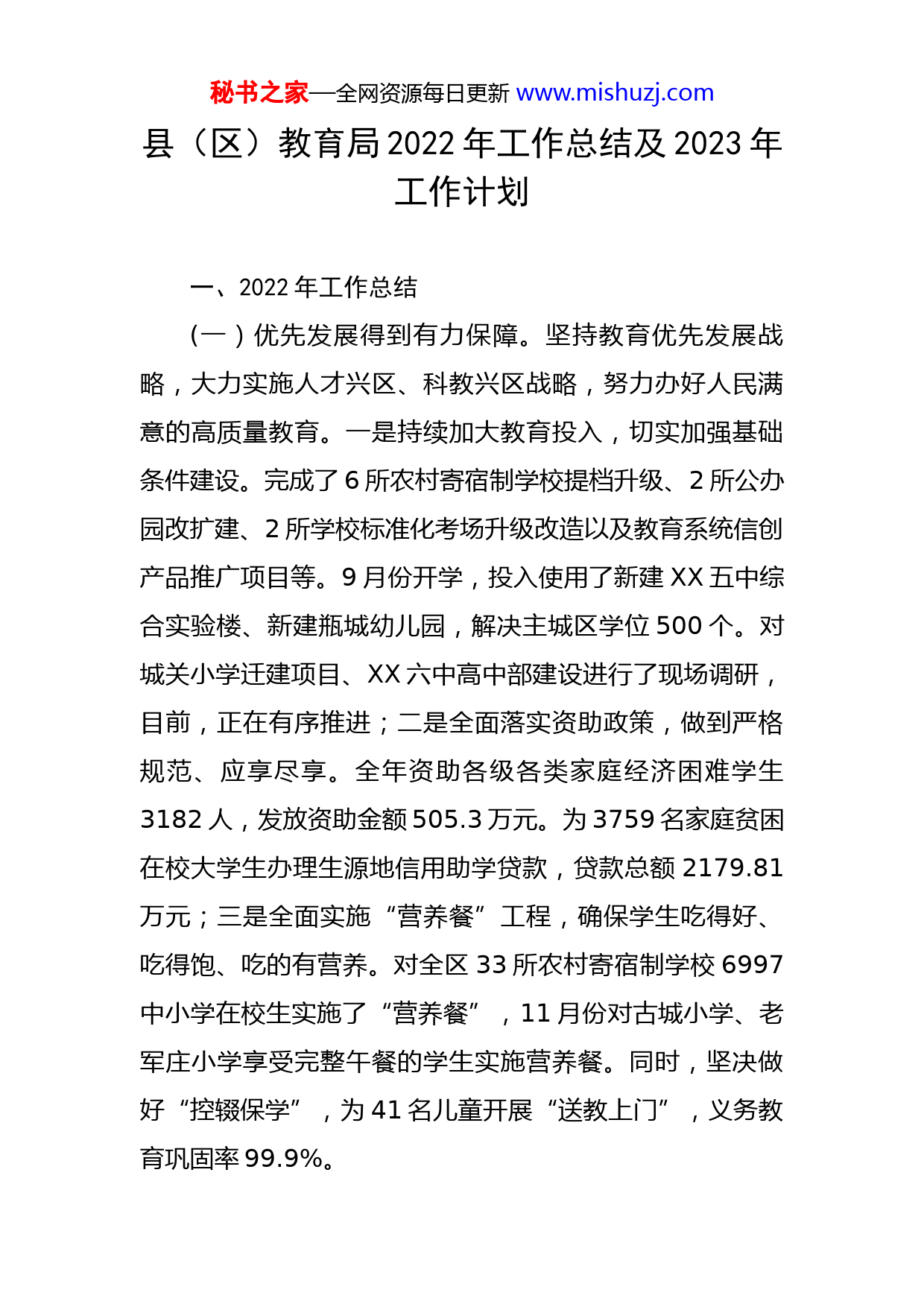 秘书之家—全网资源每日更新www.mishuzj.com县(区)教育局2022年工作总结及2023年工作计划一、2022年工作总结(一)优先发展得到有力保障。坚持教育优先发展战略,大力实施人才兴区、科教兴区战略,努力办好人民满意的高质量教育。一是持续加大教育投入,切实加强基础条件建设。完成了6所农村寄宿制学校提档升级、2所公办园改扩建、2所学校标准化考场升级改造以及教育系统信创产品推广项目等。9月份开学,投入使用了新建XX五中综合实验楼、新建瓶城幼儿园,解决主城区学位500个。对城关小学迁建项目、XX六中高中部建设进行了现场调研,目前,正在有序推进;二是全面落实资助政策,做到严格规范、应享尽享。全年资助各级各类家庭经济困难学生3182人,发放资助金额505.3万元。为3759名家庭贫困在校大学生办理生源地信用助学贷款,贷款总额2179.81万元;三是全面实施“营养餐”工程,确保学生吃得好、吃得饱、吃的有营养。对全区33所农村寄宿制学校6997中小学在校生实施了“营养餐”,11月份对古城小学、老军庄小学享受完整午餐的学生实施营养餐。同时,坚决做好“控辍保学”,为41名儿童开展“送教上门”,义务教育巩固率99.9%。秘书之家—全网资源每日更新www.mishuzj.com(二)各类教育得到协调发展。立足新时代办好人民满意的教育,着力构建体系完备的高质量教育体系。一是学前教育抓普惠。充分发挥主城区公办园示范园作用,开展多种形式的联盟教研,结对帮扶等活动。全面落实了普惠性民办幼儿园生均600元财政补助政策;二是义务教育抓均衡。以校长竞聘上岗、教师交流轮岗等为有力突破口,竞聘中小学校(园)长10名、交流轮岗教师176名,逐步形成能者上、平者让、庸者下的校长、教师交流机制;三是高中教育抓改革。建立末位淘汰制,暑期,在全区中小学为XX一中公开选拔优秀教师9名,分流教师7名。职业高中10月份顺利通过省级验收,被确定为XX省职业教育示范校。2022年高考,全区应届生二本B类以上达线568人,较去年增加32人。对口升学7人,录取率17.5%,比全省高2个百分点;四是民办教育抓规范。扎实开展了规范民办教育百日攻坚行动,完成了民办义务教育学校在校生占比6.5%的约束性指标任务,全区未发生一起因民办教育造成的上访舆情问题。(三)队伍建设得到持续加强。坚持抓师德、增总量、提能力、强素质,努力打造一直素质优良、业务精湛、结构合理的教师队伍。一是持续补充壮大教师队伍,2021年招聘的69名教师8月份全部到岗,通过劳务派遣解决幼儿教师100名全部到岗,人才引进教师27名秘书之家—全网资源每日更新www.mishuzj.com已全部完成笔试、面试,进入体检阶段;二是持续提升教师专业水平,投入近200万元,先后对全区中小学校所有教师进行了全员培训,培训人次达3500人次。8月份,组织全区校(园)长开展集中培训,着力提升学校管理水平;三是持续加强师德师风建设,开展师德师风培训2次,警示教育4次,签订从严治教责任书2000余份,着力形成学风教风校风风清气正的良好局面;四是全面提高教师待遇,开展全区教师免费常规体检,发放班主任津贴301.2万元,增量绩效工资1051.26万元,全区教师的职业幸福感、获得感大大提升。(四)素质教育得到全面提升。坚持立德树人,五育并举,大力实施素质教育,努力培养德智体美劳全面发展的社会主义建设者和接班人。一是严格落实“双减”政策,全区共设立思维训练兴趣小组143个,体艺社团334个,外聘专业教师67人,志愿者17人,课后服务覆盖率达100%。持续加大对校外培训机构的整治力度,关停“黑机构”5所,重新审核认定11所;二是全面推进素质教育,开足开全课程,在全市校园足球联赛等赛事中荣获荣誉12项,9所学校评为国家足球特色学校,8所学校评为省、市文明校园;三是着力加强未成年人思想道德建设,按照市、区统一要求部署,成立未成年人思想道德建设工作领导小组,在全区各校开展专项督导检查3次,及秘书之家—全网资源每日更新www.mishuzj.com时发现问题,提出整改意见,明确整改时限,确保各项工作落实落细。(五)校园安全得到切实巩固。坚决守牢这一底线,保障学生拥有一个健康快乐、平安和谐的学习生活环境。一是紧绷疫情防控安全弦,建立区处级领导学校疫情防控包联工作责任制,由25名区处级领导包联全区128所学校(含教学点、幼儿园),坚持核酸检测、“两码”查验等常态化防疫措施,切实保障师生健康安全;二是狠抓常规安全建设,2022年,组织开展区级以上安全大检查4次,消防、自建房、钢架结构等联合检查4次以上,安全应急演练300余次,培训餐厅、门卫等人员600人次,建成省市级平安校园60所,平安校园覆盖率达90%以上;三是守牢意识形态阵地,各校充分利用微信平台、电子屏、国旗下讲话、黑板报等宣传载体,大力弘扬社会主义核心价值观。通过开展学雷锋月、读书月、敬老孝亲月等形式多样、寓教于乐的校园文化活动,潜移默化育人,做到了守土有责、守土尽责。二、2023年工作计划(一)凝心聚力抓改革。认真应对中高考改革,转变思想理念,创新教学方式,对照改革标准,补齐“软硬件”短板,尽快适应改革要求。全面加强教育教学研究改革。紧紧围绕高中考命题抓教研、抓课改,大兴教研教改秘书之家—全网资源每日更新www.mishuzj.com之风,构建全区教师“大教研”体系。充分发挥业务骨干带头人作用,建强名