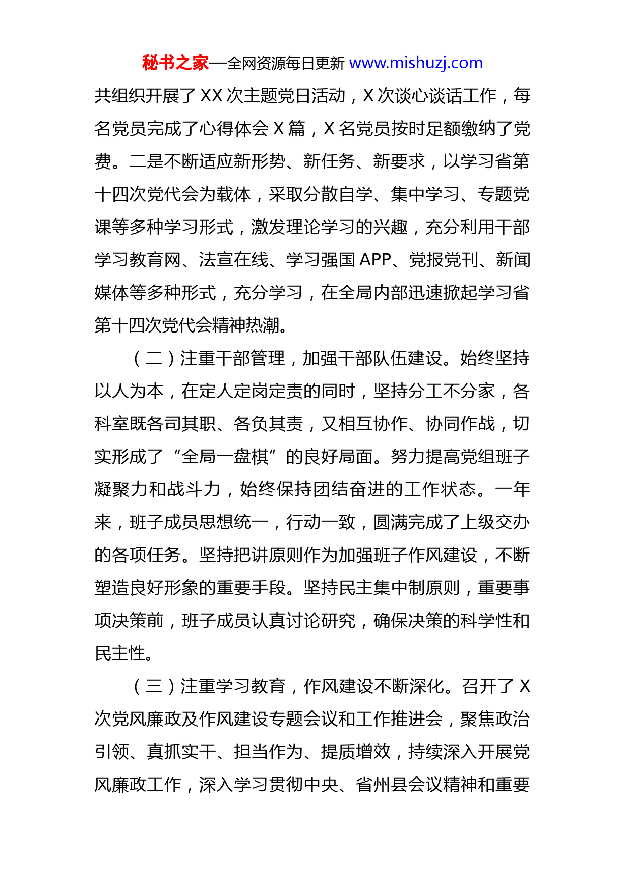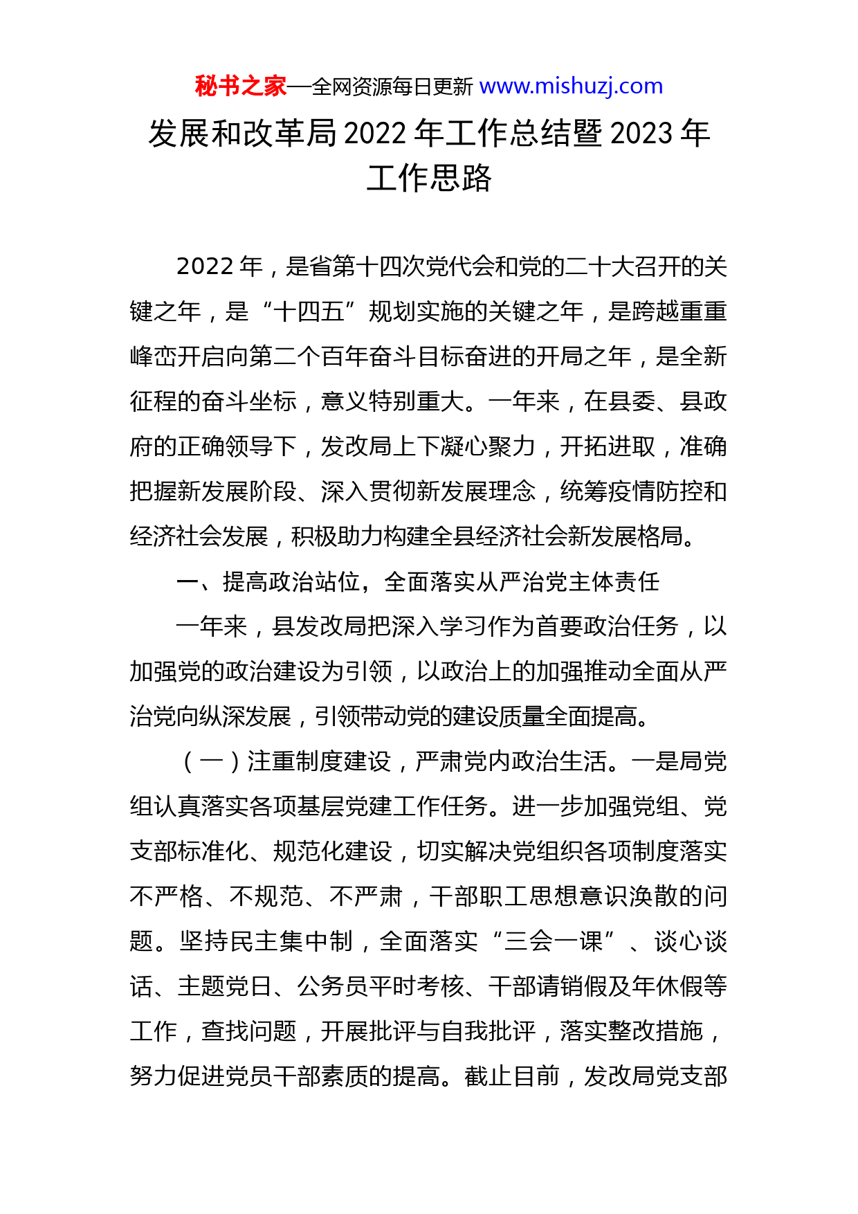 秘书之家—全网资源每日更新www.mishuzj.com发展和改革局2022年工作总结暨2023年工作思路2022年,是省第十四次党代会和党的二十大召开的关键之年,是“十四五”规划实施的关键之年,是跨越重重峰峦开启向第二个百年奋斗目标奋进的开局之年,是全新征程的奋斗坐标,意义特别重大。一年来,在县委、县政府的正确领导下,发改局上下凝心聚力,开拓进取,准确把握新发展阶段、深入贯彻新发展理念,统筹疫情防控和经济社会发展,积极助力构建全县经济社会新发展格局。一、提高政治站位,全面落实从严治党主体责任一年来,县发改局把深入学习作为首要政治任务,以加强党的政治建设为引领,以政治上的加强推动全面从严治党向纵深发展,引领带动党的建设质量全面提高。(一)注重制度建设,严肃党内政治生活。一是局党组认真落实各项基层党建工作任务。进一步加强党组、党支部标准化、规范化建设,切实解决党组织各项制度落实不严格、不规范、不严肃,干部职工思想意识涣散的问题。坚持民主集中制,全面落实“三会一课”、谈心谈话、主题党日、公务员平时考核、干部请销假及年休假等工作,查找问题,开展批评与自我批评,落实整改措施,努力促进党员干部素质的提高。截止目前,发改局党支部秘书之家—全网资源每日更新www.mishuzj.com共组织开展了XX次主题党日活动,X次谈心谈话工作,每名党员完成了心得体会X篇,X名党员按时足额缴纳了党费。二是不断适应新形势、新任务、新要求,以学习省第十四次党代会为载体,采取分散自学、集中学习、专题党课等多种学习形式,激发理论学习的兴趣,充分利用干部学习教育网、法宣在线、学习强国APP、党报党刊、新闻媒体等多种形式,充分学习,在全局内部迅速掀起学习省第十四次党代会精神热潮。(二)注重干部管理,加强干部队伍建设。始终坚持以人为本,在定人定岗定责的同时,坚持分工不分家,各科室既各司其职、各负其责,又相互协作、协同作战,切实形成了“全局一盘棋”的良好局面。努力提高党组班子凝聚力和战斗力,始终保持团结奋进的工作状态。一年来,班子成员思想统一,行动一致,圆满完成了上级交办的各项任务。坚持把讲原则作为加强班子作风建设,不断塑造良好形象的重要手段。坚持民主集中制原则,重要事项决策前,班子成员认真讨论研究,确保决策的科学性和民主性。(三)注重学习教育,作风建设不断深化。召开了X次党风廉政及作风建设专题会议和工作推进会,聚焦政治引领、真抓实干、担当作为、提质增效,持续深入开展党风廉政工作,深入学习贯彻中央、省州县会议精神和重要秘书之家—全网资源每日更新www.mishuzj.com讲话精神,以学习教育为基础、以落实制度为保障,创新工作方式方法,严格落实党风廉政建设责任。一是结合工作实际,狠抓工作落实,切实把党风廉政建设落到实处,认真学习了中央、省州县会议精神和重要讲话,领导班子成员率先履行好一岗双责,认真贯彻中央和省、州、县关于党风廉政建设的各项方针政策和规定,严格遵守《准则》和《条例》要求。按照中央、省、州、县委下发学习要求,组织全体干部职工集中学习。二是做好警示教育,组织观看《零容忍》警示教育片,引导党员干部树立纪律意识、廉洁自律意识,筑牢拒腐防变的思想道德防线,学习典型问题、典型案例、作风纪律等,全体干部职工撰写心得体会X篇。(四)注重全面覆盖,统筹疫情防控与经济社会发展。先后召开五次疫情防控专题会议,传达学习上级会议精神,统筹谋划工作。根据工作需要,制定《关于XX县新型冠状病毒感染的肺炎疫情防控处置期间物资保障工作的应急预案》《关于切实做好在建重点项目新型冠状病毒感染的肺炎疫情防控工作的紧急通知》,成立疫情防控专班,压实工作责任,明确检查任务,细化各项检查标准,对工业企业、商贸流通企业和在建项目开展疫情防控大检查XX余次,抽调XX人对联点小区开展XX小时疫情防控轮流值守工作。秘书之家—全网资源每日更新www.mishuzj.com二、对标工作重点,稳住全县经济社会发展大盘一年来,县发改局全面贯彻落实县委、县政府决策部署,担当作为、狠抓落实,各项工作迈上新台阶、取得新成效。(一)注重运行分析,各项指标稳中有进。在县委、县政府科学决策、精准调控下,全县上下全力推进项目建设,立足稳住农牧业基本盘,以打造绿色有机农畜产品输出地为目标,扎实推进高标准农田建设、化肥农药减量增效行动,农牧业发展基础进一步夯实。前三季度完成地区生产总值X.XX亿元,同比增长X%。其中第一产业完成X.XX亿元,同比增长X%,完成年度目标任务的XX.XX%;第二产业完成X.XX亿元,同比增长XX.XX%;第三产业完成X.XX亿元,同比下降X.XX%,完成年度目标任务的XX.X%。截止X月底,完成固定资产投资X.XX亿元,同比增长XX.X%,完成全年目标任务的XX.X%。完成社会消费品零售总额X.XX亿元,完成年度目标任务的XX.XX%。城镇常住居民人均可支配收入XXXXX元,同比增长X%;农村常住居民人均可支配收入完成XXXX元,同比增长X%,完成年度目标任务的XX.XX%。(二)注重要素破解,重大项目申报成效显著。强化对国家和省州宏观政策的前瞻性研究,围绕基础设施建设、乡村振兴等领域,精准对接国家稳住经济大盘、支持秘书之家—全网资源每日更新www.mishuzj.com藏区经济社会发展若干意见、四地建设等