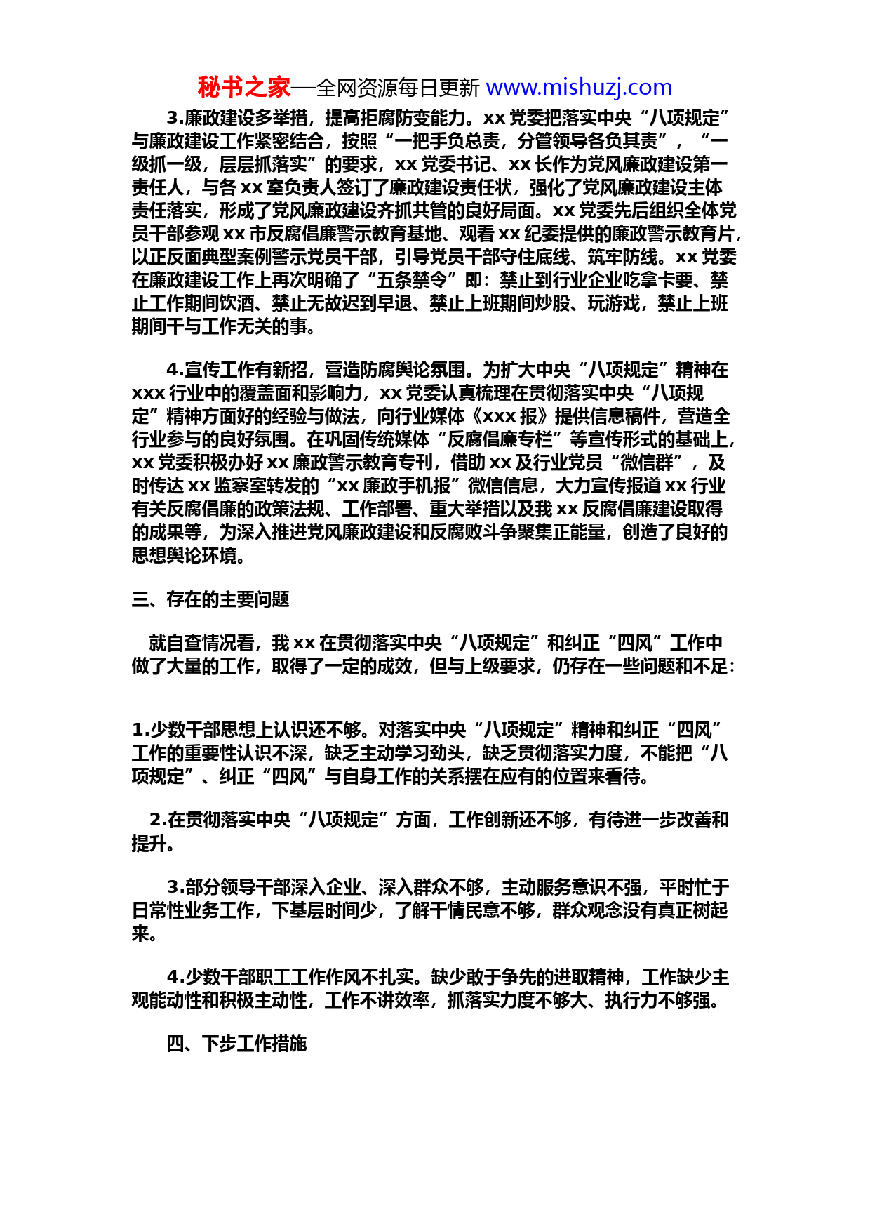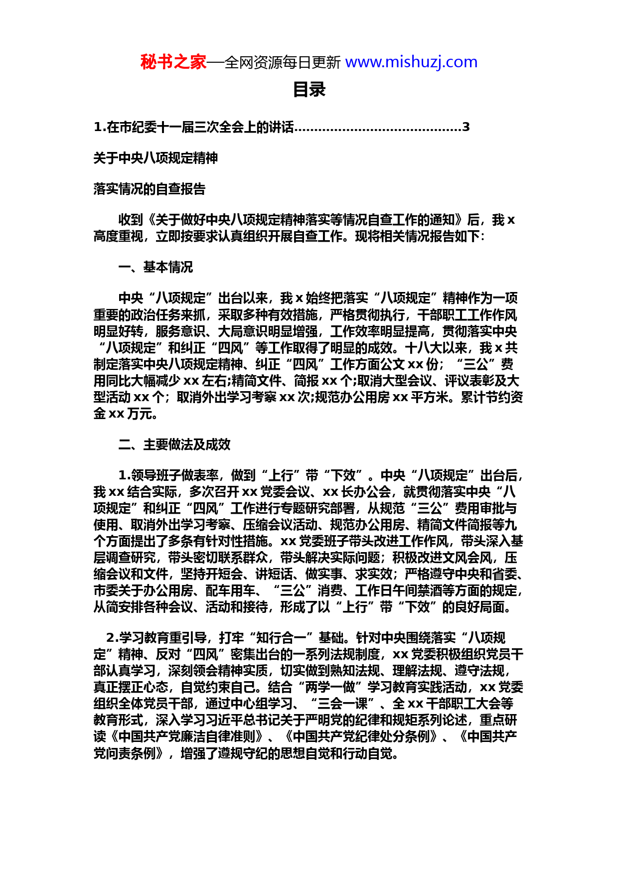 秘书之家—全网资源每日更新www.mishuzj.com目录1.在市纪委十一届三次全会上的讲话……………………………………3关于中央八项规定精神落实情况的自查报告收到《关于做好中央八项规定精神落实等情况自查工作的通知》后,我x高度重视,立即按要求认真组织开展自查工作。现将相关情况报告如下:一、基本情况中央“八项规定”出台以来,我x始终把落实“八项规定”精神作为一项重要的政治任务来抓,采取多种有效措施,严格贯彻执行,干部职工工作作风明显好转,服务意识、大局意识明显增强,工作效率明显提高,贯彻落实中央“八项规定”和纠正“四风”等工作取得了明显的成效。十八大以来,我x共制定落实中央八项规定精神、纠正“四风”工作方面公文xx份;“三公”费用同比大幅减少xx左右;精简文件、简报xx个;取消大型会议、评议表彰及大型活动xx个;取消外出学习考察xx次;规范办公用房xx平方米。累计节约资金xx万元。二、主要做法及成效1.领导班子做表率,做到“上行”带“下效”。中央“八项规定”出台后,我xx结合实际,多次召开xx党委会议、xx长办公会,就贯彻落实中央“八项规定”和纠正“四风”工作进行专题研究部署,从规范“三公”费用审批与使用、取消外出学习考察、压缩会议活动、规范办公用房、精简文件简报等九个方面提出了多条有针对性措施。xx党委班子带头改进工作作风,带头深入基层调查研究,带头密切联系群众,带头解决实际问题;积极改进文风会风,压缩会议和文件,坚持开短会、讲短话、做实事、求实效;严格遵守中央和省委、市委关于办公用房、配车用车、“三公”消费、工作日午间禁酒等方面的规定,从简安排各种会议、活动和接待,形成了以“上行”带“下效”的良好局面。2.学习教育重引导,打牢“知行合一”基础。针对中央围绕落实“八项规定”精神、反对“四风”密集出台的一系列法规制度,xx党委积极组织党员干部认真学习,深刻领会精神实质,切实做到熟知法规、理解法规、遵守法规,真正摆正心态,自觉约束自己。结合“两学一做”学习教育实践活动,xx党委组织全体党员干部,通过中心组学习、“三会一课”、全xx干部职工大会等教育形式,深入学习习近平总书记关于严明党的纪律和规矩系列论述,重点研读《中国共产党廉洁自律准则》、《中国共产党纪律处分条例》、《中国共产党问责条例》,增强了遵规守纪的思想自觉和行动自觉。秘书之家—全网资源每日更新www.mishuzj.com3.廉政建设多举措,提高拒腐防变能力。xx党委把落实中央“八项规定”与廉政建设工作紧密结合,按照“一把手负总责,分管领导各负其责”,“一级抓一级,层层抓落实”的要求,xx党委书记、xx长作为党风廉政建设第一责任人,与各xx室负责人签订了廉政建设责任状,强化了党风廉政建设主体责任落实,形成了党风廉政建设齐抓共管的良好局面。xx党委先后组织全体党员干部参观xx市反腐倡廉警示教育基地、观看xx纪委提供的廉政警示教育片,以正反面典型案例警示党员干部,引导党员干部守住底线、筑牢防线。xx党委在廉政建设工作上再次明确了“五条禁令”即:禁止到行业企业吃拿卡要、禁止工作期间饮酒、禁止无故迟到早退、禁止上班期间炒股、玩游戏,禁止上班期间干与工作无关的事。4.宣传工作有新招,营造防腐舆论氛围。为扩大中央“八项规定”精神在xxx行业中的覆盖面和影响力,xx党委认真梳理在贯彻落实中央“八项规定”精神方面好的经验与做法,向行业媒体《xxx报》提供信息稿件,营造全行业参与的良好氛围。在巩固传统媒体“反腐倡廉专栏”等宣传形式的基础上,xx党委积极办好xx廉政警示教育专刊,借助xx及行业党员“微信群”,及时传达xx监察室转发的“xx廉政手机报”微信信息,大力宣传报道xx行业有关反腐倡廉的政策法规、工作部署、重大举措以及我xx反腐倡廉建设取得的成果等,为深入推进党风廉政建设和反腐败斗争聚集正能量,创造了良好的思想舆论环境。三、存在的主要问题就自查情况看,我xx在贯彻落实中央“八项规定”和纠正“四风”工作中做了大量的工作,取得了一定的成效,但与上级要求,仍存在一些问题和不足:1.少数干部思想上认识还不够。对落实中央“八项规定”精神和纠正“四风”工作的重要性认识不深,缺乏主动学习劲头,缺乏贯彻落实力度,不能把“八项规定”、纠正“四风”与自身工作的关系摆在应有的位置来看待。2.在贯彻落实中央“八项规定”方面,工作创新还不够,有待进一步改善和提升。3.部分领导干部深入企业、深入群众不够,主动服务意识不强,平时忙于日常性业务工作,下基层时间少,了解干情民意不够,群众观念没有真正树起来。4.少数干部职工工作作风不扎实。缺少敢于争先的进取精神,工作缺少主观能动性和积极主动性,工作不讲效率,抓落实力度不够大、执行力不够强。四、下步工作措施秘书之家—全网资源每日更新www.mishuzj.com1.继续加强“八项规定”和纠正“四风”精神实质的学习与领会,教育党员干部在工作中严格按照“八项规定”的要求,从自身严起,从实际工作做起,在改进工作作风、纠正不良习惯等方面狠下功夫,切实转变工作作风,提升工作效能。2.以“八项规定”为标杆,创新廉政建设工作方式,进一步增强党员干部廉洁办事意识。在日常工作生活中做
