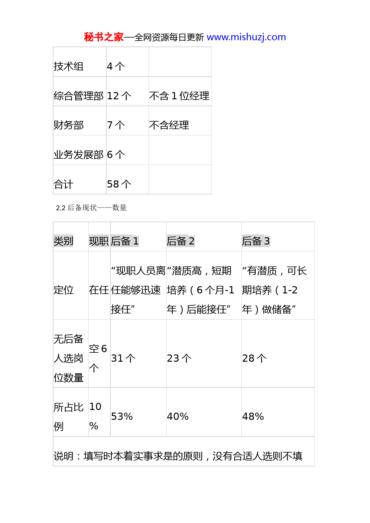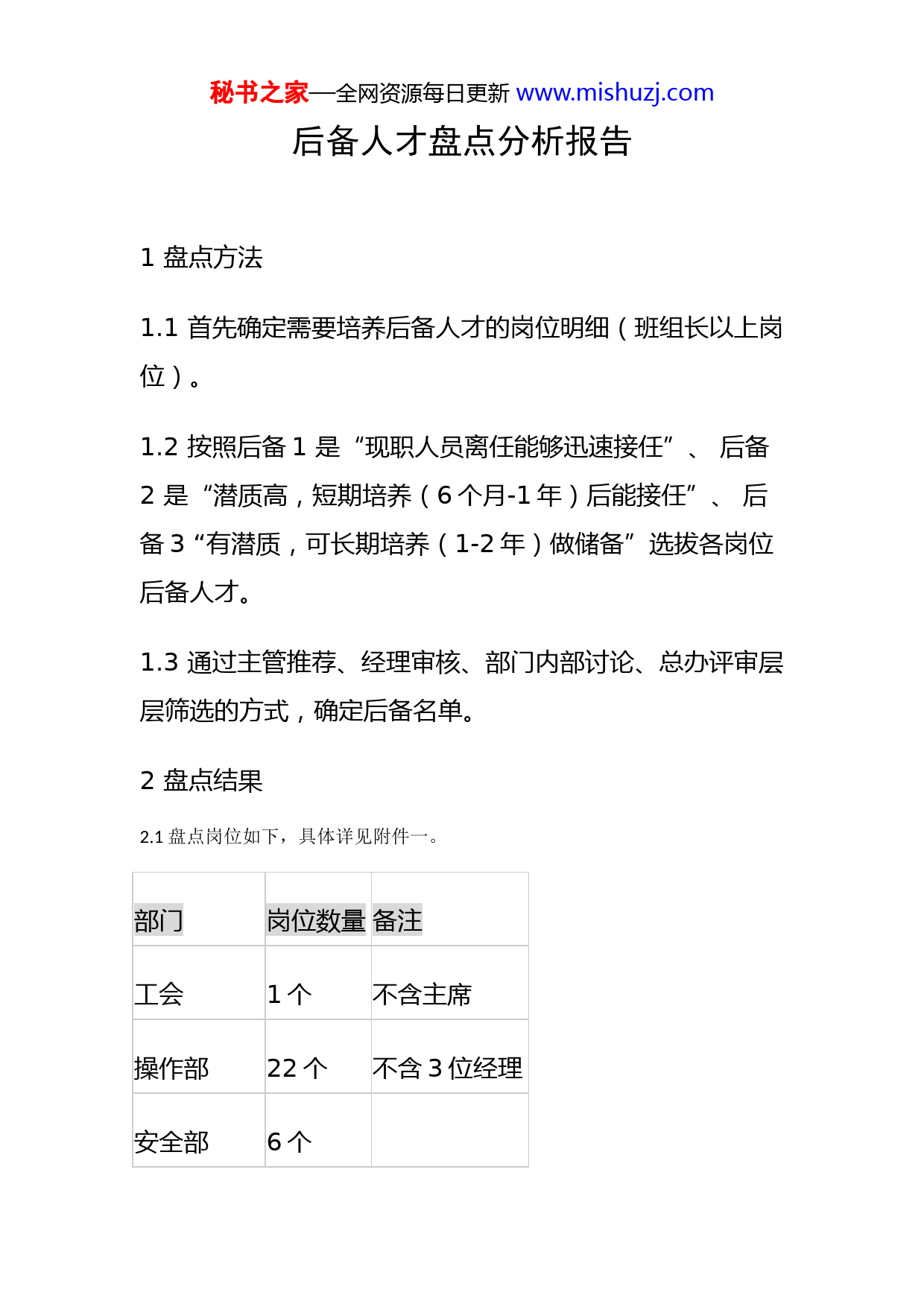 秘书之家—全网资源每日更新www.mishuzj.com后备人才盘点分析报告1盘点方法1.1首先确定需要培养后备人才的岗位明细(班组长以上岗位)。1.2按照后备1是“现职人员离任能够迅速接任”、后备2是“潜质高,短期培养(6个月-1年)后能接任”、后备3“有潜质,可长期培养(1-2年)做储备”选拔各岗位后备人才。1.3通过主管推荐、经理审核、部门内部讨论、总办评审层层筛选的方式,确定后备名单。2盘点结果2.1盘点岗位如下,具体详见附件一。部门岗位数量备注工会1个不含主席操作部22个不含3位经理安全部6个秘书之家—全网资源每日更新www.mishuzj.com技术组4个综合管理部12个不含1位经理财务部7个不含经理业务发展部6个合计58个2.2后备现状——数量类别现职后备1后备2后备3定位在任“现职人员离任能够迅速接任”“潜质高,短期培养(6个月-1年)后能接任”“有潜质,可长期培养(1-2年)做储备”无后备人选岗位数量空6个31个23个28个所占比例10%53%40%48%说明:填写时本着实事求是的原则,没有合适人选则不填秘书之家—全网资源每日更新www.mishuzj.com写。2.3后备现状——质量类别后备1后备2后备3定位“现职人员离任能够迅速接任”“潜质高,短期培养(6个月-1年)后能接任”“有潜质,可长期培养(1-2年)做储备”近三年绩效<B(即平均绩效低于良好)3人11人6人所占比例10%31%19%说明:1填写时没对选拔标准和评估结果作具体要求,目的在于比对感觉与实际之间是否有偏差,拟通过后续评审进行纠偏。281人后备名单中有5人近三年评估中出现过D。3现状分析秘书之家—全网资源每日更新www.mishuzj.com3.1高潜质后备人员:后备名单出现过2次以上的人员为21人,占26%(详见附件二),各部门在选拔后备时充分考虑到了一些高潜质员工的发展意愿,也考虑到了广泛选拔以规避人选重复可能造成的断层。3.2后备选拔途径:本着谨慎和实事求是的原则,在选拔过程中,各部门对每个岗位后备选拔要素归纳为2-3点,依此在本部门和相关部门广泛选拔、逐个筛选,一些岗位仍未能选拔出合适的人选(参见2.2),需要通过其他途径(招聘、系统内调转)进行补充。3.3大学生群体现状:目前工作年限≥五年尚未提升至管理岗位的大学生34人,其中19人未列入后备名单,工作年限不足5年的30人中有8人列入后备名单,出现了管理者选拔不出后备人选而工作年限长的员工觉得能力具备但晋升难的局面。3.4管理提升对人才的需求:公司管理模式和管理要求落地,需要各级管理人员深刻理解、转化为切实可行的办法,带领团队攻克难关,做出创新提升,对人才的需求更加迫切。3.5优秀人才晋升前提前做好储备:在公司管理提升过程中涌现一批优秀人才,他们将来得到晋升和外部发展机会需秘书之家—全网资源每日更新www.mishuzj.com要有合适的人选接替,以继续推动各项工作如期开展,这就需要提前做好储备。4存在问题与解决办法结合对后备人才盘点、各部门经理的访谈以及职业生涯管理员工调研情况,总结目前后备人才培养主要存在的问题和解决办法如下:No存在问题解决办法1后备人才选拔主观性较强,选拔标准较粗框(绩效B以上、达到本岗位素质要求B和后备岗位素质要求C)1与各部门一起,依据素质要求建立各岗位后备人才选拔标准;2建立评审机制,依据选拔标准评审并确定后备人才名单,宁缺勿滥;3探讨建立内部招聘机制,给员工自我推荐和展示的机会,有兴趣、有进取心的员工也更具有培养价值。2目前培养方式方法和力度不足,缺乏动态管理1采取重点培养的方式,每名管理者一对一负责培养一秘书之家—全网资源每日更新www.mishuzj.com名后备;2制定培养计划书(内容、时间、标准),配套培训等相关资源,定期跟踪评价培养效果;3随着管理要求提升、组织结构变化、人员流动等情况每年盘点与临时调整更新相结合。3管理岗位员工认识不足,存在个别不愿花精力培养和锻炼下属,害怕承担其工作质量不达标造成的后果1培养计划汇总细化具体措施以便督促和监督;2由上级有选择的要求管理岗位员工将一些布置给培养对象;3由部门经理指导和培训下属培养技能不足的管理岗位员工。4后备培养的激励措施不足,1落实到管理岗位职位描述秘书之家—全网资源每日更新www.mishuzj.com之中,将培养下属作为管理岗位的胜任条件之一;2落实到绩效考核之中,部门经理承担本部门人才培养指标,主管至少培养一名合格后备1;3落实到职业生涯晋升标准之中,培养1-2名后备是晋升和外部发展的必要条件之一。5培养效果的评价机制缺失建立优秀员工标准,作为培养效果的评价办法。5下一步工作计划5.1建立选拔标准、评审办法,组织实施评审,确定后备名单。——11年12月-12年1月被评选部门评审小组评审小组秘书操作部、业务发展部秘书之家—全网资源每日更新www.mishuzj.com安全部技术组综合管理部财务部5.2建立优秀员工评价标准。——11年12月5.3设计培养计划书,每个岗位选择一名最具培养价值和潜力的后备,一对一制定培养计划(时间、内容、标准),统筹和配套资源(培训、岗位交流等),确立培养目标(时限+质量)。——12年1月5.4按照培养计划分阶段跟踪培养效果,检验和评审培养结果,并落实到责任人绩效考核之中。——12年各月,年底总评
