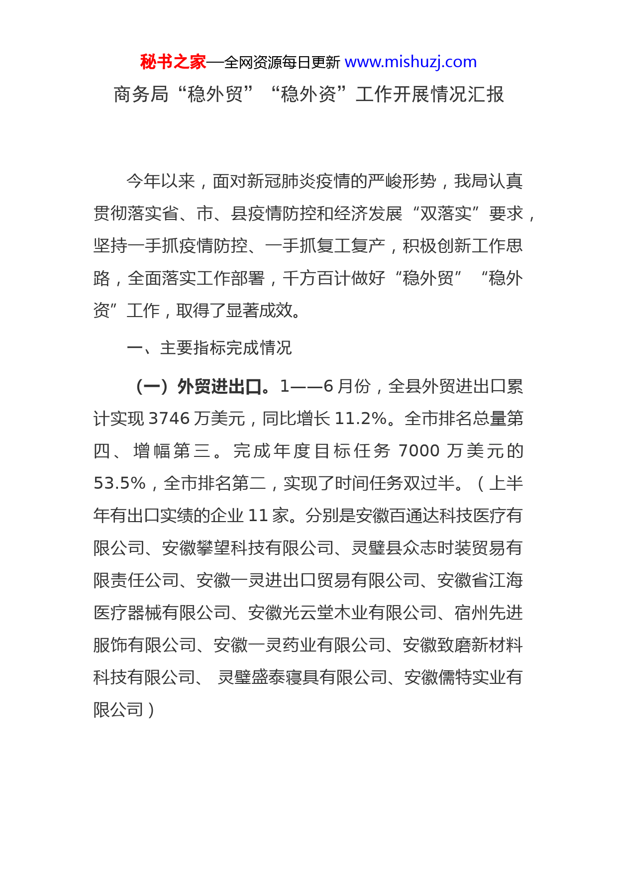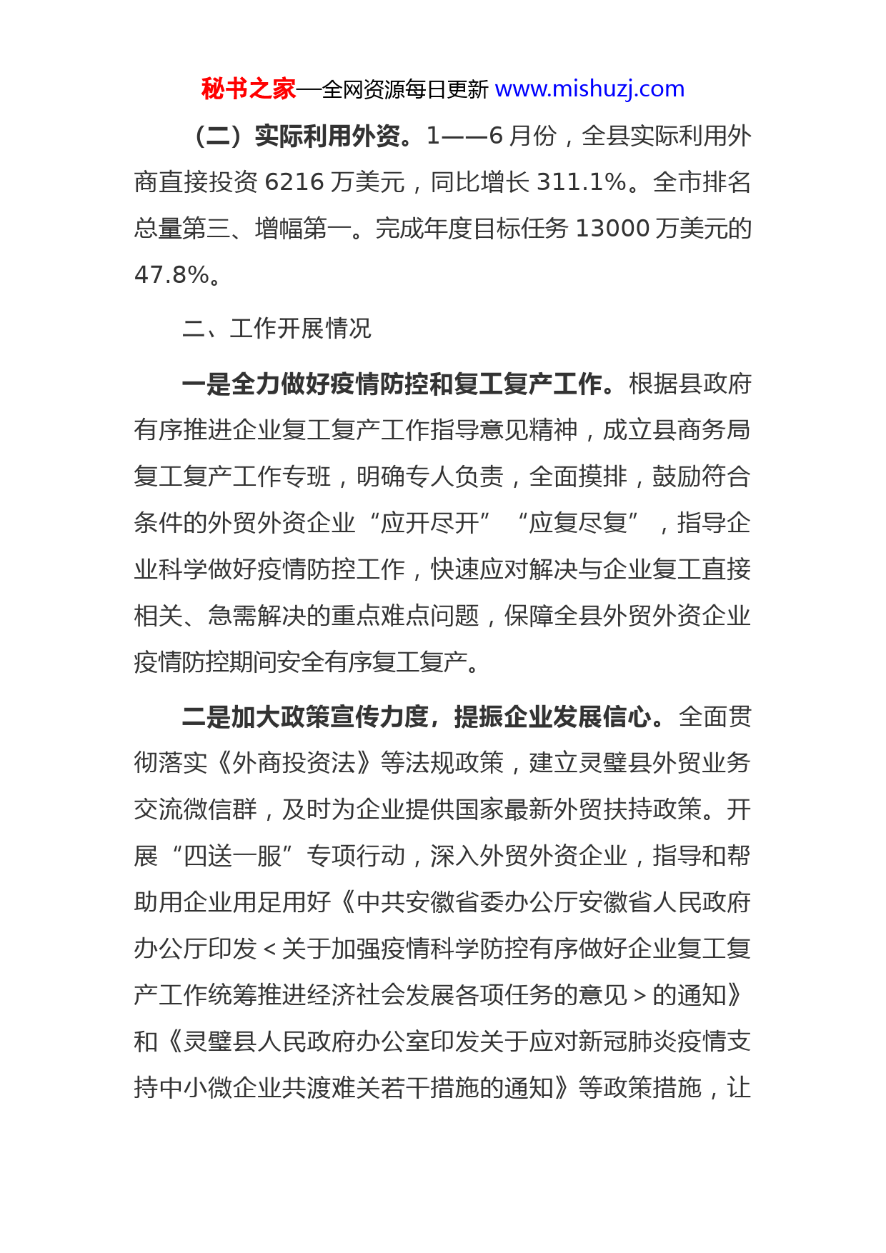 秘书之家—全网资源每日更新www.mishuzj.com商务局“稳外贸”“稳外资”工作开展情况汇报今年以来,面对新冠肺炎疫情的严峻形势,我局认真贯彻落实省、市、县疫情防控和经济发展“双落实”要求,坚持一手抓疫情防控、一手抓复工复产,积极创新工作思路,全面落实工作部署,千方百计做好“稳外贸”“稳外资”工作,取得了显著成效。一、主要指标完成情况(一)外贸进出口。1——6月份,全县外贸进出口累计实现3746万美元,同比增长11.2%。全市排名总量第四、增幅第三。完成年度目标任务7000万美元的53.5%,全市排名第二,实现了时间任务双过半。(上半年有出口实绩的企业11家。分别是安徽百通达科技医疗有限公司、安徽攀望科技有限公司、灵璧县众志时装贸易有限责任公司、安徽一灵进出口贸易有限公司、安徽省江海医疗器械有限公司、安徽光云堂木业有限公司、宿州先进服饰有限公司、安徽一灵药业有限公司、安徽致磨新材料科技有限公司、灵璧盛泰寝具有限公司、安徽儒特实业有限公司)秘书之家—全网资源每日更新www.mishuzj.com(二)实际利用外资。1——6月份,全县实际利用外商直接投资6216万美元,同比增长311.1%。全市排名总量第三、增幅第一。完成年度目标任务13000万美元的47.8%。二、工作开展情况一是全力做好疫情防控和复工复产工作。根据县政府有序推进企业复工复产工作指导意见精神,成立县商务局复工复产工作专班,明确专人负责,全面摸排,鼓励符合条件的外贸外资企业“应开尽开”“应复尽复”,指导企业科学做好疫情防控工作,快速应对解决与企业复工直接相关、急需解决的重点难点问题,保障全县外贸外资企业疫情防控期间安全有序复工复产。二是加大政策宣传力度,提振企业发展信心。全面贯彻落实《外商投资法》等法规政策,建立灵璧县外贸业务交流微信群,及时为企业提供国家最新外贸扶持政策。开展“四送一服”专项行动,深入外贸外资企业,指导和帮助用企业用足用好《中共安徽省委办公厅安徽省人民政府办公厅印发<关于加强疫情科学防控有序做好企业复工复产工作统筹推进经济社会发展各项任务的意见>的通知》和《灵璧县人民政府办公室印发关于应对新冠肺炎疫情支持中小微企业共渡难关若干措施的通知》等政策措施,让秘书之家—全网资源每日更新www.mishuzj.com企业吃下“定心丸”,稳定市场主体预期,提振企业发展信心。三是深入企业调研,强化服务意识。进一步深化服务,对重点外贸出口企业实施包保责任制,建立外贸企业联系人制度,局主要负责人和相关股室工作人员包保重点外贸企业,不定期到外贸企业走访调研,帮助企业解决生产经营和进出口遇到的问题,营造顺畅的运行环境。鼓励引导企业参加线上线下展会,不断开拓国际市场。四是加强政策扶持,解决实际困难。抓好各类“稳外贸”“稳外资”的政策落实,确保扶持政策落地见效。组织帮助外贸企业开展外经贸发展资金申报,通过微信、电话解答、专人指导等多种方式把国家的外贸扶持政策及时传达给外贸企业。2020年上半年,为我县8家企业申报市级外经贸发展专项资金123.23万元。及时了解企业困难和诉求,积极向上级反映,最大限度支持企业,将各项惠企政策落到实处,做到该减免的一律减免、该缓交的一律缓交、该补助的补助到位,帮助企业纾困解难、降本减负,切实提升企业获得感。今年3月份,为受疫情影响,已支付参展费用而不能参加境内外专业展会的安徽百通达科技医疗用品有限公司支付的706000日元(折合人民币45126元),申请按展位费全额补助。秘书之家—全网资源每日更新www.mishuzj.com五是着力孵化新的进出口企业。对办理进出口备案登记的企业,加强指导和引导,使之尽快开展进出口贸易业务,实现进出口实绩。今年上半年,我县新办进出口备案登记企业6家,新增出口实绩企业2家。三、存在的问题一是新冠肺炎疫情与中美贸易摩擦及世界经济下行交织叠加,给我县外贸进出口企业造成巨大压力。二是我县外贸企业少,规模小,骨干企业少,外贸出口结构不均衡产业素质和国际贸易竞争力不强。二是利用外资发展空间不大。主要依靠现有外资企业增资扩股等方式实现利用外资,外资项目储备不足,存量外资有限,利用外资后劲不足。四、下一步工作打算(一)稳外贸工作一是加强外贸主体培植。积极为企业争取中信保、中小开等国际市场开拓扶持政策资金的支持,针对性加强信息引导和外贸业务知识培训,加大对重点企业包保力度,培育出口增长的主力军和生力军。二是进一步加大服务力度做好政策宣传,打好稳外贸“组合拳”,确保外贸平稳增长。三是聚焦“六稳”工作,鼓励外贸企业抢抓机遇,秘书之家—全网资源每日更新www.mishuzj.com及时转型,支持企业出口防疫物资。四是引进奥园集团跨境电商企业,加快项目落户我县,尽快开展业务,实现外贸份额。(二)稳外资工作一是深入企业调研,全面挖掘外资合作、增资扩股项目线索。二是加大招商引资力度。因地制宜精准开发符合县域经济发展、具有地方特色的优势产业招商项目,为项目实施单位提供政策扶持、信息咨询等服务,帮助协调解决困难和问题;充分利用重大经贸活动平台搞好企业项目推介对接,积极参与世界制造业大会、中国国际进口博览会等重大招商活动,围绕我县主导产业精心策划