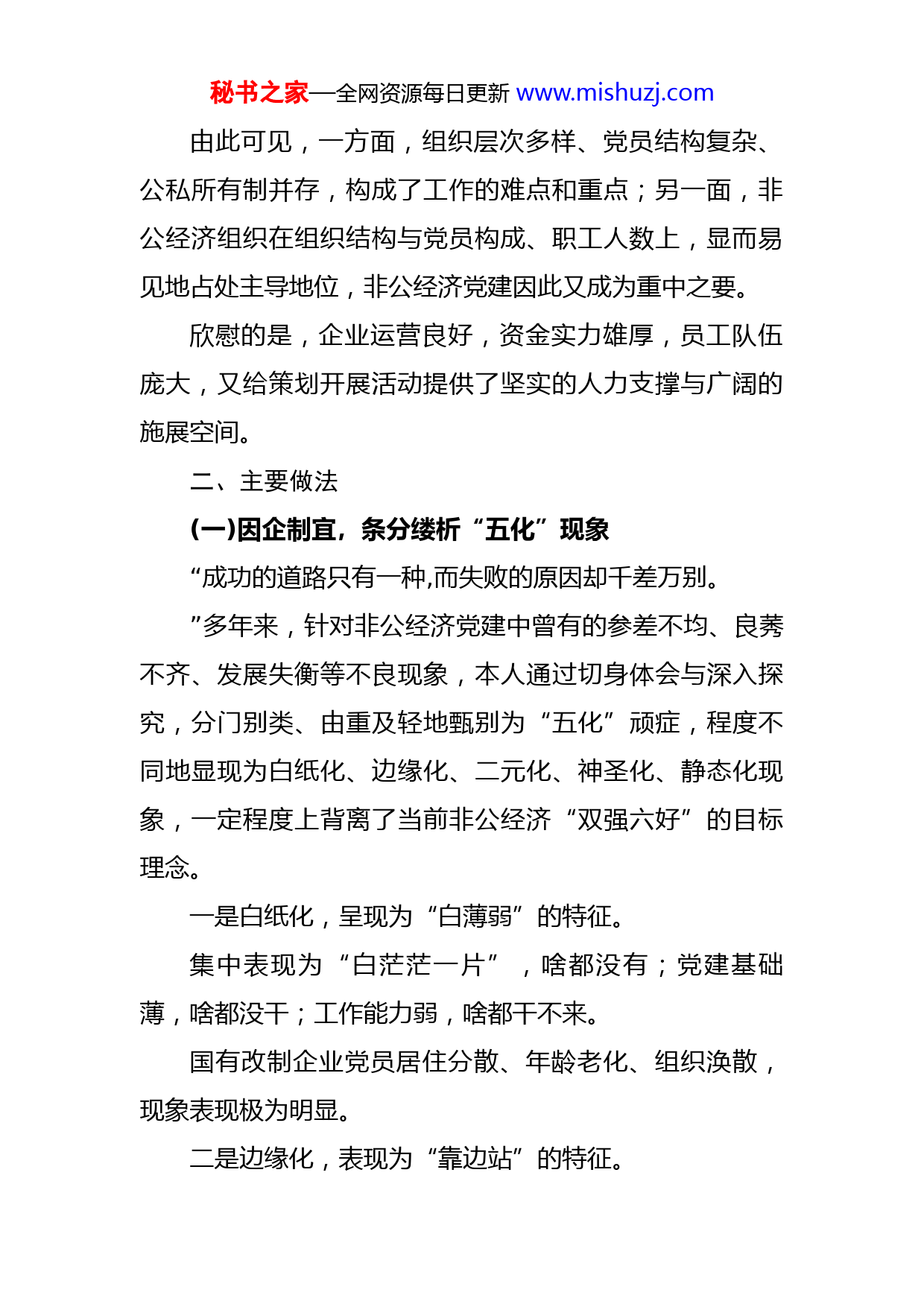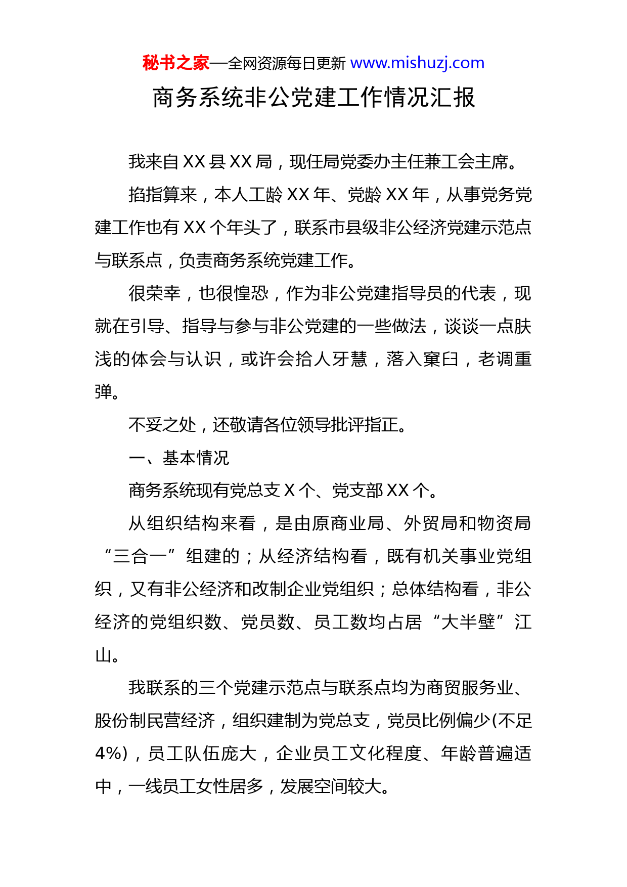 秘书之家—全网资源每日更新www.mishuzj.com商务系统非公党建工作情况汇报我来自XX县XX局,现任局党委办主任兼工会主席。掐指算来,本人工龄XX年、党龄XX年,从事党务党建工作也有XX个年头了,联系市县级非公经济党建示范点与联系点,负责商务系统党建工作。很荣幸,也很惶恐,作为非公党建指导员的代表,现就在引导、指导与参与非公党建的一些做法,谈谈一点肤浅的体会与认识,或许会拾人牙慧,落入窠臼,老调重弹。不妥之处,还敬请各位领导批评指正。一、基本情况商务系统现有党总支X个、党支部XX个。从组织结构来看,是由原商业局、外贸局和物资局“三合一”组建的;从经济结构看,既有机关事业党组织,又有非公经济和改制企业党组织;总体结构看,非公经济的党组织数、党员数、员工数均占居“大半壁”江山。我联系的三个党建示范点与联系点均为商贸服务业、股份制民营经济,组织建制为党总支,党员比例偏少(不足4%),员工队伍庞大,企业员工文化程度、年龄普遍适中,一线员工女性居多,发展空间较大。秘书之家—全网资源每日更新www.mishuzj.com由此可见,一方面,组织层次多样、党员结构复杂、公私所有制并存,构成了工作的难点和重点;另一面,非公经济组织在组织结构与党员构成、职工人数上,显而易见地占处主导地位,非公经济党建因此又成为重中之要。欣慰的是,企业运营良好,资金实力雄厚,员工队伍庞大,又给策划开展活动提供了坚实的人力支撑与广阔的施展空间。二、主要做法(一)因企制宜,条分缕析“五化”现象“成功的道路只有一种,而失败的原因却千差万别。”多年来,针对非公经济党建中曾有的参差不均、良莠不齐、发展失衡等不良现象,本人通过切身体会与深入探究,分门别类、由重及轻地甄别为“五化”顽症,程度不同地显现为白纸化、边缘化、二元化、神圣化、静态化现象,一定程度上背离了当前非公经济“双强六好”的目标理念。一是白纸化,呈现为“白薄弱”的特征。集中表现为“白茫茫一片”,啥都没有;党建基础薄,啥都没干;工作能力弱,啥都干不来。国有改制企业党员居住分散、年龄老化、组织涣散,现象表现极为明显。二是边缘化,表现为“靠边站”的特征。秘书之家—全网资源每日更新www.mishuzj.com在强势的经营为主与效益优先面前,党建工作成为“右倾路线”,被束之高阁,闲置一隅,袖手一旁,这曾在大多数非公经济组织中表现较为突出。三是二元化,表现为“两张皮”现象。党建与企业建设发展“两不沾”“各自为阵”、甚至于“背靠背”:党是党,行政是行政,事务是事务,司务是司务,导致党的工作与企业经营管理成为永不交叉的“双轨线”。四是神圣化,表现为“形而上”现象。与边缘化相对的另一极端,党建工作被捧上神坛,方式陈旧死板,内容单调枯燥,往往是正襟危坐,唯上唯书,脱离党员群众,缺乏生机与活力,缺乏针对性与务实性。五是静态化,表现为“关门主义”现象。与动态化相对(有别于党员流动与疏通关口的“动态化”),党建工作由大会到小会,从读报纸到念文件,“关门学习马列毛,照搬照抄红宝书”,时间耗在文山会海中,缺乏形式多样、内容丰富、巧妙活泼的活动与载体,缺乏灵活性与实践性,令人厌烦甚至曲解,往往收效甚微。(二)顺势利导,攻克党建“五化”顽症党的十九届四中全会《决定》首次提出了“推进党的秘书之家—全网资源每日更新www.mishuzj.com建设科学化”、“提高党的建设科学化水平”的命题。我认为,党建科学化应围绕党的建设、发展与管理、服务,可以演绎为标准化建设、制度化管理与常态化活动、人文化服务“四化”。通过分门别类,因势利导,我立足非公党建现状与工作特点,尽力攻克“五化”顽症。1.着眼组织、队伍建设,解决“白薄弱”问题一是组织建设。按照突出重点、注重实效、分类指导的原则,着眼于支部建立、调整与撤并、提升,按照“撤(转)建、改(换)、升”的工作思路,理清了隶属关系与组织建制。一是“撤”。对于已实施改制、名存实无的3个原国企、2个机关党组织予以撤销,党员移交所属社区;正在实施改制的国企党组织予以保留。二是“建”。根据“大建设”的明确要求,三年来新建企事业党支部各1个。三是“改(换)”。对(总)支部到任期满与班子成员调整的,三年来,共有5个党组织予以适时改选与换届。四是“升”。秘书之家—全网资源每日更新www.mishuzj.com部分企业规模较大、效益显著,组织工作出色、党建有力,符合升级建制条件的,将两家党支部升级为党总支。二是队伍建设。示范点党总支坚持有效施行“双培计划”,党组织和党员成了公司的“气场”与员工的“磁极”。通过上党课、学习考察、工作交流、党建研讨与专业培训、技能大赛、岗位练兵,拓宽了党务干部与党员的知识面,加强了党员队伍建设。在阵地配套建设上,按照党建的一般性要求,实现硬件“六有”目标建设,并设立党建宣传栏、走廊文化与网站、qq群等,个别公司还设置了图书阅览室、文体室、练功房。2.着意“两个核心二合一”,解决“靠边站”问题做好工作,“领头雁”是关键。董事会、总经理层是企业当然的领导核心,党组织是其政治核心。因而,如果两个核心合二为一,划上一个同心圆,作用发挥则更为明显,机制更为顺畅,关系更为协调。因此,我们主张总支书记、总经理