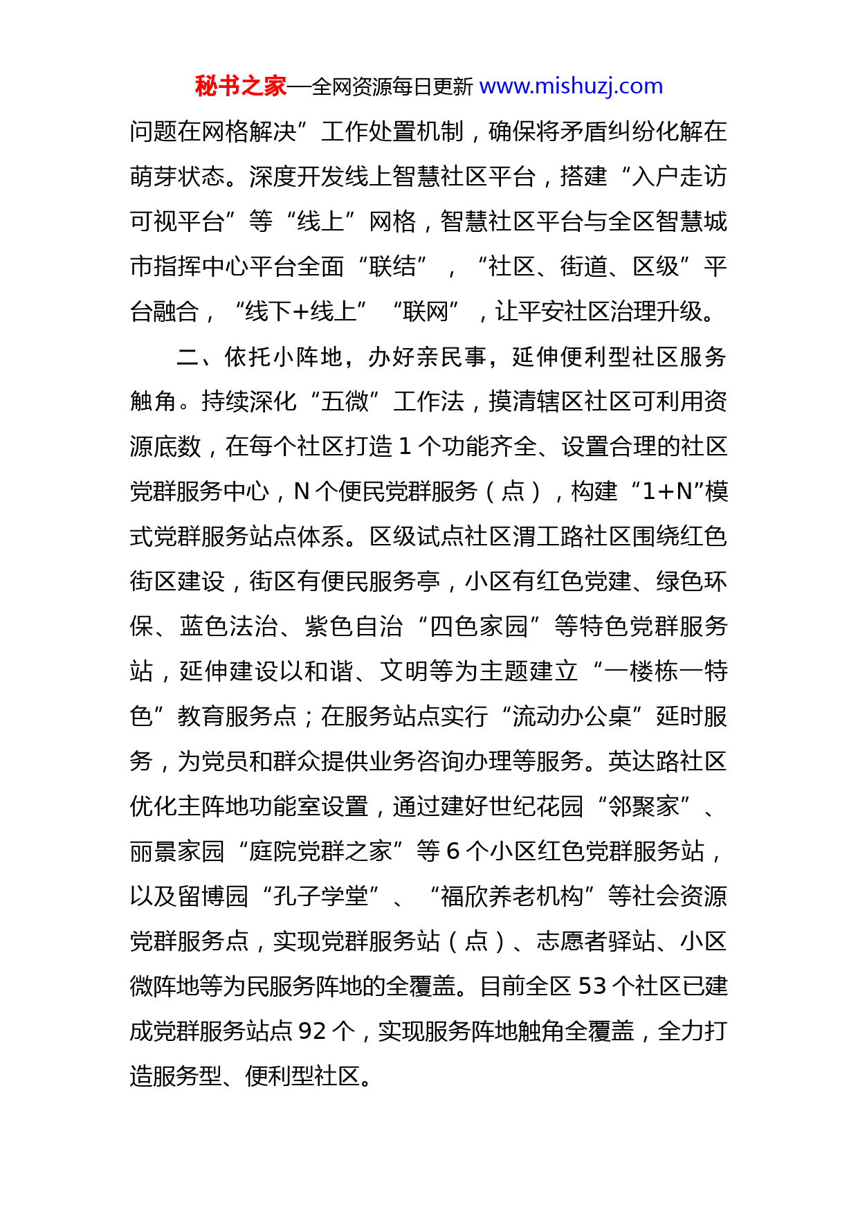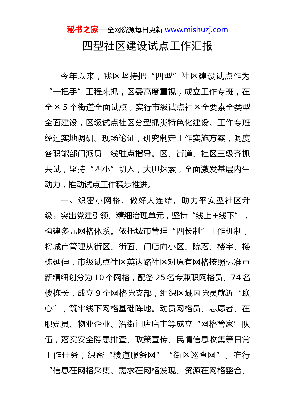 秘书之家—全网资源每日更新www.mishuzj.com四型社区建设试点工作汇报今年以来,我区坚持把“四型”社区建设试点作为“一把手”工程来抓,区委高度重视,成立工作专班,在全区5个街道全面试点,实行市级试点社区全要素全类型全面建设,区级试点社区分型抓类特色化建设。工作专班经过实地调研、现场论证,研究制定工作实施方案,调度各职能部门派员一线驻点指导。区、街道、社区三级齐抓共试,坚持“四小”切入,大胆探索,全面激发基层内生动力,推动试点工作稳步推进。一、织密小网格,做好大连结,助力平安型社区升级。突出党建引领、精细治理单元,坚持“线上+线下”,构建多元网格体系。依托城市管理“四长制”工作机制,将城市管理从街区、街面、门店向小区、院落、楼宇、楼栋延伸,市级试点社区英达路社区对原有网格按照标准重新精细划分为10个网格,配备25名专兼职网格员、74名楼栋长,成立9个网格党支部,组织区域内党员就近“联心”,筑牢线下网格基础阵地。动员网格员、志愿者、在职党员、物业企业、沿街门店店主等成立“网格管家”队伍,落实安全隐患排查、政策宣传、民情信息收集等日常工作任务,织密“楼道服务网”“街区巡查网”。推行“信息在网格采集、需求在网格发现、资源在网格整合、秘书之家—全网资源每日更新www.mishuzj.com问题在网格解决”工作处置机制,确保将矛盾纠纷化解在萌芽状态。深度开发线上智慧社区平台,搭建“入户走访可视平台”等“线上”网格,智慧社区平台与全区智慧城市指挥中心平台全面“联结”,“社区、街道、区级”平台融合,“线下+线上”“联网”,让平安社区治理升级。二、依托小阵地,办好亲民事,延伸便利型社区服务触角。持续深化“五微”工作法,摸清辖区社区可利用资源底数,在每个社区打造1个功能齐全、设置合理的社区党群服务中心,N个便民党群服务(点),构建“1+N”模式党群服务站点体系。区级试点社区渭工路社区围绕红色街区建设,街区有便民服务亭,小区有红色党建、绿色环保、蓝色法治、紫色自治“四色家园”等特色党群服务站,延伸建设以和谐、文明等为主题建立“一楼栋一特色”教育服务点;在服务站点实行“流动办公桌”延时服务,为党员和群众提供业务咨询办理等服务。英达路社区优化主阵地功能室设置,通过建好世纪花园“邻聚家”、丽景家园“庭院党群之家”等6个小区红色党群服务站,以及留博园“孔子学堂”、“福欣养老机构”等社会资源党群服务点,实现党群服务站(点)、志愿者驿站、小区微阵地等为民服务阵地的全覆盖。目前全区53个社区已建成党群服务站点92个,实现服务阵地触角全覆盖,全力打造服务型、便利型社区。秘书之家—全网资源每日更新www.mishuzj.com三、搭好小平台,汇聚各方力量,共建美丽型社区。依托街道大党委、社区党建联席会工作机制,突出“党建引领+服务居民”工作主线,凝聚各方力量,搭建“共驻共建”“商圈党建联盟”等党建服务平台,引导以居民代表大会、议事协商会等形式征集意见建议,制定、修订、完善社区和小区各项公约,引导居民自主参与小区美化、环境整治等事务,将“街区靓、小区美、楼道白、居民乐”的理念植入人心。凝聚包抓力量、用好下沉力量、发动志愿者力量、吸纳新就业群体力量及社会力量共建美丽街区、社区、小区,提升美丽社区建设。英达路社区创建“悦英达”志愿者工作坊,打造“四季歌”志愿服务品牌,广泛开展“我们的节日”“舌尖上的英达路”等各类活动,在丽景家园小区动员居民手绘小区景观墙。合力共建宜居美好家园,已成为美丽社区创建的自觉行动。四、开展小自治,做实服务管理,推进幸福型社区建设。按照“物业管+自己管”思路,在有物业管理的小区,建立物业党组织、建设“小区议事厅”,实施“组织联建、会议联席、管理联动、成效连评”四联机制,打造红色物业。在三无小区建立“红色管家”互助小组,成立世纪锦园“惠管家”、宝华高层“红管家”等居民自治队伍,以“自己管”方式开展“我的院落我做主”“美家美院”亮白计划等自治项目。落实社区网格员、物业、居秘书之家—全网资源每日更新www.mishuzj.com民、自治小组长、居民代表联席会议制度,协商解决问题,不断改善辖区居民生活环境。以“为老、为小、为困、为需”服务为重点,开展老旧小区安防提升、院落微治理、志愿者爱心商城兑换等服务,助力幸福社区创建,不断提升居民幸福指数。