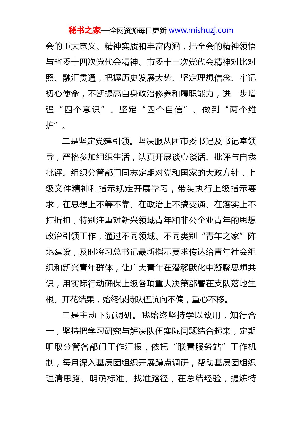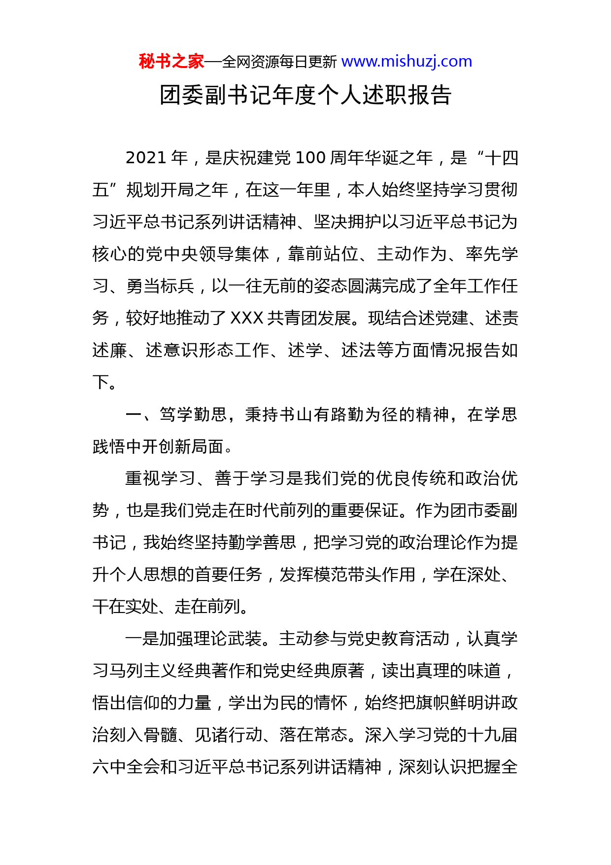 秘书之家—全网资源每日更新www.mishuzj.com团委副书记年度个人述职报告2021年,是庆祝建党100周年华诞之年,是“十四五”规划开局之年,在这一年里,本人始终坚持学习贯彻习近平总书记系列讲话精神、坚决拥护以习近平总书记为核心的党中央领导集体,靠前站位、主动作为、率先学习、勇当标兵,以一往无前的姿态圆满完成了全年工作任务,较好地推动了XXX共青团发展。现结合述党建、述责述廉、述意识形态工作、述学、述法等方面情况报告如下。一、笃学勤思,秉持书山有路勤为径的精神,在学思践悟中开创新局面。重视学习、善于学习是我们党的优良传统和政治优势,也是我们党走在时代前列的重要保证。作为团市委副书记,我始终坚持勤学善思,把学习党的政治理论作为提升个人思想的首要任务,发挥模范带头作用,学在深处、干在实处、走在前列。一是加强理论武装。主动参与党史教育活动,认真学习马列主义经典著作和党史经典原著,读出真理的味道,悟出信仰的力量,学出为民的情怀,始终把旗帜鲜明讲政治刻入骨髓、见诸行动、落在常态。深入学习党的十九届六中全会和习近平总书记系列讲话精神,深刻认识把握全秘书之家—全网资源每日更新www.mishuzj.com会的重大意义、精神实质和丰富内涵,把全会的精神领悟与省委十四次党代会精神、市委十三次党代会精神对比对照、融汇贯通,把握历史发展大势、坚定理想信念、牢记初心使命,不断提高自身政治修养和履职能力,进一步增强“四个意识”、坚定“四个自信”、做到“两个维护”。二是坚定党建引领。坚决服从团市委书记及书记室领导,严格参加组织生活,认真开展谈心谈话、批评与自我批评。组织分管部门同志定期对党和国家的大政方针,上级文件精神和指示规定开展学习,带头执行上级指示要求,在思想上不等不靠、在政治上不搞变通、在落实上不打折扣,特别注重对新兴领域青年和非公企业青年的思想政治引领工作,通过不同领域、不同类别“青年之家”阵地建设,及时将习总书记最新指示要求传达给青年社会组织和新兴青年群体,让广大青年在潜移默化中凝聚思想共识,用实际行动确保上级各项重大决策部署在支队落地生根、开花结果,始终保持队伍航向不偏,重心不移。三是主动下沉调研。我始终坚持学以致用,知行合一,坚持把学习研究与解决队伍实际问题结合起来,定期听取分管各部门工作汇报,依托“联青服务站”工作机制,每月深入基层团组织开展蹲点调研,帮助基层团组织理清思路、明确标准、找准路径,在总结经验,提炼特秘书之家—全网资源每日更新www.mishuzj.com色,宣扬亮点上久久为功。先后开展调研走访80余次,及时了解掌握机关难以听到、不易看到和意想不到的新情况、新问题和新挑战,让自己履职中认识上更透彻,思路上更清晰,措施上更精准。二、奋楫前行,秉持同舟共济扬帆起的理念,在履职尽责中展现新作为。我始终牢记做好分管工作的职责使命,在切实履行本职工作使命的同时,团结带领班子成员和队伍,在组织、权益、志愿者各项重点工作任务实践中,推动共青团相关领域取得新发展。着力做到“三个坚持。(一)坚持改革破局,在开路克难中提升组织引领。联合市委组织部出台《关于进一步加强党建带团建、队建工作的实施意见》,在工作机制、组织体系、工作品牌、工作力量、载体阵地等五大方面构建“共建、共联、共抓、共培、共享”工作格局,为XXX全域推进县域共青团基层组织改革夯实基础。一是提质各领域团建,增强团组织有效覆盖。依托“智慧团建”系统完善团员数据库和电子团员档案,常态跟进做好流动团员组织关系转接,持续推广“四联四动”团的“联动支部”工作法,全市共成立联动团支部94支,召开联席会议43次,开展各类活动467次,覆盖团员青年16337名;建设青年身边的共青团,打造功能型“青年之家”,全市已建成“青年之秘书之家—全网资源每日更新www.mishuzj.com家”189家,入驻云平台150家,入驻社会组织398家。发动团干部到“青年之家”开展青年宣讲、青春志愿、青春建功等主题活动2826场次,覆盖71264人次。二是密切团青关系,提升共青团大局贡献度。创新实施“团建助企”专项行动。通过整合机关、国企、高校及科研院所等资源,全力构建“服务青年、服务企业、服务产业”团建助企服务链;开展XXX共青团工作创新创优项目建设,下发《2021年度XXX共青团工作创新创优项目指导目录》,2021年,全市各级团组织围绕当前工作重点突破,集中优势资源,共申报市级创新创优项目69个,11个项目入选全省“10100”创新创优项目。三是坚定改革步伐,推动共青团改革纵深发展。深入贯彻《共青团基层组织改革综合试点方案》,一体规划涵盖县(市、区)、乡镇(街道)、村(社区)多个层级的县域基层组织改革,指导相城区、吴江区高质量开展改革工作,推动改革落地见效,探索出可复制可推广的共青团改革“XXX经验”。完善党团育人链条,在各行业各领域切实为党培养和输送一批青年政治骨干,全市开展市县两级“青马工程”班8个,涵盖国企、非公领域、两新组织、少先队辅导员等领域优秀青年400名。(二)坚持青年发展型城市打造,在聚力强富美高中凝聚更多青年作为。秘书之家—全网资源每日更新www.mishuzj.com围绕市委市政府中心大局,紧扣打造青年发展型城