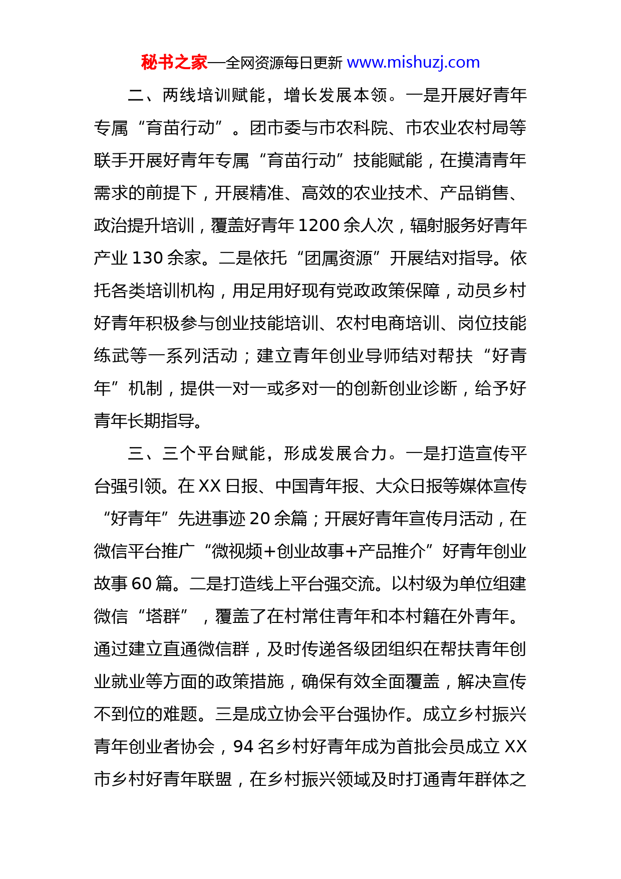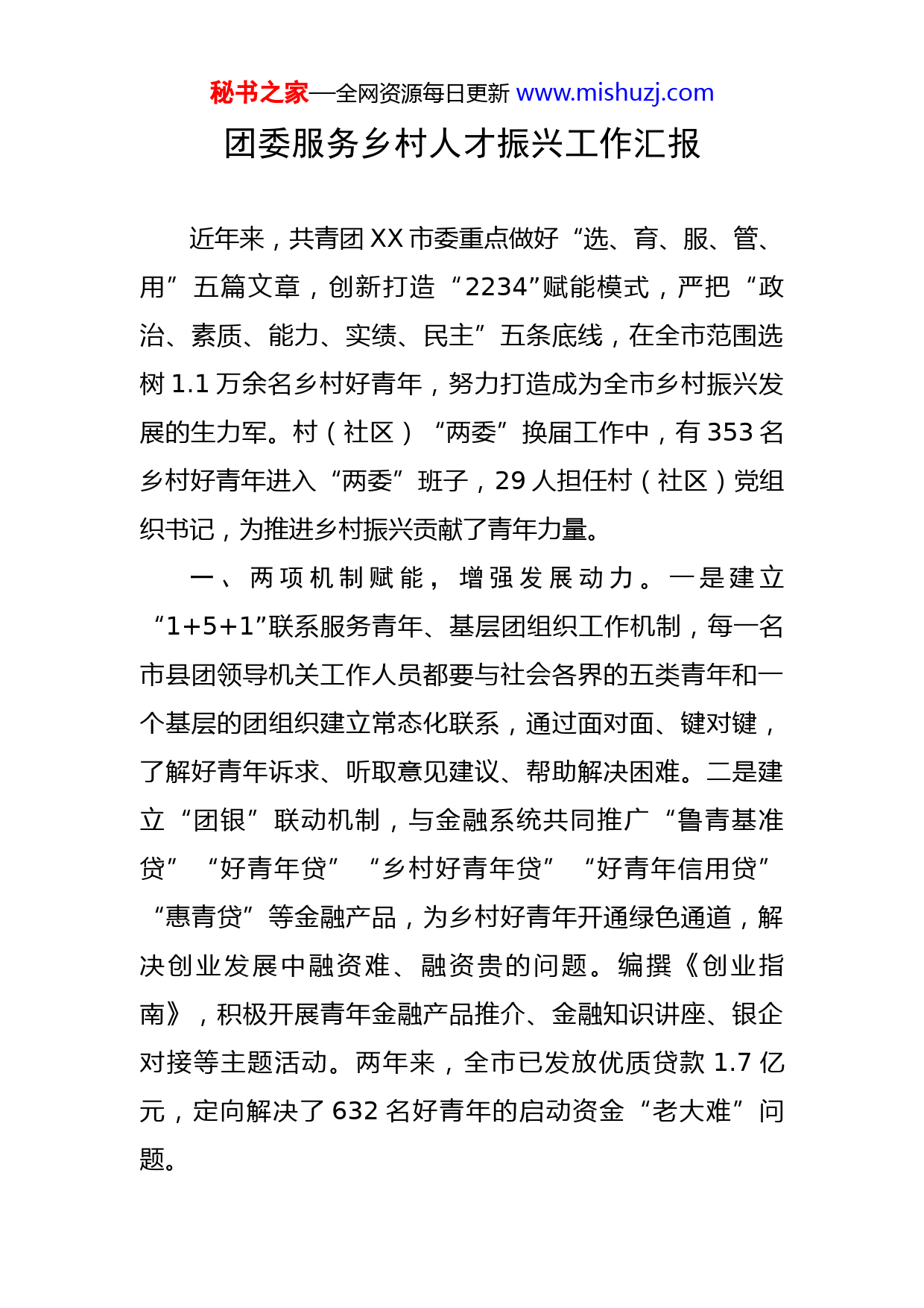 秘书之家—全网资源每日更新www.mishuzj.com团委服务乡村人才振兴工作汇报近年来,共青团XX市委重点做好“选、育、服、管、用”五篇文章,创新打造“2234”赋能模式,严把“政治、素质、能力、实绩、民主”五条底线,在全市范围选树1.1万余名乡村好青年,努力打造成为全市乡村振兴发展的生力军。村(社区)“两委”换届工作中,有353名乡村好青年进入“两委”班子,29人担任村(社区)党组织书记,为推进乡村振兴贡献了青年力量。一、两项机制赋能,增强发展动力。一是建立“1+5+1”联系服务青年、基层团组织工作机制,每一名市县团领导机关工作人员都要与社会各界的五类青年和一个基层的团组织建立常态化联系,通过面对面、键对键,了解好青年诉求、听取意见建议、帮助解决困难。二是建立“团银”联动机制,与金融系统共同推广“鲁青基准贷”“好青年贷”“乡村好青年贷”“好青年信用贷”“惠青贷”等金融产品,为乡村好青年开通绿色通道,解决创业发展中融资难、融资贵的问题。编撰《创业指南》,积极开展青年金融产品推介、金融知识讲座、银企对接等主题活动。两年来,全市已发放优质贷款1.7亿元,定向解决了632名好青年的启动资金“老大难”问题。秘书之家—全网资源每日更新www.mishuzj.com二、两线培训赋能,增长发展本领。一是开展好青年专属“育苗行动”。团市委与市农科院、市农业农村局等联手开展好青年专属“育苗行动”技能赋能,在摸清青年需求的前提下,开展精准、高效的农业技术、产品销售、政治提升培训,覆盖好青年1200余人次,辐射服务好青年产业130余家。二是依托“团属资源”开展结对指导。依托各类培训机构,用足用好现有党政政策保障,动员乡村好青年积极参与创业技能培训、农村电商培训、岗位技能练武等一系列活动;建立青年创业导师结对帮扶“好青年”机制,提供一对一或多对一的创新创业诊断,给予好青年长期指导。三、三个平台赋能,形成发展合力。一是打造宣传平台强引领。在XX日报、中国青年报、大众日报等媒体宣传“好青年”先进事迹20余篇;开展好青年宣传月活动,在微信平台推广“微视频+创业故事+产品推介”好青年创业故事60篇。二是打造线上平台强交流。以村级为单位组建微信“塔群”,覆盖了在村常住青年和本村籍在外青年。通过建立直通微信群,及时传递各级团组织在帮扶青年创业就业等方面的政策措施,确保有效全面覆盖,解决宣传不到位的难题。三是成立协会平台强协作。成立乡村振兴青年创业者协会,94名乡村好青年成为首批会员成立XX市乡村好青年联盟,在乡村振兴领域及时打通青年群体之秘书之家—全网资源每日更新www.mishuzj.com间、青年与政策之间的了解渠道,强化构建青年之间的发展协作“政治链”“人才链”和“产业链”。四、四项政策赋能,拓宽发展路径。一是推动县乡级团委书记列席涉及党建、经济社会发展等工作议题的党委常委会,增强团干部了解大局、掌握政策、服务发展的能力。二是明确通过建立群团党支部、单列发展指标等方式,优先推荐符合条件的乡村好青年入党。三是鼓励好青年参与基层治理,推荐优秀好青年列入村级后备力量库、兼职挂职进入镇街团委、担任镇街青工委班子,明确乡村“好青年”可挂职担任村党支部副书记,并作为村级团支部负责人。四是鼓励好青年参与村集体经济建设和生产经营活动,明确党政扶持资金和优惠贷款要优先资助有好青年参与的集体经济项目。