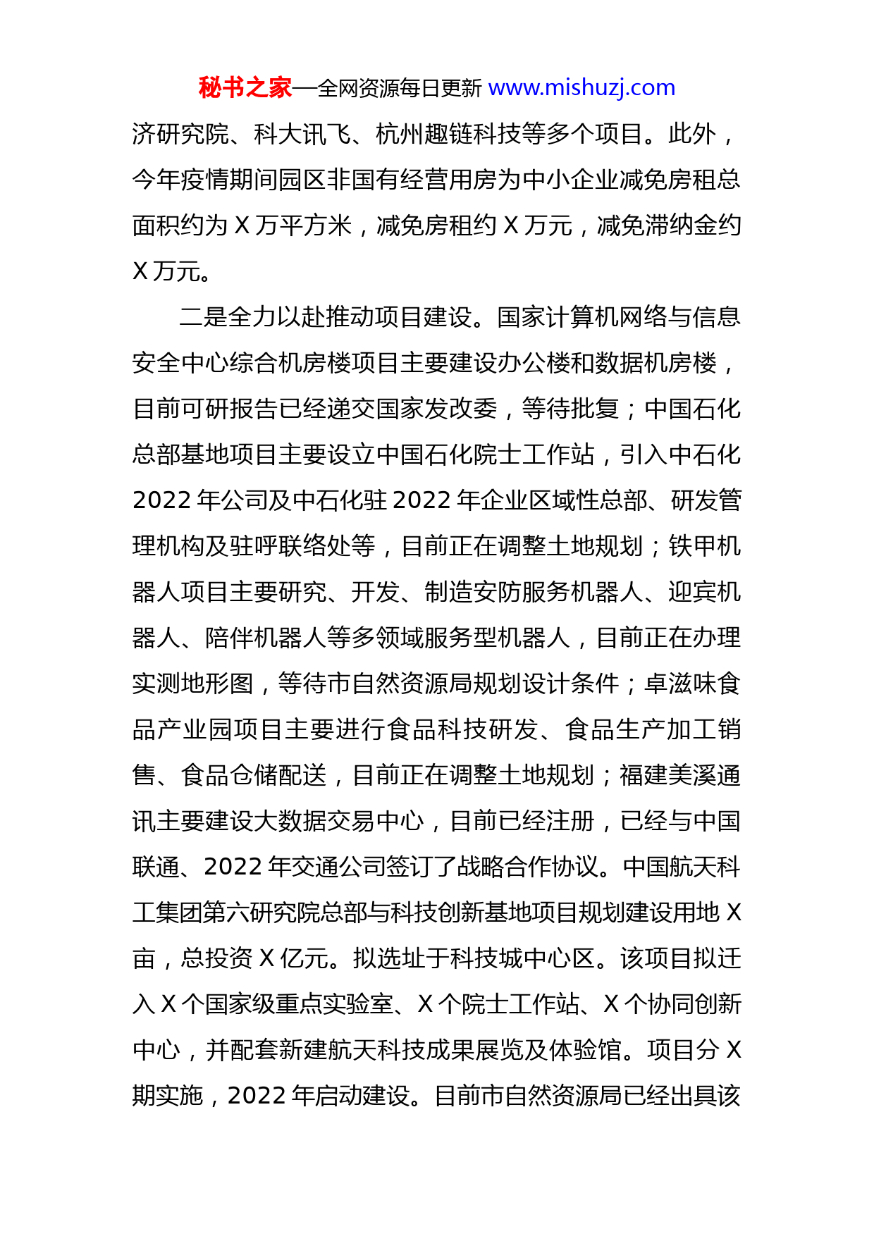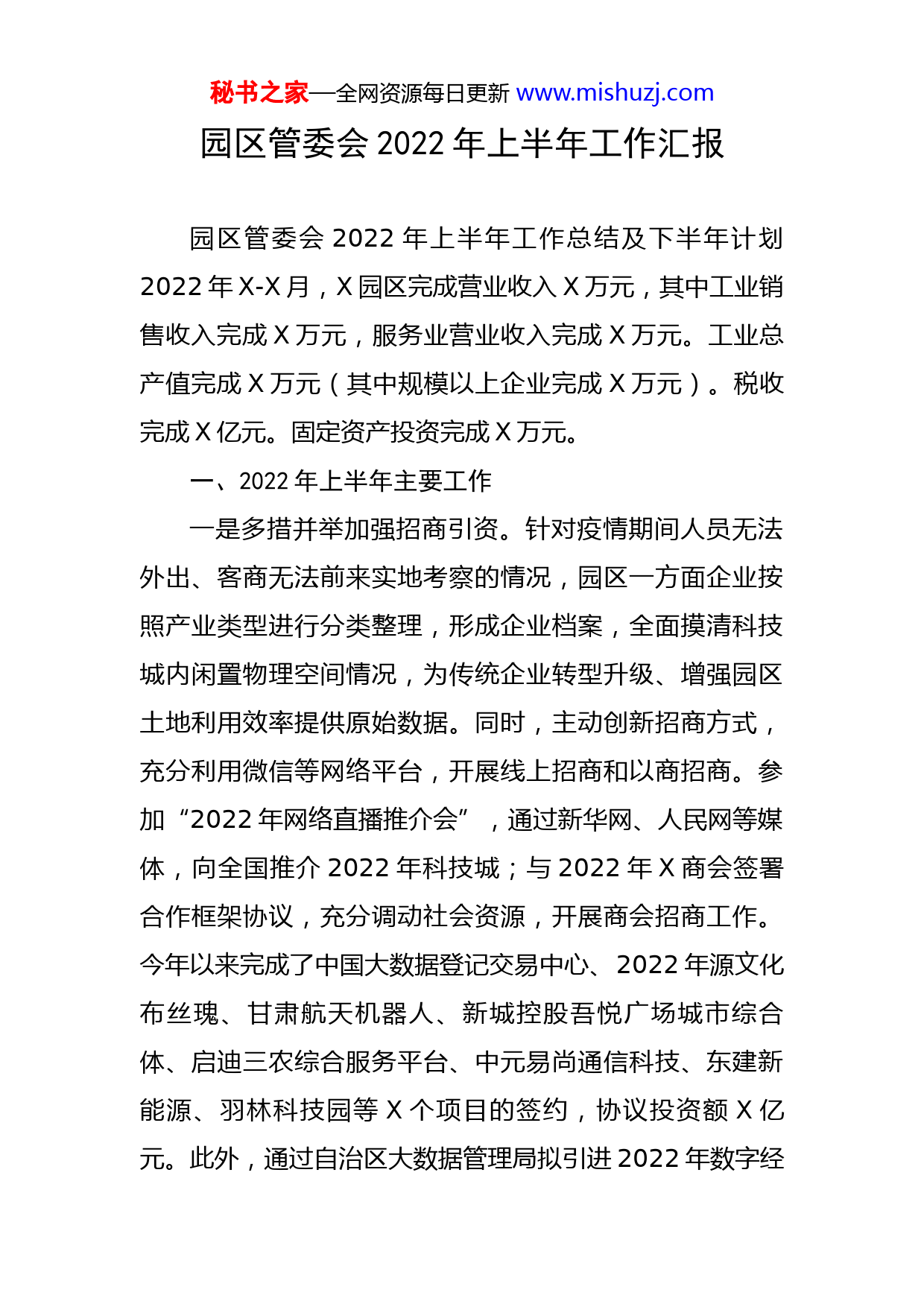 秘书之家—全网资源每日更新www.mishuzj.com园区管委会2022年上半年工作汇报园区管委会2022年上半年工作总结及下半年计划2022年X-X月,X园区完成营业收入X万元,其中工业销售收入完成X万元,服务业营业收入完成X万元。工业总产值完成X万元(其中规模以上企业完成X万元)。税收完成X亿元。固定资产投资完成X万元。一、2022年上半年主要工作一是多措并举加强招商引资。针对疫情期间人员无法外出、客商无法前来实地考察的情况,园区一方面企业按照产业类型进行分类整理,形成企业档案,全面摸清科技城内闲置物理空间情况,为传统企业转型升级、增强园区土地利用效率提供原始数据。同时,主动创新招商方式,充分利用微信等网络平台,开展线上招商和以商招商。参加“2022年网络直播推介会”,通过新华网、人民网等媒体,向全国推介2022年科技城;与2022年X商会签署合作框架协议,充分调动社会资源,开展商会招商工作。今年以来完成了中国大数据登记交易中心、2022年源文化布丝瑰、甘肃航天机器人、新城控股吾悦广场城市综合体、启迪三农综合服务平台、中元易尚通信科技、东建新能源、羽林科技园等X个项目的签约,协议投资额X亿元。此外,通过自治区大数据管理局拟引进2022年数字经秘书之家—全网资源每日更新www.mishuzj.com济研究院、科大讯飞、杭州趣链科技等多个项目。此外,今年疫情期间园区非国有经营用房为中小企业减免房租总面积约为X万平方米,减免房租约X万元,减免滞纳金约X万元。二是全力以赴推动项目建设。国家计算机网络与信息安全中心综合机房楼项目主要建设办公楼和数据机房楼,目前可研报告已经递交国家发改委,等待批复;中国石化总部基地项目主要设立中国石化院士工作站,引入中石化2022年公司及中石化驻2022年企业区域性总部、研发管理机构及驻呼联络处等,目前正在调整土地规划;铁甲机器人项目主要研究、开发、制造安防服务机器人、迎宾机器人、陪伴机器人等多领域服务型机器人,目前正在办理实测地形图,等待市自然资源局规划设计条件;卓滋味食品产业园项目主要进行食品科技研发、食品生产加工销售、食品仓储配送,目前正在调整土地规划;福建美溪通讯主要建设大数据交易中心,目前已经注册,已经与中国联通、2022年交通公司签订了战略合作协议。中国航天科工集团第六研究院总部与科技创新基地项目规划建设用地X亩,总投资X亿元。拟选址于科技城中心区。该项目拟迁入X个国家级重点实验室、X个院士工作站、X个协同创新中心,并配套新建航天科技成果展览及体验馆。项目分X期实施,2022年启动建设。目前市自然资源局已经出具该秘书之家—全网资源每日更新www.mishuzj.com项目规划设计条件,马上即可开展土地征收及报批事宜。东源投资集团项目及浪潮集团项目建设手续已全部办理完毕,现均已开工。荣丰科技城、正风教育、鸿德学院北校区正在办理建设手续,争取年内全部完成。同时,科技城中心区及TCL、FX等X家企业项目用地土地报批手续正在陆续办理。三是全心全意搞好为企服务。坚持以人民为中心的发展思想,建立和完善了干部包联企业制度,帮助企业和项目解决困难和问题。今年以来,多次对接2022年市自然资源局,帮助联通、TCL、意林、国药、铁甲机器人、卓滋味等企业和项目协调解决土地手续办理问题;对接中国农业银行呼市分行、建设银行、兴业银行、招商银行、金谷农商行、浙商银行等金融机构,帮助解决中小企业贷款问题。2022年X月主办以“宣传信贷政策、推介信贷产品、促进银企合作”为主题的银企对接会,2022年X月举办高新技术企业政策培训会,提升企业核心竞争力。为了持续优化营商环境,推进2022年科技城治理体系和治理能力现代化,推动高质量发展,结合本地区实际情况,今年还起草了《2022年科技城招商引资“企业零跑腿”服务方案(暂行)》和《“拿地即开工”改革实施方案》,为入驻2022年科技城且与新城区政府签订合作协议的非金融类企业,提供从市场准入阶段到施工许可阶段“企业零跑腿”秘书之家—全网资源每日更新www.mishuzj.com服务,实行全程代办、一窗受理、并联审批、跟踪服务,确保在最短时限内完成。四是立足长远加快组建基金。开展了融创母基金的公司注册、银行账户开立、基金业协会产品备案,完成了母基金的组建工作,具备投资条件。同时完成了融创母基金第一支子基金(即国创大数据基金)的投资决策工作,形成同意投资的意见。目前已完成国创大数据基金的文件签署和工商变更以及基金业协会的产品重大变更,下半年开展投资。发起了融创母基金第二支直管子基金(即新动能基金),重点投资于新城区重点产业,推动创新创业和招商引资工作。目前基金组建方案已经上报,审批后立即启动组建工作。此外,拟引入2022年发改委支持的石墨烯新材料产业基金与我区融商创新创业产业母基金形成X亿元的子基金规模,用于常州二维暖烯科技公司在我区石墨烯产业基地的研发及建设,目前该基金正在谈判中。近期还对接了自治区财政厅重点产业基金、自治区财政厅文化产业基金、自治区农牧业基金、自治区军民融合基金、自治区发改委石墨烯基金等多支政府引导基金,以及冬瓜基金、助创资本、君富资本等多家基金管理人公司,沟通组建子基金事宜。预计年内至少可
