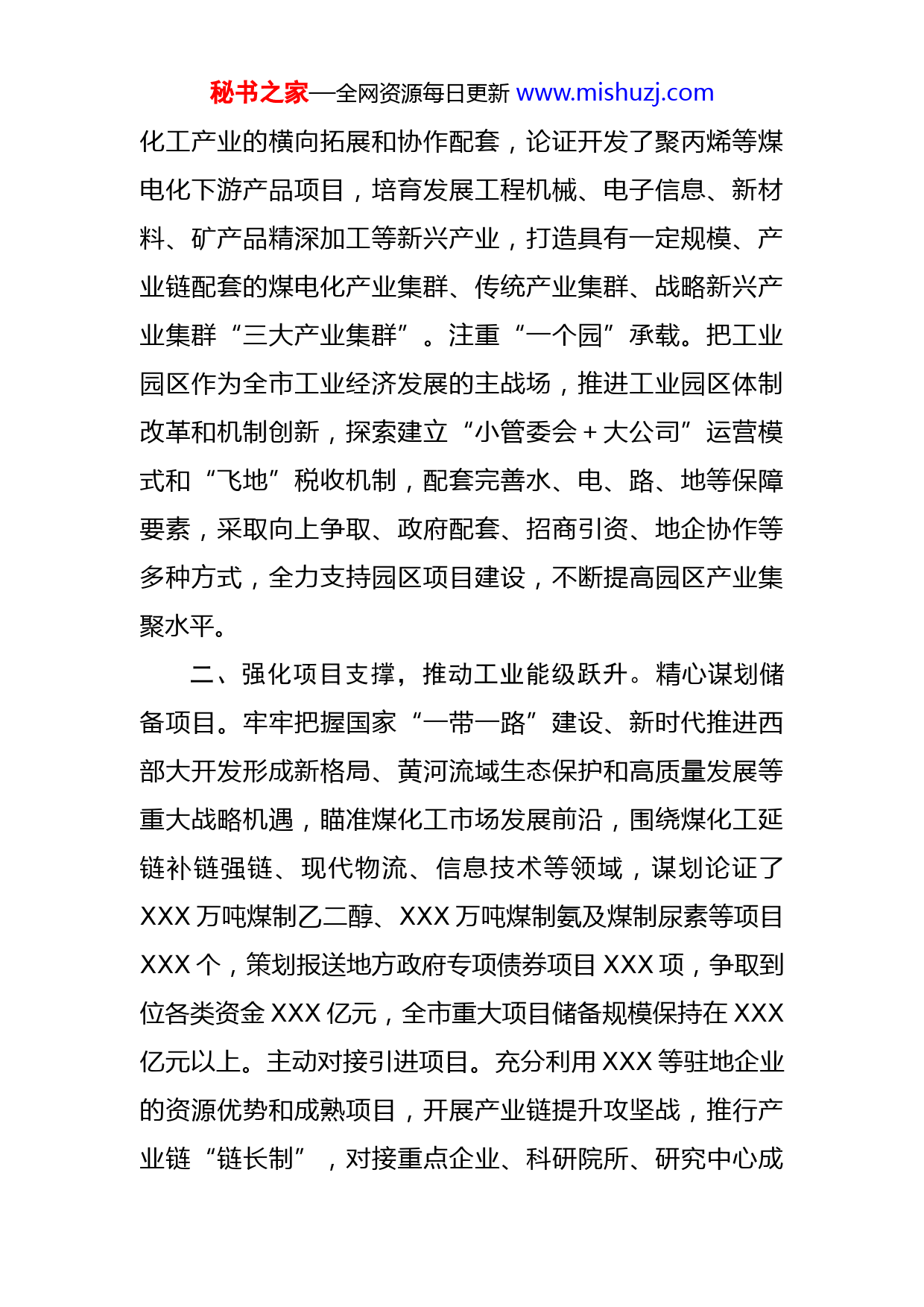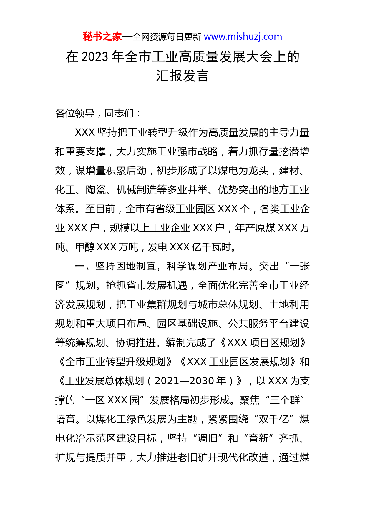 秘书之家—全网资源每日更新www.mishuzj.com在2023年全市工业高质量发展大会上的汇报发言各位领导,同志们:XXX坚持把工业转型升级作为高质量发展的主导力量和重要支撑,大力实施工业强市战略,着力抓存量挖潜增效,谋增量积累后劲,初步形成了以煤电为龙头,建材、化工、陶瓷、机械制造等多业并举、优势突出的地方工业体系。至目前,全市有省级工业园区XXX个,各类工业企业XXX户,规模以上工业企业XXX户,年产原煤XXX万吨、甲醇XXX万吨,发电XXX亿千瓦时。一、坚持因地制宜,科学谋划产业布局。突出“一张图”规划。抢抓省市发展机遇,全面优化完善全市工业经济发展规划,把工业集群规划与城市总体规划、土地利用规划和重大项目布局、园区基础设施、公共服务平台建设等统筹规划、协调推进。编制完成了《XXX项目区规划》《全市工业转型升级规划》《XXX工业园区发展规划》和《工业发展总体规划(2021—2030年)》,以XXX为支撑的“一区XXX园”发展格局初步形成。聚焦“三个群”培育。以煤化工绿色发展为主题,紧紧围绕“双千亿”煤电化冶示范区建设目标,坚持“调旧”和“育新”齐抓、扩规与提质并重,大力推进老旧矿井现代化改造,通过煤秘书之家—全网资源每日更新www.mishuzj.com化工产业的横向拓展和协作配套,论证开发了聚丙烯等煤电化下游产品项目,培育发展工程机械、电子信息、新材料、矿产品精深加工等新兴产业,打造具有一定规模、产业链配套的煤电化产业集群、传统产业集群、战略新兴产业集群“三大产业集群”。注重“一个园”承载。把工业园区作为全市工业经济发展的主战场,推进工业园区体制改革和机制创新,探索建立“小管委会+大公司”运营模式和“飞地”税收机制,配套完善水、电、路、地等保障要素,采取向上争取、政府配套、招商引资、地企协作等多种方式,全力支持园区项目建设,不断提高园区产业集聚水平。二、强化项目支撑,推动工业能级跃升。精心谋划储备项目。牢牢把握国家“一带一路”建设、新时代推进西部大开发形成新格局、黄河流域生态保护和高质量发展等重大战略机遇,瞄准煤化工市场发展前沿,围绕煤化工延链补链强链、现代物流、信息技术等领域,谋划论证了XXX万吨煤制乙二醇、XXX万吨煤制氨及煤制尿素等项目XXX个,策划报送地方政府专项债券项目XXX项,争取到位各类资金XXX亿元,全市重大项目储备规模保持在XXX亿元以上。主动对接引进项目。充分利用XXX等驻地企业的资源优势和成熟项目,开展产业链提升攻坚战,推行产业链“链长制”,对接重点企业、科研院所、研究中心成秘书之家—全网资源每日更新www.mishuzj.com功引进XXX动化综采工作面设备、。围绕优势产业关联配套和行业龙头企业、税源型性项目,积极对接洽谈引入XXX等大型企业,投资建设低阶煤高效低碳清洁化综合利用、液体二氧化碳等煤化工延链补链项目。全力保障推进项目。对重点项目的洽谈、重要客商的接待、重大项目的落地,实行“一个项目、一位领导、一套班子、一个方案、一抓到底”的“五个一”工作机制,真正做到“有事急办、急事快办、特事特办、难事帮办”,不断提升服务质量水平。推行项目团队化管理模式,积极推进煤矸石和气化渣资源化利用等新建项目手续办理,加快中小企业创业园、生活污水处理扩容改造等项目建设力度。三、坚持多元并进,优化传统工业结构。做精做优陶瓷建材产业。累计投资XXX亿元的XXX集团,建成陶瓷生产线XXX条、新型建材生产线XXX条、轻钢别墅生产线XXX条;累计投资XXX万元的XXX新型建材开发公司,建成粉煤灰加气块和蒸压砖生产线XXX条;累计投资XXX亿元的XXX管业有限公司,建成PE/PPR管材生产线XXX条;投资XXX万元的XXX公司和投资XXX万元的XXX公司分别建成年处理XXX万吨、XXX万吨废旧轮胎循环利用综合处理生产线各XXX条;总投资XXX亿元的XXX个建筑材料公司,建成混凝土、石灰和砼外加剂生产线。做大做强装备制造产业。按照“横向联合、纵向延秘书之家—全网资源每日更新www.mishuzj.com伸”的发展思路,稳步推进传统工业升级换代,建成以XXX等为龙头的制造企业,重点发展液压支架、煤矿井下运输设备等煤炭机械制造和维修,进一步提升了装备制造业的现代化水平。做深做特农产品加工产业。坚持用工业化思维谋划农业,以XXX药材龙头企业为依托,投资XXX亿元实施的XXX建设项目,年加工各类地产药材XXX多种,加工量达XXX吨,产值达XXX万元,创利税XXX余万元。投资XXX万元,建成年屠宰万头肉牛的屠宰分割生产线和年产XXX吨熟肉食品生产线各XXX条。四、主抓服务保障,优化软硬发展环境。在服务园区建设方面,累计投资XXX亿元,着力解决制约发展的水、电、网、路、垃圾、污水处理、环境优化等瓶颈问题,不断提升园区承载力和吸引力。今年计划投资XXX亿元,分两期建设占地XXX亩的中小企业创业园,目前已累计完成投资XXX万元,项目建成后,可容纳XXX户企业,有效提升园区工业集聚水平,为推动煤化工延链补链提供有力支撑。在服务企业发展方面,为企业提供项目手续代办、建设代管、技术指导等服务措施,确保入园企业和项目顺利落地建设;成立XXX融资公司,为企业银行贷款提供担保,缓解企业资金压力;对园区内投产企业在污水处理、厂房租赁方面按照“保本微利”原则实施收费,最大限度降低企业生产