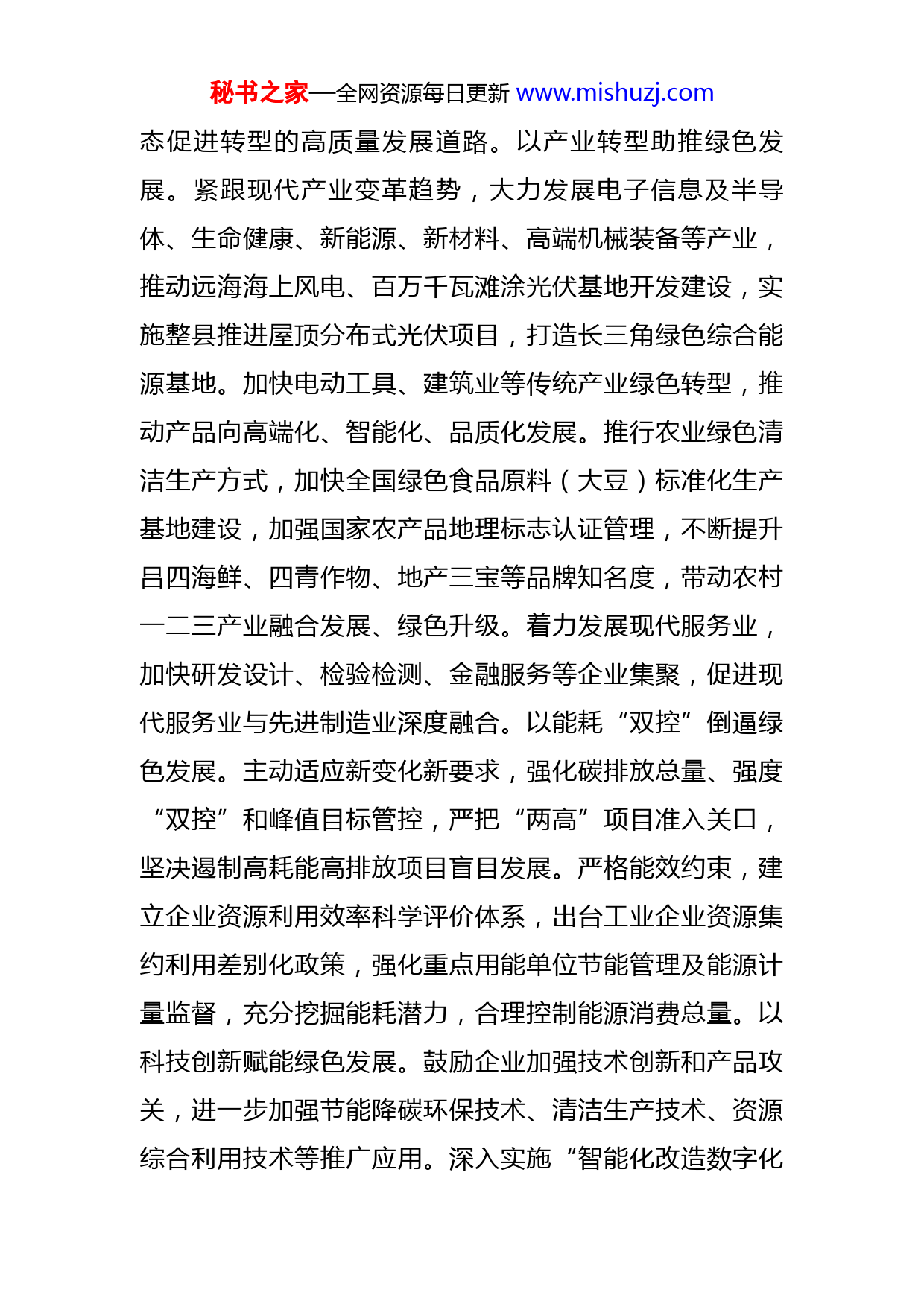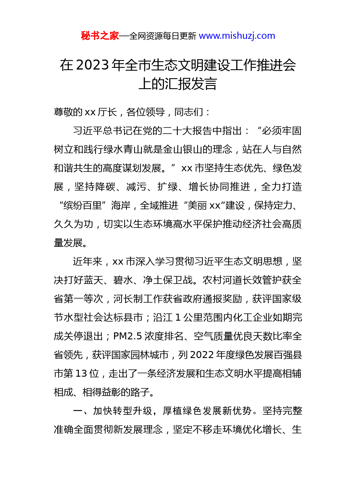 秘书之家—全网资源每日更新www.mishuzj.com在2023年全市生态文明建设工作推进会上的汇报发言尊敬的xx厅长,各位领导,同志们:习近平总书记在党的二十大报告中指出:“必须牢固树立和践行绿水青山就是金山银山的理念,站在人与自然和谐共生的高度谋划发展。”xx市坚持生态优先、绿色发展,坚持降碳、减污、扩绿、增长协同推进,全力打造“缤纷百里”海岸,全域推进“美丽xx”建设,保持定力、久久为功,切实以生态环境高水平保护推动经济社会高质量发展。近年来,xx市深入学习贯彻习近平生态文明思想,坚决打好蓝天、碧水、净土保卫战。农村河道长效管护获全省第一等次,河长制工作获省政府通报奖励,获评国家级节水型社会达标县市;沿江1公里范围内化工企业如期完成关停退出;PM2.5浓度排名、空气质量优良天数比率全省领先,获评国家园林城市,列2022年度绿色发展百强县市第13位,走出了一条经济发展和生态文明水平提高相辅相成、相得益彰的路子。一、加快转型升级,厚植绿色发展新优势。坚持完整准确全面贯彻新发展理念,坚定不移走环境优化增长、生秘书之家—全网资源每日更新www.mishuzj.com态促进转型的高质量发展道路。以产业转型助推绿色发展。紧跟现代产业变革趋势,大力发展电子信息及半导体、生命健康、新能源、新材料、高端机械装备等产业,推动远海海上风电、百万千瓦滩涂光伏基地开发建设,实施整县推进屋顶分布式光伏项目,打造长三角绿色综合能源基地。加快电动工具、建筑业等传统产业绿色转型,推动产品向高端化、智能化、品质化发展。推行农业绿色清洁生产方式,加快全国绿色食品原料(大豆)标准化生产基地建设,加强国家农产品地理标志认证管理,不断提升吕四海鲜、四青作物、地产三宝等品牌知名度,带动农村一二三产业融合发展、绿色升级。着力发展现代服务业,加快研发设计、检验检测、金融服务等企业集聚,促进现代服务业与先进制造业深度融合。以能耗“双控”倒逼绿色发展。主动适应新变化新要求,强化碳排放总量、强度“双控”和峰值目标管控,严把“两高”项目准入关口,坚决遏制高耗能高排放项目盲目发展。严格能效约束,建立企业资源利用效率科学评价体系,出台工业企业资源集约利用差别化政策,强化重点用能单位节能管理及能源计量监督,充分挖掘能耗潜力,合理控制能源消费总量。以科技创新赋能绿色发展。鼓励企业加强技术创新和产品攻关,进一步加强节能降碳环保技术、清洁生产技术、资源综合利用技术等推广应用。深入实施“智能化改造数字化秘书之家—全网资源每日更新www.mishuzj.com转型”三年行动计划,支持企业智能化技改、星级上云、两化融合,推进产业数字化、数字产业化。纵深推进创新平台建设提升行动,深化与北大生科华东产业研究院新一轮合作,加快建设复旦大学xx基础医学创新研究院等校地合作平台,努力将科技创新这个“关键变量”转化为绿色低碳高质量发展的“最大增量”。二、扮靓“缤纷百里”,绘就美丽xx新画卷。依托“一江碧波潋滟、百里海岸迷人、千河清水畅流、万亩滩涂如画”的资源禀赋,以“生态金边”扮靓“缤纷百里”,建设多姿多彩多元的美丽xx。厚植“江清海阔、湾美滩净”生态本底。积极策应崇明世界级生态岛建设,毫不放松抓好“长江大保护”,常态化抓好长江十年禁渔工作,坚决打击非法捕捞行为,协同管好长江口禁捕管理区,保护水生物多样性,守护好长江母亲河。持续推进海洋生态保护修复项目,强化海岸带、近海海域湿地、生态林、植被等生态系统修复保护,推动形成“水清滩净、鱼鸥翔集、人海和谐”的美丽海湾。扮靓“蓝绿交织、多彩多元”最美岸线。高标准打造最美江海岸线五大特色风貌区,推动沿江沿海区域整体面貌焕新和功能重塑。加快推进美丽岸线二期工程建设,实现沿江沿海堤顶路全线畅通,串联城镇、港口、滩涂,形成多元景观交织、江海特色彰显的缤纷画卷。加快推进果园生态经济发展区、长江秘书之家—全网资源每日更新www.mishuzj.com文化公园xx段规划建设,建成开放滨江生态绿廊,以各具特色的景观节点“点亮”最美江海岸线。打造“日出江海、美丽xx”文旅品牌。发挥区位优势、生态优势,锚定国家全域旅游示范区创建目标,持续做靓碧海银沙、黄金海滩、江海文化景观大道等景点,提标打造追江赶海、文化研学、乐享美食等旅游线路,让xx成为彰显江风海韵的“诗和远方”。大力培育绿色生态旅游模式,推动旅游业和文化体育、高端制造、休闲农业等产业共融共兴,不断拉长旅游消费链、提升产业贡献度。三、坚持综合施策,打造生态宜居新样板。紧紧围绕空气、水和土壤三大重点领域,更加注重综合治理、系统治理、源头治理,扎实做好中央生态环境保护督察“后半篇文章”,加快建设天蓝、地绿、水清的生态宜居家园。让蓝天永驻。持续开展大气污染综合整治,强化PM2.5和臭氧浓度“双控双减”,实行多污染物协同管控,以更大力度抓好扬尘污染、餐饮油烟、机动车尾气等治理工作。强化与长三角都市圈城市治气降霾合作,推动空气质量持续领跑全省,守好江苏“清风廊道”第一关口,让“xx蓝”成为“常态蓝”。让碧水长流。统筹布局水系与城市发展,加强各类水体互联互通,加快海绵城市建设,守护江