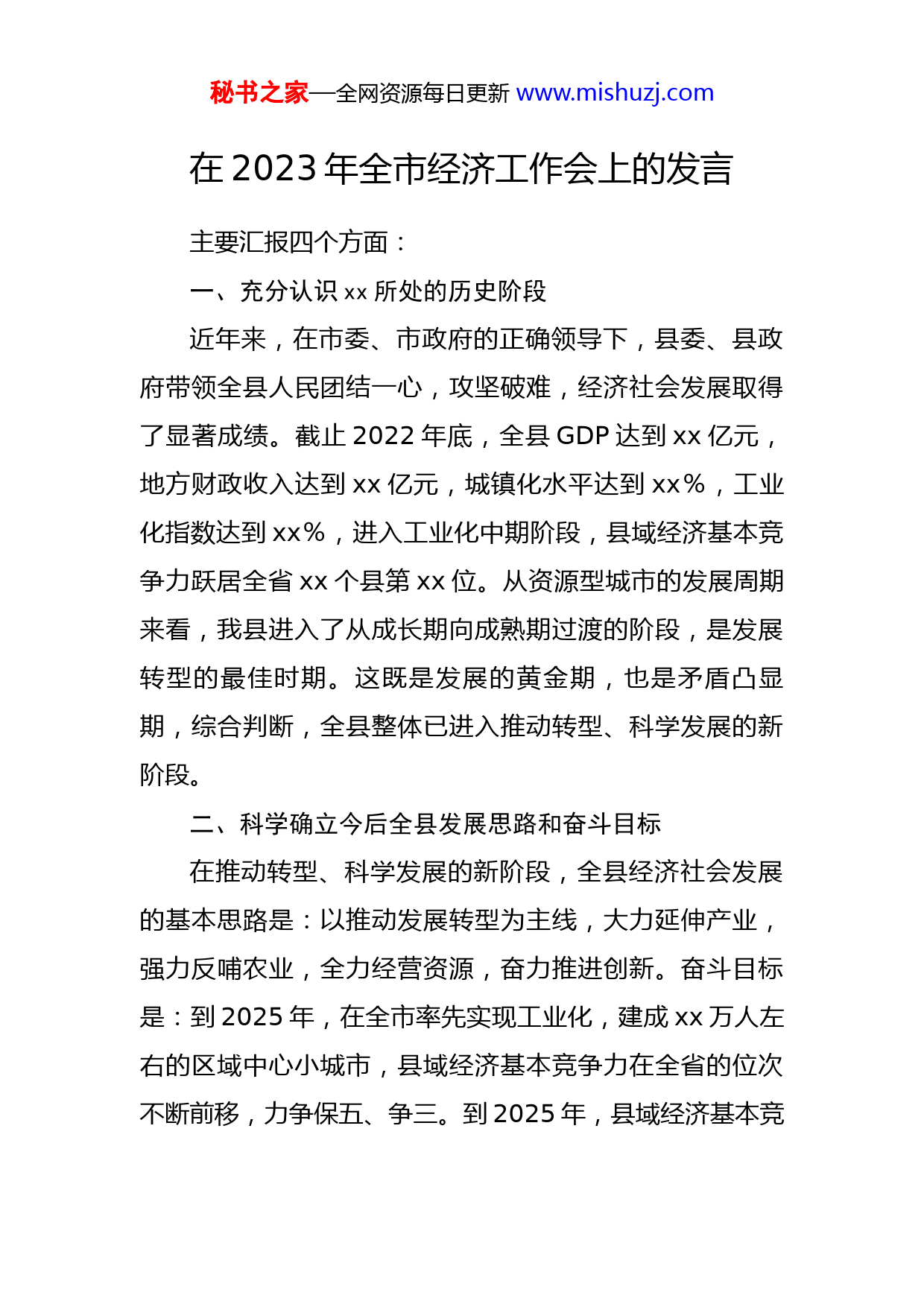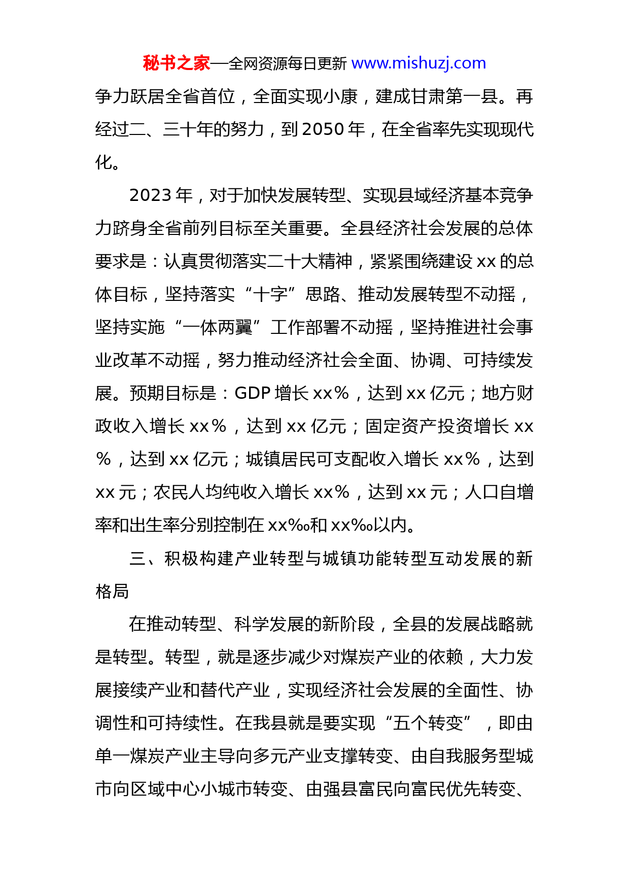 秘书之家—全网资源每日更新www.mishuzj.com在2023年全市经济工作会上的发言主要汇报四个方面:一、充分认识xx所处的历史阶段近年来,在市委、市政府的正确领导下,县委、县政府带领全县人民团结一心,攻坚破难,经济社会发展取得了显著成绩。截止2022年底,全县GDP达到xx亿元,地方财政收入达到xx亿元,城镇化水平达到xx%,工业化指数达到xx%,进入工业化中期阶段,县域经济基本竞争力跃居全省xx个县第xx位。从资源型城市的发展周期来看,我县进入了从成长期向成熟期过渡的阶段,是发展转型的最佳时期。这既是发展的黄金期,也是矛盾凸显期,综合判断,全县整体已进入推动转型、科学发展的新阶段。二、科学确立今后全县发展思路和奋斗目标在推动转型、科学发展的新阶段,全县经济社会发展的基本思路是:以推动发展转型为主线,大力延伸产业,强力反哺农业,全力经营资源,奋力推进创新。奋斗目标是:到2025年,在全市率先实现工业化,建成xx万人左右的区域中心小城市,县域经济基本竞争力在全省的位次不断前移,力争保五、争三。到2025年,县域经济基本竞秘书之家—全网资源每日更新www.mishuzj.com争力跃居全省首位,全面实现小康,建成甘肃第一县。再经过二、三十年的努力,到2050年,在全省率先实现现代化。2023年,对于加快发展转型、实现县域经济基本竞争力跻身全省前列目标至关重要。全县经济社会发展的总体要求是:认真贯彻落实二十大精神,紧紧围绕建设xx的总体目标,坚持落实“十字”思路、推动发展转型不动摇,坚持实施“一体两翼”工作部署不动摇,坚持推进社会事业改革不动摇,努力推动经济社会全面、协调、可持续发展。预期目标是:GDP增长xx%,达到xx亿元;地方财政收入增长xx%,达到xx亿元;固定资产投资增长xx%,达到xx亿元;城镇居民可支配收入增长xx%,达到xx元;农民人均纯收入增长xx%,达到xx元;人口自增率和出生率分别控制在xx‰和xx‰以内。三、积极构建产业转型与城镇功能转型互动发展的新格局在推动转型、科学发展的新阶段,全县的发展战略就是转型。转型,就是逐步减少对煤炭产业的依赖,大力发展接续产业和替代产业,实现经济社会发展的全面性、协调性和可持续性。在我县就是要实现“五个转变”,即由单一煤炭产业主导向多元产业支撑转变、由自我服务型城市向区域中心小城市转变、由强县富民向富民优先转变、秘书之家—全网资源每日更新www.mishuzj.com由注重提高物质生活水平向注重满足人的多方需求转变、由行政推动为主向市场引导为主转变。重点是产业转型和城镇功能转型,产业转型是核心,城镇功能转型是前提。2023年,我们将大力调整产业结构,转变增长方式,努力实现产业转型与城镇功能转型互动发展。突出抓好六项重点工作:一是深度开发煤电化运产业。加快乡镇煤矿改扩建和新法采煤技改步伐,支持冶金企业提质扩容,促进陶瓷、电瓷等传统产业升级换代,确保全县限额以上工业增加值增长xx%,达到xx亿元。不断完善城乡交通运输网络,力争把xx建成全省最大的、西北重要的和全国有影响的绿色能源工业基地。二是切实加快新农村建设步伐。积极改善农村生产生活条件,实施治河增地、整村推进等项目,抓好西水东调入户工程,全面实现自来水化目标。积极推广农业实用技术,抓好药材、草畜、核桃、劳务等农村支柱产业开发,因地制宜发展蔬菜、蚕豆、洋芋等特色产业,加快建设龙头企业。三是努力提升城市承载服务功能。扎实开展城市管理年活动,抓好大树进城、鲜花进城、彩灯进城、文化进城、引水入城“五进城”工程,进一步提高城市品位;大力经营城市,盘活国有资产,多方筹集建设资金,集中抓好重点小城镇开发,力争城镇化率提高xx个百分点,达到xx%。四是大力发展现代服务业。加快旅游产业开发,提升旅游业发展水平。不秘书之家—全网资源每日更新www.mishuzj.com断提升商贸、餐饮等传统服务业水平,鼓励发展信息、金融、保险、房地产、物业管理等现代服务业;招商建设星级宾馆、汽车配件市场等项目,推动房地产、交通运输等行业发展,力争第三产业增长xx%。五是扎实推进招商引资工作。坚定不移地实施“一体两翼”工作部署,加强驻外招商机构力量,广泛与大财团、大企业和科研院所开展经济技术协作与交流,吸引国内外知名企业落户,确保招商引资总额达到xx亿元。深入开展乡村评部门、客商评政府、群众评领导“三评”活动,以民营经济当年税收超收部分的xx%建立发展基金,组建中小企业信用担保中心,为民营经济发展创造良好环境。引导民营资本向基础设施、社会事业和特色产业渗透,扶持发展一批加工型、科技型的民营企业,努力提高全县经济发展的市场化水平,确保民营经济总量年增长xx%。六是加快和谐xx建设步伐。加快文化事业单位的改革改制步伐,全力推进文化产业的市场化。着力解决群众最关心、最直接、最现实的利益问题,加快中小学改厕和校舍排危建设,试行城乡医疗救助制度,建设覆盖城乡居民的基本卫生保健制度。全面推行城乡低保,加强社会救助,不断扩大城镇职工失业、医疗、工伤和生育保险覆盖面,促进城镇零就业家庭人员就业。加强社会治安综合治理,深入开展“平安xx”建设,加大安全生产监管力度,全力维护社会稳定。秘书之家—全网资源每日更新www.mishuzj.com四、大胆创建推