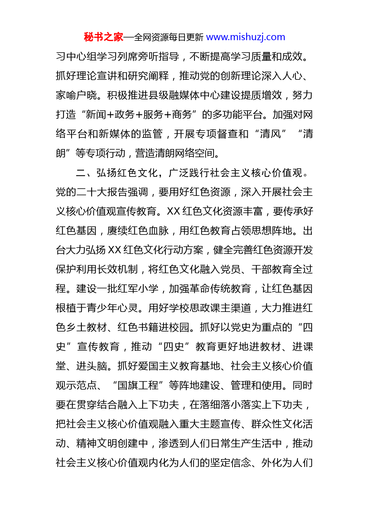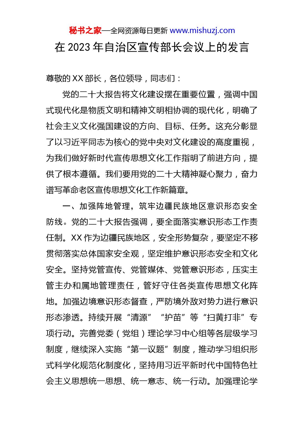 秘书之家—全网资源每日更新www.mishuzj.com在2023年自治区宣传部长会议上的发言尊敬的XX部长,各位领导,同志们:党的二十大报告将文化建设摆在重要位置,强调中国式现代化是物质文明和精神文明相协调的现代化,明确了社会主义文化强国建设的方向、目标、任务。这充分彰显了以习近平同志为核心的党中央对文化建设的高度重视,为我们做好新时代宣传思想文化工作指明了前进方向,提供了根本遵循。我们要用党的二十大精神凝心聚力,奋力谱写革命老区宣传思想文化工作新篇章。一、加强阵地管理,筑牢边疆民族地区意识形态安全防线。党的二十大报告强调,要全面落实意识形态工作责任制。XX作为边疆民族地区,安全形势复杂,要坚定不移贯彻落实总体国家安全观,坚定维护意识形态安全和文化安全。坚持党管宣传、党管媒体、党管意识形态,压实主管主办和属地管理责任,管好守住各类宣传思想文化阵地。加强边境意识形态督查,严防境外敌对势力进行意识形态渗透。持续开展“清源”“护苗”等“扫黄打非”专项行动。完善党委(党组)理论学习中心组等各层级学习制度,继续深入实施“第一议题”制度,推动学习组织形式科学化规范化制度化,坚持用习近平新时代中国特色社会主义思想统一思想、统一意志、统一行动。加强理论学秘书之家—全网资源每日更新www.mishuzj.com习中心组学习列席旁听指导,不断提高学习质量和成效。抓好理论宣讲和研究阐释,推动党的创新理论深入人心、家喻户晓。积极推进县级融媒体中心建设提质增效,努力打造“新闻+政务+服务+商务”的多功能平台。加强对网络平台和新媒体的监管,开展专项督查和“清风”“清朗”等专项行动,营造清朗网络空间。二、弘扬红色文化,广泛践行社会主义核心价值观。党的二十大报告强调,要用好红色资源,深入开展社会主义核心价值观宣传教育。XX红色文化资源丰富,要传承好红色基因,赓续红色血脉,用红色教育占领思想阵地。出台大力弘扬XX红色文化行动方案,健全完善红色资源开发保护利用长效机制,将红色文化融入党员、干部教育全过程。建设一批红军小学,加强革命传统教育,让红色基因根植于青少年心灵。用好学校思政课主渠道,大力推进红色乡土教材、红色书籍进校园。抓好以党史为重点的“四史”宣传教育,推动“四史”教育更好地进教材、进课堂、进头脑。抓好爱国主义教育基地、社会主义核心价值观示范点、“国旗工程”等阵地建设、管理和使用。同时要在贯穿结合融入上下功夫,在落细落小落实上下功夫,把社会主义核心价值观融入重大主题宣传、群众性文化活动、精神文明创建中,渗透到人们日常生产生活中,推动社会主义核心价值观内化为人们的坚定信念、外化为人们秘书之家—全网资源每日更新www.mishuzj.com的自觉行动。三、推进文明创建,努力提高全社会文明程度。党的二十大报告强调,要实施公民道德建设工程。精神文明建设涉及面广,内容丰富。我们要以加强文明城市创建为龙头,对标对表落实测评考核指标体系,推动党的二十大各项部署要求落实到经济建设、政治建设、文化建设、社会建设、生态文明建设之中,促进全社会文明程度不断提高。大力推进文明村镇建设,建立健全考评标准,持续开展移风易俗工作,打造一批乡风文明示范村;以“系统抓、抓系统”的方法推进文明单位创建;整合妇联、团委、教育等部门力量,推进文明家庭、文明校园创建。深化拓展新时代文明实践中心(所、站)建设,探索志愿服务数字化建设,建设“文明耀边关”“文明右江红”新时代文明实践长廊。加强选树先进典型,持续开展乡风文明“红旗乡镇”“红旗村”评比。深入开展“最美农民”以及身边好人、星级文明户等评选表彰活动,传播社会正能量。四、立足民族特色,繁荣发展文化事业和文化产业。党的二十大报告强调,要健全现代公共文化服务体系,创新实施文化惠民工程。XX少数民族文化多姿多彩,我们要贯彻好以人民为中心的发展思想,不断提升人民群众文化生活品质。加强文化队伍建设,健全文艺人才培养、选拔秘书之家—全网资源每日更新www.mishuzj.com和使用机制,建立XX市乡土文艺人才库,用好用活基层文艺人才。抓好重大文艺作品创作,推进《文秀姐姐》动漫电影摄制工作和舞台艺术山歌剧《热血右江魂》、舞台艺术情景剧《右江潮》的创作排演。组织开展XX女子作家群作品研讨会,努力打造“XX女子作家群”特色品牌。大力推动乡村文化振兴,推进基本公共服务标准化均等化建设,优化城乡文化资源配置。创新农家书屋管理使用,以XX市图书馆数字图书期刊为资源开通云阅读,建设“数字农家书屋”。推进市级文化传媒基地建设,推动XX市民族艺术剧院、XX市群艺馆等场馆后续建设。加快推进文化和旅游深度融合,大力推动非物质文化遗产展演展示进景点景区。加强民族传统手工艺保护传承,推动民族文化特色创意产品开发,鼓励支持富有XX风情的系列文创产品、民族手工艺品生产,促进文旅产业提质增效。五、发挥区位优势,讲好XX故事。党的二十大报告强调,要讲好中国故事、传播好中国声音,展现可信、可爱、可敬的中国形象。XX与越南接壤,有口岸交流宣介优势,要深化靖西、那坡等市县“边境之窗”建设,及时更新、丰富宣传内容。充分运用各种外