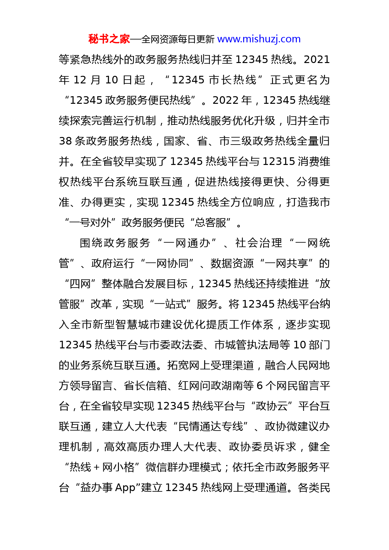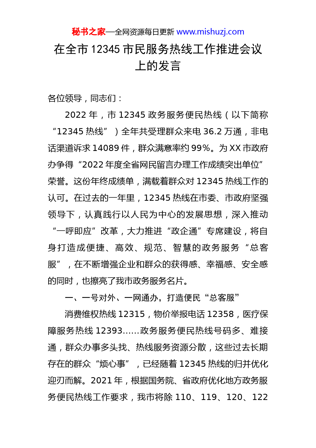 秘书之家—全网资源每日更新www.mishuzj.com在全市12345市民服务热线工作推进会议上的发言各位领导,同志们:2022年,市12345政务服务便民热线(以下简称“12345热线”)全年共受理群众来电36.2万通,非电话渠道诉求14089件,群众满意率约99%。为XX市政府办争得“2022年度全省网民留言办理工作成绩突出单位”荣誉。这份年终成绩单,满载着群众对12345热线工作的认可。在过去的一年里,12345热线在市委、市政府坚强领导下,认真践行以人民为中心的发展思想,深入推动“一呼即应”改革,大力推进“政企通”专席建设,将自身打造成便捷、高效、规范、智慧的政务服务“总客服”,在不断增强企业和群众的获得感、幸福感、安全感的同时,也擦亮了我市政务服务名片。一、一号对外、一网通办,打造便民“总客服”消费维权热线12315,物价举报电话12358,医疗保障服务热线12393……政务服务便民热线号码多、难接通,群众办事多头找、热线服务资源分散,这些过去长期存在的群众“烦心事”,已经随着12345热线的归并优化迎刃而解。2021年,根据国务院、省政府优化地方政务服务便民热线工作要求,我市将除110、119、120、122秘书之家—全网资源每日更新www.mishuzj.com等紧急热线外的政务服务热线归并至12345热线。2021年12月10日起,“12345市长热线”正式更名为“12345政务服务便民热线”。2022年,12345热线继续探索完善运行机制,推动热线服务优化升级,归并全市38条政务服务热线,国家、省、市三级政务热线全量归并。在全省较早实现了12345热线平台与12315消费维权热线平台系统互联互通,促进热线接得更快、分得更准、办得更实,实现12345热线全方位响应,打造我市“一号对外”政务服务便民“总客服”。围绕政务服务“一网通办”、社会治理“一网统管”、政府运行“一网协同”、数据资源“一网共享”的“四网”整体融合发展目标,12345热线还持续推进“放管服”改革,实现“一站式”服务。将12345热线平台纳入全市新型智慧城市建设优化提质工作体系,逐步实现12345热线平台与市委政法委、市城管执法局等10部门的业务系统互联互通。拓宽网上受理渠道,融合人民网地方领导留言、省长信箱、红网问政湖南等6个网民留言平台,在全省较早实现12345热线平台与“政协云”平台互联互通,建立人大代表“民情通达专线”、政协微建议办理机制,高效高质办理人大代表、政协委员诉求,健全“热线+网小格”微信群办理模式;依托全市政务服务平台“益办事App”建立12345热线网上受理通道。各类民秘书之家—全网资源每日更新www.mishuzj.com生诉求汇总到12345热线,统一受理入口、标准和服务流程,12345热线诉求受理办理“总客服”作用不断凸显。二、一键直达、专责接听,架通政企“连心桥”在12345热线的帮助下,妥善解决XXXX建筑工业有限责任公司因门口道路改造引发通行困难的问题,成功化解XX县XX高速项目部因村民钓鱼影响水上施工的问题,及时开通XX县XX路乐家大药房医保刷卡业务……还为多家企业解决了惠企政策、企业贷款、办证登记、保险缴纳等各方面的诉求和难题。2022年8月1日,12345热线“政企通”专席正式开通,到年末,成功受理企业诉求620件并予积极有效处理,在企业群体中引发强烈反响。为延伸受理涉营商环境类投诉举报覆盖面,提升政府接访应诉质效,12345热线与市优化营商环境办公室、市工业和信息化局等涉企相关部门建立“政企通”专席工作协调联动处置机制,专责接听,集中处办企业群体诉求,实现企业“一对一”在线服务,政策信息精准推送、快速直达。专席依托强大的政策知识、专家库和举报受理平台,将企业和市民的诉求分置处理,进一步减少调度、转派等中间环节的时间,让“政企通”专席成为服务企业的直通车。同步建立完善营商环境投诉举报台账制、交办制、销号制,“7×24小时”全天候受理企业关于营商环境方面的秘书之家—全网资源每日更新www.mishuzj.com诉求。求助人拨通12345热线后,按2就可以进入“政企通”专线。一般性咨询问题,按政策知识库或与政策专员建立三方通话即刻完成解答,较为复杂的问题及须由部门处置跟踪的事项,通过派单同步转至对口部门办理。一般性问题要求1个工作日内签收并办结,疑难问题7个工作日内销号,最大限度压缩营商环境投诉举报办理期限。同时,制定《12345热线“政企通”专席管理办法》,进一步完善企业诉求受理、交办、反馈、审核、回访、办结等流程,建立健全督查督办、考核问责等工作机制,100%受理、100%人工回访、市优化办100%跟踪审核,实现企业诉求快转、快办、跟踪、督办“一条龙”服务。三、一呼即应、高位推进,做好民生“助推器”XX高新区XXX路有人焚烧垃圾,XX高新区管委会执法队员接诉即办处置到位;XX区XX路与XX路红绿灯故障,市公安局交警支队接诉即办维护更换;XX区XXX附近一处水管爆裂,XX市自来水有限公司接诉即办即时修复……高质量接诉即办的背后,是12345热线民有所呼、我有所应的生动实践。12345热线健全“一呼即应”制度机制,进一步完善“接诉即办”分类分级响应机制,设置1、3个工作日两档处置时限,做到即时响应、快速办结。建立工单直派乡镇的“快速交办”制度,精简转办层级,对群众反映权限明秘书之家—全网资源每日更新www.mishuzj.com晰的事项,工单流转从之前的市、县、乡三级层
