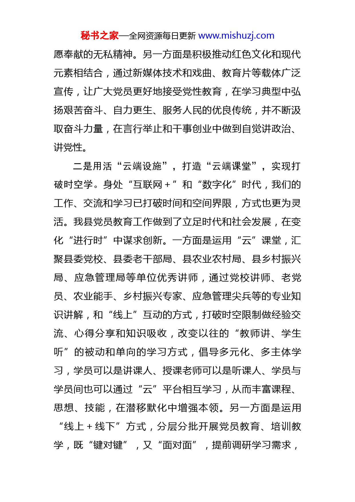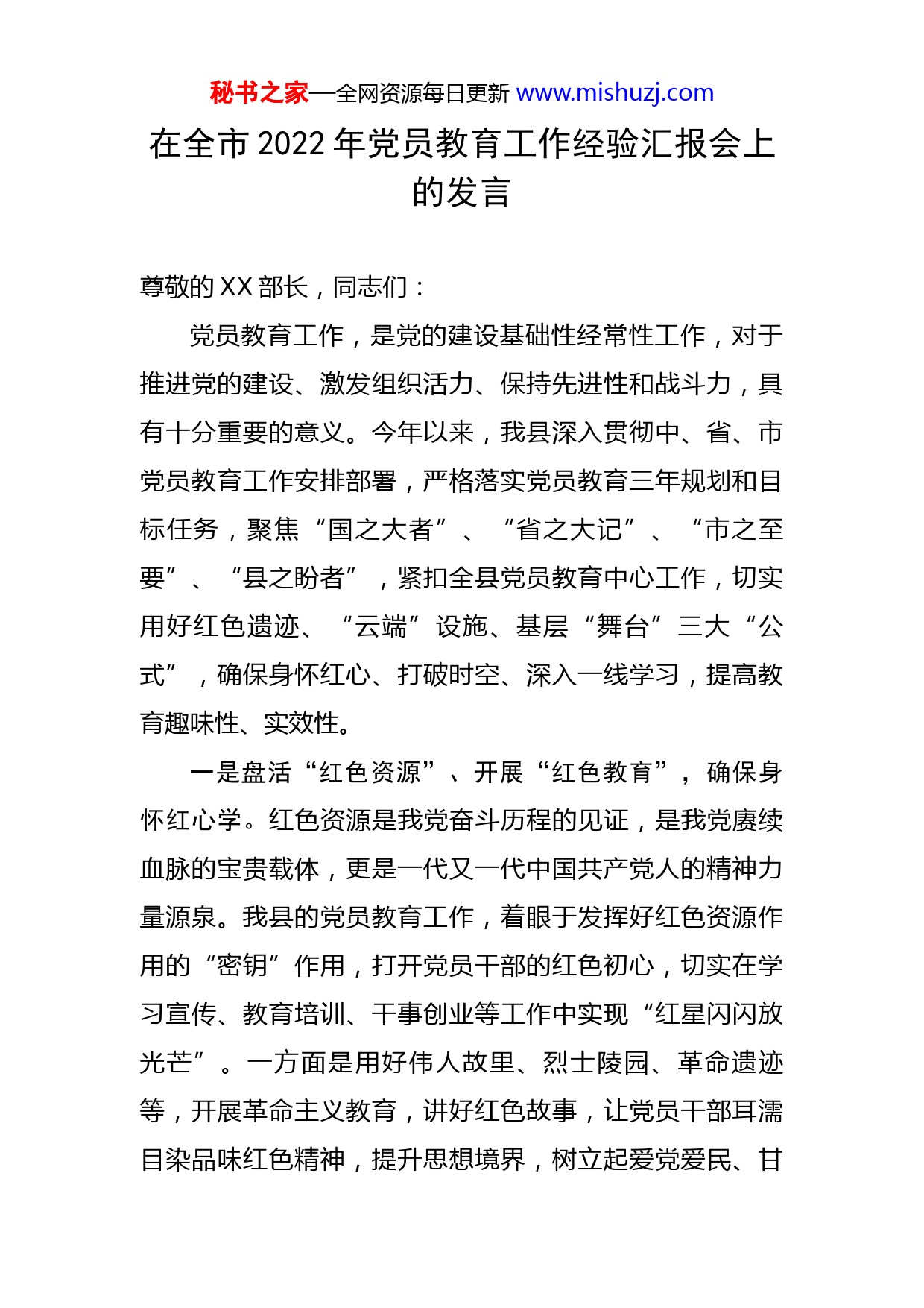 秘书之家—全网资源每日更新www.mishuzj.com在全市2022年党员教育工作经验汇报会上的发言尊敬的XX部长,同志们:党员教育工作,是党的建设基础性经常性工作,对于推进党的建设、激发组织活力、保持先进性和战斗力,具有十分重要的意义。今年以来,我县深入贯彻中、省、市党员教育工作安排部署,严格落实党员教育三年规划和目标任务,聚焦“国之大者”、“省之大记”、“市之至要”、“县之盼者”,紧扣全县党员教育中心工作,切实用好红色遗迹、“云端”设施、基层“舞台”三大“公式”,确保身怀红心、打破时空、深入一线学习,提高教育趣味性、实效性。一是盘活“红色资源”、开展“红色教育”,确保身怀红心学。红色资源是我党奋斗历程的见证,是我党赓续血脉的宝贵载体,更是一代又一代中国共产党人的精神力量源泉。我县的党员教育工作,着眼于发挥好红色资源作用的“密钥”作用,打开党员干部的红色初心,切实在学习宣传、教育培训、干事创业等工作中实现“红星闪闪放光芒”。一方面是用好伟人故里、烈士陵园、革命遗迹等,开展革命主义教育,讲好红色故事,让党员干部耳濡目染品味红色精神,提升思想境界,树立起爱党爱民、甘秘书之家—全网资源每日更新www.mishuzj.com愿奉献的无私精神。另一方面是积极推动红色文化和现代元素相结合,通过新媒体技术和戏曲、教育片等载体广泛宣传,让广大党员更好地接受党性教育,在学习典型中弘扬艰苦奋斗、自力更生、服务人民的优良传统,并不断汲取奋斗力量,在言行举止和干事创业中做到自觉讲政治、讲党性。二是用活“云端设施”,打造“云端课堂”,实现打破时空学。身处“互联网+”和“数字化”时代,我们的工作、交流和学习已打破时间和空间界限,方式也更为灵活。我县党员教育工作做到了立足时代和社会发展,在变化“进行时”中谋求创新。一方面是运用“云”课堂,汇聚县委党校、县委老干部局、县农业农村局、县乡村振兴局、应急管理局等单位优秀讲师,通过党校讲师、老党员、农业能手、乡村振兴专家、应急管理尖兵等的专业知识讲解,和“线上”互动的方式,打破时空限制做经验交流、心得分享和知识吸收,改变以往的“教师讲、学生听”的被动和单向的学习方式,倡导多元化、多主体学习,学员可以是讲课人、授课老师可以是听课人、学员与学员间也可以通过“云”平台相互学习,从而丰富课程、思想、技能,在潜移默化中增强本领。另一方面是运用“线上+线下”方式,分层分批开展党员教育、培训教学,既“键对键”,又“面对面”,提前调研学习需求,秘书之家—全网资源每日更新www.mishuzj.com有针对性提供更富趣味、更加精准的内容,实现从“讲什么就学什么”到“需要什么就教什么”的转变,做到“党员点单、教师配单”,实现了党员教育的精准施策和靶向发力,提高了针对性、实效性。三是激活“实战资源”,躬身“基层实践”,做到深入一线学。“纸上得来终觉浅,绝知此事要躬行”。开展培训、教育的目的,是为了提高党员干部理论素养和干事创业水平,更好地为人民服务。因此,我先在开展党员教育工作时,将视野放到基层、投向群众呢。一方面是面向群众,在解决“急难愁盼”问题中抓好党员教育,确保为民办实事和党员教育共同发力。通过走村入户收集群众需求并及时解决,提高群众的满意度、认可度,进一步密切干群关系,从而体现教育的民生意义和服务意义。另一方面是下沉一线,观摩并参与应急演练、应急救护、作物种植等“课程”,让党员干部体会到基层工作、农村工作的不易,从而更加坚定扎根基层、磨炼意志的信念。同时,通过一系列“实战”活动,锻炼广大党员实践能力和处理突发事件的能力,进一步提高了为群众服务的水平,最终培养出一批批甘于扎根奉献的“孺子牛”。在市委组织部的悉心指导下、县委的坚强领导下,我县的党员教育中心工作取得了一定成效。下一步,我县将进一步发掘资源、创新方式,为全县人民培养出更多的秘书之家—全网资源每日更新www.mishuzj.com“服务者”、“实干者”。永葆、责任感使命感,使党员教育工作更有力量,党员干部更有作为。汇报完毕,谢谢大家!