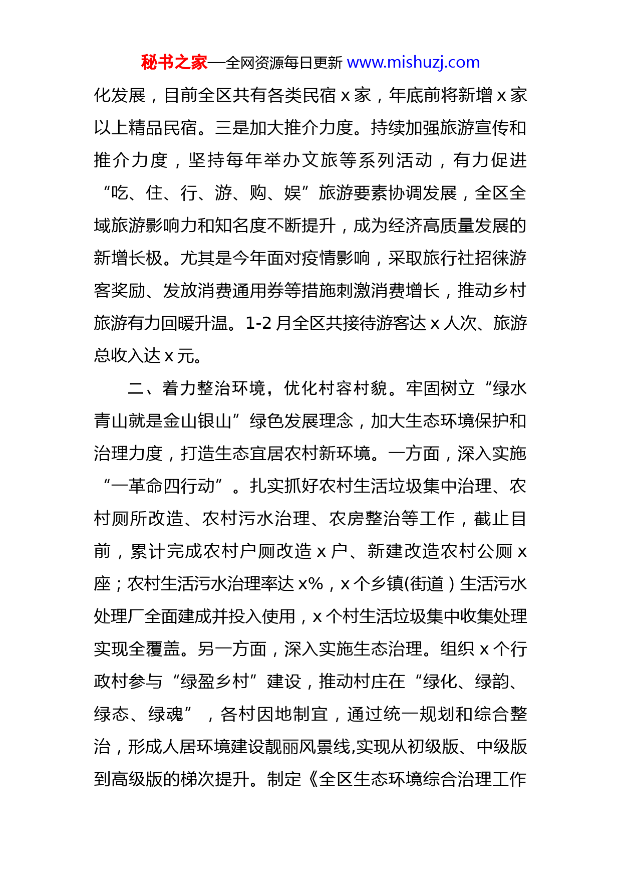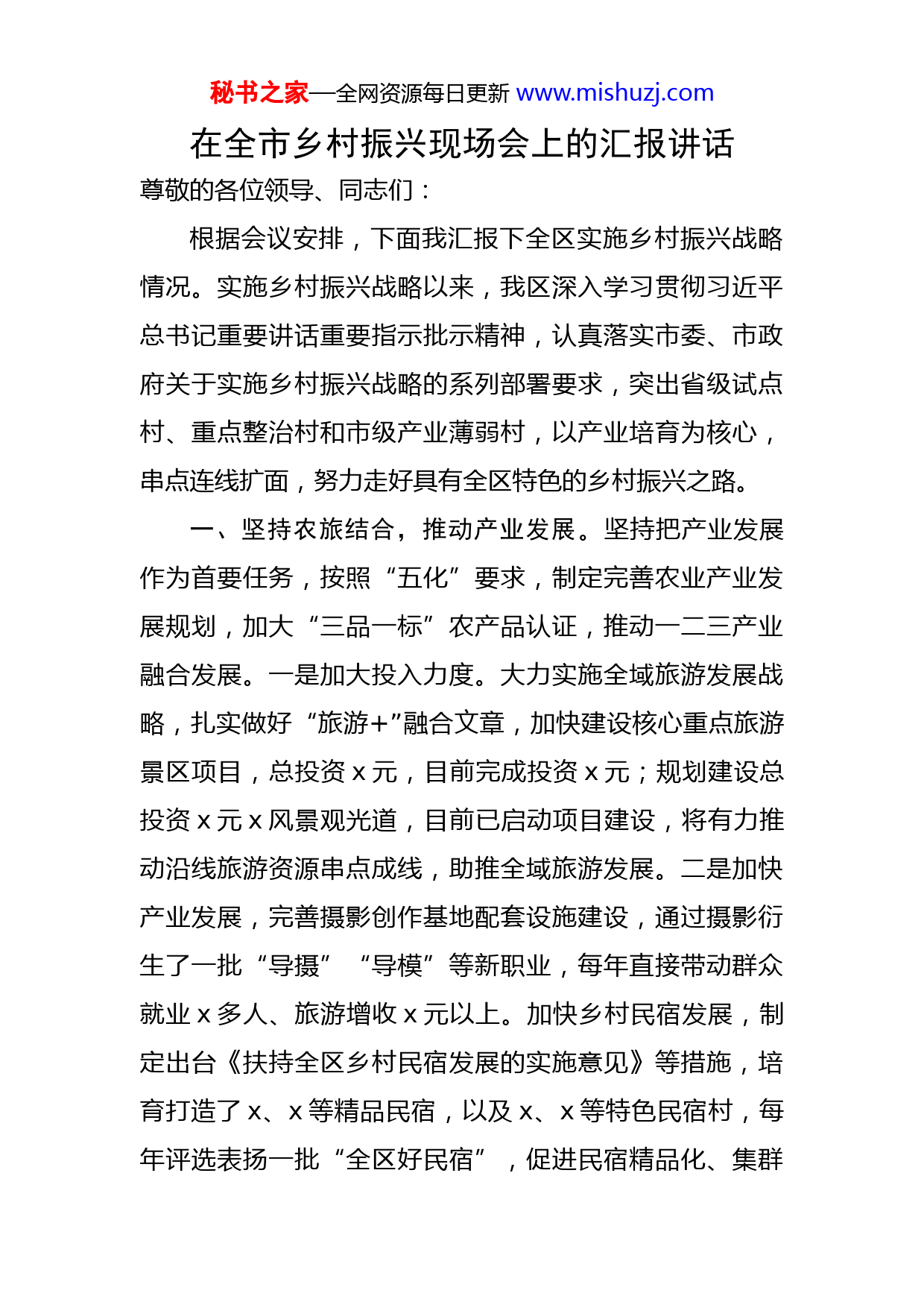 秘书之家—全网资源每日更新www.mishuzj.com在全市乡村振兴现场会上的汇报讲话尊敬的各位领导、同志们:根据会议安排,下面我汇报下全区实施乡村振兴战略情况。实施乡村振兴战略以来,我区深入学习贯彻习近平总书记重要讲话重要指示批示精神,认真落实市委、市政府关于实施乡村振兴战略的系列部署要求,突出省级试点村、重点整治村和市级产业薄弱村,以产业培育为核心,串点连线扩面,努力走好具有全区特色的乡村振兴之路。一、坚持农旅结合,推动产业发展。坚持把产业发展作为首要任务,按照“五化”要求,制定完善农业产业发展规划,加大“三品一标”农产品认证,推动一二三产业融合发展。一是加大投入力度。大力实施全域旅游发展战略,扎实做好“旅游+”融合文章,加快建设核心重点旅游景区项目,总投资x元,目前完成投资x元;规划建设总投资x元x风景观光道,目前已启动项目建设,将有力推动沿线旅游资源串点成线,助推全域旅游发展。二是加快产业发展,完善摄影创作基地配套设施建设,通过摄影衍生了一批“导摄”“导模”等新职业,每年直接带动群众就业x多人、旅游增收x元以上。加快乡村民宿发展,制定出台《扶持全区乡村民宿发展的实施意见》等措施,培育打造了x、x等精品民宿,以及x、x等特色民宿村,每年评选表扬一批“全区好民宿”,促进民宿精品化、集群秘书之家—全网资源每日更新www.mishuzj.com化发展,目前全区共有各类民宿x家,年底前将新增x家以上精品民宿。三是加大推介力度。持续加强旅游宣传和推介力度,坚持每年举办文旅等系列活动,有力促进“吃、住、行、游、购、娱”旅游要素协调发展,全区全域旅游影响力和知名度不断提升,成为经济高质量发展的新增长极。尤其是今年面对疫情影响,采取旅行社招徕游客奖励、发放消费通用券等措施刺激消费增长,推动乡村旅游有力回暖升温。1-2月全区共接待游客达x人次、旅游总收入达x元。二、着力整治环境,优化村容村貌。牢固树立“绿水青山就是金山银山”绿色发展理念,加大生态环境保护和治理力度,打造生态宜居农村新环境。一方面,深入实施“一革命四行动”。扎实抓好农村生活垃圾集中治理、农村厕所改造、农村污水治理、农房整治等工作,截止目前,累计完成农村户厕改造x户、新建改造农村公厕x座;农村生活污水治理率达x%,x个乡镇(街道)生活污水处理厂全面建成并投入使用,x个村生活垃圾集中收集处理实现全覆盖。另一方面,深入实施生态治理。组织x个行政村参与“绿盈乡村”建设,推动村庄在“绿化、绿韵、绿态、绿魂”,各村因地制宜,通过统一规划和综合整治,形成人居环境建设靓丽风景线,实现从初级版、中级版到高级版的梯次提升。制定《全区生态环境综合治理工作秘书之家—全网资源每日更新www.mishuzj.com实施方案》,建立集生态环境综合治理巡查、执法、监管三支队伍为一体,统筹巡查、执法、监管三方联动,打造一个平台统一指挥的工作机制,强化部门常态化联动协作,集中力量开展生态综合治理,统筹抓好道路、河道、人居环境等,全力守护好全区绿水青山。三、坚持党建引领,筑牢战斗堡垒。坚持基层党建工作融入中心、服务大局,推进党建引领乡村振兴、基层治理、服务群众。一是强化基础保障。创新推行“三级书记”领办基层党建重点项目制度,区、乡、村三级书记领办x个重点任务,目前x个区级领办项目均已完成阶段性任务。推进“两新”组织培育提升,通过“月报季评年比”的方式,完成全区各行业、各领域x个基层党建示范点和x条党建示范带的创建提升。开展村级党建项目擂台PK赛,采用以奖代补的方式按评比等次给予村集体资金补助,推动基层党建项目化、示范化。二是加强队伍建设。制定《村级班子及村主干积分制考评办法》,推行“基本报酬+绩效补贴+奖励”的结构补贴方式,有效完善村干部工作实绩评价体系。出台培养计划,形成选拔、培养、储备、使用四位一体的培育体系,全区共培养储备致富能人x名、后备干部x名。着眼村级换届后村干部能力培养,先后举办x期村书记(主任)培训班,着力提高履职能力。三是壮大村级集体经济。突出党建引领功能,深入开展消秘书之家—全网资源每日更新www.mishuzj.com除集体经济经营性年收入x元以下“相对薄弱村”行动,筹集x元为2022年村级集体经济收入不足x元的x个村入x乡村振兴基金项目,预计每个村每年可增收x元。同时,落实乡、村两级村财项目x多个,村党组织领办、创办专业合作社x家,自身“造血”有效增强。四、紧抓队伍建设,汇聚人才力量。突出人才振兴支撑作用,着力打造一支高素质专业化队伍,全面服务乡村振兴。一是深化人才发展机制改革。健全完善“人才计划”政策体系,从引、育、用、留等方面明确人才队伍建设方向和制度保障。探索建立城乡人才合作交流激励机制,制定科技特派员助推乡村振兴、支持教育卫生等基础人才向一线流动,建立高层次人才专项编制池、优秀乡土人才评选等政策,鼓励各方面人才投身乡村振兴战略。二是拓宽渠道引育人才。深入实施人才回归工程,探索建立在外大学生引才队伍,强化本土人才培育,发掘培养“土专家”“田秀才”助力乡村振兴。开展乡村人才振兴“十百千万”专家服务基层活动,建立服务专家库,创办乡村振兴讲堂x期,开展
