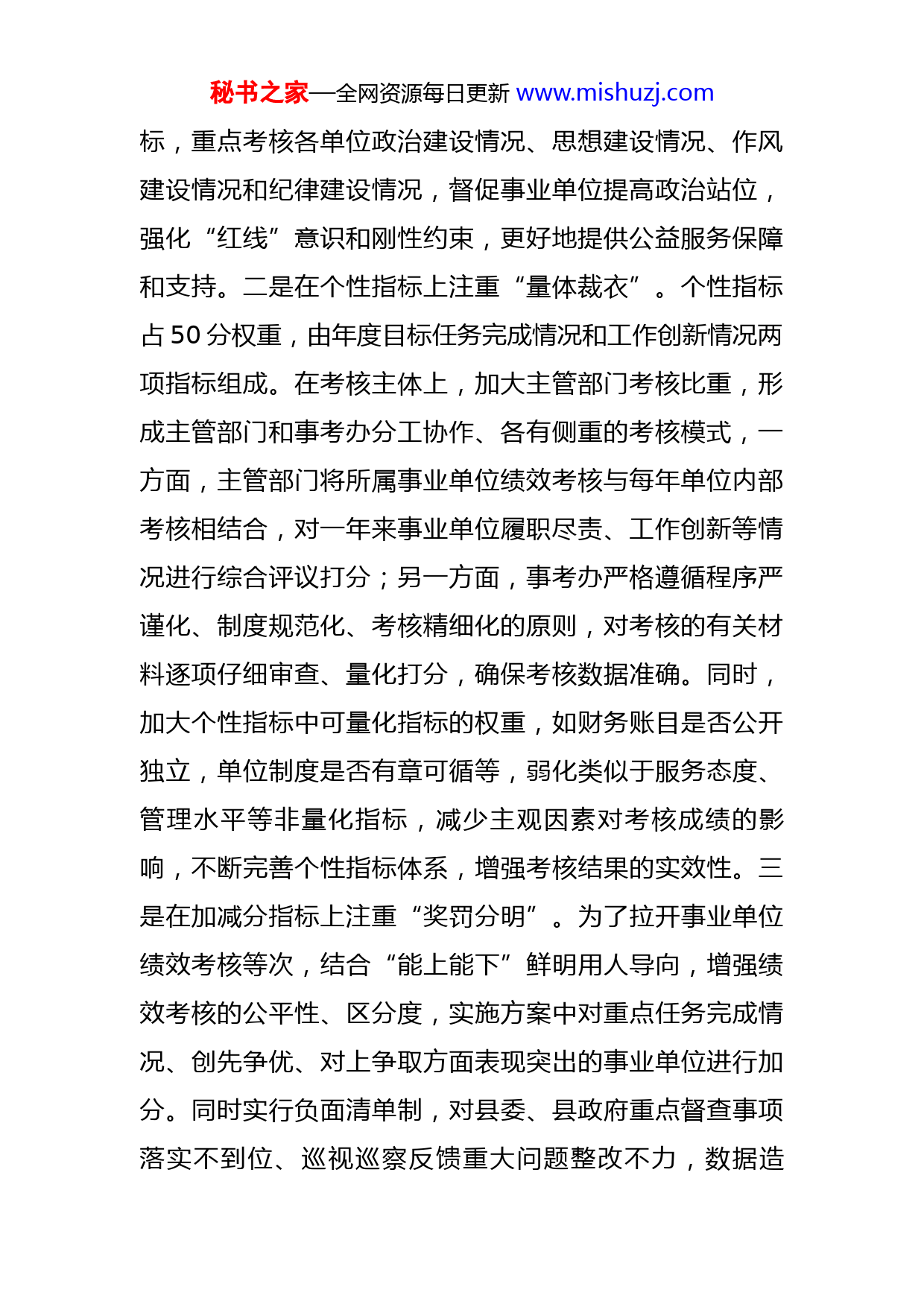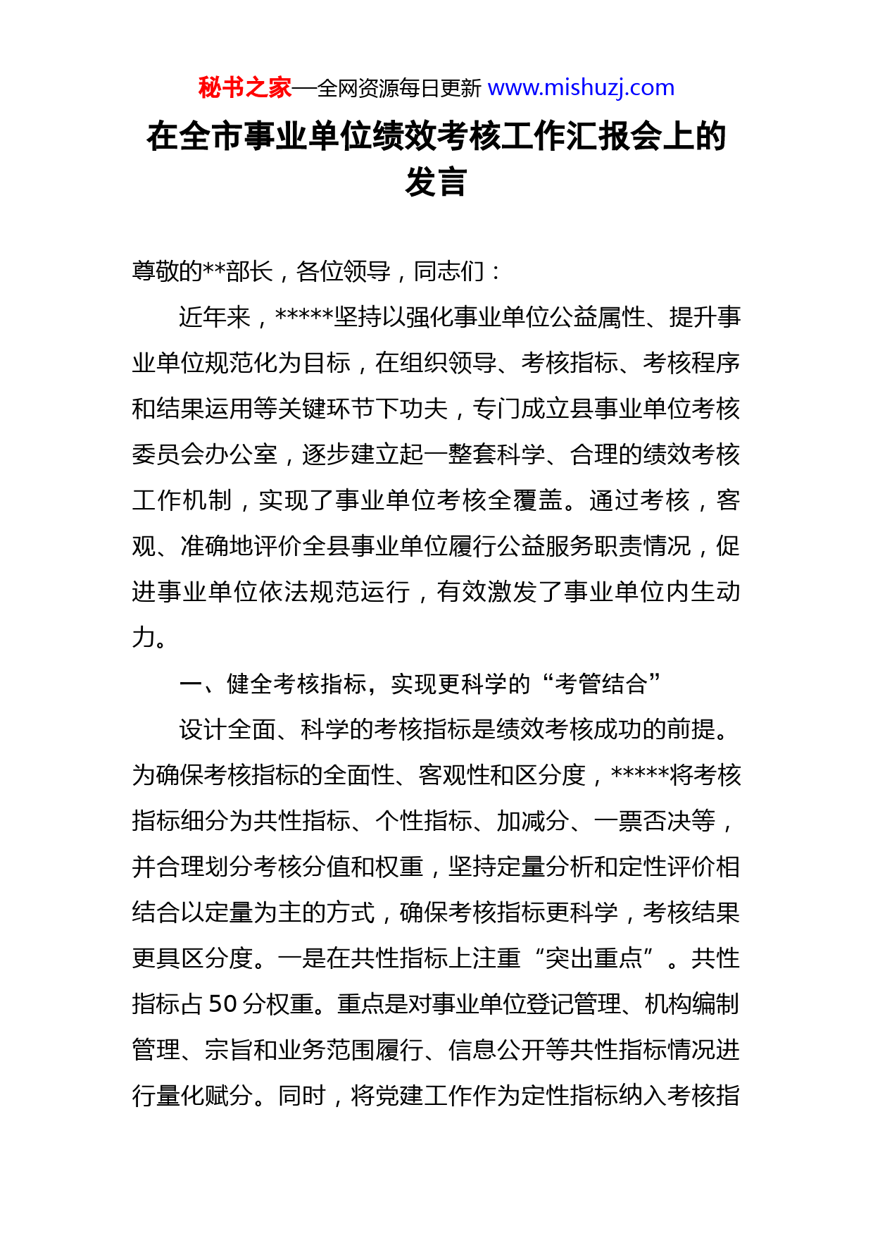 秘书之家—全网资源每日更新www.mishuzj.com在全市事业单位绩效考核工作汇报会上的发言尊敬的部长,各位领导,同志们:近年来,坚持以强化事业单位公益属性、提升事业单位规范化为目标,在组织领导、考核指标、考核程序和结果运用等关键环节下功夫,专门成立县事业单位考核委员会办公室,逐步建立起一整套科学、合理的绩效考核工作机制,实现了事业单位考核全覆盖。通过考核,客观、准确地评价全县事业单位履行公益服务职责情况,促进事业单位依法规范运行,有效激发了事业单位内生动力。一、健全考核指标,实现更科学的“考管结合”设计全面、科学的考核指标是绩效考核成功的前提。为确保考核指标的全面性、客观性和区分度,将考核指标细分为共性指标、个性指标、加减分、一票否决等,并合理划分考核分值和权重,坚持定量分析和定性评价相结合以定量为主的方式,确保考核指标更科学,考核结果更具区分度。一是在共性指标上注重“突出重点”。共性指标占50分权重。重点是对事业单位登记管理、机构编制管理、宗旨和业务范围履行、信息公开等共性指标情况进行量化赋分。同时,将党建工作作为定性指标纳入考核指秘书之家—全网资源每日更新www.mishuzj.com标,重点考核各单位政治建设情况、思想建设情况、作风建设情况和纪律建设情况,督促事业单位提高政治站位,强化“红线”意识和刚性约束,更好地提供公益服务保障和支持。二是在个性指标上注重“量体裁衣”。个性指标占50分权重,由年度目标任务完成情况和工作创新情况两项指标组成。在考核主体上,加大主管部门考核比重,形成主管部门和事考办分工协作、各有侧重的考核模式,一方面,主管部门将所属事业单位绩效考核与每年单位内部考核相结合,对一年来事业单位履职尽责、工作创新等情况进行综合评议打分;另一方面,事考办严格遵循程序严谨化、制度规范化、考核精细化的原则,对考核的有关材料逐项仔细审查、量化打分,确保考核数据准确。同时,加大个性指标中可量化指标的权重,如财务账目是否公开独立,单位制度是否有章可循等,弱化类似于服务态度、管理水平等非量化指标,减少主观因素对考核成绩的影响,不断完善个性指标体系,增强考核结果的实效性。三是在加减分指标上注重“奖罚分明”。为了拉开事业单位绩效考核等次,结合“能上能下”鲜明用人导向,增强绩效考核的公平性、区分度,实施方案中对重点任务完成情况、创先争优、对上争取方面表现突出的事业单位进行加分。同时实行负面清单制,对县委、县政府重点督查事项落实不到位、巡视巡察反馈重大问题整改不力,数据造秘书之家—全网资源每日更新www.mishuzj.com假、考核资料不实等进行扣分,充分发挥绩效考核的约束和激励作用。在2022年考核中,涉及“重大荣誉加分”项、“重大问题减分”项的事业单位共计家,占被考核单位的%,增强了考核成绩的区分度。二、优化考核方式,实现更精准的“考评结合”有效的考核方式是考核成功的保障。为充分保障考核结果的科学性、可比性,坚持在考核方式上下功夫,充分考虑事业单位的复杂性,对考核的全面性、差异化和综合性进行整体考量,确保考核方式更精准。一是实行全面考核。综合采取民主测评、个别谈话、领导评价、考核组评价和征求意见等多种方式,全面掌握事业单位一年来履职尽责、工作创新、业绩完成等情况。对事业单位的违纪违规情况,积极征求宣传、纪检、应急管理、市场监管、卫生健康等部门对被考核单位一票否决和重大问题减分会签的意见,力求对被考核单位做出客观公正、科学正确的评价。二是实行分类考核。针对事业单位数量众多,种类复杂,职责不尽相同等特点,将全县事业单位按照专业性质和工作职责划分为教育、卫生、农业、经济、综合和镇(街道)六大类别,采取分类量化考核,突出不同类别的行业特点,注重考核的横向和纵向比对,进一步增强考核的科学性和针对性。三是实行平时考核。注重对事业单位的日常性考核,加大“双随机一公开”抽查、专项检查的秘书之家—全网资源每日更新www.mishuzj.com比例和频次,结合暗访、上访等情况,全面加强对事业单位日常监管,核算加减分,纳入年终考核评分,逐步形成了“以考核促监管、以监管促考核”良性互动机制。三、强化结果运用,实现更密切的“考用结合”考核结果的恰当运用是保证考核成功的关键。通过结果运用上求创新,不断强化结果运用的广度和力度,真正运用绩效考核最大限度调动事业单位的积极性、主动性、创造性,切实提升事业单位公共服务水平。一是以典型标杆引领示范。拓展宣传渠道,创新宣传方式,旗帜鲜明树立选优树优的事业单位考核导向。通过电视、报纸、网站等平台对考核结果进行宣传报道,在全县科学发展综合考核暨经济工作会议上对考核等次为“优秀”的事业单位进行表彰,对典型事例和经验做法广泛宣传,发挥示范引领作用。二是以增减编制激励创先树优。对考核等次为“优秀”的事业单位,对其加大机构编制支持力度。以2021年为例,在调整全县基层医疗卫生机构编制事项时,适当给予卫生系统“优秀”事业单位增加编制数,提升了事业单位争创“优秀”等次的积极性。三是以干部选拔引领干事创业。通过与县委组织部、县人社