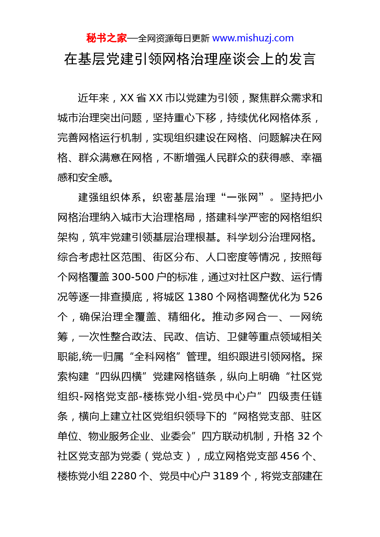 秘书之家—全网资源每日更新www.mishuzj.com在基层党建引领网格治理座谈会上的发言近年来,XX省XX市以党建为引领,聚焦群众需求和城市治理突出问题,坚持重心下移,持续优化网格体系,完善网格运行机制,实现组织建设在网格、问题解决在网格、群众满意在网格,不断增强人民群众的获得感、幸福感和安全感。建强组织体系,织密基层治理“一张网”。坚持把小网格治理纳入城市大治理格局,搭建科学严密的网格组织架构,筑牢党建引领基层治理根基。科学划分治理网格。综合考虑社区范围、街区分布、人口密度等情况,按照每个网格覆盖300-500户的标准,通过对社区户数、运行情况等逐一排查摸底,将城区1380个网格调整优化为526个,确保治理全覆盖、精细化。推动多网合一、一网统筹,一次性整合政法、民政、信访、卫健等重点领域相关职能,统一归属“全科网格”管理。组织跟进引领网格。探索构建“四纵四横”党建网格链条,纵向上明确“社区党组织-网格党支部-楼栋党小组-党员中心户”四级责任链条,横向上建立社区党组织领导下的“网格党支部、驻区单位、物业服务企业、业委会”四方联动机制,升格32个社区党支部为党委(党总支),成立网格党支部456个、楼栋党小组2280个、党员中心户3189个,将党支部建在秘书之家—全网资源每日更新www.mishuzj.com网格、党小组建到楼栋,推动党组织有机嵌入治理经脉。配齐力量充实网格。采取面向社会招聘一批、社区“两委”成员和党员骨干选拔一批等方式,共招聘选配专职网格员569名,每月为每名专职网格员发放薪酬,所需经费全部纳入财政预算。建立全科网格员常态培训机制,强化工作考评,通过电话回访、居民满意度测评等方式掌握网格员工作情况,考核结果作为其续聘解聘、薪酬发放的重要依据。凝聚各方力量,激活基层治理“全盘棋”。坚持资源下沉到网格,推动多方力量汇聚网格,为群众提供精准优质服务。党员干部包联网格。全面推行网格一线工作法,由1名区县委班子成员、1名部门负责人、1名街道班子成员共同包联一级网格,每季度入网走访排查,直接联系服务群众,让党员干部人人都有“责任田”。今年累计解决老旧小区改造、居民出行、污水管网改造等民生问题120余件。疫情期间,3.5万名在职党员在网格中亮身份、领岗位、作表率,积极开展“敲门问需”入户排摸,主动解决居家隔离、居家监测对象生活困难,累计开展志愿服务1.2万次。部门单位联建网格。建立“街区吹哨、部门报到”服务机制,每季度由街道社区党组织召开联席会议,商定网格服务事项。今年以来,全市210家部门单位与网格党组织签订共驻共建协议,落实服务项目94个,协调解决小秘书之家—全网资源每日更新www.mishuzj.com区停车难、堵塞消防通道等便民实事74件。社会力量融入网格。积极引导爱心企业、社会组织、公益团体参与网格治理服务,推动26家物业服务企业党员负责人担任网格党支部“兼职委员”,全市69家爱心企业与网格开展共建,实施便民餐桌、公益体检、爱心助学等项目46个,136家社会组织为居民提供心理疏导、爱心培训、健康义诊等服务253批次,实现了各方齐上阵、服务零距离。优化服务功能,打好基层治理“组合拳”。探索创新服务模式,拓宽服务渠道,促进基层治理更加精细高效。“线上线下”收集民意。充分利用智慧社区、网格管理服务平台、12345市民热线,通过线上收集梳理多种途径信息,实现精细分类、精准分级、精准转办。建立网格员日走访、日巡查制度,常态化开展安全隐患排查、矛盾排查化解、民意搜集调查等具体工作,做到“经常巡、随时访、及时记、实时报”。“一呼百应”调度处置。建立部门、街道、社区三个基层面快速响应机制,网格发现的一般性问题由网格员现场直接办理,重大问题按照“网格发现、街道派单、部门受理、定期反馈”的模式予以解决,今年全市共累计排查发现问题1580余件,办结率达98%。“红色代办”精准对接。依托街道社区党群服务中心,在网格建立178个“邻里和合厅”,推动便民服务下沉网格、由网格员代办,打造“15分钟便民服务圈”。成秘书之家—全网资源每日更新www.mishuzj.com立以党员和居民骨干为主的“红色代办”服务队,免费为孤寡老人、伤病(残)人员等特殊群体提供代办服务,全市526个网格为居民群众办理医保、公积金、残疾人补贴等事项4.1万余件。