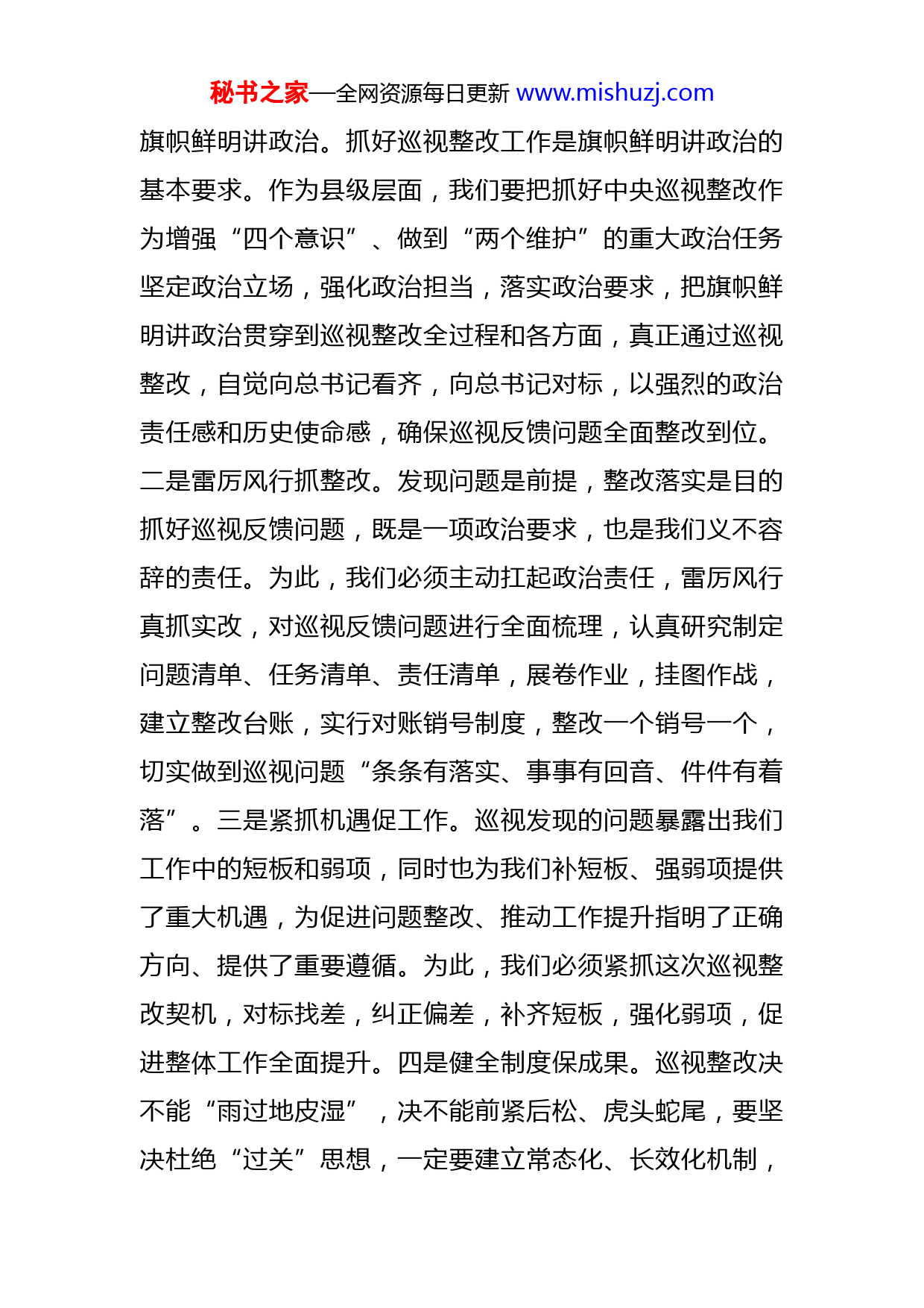 秘书之家—全网资源每日更新www.mishuzj.com在巡视整改和以案促改专题发言提纲按照省委、市委安排部署,我认真学习习近平新时代中国特色社会主义思想、习近平总书记关于巡视工作的重要讲话精神和习近平总书记视察xx的重要指示精神,聚焦这次专题民主生活会主题,结合中央巡视反馈问题,对照党章党规党纪,对照身边的违纪违法典型案例,对照省市相关要求,结合自身思想和工作实际,对自身存在的问题进行认真反思、深刻剖析。现将有关情况报告如下:一、对中央巡视和以案促改工作的认识体会习近平总书记指出,巡视是党章赋予的重要职责,是加强党的建设的重要举措,是从严治党、维护党纪的重要手段,是加强党内监督的重要形式。这次中央巡视xx,指出xx存在xx大方面xx个问题,既是对我们的一次政治体检,也是对我们各项工作的全面检阅,充分彰显了党中央全面加强从严治党的坚定决心,极大体现了党中央对xx工作的关心关爱。作为基层,抓好巡视问题整改是我们同以习近平总书记为核心的党中央保持高度一致的具体表现,是我们义不容辞、必须扛起的政治责任,更是我们要不计代价、坚决完成的政治任务,必须以更高的政治站位、更高的工作标准、更实的整改举措,来抓好巡视反馈问题的整改工作,确保中央的各项决策部署在xx落地生根。一是秘书之家—全网资源每日更新www.mishuzj.com旗帜鲜明讲政治。抓好巡视整改工作是旗帜鲜明讲政治的基本要求。作为县级层面,我们要把抓好中央巡视整改作为增强“四个意识”、做到“两个维护”的重大政治任务坚定政治立场,强化政治担当,落实政治要求,把旗帜鲜明讲政治贯穿到巡视整改全过程和各方面,真正通过巡视整改,自觉向总书记看齐,向总书记对标,以强烈的政治责任感和历史使命感,确保巡视反馈问题全面整改到位。二是雷厉风行抓整改。发现问题是前提,整改落实是目的抓好巡视反馈问题,既是一项政治要求,也是我们义不容辞的责任。为此,我们必须主动扛起政治责任,雷厉风行真抓实改,对巡视反馈问题进行全面梳理,认真研究制定问题清单、任务清单、责任清单,展卷作业,挂图作战,建立整改台账,实行对账销号制度,整改一个销号一个,切实做到巡视问题“条条有落实、事事有回音、件件有着落”。三是紧抓机遇促工作。巡视发现的问题暴露出我们工作中的短板和弱项,同时也为我们补短板、强弱项提供了重大机遇,为促进问题整改、推动工作提升指明了正确方向、提供了重要遵循。为此,我们必须紧抓这次巡视整改契机,对标找差,纠正偏差,补齐短板,强化弱项,促进整体工作全面提升。四是健全制度保成果。巡视整改决不能“雨过地皮湿”,决不能前紧后松、虎头蛇尾,要坚决杜绝“过关”思想,一定要建立常态化、长效化机制,秘书之家—全网资源每日更新www.mishuzj.com结合运用巡视成果,透过现象看本质,把整改显性问题与整治隐形问题结合起来,把解决具体问题与破解普遍问题结合起来,既咬住当前问题不放,又注重触类旁通、举一反三,真正做到解决一个问题、堵塞一批漏洞、完善一套制度,持续巩固巡视问题整改成果。开展以案促改工作是贯彻落实中央、省委坚持标本兼治推进全面从严治党部署要求的重大举措。这次我县开展的以案促改工作,紧紧扭住典型案例、开展警示教育、深刻剖析问题、着力整改提高等关键环节,以“案”为基础以“促”为关键,以“改”为目标,推动以案促改工作常态长效。通过对xxx、xxx两起违纪违法案件的深刻反思,我对他们的违法违纪行为深感痛心、深感惋惜,但反过来想想,他们的行为不仅葬送了自己的事业、毁掉了自己的前程,还让家人背负了沉重的思想包袱、承受了强大的社会压力,更重要的是辜负了组织多年的培养、群众的期待贻误了xx事业的发展,损毁了党委政府的形象,给经济社会发展带来了不良影响。作为党员干部,我们要深刻汲取教训,以此为镜鉴,警钟长鸣,防微杜渐,以案促改,始终把纪律规矩当做红线底线,敬畏规矩,遵守法纪,严以律己,自觉接受监督,切实增强遵纪守法的思想自觉和行动自觉,始终做到干净做人、清白为官。二、个人有关事项秘书之家—全网资源每日更新www.mishuzj.com经过认真自查、深刻反思,自己从来没有参加过任何形式的宗教和封建迷信活动;从来没有组织或参与牌友圈球友圈、酒局圈和校友圈,能够带头抵制和治理圈子文化能够牢固树立纪律规矩意识,不存在干部工作中跑风漏气说情打招呼现象,也从来没有过任何题词题字行为。在人情消费上,没有借婚丧嫁娶和逢年过节收受他人礼金或有价证券、支付凭证、会员卡。在职务消费上,严格执行有关规定,没有超出标准、违反规定行为,没有借职务之便为自己和家人谋取私利,没有出入私人会所、持有会员卡现象。近两年也没有因公出国。在今后工作生活中,我也决不会出现上述违纪行为,希望大家监督。三、存在的问题(一)在学习思想政治理论方面。一是对习近平新时代中国特色社会主义思想的丰富内涵和精神实质,学习得不够深入,理解得不够透彻,没有做到举一反三、触类旁通,在用习近平新时代中国特色社会主义思想指导实践、推动工作方面做得还不够到位;二是对同志们学习贯彻习近平新时代中国特色社会主义思想督导不够到位,总认为办公室同志们政治素质较高,学