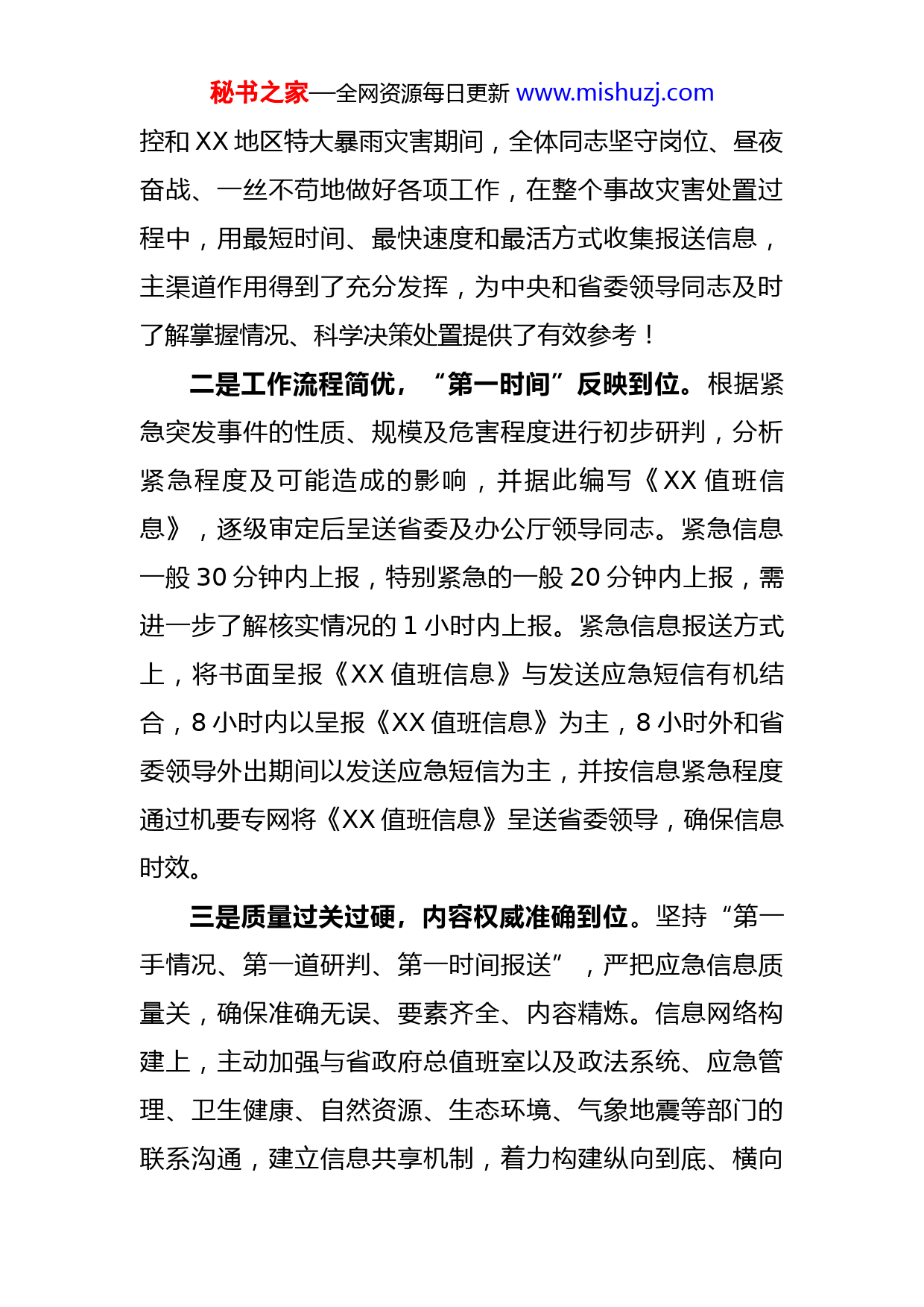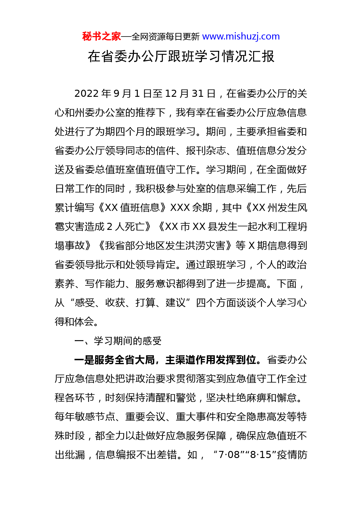 秘书之家—全网资源每日更新www.mishuzj.com在省委办公厅跟班学习情况汇报2022年9月1日至12月31日,在省委办公厅的关心和州委办公室的推荐下,我有幸在省委办公厅应急信息处进行了为期四个月的跟班学习。期间,主要承担省委和省委办公厅领导同志的信件、报刊杂志、值班信息分发分送及省委总值班室值班值守工作。学习期间,在全面做好日常工作的同时,我积极参与处室的信息采编工作,先后累计编写《XX值班信息》XXX余期,其中《XX州发生风雹灾害造成2人死亡》《XX市XX县发生一起水利工程坍塌事故》《我省部分地区发生洪涝灾害》等X期信息得到省委领导批示和处领导肯定。通过跟班学习,个人的政治素养、写作能力、服务意识都得到了进一步提高。下面,从“感受、收获、打算、建议”四个方面谈谈个人学习心得和体会。一、学习期间的感受一是服务全省大局,主渠道作用发挥到位。省委办公厅应急信息处把讲政治要求贯彻落实到应急值守工作全过程各环节,时刻保持清醒和警觉,坚决杜绝麻痹和懈怠。每年敏感节点、重要会议、重大事件和安全隐患高发等特殊时段,都全力以赴做好应急服务保障,确保应急值班不出纰漏,信息编报不出差错。如,“7·08”“8·15”疫情防秘书之家—全网资源每日更新www.mishuzj.com控和XX地区特大暴雨灾害期间,全体同志坚守岗位、昼夜奋战、一丝不苟地做好各项工作,在整个事故灾害处置过程中,用最短时间、最快速度和最活方式收集报送信息,主渠道作用得到了充分发挥,为中央和省委领导同志及时了解掌握情况、科学决策处置提供了有效参考!二是工作流程简优,“第一时间”反映到位。根据紧急突发事件的性质、规模及危害程度进行初步研判,分析紧急程度及可能造成的影响,并据此编写《XX值班信息》,逐级审定后呈送省委及办公厅领导同志。紧急信息一般30分钟内上报,特别紧急的一般20分钟内上报,需进一步了解核实情况的1小时内上报。紧急信息报送方式上,将书面呈报《XX值班信息》与发送应急短信有机结合,8小时内以呈报《XX值班信息》为主,8小时外和省委领导外出期间以发送应急短信为主,并按信息紧急程度通过机要专网将《XX值班信息》呈送省委领导,确保信息时效。三是质量过关过硬,内容权威准确到位。坚持“第一手情况、第一道研判、第一时间报送”,严把应急信息质量关,确保准确无误、要素齐全、内容精炼。信息网络构建上,主动加强与省政府总值班室以及政法系统、应急管理、卫生健康、自然资源、生态环境、气象地震等部门的联系沟通,建立信息共享机制,着力构建纵向到底、横向秘书之家—全网资源每日更新www.mishuzj.com到边、上下贯通的信息收集网络。信息处理编报上,坚持去粗取精、去伪存真,对紧急突发事件发生的时间、地点、性质、规模、原因、人员伤亡、财产损失、现场处置及采取的措施等进行全面反复核实,并跟踪事态发展、后续处置等情况,快速反应,保证信息的准确性、时效性和全面性。信息服务创新上,针对可能出现的各类影响社会大局稳定,涉及人民群众生命财产安全的紧急突发事件或有苗头性、动向性、规律性的重大事件,采取“点穴式”“命题式”方法,选准专题综合分析,撰写研判信息材料,服务领导科学决策,推动工作落实见效。四是标准高而严格,人民至上体现到位。应急值班工作一头连着党委,一头系着群众,件件牵动着领导的心,事事关乎群众利益。省委总值班室把领导、基层和群众满意作为终极目标,把发挥好应急值班服务和维护好党办良好形象作为工作人员必须具备素养,始终坚持“四个不能”,即不能让大小事情延误、不能让任何差错发生、不能让联系群众受到冷落、不能让党办形象受到影响。认真对待每一个电话、每一份传真、每一件文电,坚持把勤勉敬业、严谨细致、精干高效、稳妥周全的良好作风贯穿于每一项工作、体现在每一件事情、融入到每一个细节。二、学习之后的收获一是开阔了视野,增长了见识,看到了差距。学习期秘书之家—全网资源每日更新www.mishuzj.com间,我虚心向应急信息处领导和各位同事请教,认真学习同事们良好的工作方法,深入了解处室职能职责和制度建设,坚持在学中干、干中学。同时,也认识到了自身思想认识不高,工作理念滞后,服务意识、纪律意识、规矩意识和奋斗意识有待进一步提高等问题。二是锤炼了作风,提升了素质,弥补了不足。在处里领导的言传身教和业务骨干的传帮带下,全面掌握工作流程,认真钻研业务知识,熟练操作办公设备,较全面地掌握了应急信息采编的方法和技巧,也学到了很多新知识和好经验,个人的业务能力也得到了显著提高,可以说此次跟班学习受益匪浅、收获很大。三是拓宽了思路,创新了思维,突破了束缚。应急信息处各位领导和同事思想上的大局意识、责任意识,工作上的敬业精神、奉献精神,作风上的严肃谨慎、严于律己,生活上的诚恳谦虚、待人和亲,给我留下了深刻的影响,也切身感受到自己在工作中创新意识不强、方法办法老旧、眼界窄而偏小的问题。三、今后努力的方向一要突出“快”,做到第一时间报送。快发现是紧急信息报送工作的生命线。整合紧急信息报送资源,建立与应急、公安、卫生防疫、防汛防灾、森林防火等部门的信息报送联动机制,加强信息共享、形势研