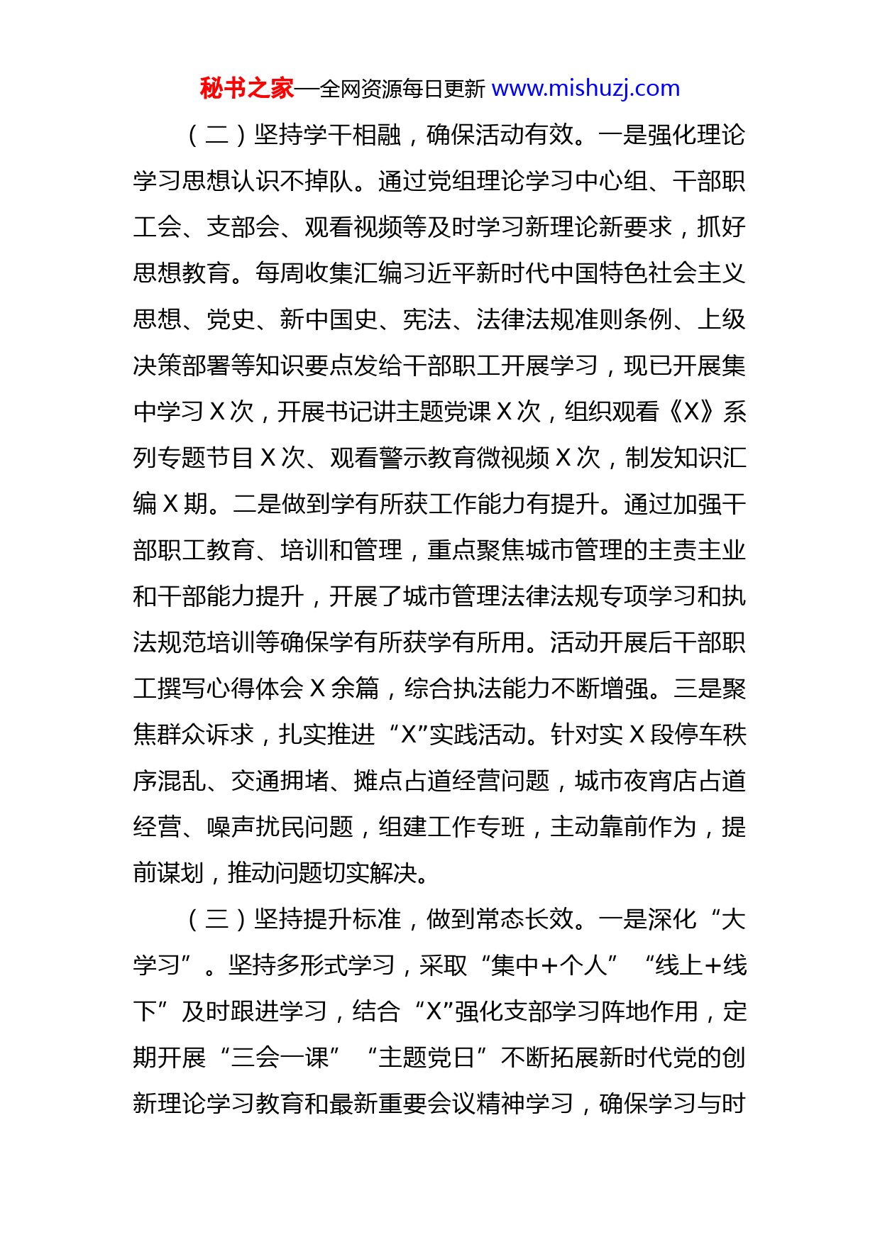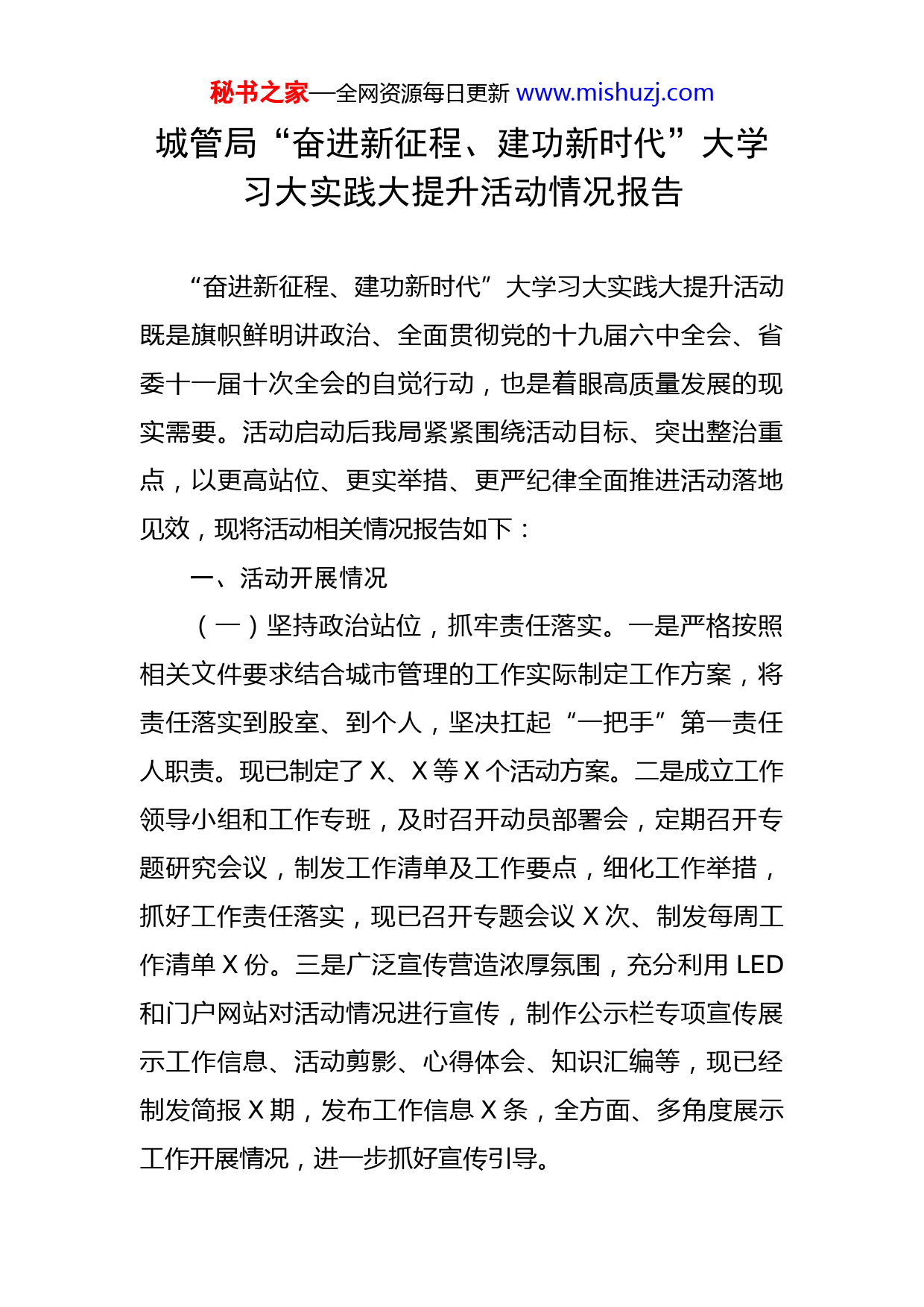 秘书之家—全网资源每日更新www.mishuzj.com城管局“奋进新征程、建功新时代”大学习大实践大提升活动情况报告“奋进新征程、建功新时代”大学习大实践大提升活动既是旗帜鲜明讲政治、全面贯彻党的十九届六中全会、省委十一届十次全会的自觉行动,也是着眼高质量发展的现实需要。活动启动后我局紧紧围绕活动目标、突出整治重点,以更高站位、更实举措、更严纪律全面推进活动落地见效,现将活动相关情况报告如下:一、活动开展情况(一)坚持政治站位,抓牢责任落实。一是严格按照相关文件要求结合城市管理的工作实际制定工作方案,将责任落实到股室、到个人,坚决扛起“一把手”第一责任人职责。现已制定了X、X等X个活动方案。二是成立工作领导小组和工作专班,及时召开动员部署会,定期召开专题研究会议,制发工作清单及工作要点,细化工作举措,抓好工作责任落实,现已召开专题会议X次、制发每周工作清单X份。三是广泛宣传营造浓厚氛围,充分利用LED和门户网站对活动情况进行宣传,制作公示栏专项宣传展示工作信息、活动剪影、心得体会、知识汇编等,现已经制发简报X期,发布工作信息X条,全方面、多角度展示工作开展情况,进一步抓好宣传引导。秘书之家—全网资源每日更新www.mishuzj.com(二)坚持学干相融,确保活动有效。一是强化理论学习思想认识不掉队。通过党组理论学习中心组、干部职工会、支部会、观看视频等及时学习新理论新要求,抓好思想教育。每周收集汇编习近平新时代中国特色社会主义思想、党史、新中国史、宪法、法律法规准则条例、上级决策部署等知识要点发给干部职工开展学习,现已开展集中学习X次,开展书记讲主题党课X次,组织观看《X》系列专题节目X次、观看警示教育微视频X次,制发知识汇编X期。二是做到学有所获工作能力有提升。通过加强干部职工教育、培训和管理,重点聚焦城市管理的主责主业和干部能力提升,开展了城市管理法律法规专项学习和执法规范培训等确保学有所获学有所用。活动开展后干部职工撰写心得体会X余篇,综合执法能力不断增强。三是聚焦群众诉求,扎实推进“X”实践活动。针对实X段停车秩序混乱、交通拥堵、摊点占道经营问题,城市夜宵店占道经营、噪声扰民问题,组建工作专班,主动靠前作为,提前谋划,推动问题切实解决。(三)坚持提升标准,做到常态长效。一是深化“大学习”。坚持多形式学习,采取“集中+个人”“线上+线下”及时跟进学习,结合“X”强化支部学习阵地作用,定期开展“三会一课”“主题党日”不断拓展新时代党的创新理论学习教育和最新重要会议精神学习,确保学习与时秘书之家—全网资源每日更新www.mishuzj.com俱进务求实效。二是推进“大实践”。坚持以群众关心关切的问题为工作抓手开展实践行动,以X为载体提升城市精细治理标准,X。三是促进“大提升”。坚持问题导向、结果导向,扎实开谈心谈话活动,围绕X深刻查摆自身问题,真正把自己摆进去、把职责摆进去、把工作摆进去,共开展谈心谈话X次,整理分类问题X个,建立问题清单,自查整改问题X个。二、取得成效一是政治站位更稳更牢。通过理论学全局干部职工政治站位更牢,思想认识更深,思想自觉、政治自觉和行动自觉更稳更牢。二是工作作风更严更实。全局干部职工能进一步牢记岗位责任,践行使命担当,树牢严实的工作作风,进一步站稳群众立场,真情服务群众,群众满意度不断提高。三是能力本领更强更高。面对城市管理的顽瘴痼疾甘于亮剑,甘于斗争碰硬开展整治,队伍素质不断增强,执法新形象进一步展现。三、存在问题无四、下一步工作计划按照部门活动方案深入推进“奋进新征程、建功新时代”大学习大实践大提升活动\,把牢活动的意义,坚持真抓实干,奋发有为。