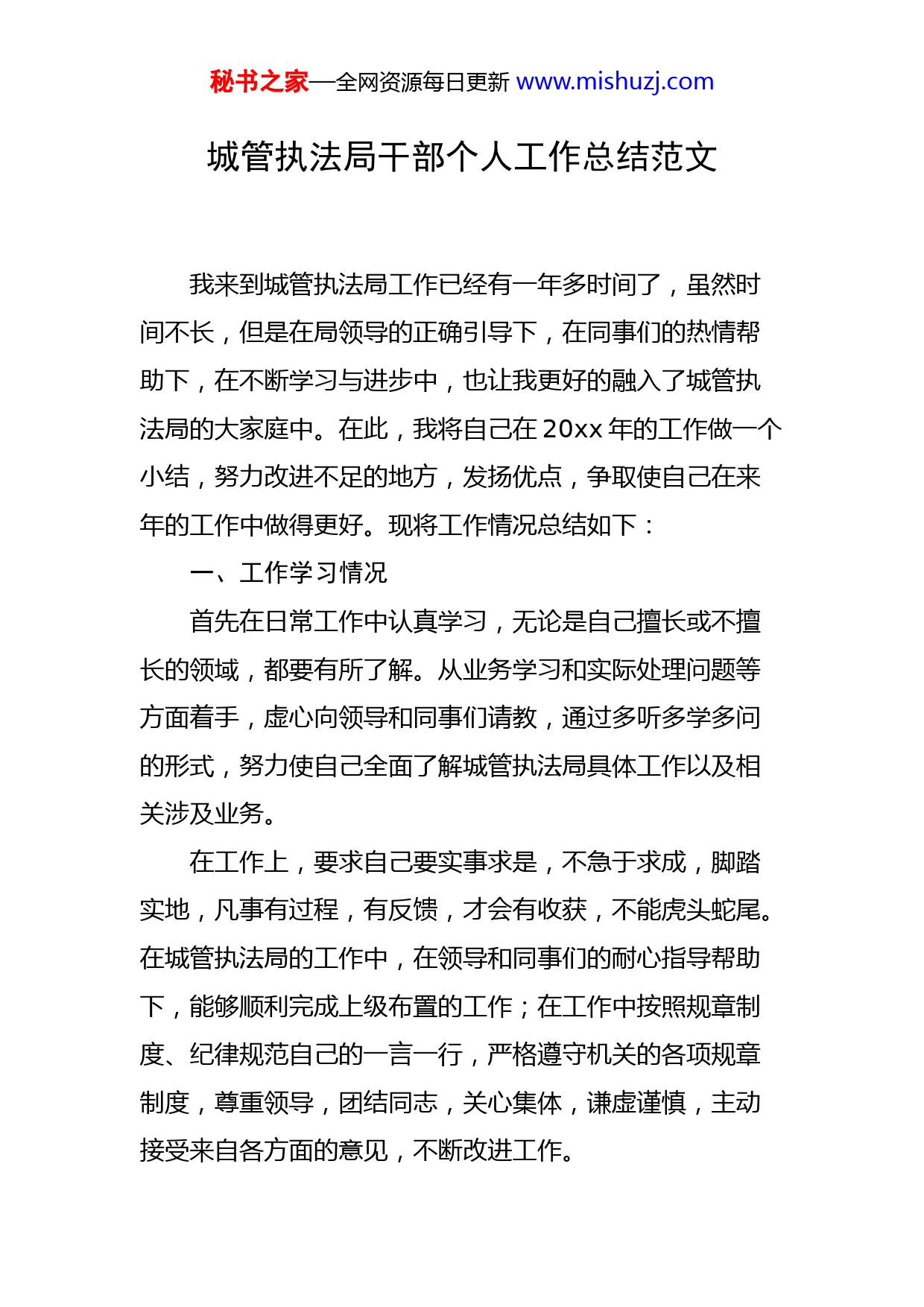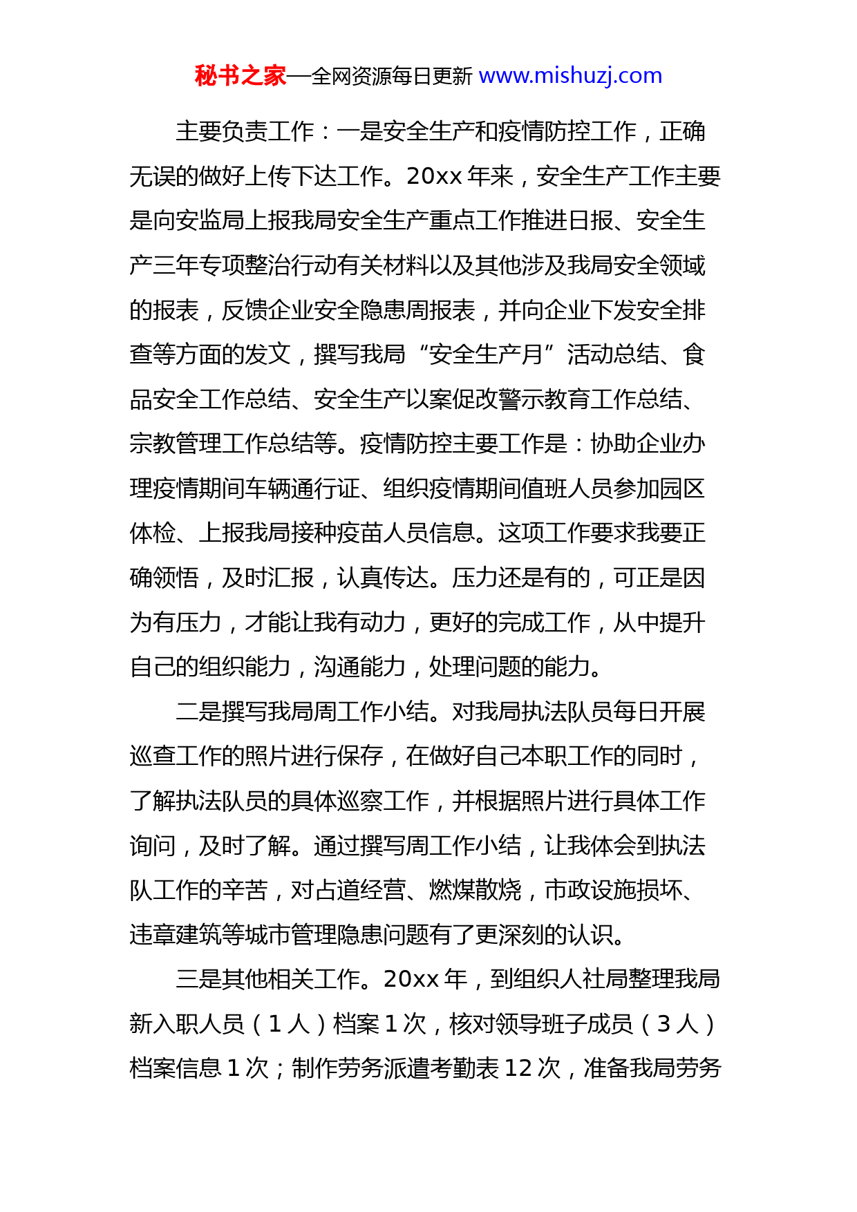 秘书之家—全网资源每日更新www.mishuzj.com城管执法局干部个人工作总结范文我来到城管执法局工作已经有一年多时间了,虽然时间不长,但是在局领导的正确引导下,在同事们的热情帮助下,在不断学习与进步中,也让我更好的融入了城管执法局的大家庭中。在此,我将自己在20xx年的工作做一个小结,努力改进不足的地方,发扬优点,争取使自己在来年的工作中做得更好。现将工作情况总结如下:一、工作学习情况首先在日常工作中认真学习,无论是自己擅长或不擅长的领域,都要有所了解。从业务学习和实际处理问题等方面着手,虚心向领导和同事们请教,通过多听多学多问的形式,努力使自己全面了解城管执法局具体工作以及相关涉及业务。在工作上,要求自己要实事求是,不急于求成,脚踏实地,凡事有过程,有反馈,才会有收获,不能虎头蛇尾。在城管执法局的工作中,在领导和同事们的耐心指导帮助下,能够顺利完成上级布置的工作;在工作中按照规章制度、纪律规范自己的一言一行,严格遵守机关的各项规章制度,尊重领导,团结同志,关心集体,谦虚谨慎,主动接受来自各方面的意见,不断改进工作。秘书之家—全网资源每日更新www.mishuzj.com主要负责工作:一是安全生产和疫情防控工作,正确无误的做好上传下达工作。20xx年来,安全生产工作主要是向安监局上报我局安全生产重点工作推进日报、安全生产三年专项整治行动有关材料以及其他涉及我局安全领域的报表,反馈企业安全隐患周报表,并向企业下发安全排查等方面的发文,撰写我局“安全生产月”活动总结、食品安全工作总结、安全生产以案促改警示教育工作总结、宗教管理工作总结等。疫情防控主要工作是:协助企业办理疫情期间车辆通行证、组织疫情期间值班人员参加园区体检、上报我局接种疫苗人员信息。这项工作要求我要正确领悟,及时汇报,认真传达。压力还是有的,可正是因为有压力,才能让我有动力,更好的完成工作,从中提升自己的组织能力,沟通能力,处理问题的能力。二是撰写我局周工作小结。对我局执法队员每日开展巡查工作的照片进行保存,在做好自己本职工作的同时,了解执法队员的具体巡察工作,并根据照片进行具体工作询问,及时了解。通过撰写周工作小结,让我体会到执法队工作的辛苦,对占道经营、燃煤散烧,市政设施损坏、违章建筑等城市管理隐患问题有了更深刻的认识。三是其他相关工作。20xx年,到组织人社局整理我局新入职人员(1人)档案1次,核对领导班子成员(3人)档案信息1次;制作劳务派遣考勤表12次,准备我局劳务秘书之家—全网资源每日更新www.mishuzj.com派遣合同续签材料2次(共计续签9人);提交大学生见习材料1次(3人);配合领导、同事做好20xx年党建、星级党支部工作,组织好单位工作会议、学习培训等活动。二、自身存在的不足20xx年,我在学习和工作中逐步成长、成熟,虽然有了不少的收获,但由于工作经验甚浅,我也清楚的认识到自身还有存在很多不足:第一,对工作的落实缺乏坚持到底的精神。对待工作有只是满足于不出差错,而没有更进一步研究如何将工作做的更好、更深入、更细致。第二,在制度的落实上不出问题就行的现象。对自己的要求不够严格,只满足与不违反制度,而没有想怎么更好的落实制度。第三,在责任落实方面存在应付思想,认为自己的工作不出问题就可以,在责任落实上存在推诿思想,缺乏大局意识,学习能力不足。以上都是自己20xx年工作中的不足,接下来要努力改正。三、20xx年工作计划辞旧迎新,新的一年里我要更加努力。认真履行岗位职责,细心完成上级布置的工作,继续收集群内巡查照片,更加全面、准确的了解城管执法工作的开展状况,并树立秘书之家—全网资源每日更新www.mishuzj.com文明执法的理念,完成本职工作的同时,多跟执法队员到巡查现场去看一看、学一学,学习如何与群众、商户沟通,遇到棘手问题怎么处理和解决。提升个人业务能力,努力学习理论知识,并结合实践,学以致用,学习城市管理领域相关的法律知识,在实践中更好的向群众讲解和宣传。虚心接受同事们的建议,多学多问,新的一年让我们继续努力奋斗,共同进步。