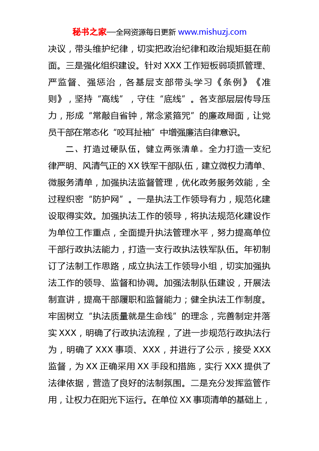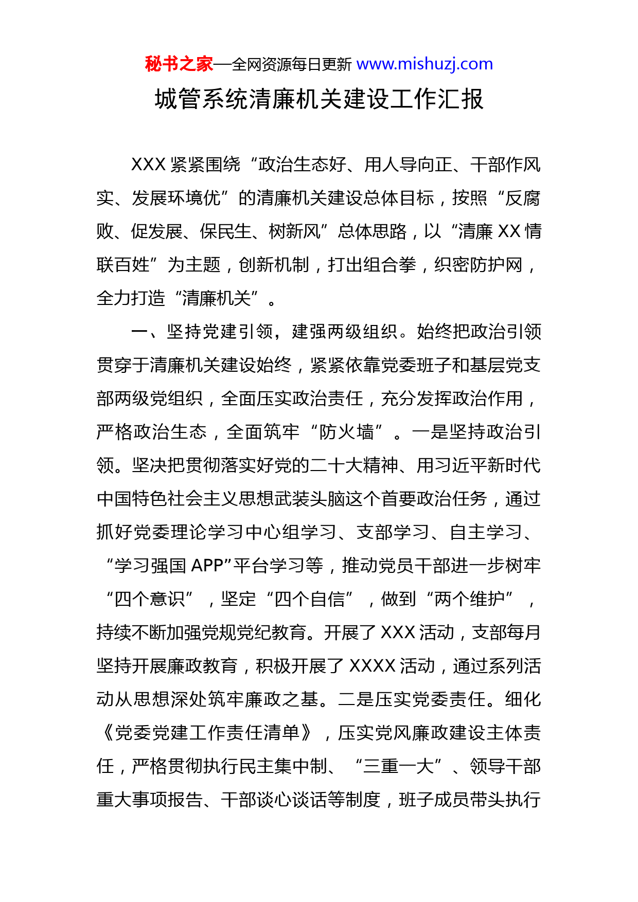 秘书之家—全网资源每日更新www.mishuzj.com城管系统清廉机关建设工作汇报XXX紧紧围绕“政治生态好、用人导向正、干部作风实、发展环境优”的清廉机关建设总体目标,按照“反腐败、促发展、保民生、树新风”总体思路,以“清廉XX情联百姓”为主题,创新机制,打出组合拳,织密防护网,全力打造“清廉机关”。一、坚持党建引领,建强两级组织。始终把政治引领贯穿于清廉机关建设始终,紧紧依靠党委班子和基层党支部两级党组织,全面压实政治责任,充分发挥政治作用,严格政治生态,全面筑牢“防火墙”。一是坚持政治引领。坚决把贯彻落实好党的二十大精神、用习近平新时代中国特色社会主义思想武装头脑这个首要政治任务,通过抓好党委理论学习中心组学习、支部学习、自主学习、“学习强国APP”平台学习等,推动党员干部进一步树牢“四个意识”,坚定“四个自信”,做到“两个维护”,持续不断加强党规党纪教育。开展了XXX活动,支部每月坚持开展廉政教育,积极开展了XXXX活动,通过系列活动从思想深处筑牢廉政之基。二是压实党委责任。细化《党委党建工作责任清单》,压实党风廉政建设主体责任,严格贯彻执行民主集中制、“三重一大”、领导干部重大事项报告、干部谈心谈话等制度,班子成员带头执行秘书之家—全网资源每日更新www.mishuzj.com决议,带头维护纪律,切实把政治纪律和政治规矩挺在前面。三是强化组织建设。针对XXX工作短板弱项抓管理、严监督、强惩治,各基层支部带头学习《条例》《准则》,坚持“高线”,守住“底线”。各支部层层传导压力,形成“常敲自省钟,常念紧箍咒”的廉政局面,让党员干部在常态化“咬耳扯袖”中增强廉洁自律意识。二、打造过硬队伍,健立两张清单。全力打造一支纪律严明、风清气正的XX铁军干部队伍,建立微权力清单、微服务清单,加强执法监督管理,优化政务服务效能,全过程织密“防护网”。一是执法工作领导有力,规范化建设取得实效。加强执法工作的领导,将执法规范化建设作为单位工作重点,全面提升执法管理水平,努力提高单位干部行政执法能力,打造一支行政执法铁军队伍。年初制订了法制工作思路,成立执法工作领导小组,切实加强执法工作的领导、监督和协调。加强法制队伍建设,开展法制宣讲,提高干部履职和监督能力;健全执法工作制度。牢固树立“执法质量就是生命线”的理念,完善制定并落实XXX,明确了行政执法流程,了进一步规范行政执法行为,明确了XXX事项、XXX,并进行了公示,接受XXX监督,为XX正确采用XX手段和措施,实行XXX提供了法律依据,营造了良好的法制氛围。二是充分发挥监管作用,让权力在阳光下运行。在单位XX事项清单的基础上,秘书之家—全网资源每日更新www.mishuzj.com全面梳理微XX清单,涉及XXXXX等,进一步明确明确权力边界,将权力事项用制度的形式固定下来,工作人员在进行权力事项检查时主动出示“微XXX清单”,使权力运行进一步公开透明。例如:XXX,对于不按清单工作的人员,明确举报投诉电话,一经查实严肃处理。三是切实增强服务效能,助力优化营商环境。为进一步提升服务水平,结合XXX工作要求,我们对照全部XX服务事项逐条分析,建立微XX清单,涉及XXX,进一步完善XXX办事服务一次性告知单,积极践行“主动服务、靠前服务”等工作举措,有效提升服务效率和服务质量,助力优化营商环境。特别是XXXX。三、突出关键少数,建全两项机制。抓好关键干部这个少数,健全XX工作和XX工作监督机制,拉起“高压线”。一是抓住关键少数。我单位将XX干部这个关键少数的管理摆在“清廉机关”建设的突出位置,用关键少数管好绝大多数,抓好“关键少数,才有有关键作为。我单位采取定期工作汇报、督办等制度,对落实微XX清单、微XX清单以及重点工作,开展定期的检查,督促XX干部按规要求落实职能职责,管好自己的事、管牢自己的人,通过系列举措将XX干部这个“关键少数”的思想牢牢抓在手中,将他们的管理紧紧握在手中,全面夯实XX工作基石。二是健全考评机制。强化责任意识,坚守责任担当,确保秘书之家—全网资源每日更新www.mishuzj.com评议工作取得实效。一是制定工作方案,建立健全机制。结合XX工作的实际,XXX。二是主动引导群众评价,提高服务评价参与度。我单位积极引导服务对象参加XX,增加群众参与度,营造人人知晓,人人参与的良好氛围。三是优化XX服务,改进工作作风。在评议活动中,始终把服务好、维护好、实现好群众的根本利益及优化营商环境放在突出位置,不断提高依法工作水平,切实维护好群众的合法权益。工作专班建立督导检查机制,通过加强日常监督、组织自查自评、定期调度研判等多项措施,扎实推进工作,用制度倒逼作风转变。三是健全XX机制。我单位坚持把XX工作作为党风廉政建设的重要抓手,用XX办理工作推动单位工作上新台阶。一是健全制度。我单位把XX工作纳入重要议事日程,确保XX工作有位置,工作上有安排,经费上有保障,研究制定《XXXXX管理工作制度》,进一步明确了XX处置流程、责任划分、考核标准,同时进一步充实XX工作人员力量,各部门设立XX专岗人员,负责本部门XX处理工作,促进XX工作任务的落实到位,做到了“制度管人,规范管事”。二是优化流程。进一步优化XX工作流程,研究制作XXX,再派发,做到了件件可查询、可跟进、可督办。