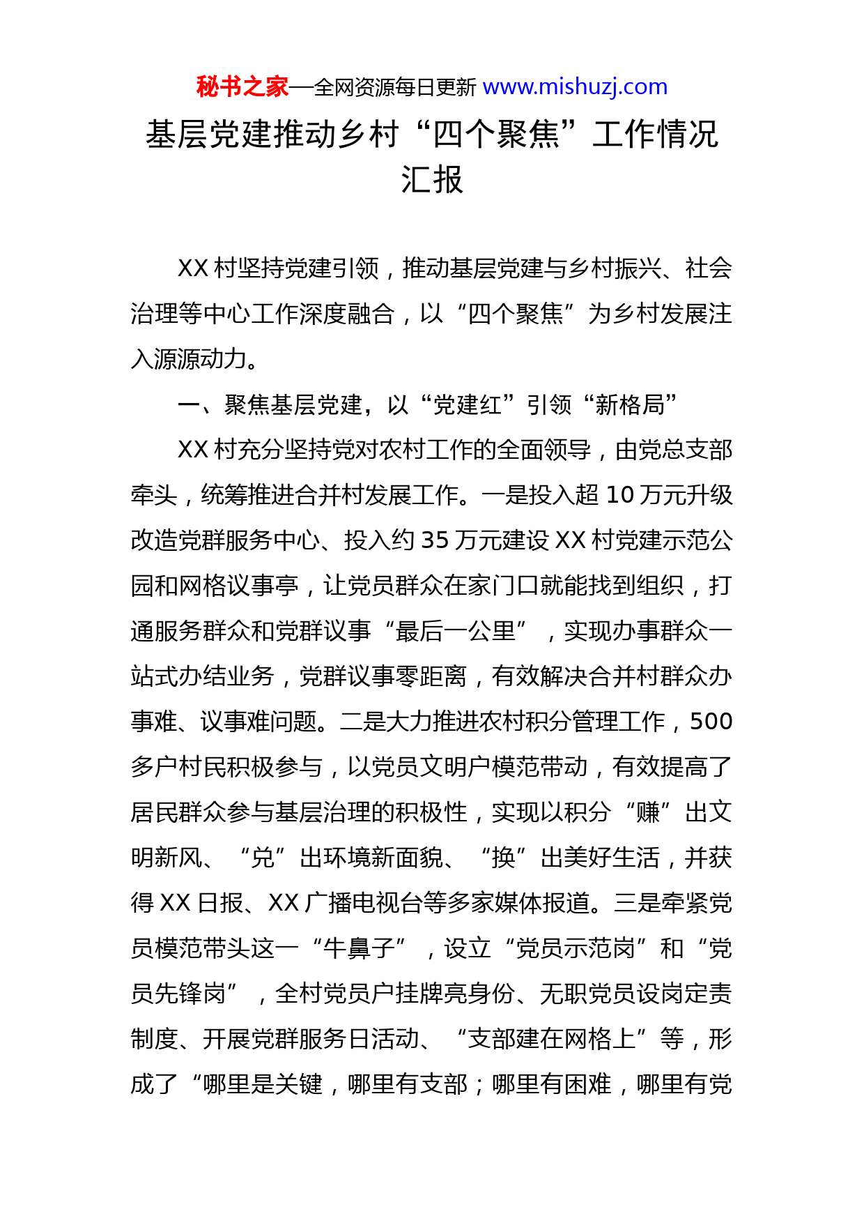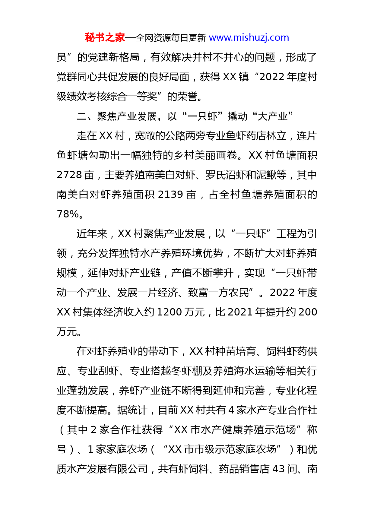 秘书之家—全网资源每日更新www.mishuzj.com基层党建推动乡村“四个聚焦”工作情况汇报XX村坚持党建引领,推动基层党建与乡村振兴、社会治理等中心工作深度融合,以“四个聚焦”为乡村发展注入源源动力。一、聚焦基层党建,以“党建红”引领“新格局”XX村充分坚持党对农村工作的全面领导,由党总支部牵头,统筹推进合并村发展工作。一是投入超10万元升级改造党群服务中心、投入约35万元建设XX村党建示范公园和网格议事亭,让党员群众在家门口就能找到组织,打通服务群众和党群议事“最后一公里”,实现办事群众一站式办结业务,党群议事零距离,有效解决合并村群众办事难、议事难问题。二是大力推进农村积分管理工作,500多户村民积极参与,以党员文明户模范带动,有效提高了居民群众参与基层治理的积极性,实现以积分“赚”出文明新风、“兑”出环境新面貌、“换”出美好生活,并获得XX日报、XX广播电视台等多家媒体报道。三是牵紧党员模范带头这一“牛鼻子”,设立“党员示范岗”和“党员先锋岗”,全村党员户挂牌亮身份、无职党员设岗定责制度、开展党群服务日活动、“支部建在网格上”等,形成了“哪里是关键,哪里有支部;哪里有困难,哪里有党秘书之家—全网资源每日更新www.mishuzj.com员”的党建新格局,有效解决并村不并心的问题,形成了党群同心共促发展的良好局面,获得XX镇“2022年度村级绩效考核综合一等奖”的荣誉。二、聚焦产业发展,以“一只虾”撬动“大产业”走在XX村,宽敞的公路两旁专业鱼虾药店林立,连片鱼虾塘勾勒出一幅独特的乡村美丽画卷。XX村鱼塘面积2728亩,主要养殖南美白对虾、罗氏沼虾和泥鳅等,其中南美白对虾养殖面积2139亩,占全村鱼塘养殖面积的78%。近年来,XX村聚焦产业发展,以“一只虾”工程为引领,充分发挥独特水产养殖环境优势,不断扩大对虾养殖规模,延伸对虾产业链,产值不断攀升,实现“一只虾带动一个产业、发展一片经济、致富一方农民”。2022年度XX村集体经济收入约1200万元,比2021年提升约200万元。在对虾养殖业的带动下,XX村种苗培育、饲料虾药供应、专业刮虾、专业搭越冬虾棚及养殖海水运输等相关行业蓬勃发展,养虾产业链不断得到延伸和完善,专业化程度不断提高。据统计,目前XX村共有4家水产专业合作社(其中2家合作社获得“XX市水产健康养殖示范场”称号)、1家家庭农场(“XX市市级示范家庭农场”)和优质水产发展有限公司,共有虾饲料、药品销售店43间、南秘书之家—全网资源每日更新www.mishuzj.com美白对虾培育场1间。由此,XX村的水产养殖形成“一村一产业”的集聚效应,已有40%以上的农户加入“公司+农户”“合作社+农户”模式合作经营,摆脱农村传统的家庭户水产养殖规模小、产业链短困局,获评“省级南美白对虾专业村”,“一只虾”已成长为富民兴村的“大产业”。三、聚焦群众服务,以“小网格”服务“大民生”XX村聚焦服务群众“最后一公里”,积极推进网格化精细管理,划片包干到户,网格管理到人,致力以“小网格”服务“大民生”,使群众的“急难愁盼”事事有着落、件件有回应,有效解决合并村群众办事难,办事不便的问题。一是升级打造网格指挥中心,将全村科学划分为2个大网格、7个应急单元,创新制作网格门牌,做到一房一号,实现网格门牌号码与网格信息一体化、标准化。二是成立“XX村网格志愿服务队”,驻村组、村干部、无职党员、村民代表、乡贤、青年志愿者等全员下沉网格,以1人就近联系5-10户打造5分钟“便民服务圈”。同时,建立“村民下单—网格员接单—办理结果点评”闭环工作模式,以“网尽百姓事,服务零距离”做好网格化管理工作,为群众提供多元化服务,为村民提供办理证明、纠纷调解、信息咨询、政策宣传等各类便民服秘书之家—全网资源每日更新www.mishuzj.com务。三是做细做实网格员职责。把环境卫生巡查、安全生产检查当作网格巡查每天的“必修课”,网格员争当群众的“和事佬”,致力于为群众办实事、解难题。2022年XX村已巡访发现收集问题56个,已协调解决56个,化解矛盾纠纷12件,清理垃圾和整治乱堆乱放等300余处。四、聚焦人居环境,以“动真格”蝶变“展新颜”为扎实推进农村人居环境整治工作,XX村聚焦整治难点,紧盯卫生死角,以网格化管理为抓手,通过组织党员、干部、志愿者包村入户,开展人居环境整治志愿服务活动等,对村内主要道路、横街小巷、房前屋后等重点区域进行清扫,着力打造干净整洁的人居环境。通过村广播、宣传栏、微信群等进行人居环境整治、垃圾分类等宣传,积极动员村民参与“四小园”建设,开展“最美庭院”评比活动,以庭院之“小美”助推乡村之“大美”,让昔日“脏乱差”的老区村蝶变“展新颜”。2022年开展“三清理”1531处,“三拆除”1处,“三整治”99处,投入约30万元开展人居环境整治工作,投入约35万元将闲置地改建为公园。