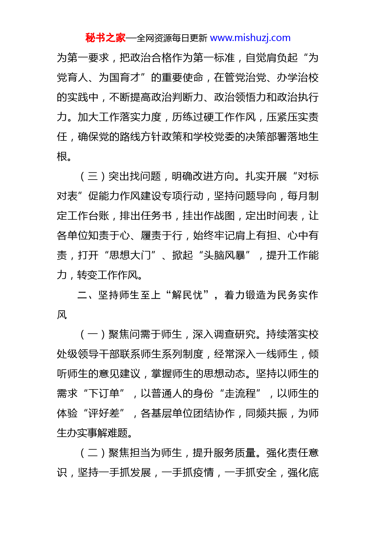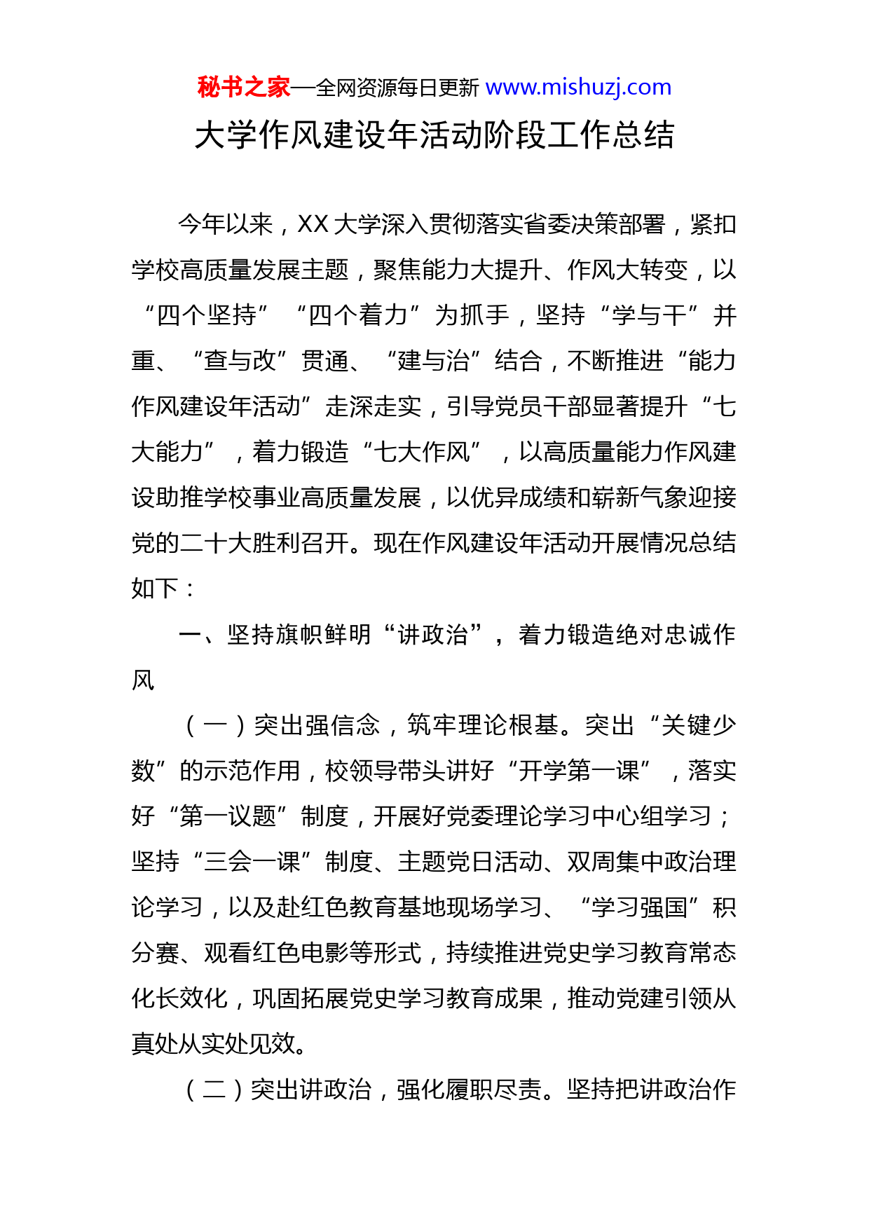 秘书之家—全网资源每日更新www.mishuzj.com大学作风建设年活动阶段工作总结今年以来,XX大学深入贯彻落实省委决策部署,紧扣学校高质量发展主题,聚焦能力大提升、作风大转变,以“四个坚持”“四个着力”为抓手,坚持“学与干”并重、“查与改”贯通、“建与治”结合,不断推进“能力作风建设年活动”走深走实,引导党员干部显著提升“七大能力”,着力锻造“七大作风”,以高质量能力作风建设助推学校事业高质量发展,以优异成绩和崭新气象迎接党的二十大胜利召开。现在作风建设年活动开展情况总结如下:一、坚持旗帜鲜明“讲政治”,着力锻造绝对忠诚作风(一)突出强信念,筑牢理论根基。突出“关键少数”的示范作用,校领导带头讲好“开学第一课”,落实好“第一议题”制度,开展好党委理论学习中心组学习;坚持“三会一课”制度、主题党日活动、双周集中政治理论学习,以及赴红色教育基地现场学习、“学习强国”积分赛、观看红色电影等形式,持续推进党史学习教育常态化长效化,巩固拓展党史学习教育成果,推动党建引领从真处从实处见效。(二)突出讲政治,强化履职尽责。坚持把讲政治作秘书之家—全网资源每日更新www.mishuzj.com为第一要求,把政治合格作为第一标准,自觉肩负起“为党育人、为国育才”的重要使命,在管党治党、办学治校的实践中,不断提高政治判断力、政治领悟力和政治执行力。加大工作落实力度,历练过硬工作作风,压紧压实责任,确保党的路线方针政策和学校党委的决策部署落地生根。(三)突出找问题,明确改进方向。扎实开展“对标对表”促能力作风建设专项行动,坚持问题导向,每月制定工作台账,排出任务书,挂出作战图,定出时间表,让各单位知责于心、履责于行,始终牢记肩上有担、心中有责,打开“思想大门”、掀起“头脑风暴”,提升工作能力,转变工作作风。二、坚持师生至上“解民忧”,着力锻造为民务实作风(一)聚焦问需于师生,深入调查研究。持续落实校处级领导干部联系师生系列制度,经常深入一线师生,倾听师生的意见建议,掌握师生的思想动态。坚持以师生的需求“下订单”,以普通人的身份“走流程”,以师生的体验“评好差”,各基层单位团结协作,同频共振,为师生办实事解难题。(二)聚焦担当为师生,提升服务质量。强化责任意识,坚持一手抓发展,一手抓疫情,一手抓安全,强化底秘书之家—全网资源每日更新www.mishuzj.com线思维,压实各级责任,强化源头防控、过程把控、应急管控,主动防范校园安全稳定的各类风险,保障师生生命健康,构建平安和谐校园。(三)聚焦发展惠师生,解决实际问题。学校坚持践行以师生为中心的发展理念,紧盯师生关切的“急难愁盼”问题,把好事办好,把实事办实。严格落实“学校联系基层、干部联系师生、老师联系家长”三联系机制,校处级领导与学生座谈每学期达到全部班级和学生全覆盖;持续拓展“我为师生办实事”实践活动,为师生正常工作学习生活提供坚强保证。三、坚持改革创新“塑品牌”,着力锻造开拓进取作风(一)抓改革,激发活力。全校上下进一步解放思想,主动作为,以强烈的主人翁精神和有力的改革创新举措,加快推进内部管理大部制、做强学科学院改革,争取更多支持,以改革激发办学活力,破解发展难题、纾解矛盾,推动学校实现新跨越新发展。(二)抓品牌,凝练特色。持续推进党建“双创”工作,构建高质量党建工作体系,打造全国党建工作“样板支部”。推进“融媒体+育人”工作,实施特色学生工作品牌培育工程,构建高质量思政工作体系,提升立德树人水平。秘书之家—全网资源每日更新www.mishuzj.com(三)抓活动,拓宽载体。持续开展党风党纪教育月活动,组织机关作风评议,选树“机关优质服务标兵”,组织支部联创共建,强化机关作风;持续开展师德师风主题实践活动,举办“教师工作坊”、师德报告会、演讲比赛、教师入职宣誓,增强教师的荣誉感;持续巩固“学风建设三年三步建设计划”成果,设立学风督导岗,评选最美大学生,举办诚信校园行大赛,开展科学道德和学风建设宣讲教育,弘扬优良学风。四、坚持考核激励“促发展”,着力锻造真抓实干作风(一)强化激励表彰,激活内生动力。用好学校融媒体平台,注重总结、深入推广活动中形成的好经验好做法,广泛宣传涌现出的能力强、作风正的先进模范。组织开展“XX名师”“XX学者”“学生最喜爱的教师”等,大力选树先进典型,引导党员干部用经得起历史和实践检验的业绩,来诠释“能力作风建设年”活动质量。(二)强化结果导向,推进事业发展。遵循“谋划工作系统化,压实责任网格化,安排任务清单化,落实措施精准化,督导反馈日常化,结果运用公开化”原则,全力推进“开展迎接、学习、宣传党的二十大专项行动”“加快推进‘双一流’创建”等重点工作任务,做到有落实、有督导、有反馈、有结果,在结果导向中砥砺初心、守护秘书之家—全网资源每日更新www.mishuzj.com使命。(三)强化发展为要,着力争创一流。紧紧围绕本科教学审核评估、全面深化改革等重大工作,瞄准国家重点实验室、国家科技进步奖等核心指标,坚持专班推进、专题督查,力求在数量和质量上不断取得突破,以强烈的责任担当推动能力作风建设取得实实在在成效,使学校早日建设成为国内一流特色高水平大学。