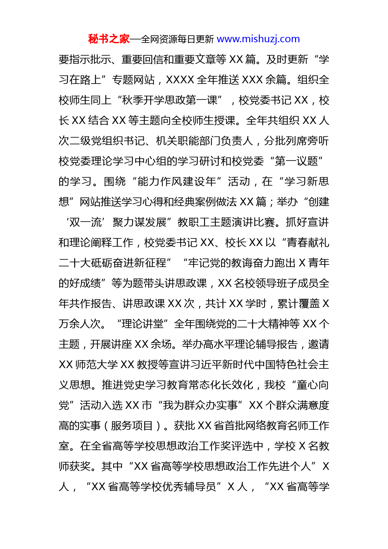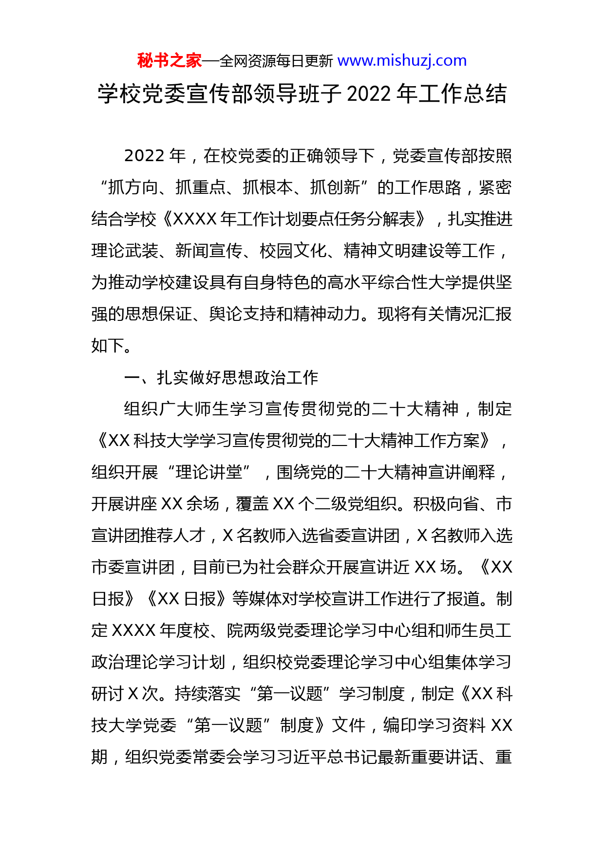 秘书之家—全网资源每日更新www.mishuzj.com学校党委宣传部领导班子2022年工作总结2022年,在校党委的正确领导下,党委宣传部按照“抓方向、抓重点、抓根本、抓创新”的工作思路,紧密结合学校《XXXX年工作计划要点任务分解表》,扎实推进理论武装、新闻宣传、校园文化、精神文明建设等工作,为推动学校建设具有自身特色的高水平综合性大学提供坚强的思想保证、舆论支持和精神动力。现将有关情况汇报如下。一、扎实做好思想政治工作组织广大师生学习宣传贯彻党的二十大精神,制定《XX科技大学学习宣传贯彻党的二十大精神工作方案》,组织开展“理论讲堂”,围绕党的二十大精神宣讲阐释,开展讲座XX余场,覆盖XX个二级党组织。积极向省、市宣讲团推荐人才,X名教师入选省委宣讲团,X名教师入选市委宣讲团,目前已为社会群众开展宣讲近XX场。《XX日报》《XX日报》等媒体对学校宣讲工作进行了报道。制定XXXX年度校、院两级党委理论学习中心组和师生员工政治理论学习计划,组织校党委理论学习中心组集体学习研讨X次。持续落实“第一议题”学习制度,制定《XX科技大学党委“第一议题”制度》文件,编印学习资料XX期,组织党委常委会学习习近平总书记最新重要讲话、重秘书之家—全网资源每日更新www.mishuzj.com要指示批示、重要回信和重要文章等XX篇。及时更新“学习在路上”专题网站,XXXX全年推送XXX余篇。组织全校师生同上“秋季开学思政第一课”,校党委书记XX,校长XX结合XX等主题向全校师生授课。全年共组织XX人次二级党组织书记、机关职能部门负责人,分批列席旁听校党委理论学习中心组的学习研讨和校党委“第一议题”的学习。围绕“能力作风建设年”活动,在“学习新思想”网站推送学习心得和经典案例做法XX篇;举办“创建‘双一流’聚力谋发展”教职工主题演讲比赛。抓好宣讲和理论阐释工作,校党委书记XX、校长XX以“青春献礼二十大砥砺奋进新征程”“牢记党的教诲奋力跑出X青年的好成绩”等为题带头讲思政课,XX名校领导班子成员全年共作报告、讲思政课XX次,共计XX学时,累计覆盖X万余人次。“理论讲堂”全年围绕党的二十大精神等XX个主题,开展讲座XX余场。举办高水平理论辅导报告,邀请XX师范大学XX教授等宣讲习近平新时代中国特色社会主义思想。推进党史学习教育常态化长效化,我校“童心向党”活动入选XX市“我为群众办实事”XX个群众满意度高的实事(服务项目)。获批XX省首批网络教育名师工作室。在全省高等学校思想政治工作奖评选中,学校X名教师获奖。其中“XX省高等学校思想政治工作先进个人”X人,“XX省高等学校优秀辅导员”X人,“XX省高等学秘书之家—全网资源每日更新www.mishuzj.com校优秀思想政治理论课教师”X人,“XX省高等学校优秀心理健康教育工作者”X人。二、创新做好新闻宣传工作重点围绕学习宣传党的二十大精神等年度重点工作扎实推进新闻宣传工作深入开展。全年采写、编辑并发布学校主页新闻XXX余篇,全面深入报道了我校在学科建设、科学研究、人才培养、社会服务、对外交流与合作等方面的工作成效和取得突出的成绩。完成学校新闻网的改版升级和建立校庆专题网站工作,做好重大活动的宣传策划、开展各类校庆宣传报道,全方位、多角度呈现校庆活动内容,生动展示学校建设发展成就。完成《XX科技大学校史(XXXX-XXXX)》审校、印刷,校庆画册整理、审校、印刷等工作。组织开展宣传思想队伍素质能力提升培训班,规范学校网站新闻、新媒体信息发布内容和发布程序,推动“三审三校”等阵地管理制度落地见效。校报共出版XX期校报,字数约XX万字,图片约XXX张,并上传网报、手机报,让师生们随时可以读校报、听校报、学理论、感党恩、抒心声。其中X件校报作品荣获XX省高校报好新闻奖。其中一等奖X项,二等奖X项,三等奖X项。大力加强与校外新闻媒体的联系与沟通,发布媒体XXXX余篇。其中,《XX》等被《人民日报》《光明日报》《中国青年报》《XX日报》、新华社、人民网、新华秘书之家—全网资源每日更新www.mishuzj.com网、学习强国、XX省教育厅等国家级、省市级主流媒体广泛宣传报道。其中,向媒体积极推送的“XX科技大学悄悄为XXXX名学生充值XX万元温暖餐补”这一暖心举措同时被人民日报、光明日报、中国青年报X家中央媒体及中国教育电视台、XX省教育厅、XX广播电视台等多家媒体广泛报道,人民日报微博视频浏览量达XXX万人次,充分反映了疫情期间学校对学生的关心关爱,极大地提升了学校的美誉度。学校在XX省“XXXX年度XX教育奖”评选活动中获评“XXXX年度XX高校(党建)宣传工作示范单位”“XXXX年度XX高等教育高质量发展示范院校”“XXXX年度社会认可的XX高等教育品牌院校”。学校获评XX高校XXXX-XXXX年度宣传先进单位卓越奖,X人获优秀通讯员,X篇新闻获优秀新闻作品一、三等奖。扎实推进融媒体建设,不断巩固壮大积极健康向上的主流网络思想舆论。XXXX年,学校官方微信发布推文XXX条,累计阅读量XXX万+,特色栏目包括携手抗疫共克时艰、X生活、重磅/权威发布、招生季、毕业季、点赞X、鼎青年及其他各类原创系列等。学校官方微博发布话题XXXX条,累计阅读量XXXX万+,主要包括#习语金句#太学夜读#、#鼎鼎课堂#、#Hauster自习室#、#鼎青年#等;QQ官方平台除日常说说板块以