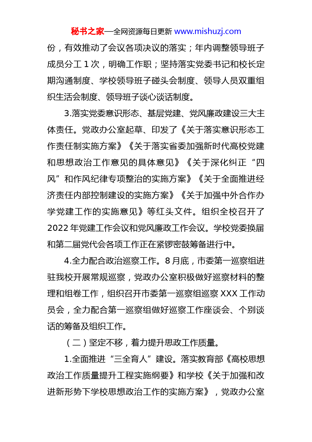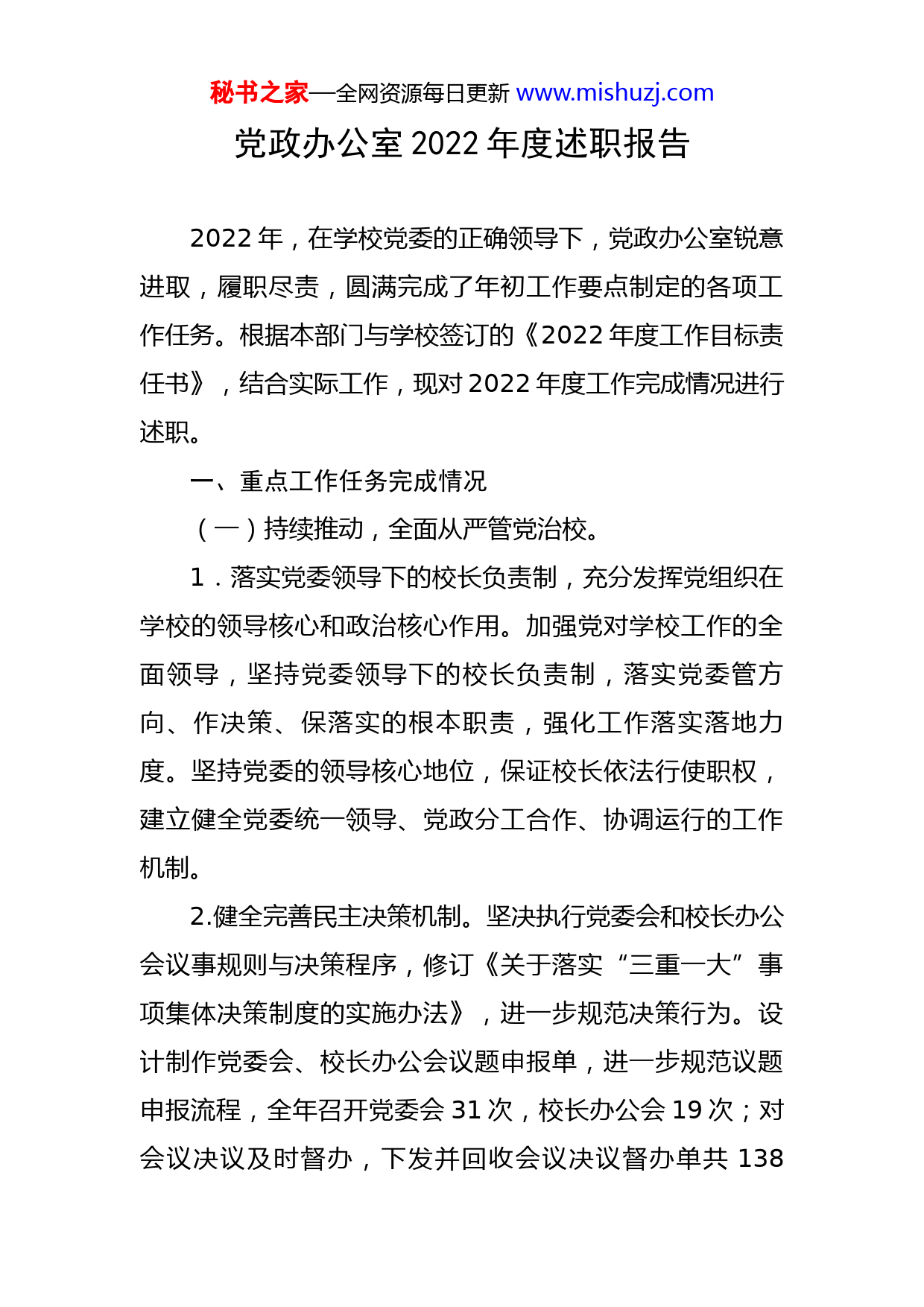 秘书之家—全网资源每日更新www.mishuzj.com党政办公室2022年度述职报告2022年,在学校党委的正确领导下,党政办公室锐意进取,履职尽责,圆满完成了年初工作要点制定的各项工作任务。根据本部门与学校签订的《2022年度工作目标责任书》,结合实际工作,现对2022年度工作完成情况进行述职。一、重点工作任务完成情况(一)持续推动,全面从严管党治校。1.落实党委领导下的校长负责制,充分发挥党组织在学校的领导核心和政治核心作用。加强党对学校工作的全面领导,坚持党委领导下的校长负责制,落实党委管方向、作决策、保落实的根本职责,强化工作落实落地力度。坚持党委的领导核心地位,保证校长依法行使职权,建立健全党委统一领导、党政分工合作、协调运行的工作机制。2.健全完善民主决策机制。坚决执行党委会和校长办公会议事规则与决策程序,修订《关于落实“三重一大”事项集体决策制度的实施办法》,进一步规范决策行为。设计制作党委会、校长办公会议题申报单,进一步规范议题申报流程,全年召开党委会31次,校长办公会19次;对会议决议及时督办,下发并回收会议决议督办单共138秘书之家—全网资源每日更新www.mishuzj.com份,有效推动了会议各项决议的落实;年内调整领导班子成员分工1次,明确工作职;坚持落实党委书记和校长定期沟通制度、学校领导班子碰头会制度、领导人员双重组织生活会制度、领导班子谈心谈话制度。3.落实党委意识形态、基层党建、党风廉政建设三大主体责任。党政办公室起草、印发了《关于落实意识形态工作责任制实施方案》《关于落实省委加强新时代高校党建和思想政治工作意见的具体意见》《关于深化纠正“四风”和作风纪律专项整治的实施方案》《关于全面推进经济责任内部控制建设的实施方案》《关于加强中外合作办学党建工作的实施意见》等红头文件。组织全校召开了2022年党建工作会议和党风廉政工作会议。学校党委换届和第二届党代会各项工作正在紧锣密鼓筹备进行中。4.全力配合政治巡察工作。8月底,市委第一巡察组进驻我校开展常规巡察,党政办公室积极做好巡察材料的整理和组卷工作,组织召开市委第一巡察组巡察XXX工作动员会,全力配合第一巡察组做好巡察工作座谈会、个别谈话的筹备及组织工作。(二)坚定不移,着力提升思政工作质量。1.全面推进“三全育人”建设。落实教育部《高校思想政治工作质量提升工程实施纲要》和学校《关于加强和改进新形势下学校思想政治工作的实施方案》,党政办公室秘书之家—全网资源每日更新www.mishuzj.com起草印发了《全面推进“课程思政”建设实施方案》《XXX全面推进“三全育人”建设实施方案》及建设主要任务分解书,并及时跟进督导各部门“三全育人”任务的落实,取得了一定成效。2.组织召开加强和改进学校思政工作座谈会。落实习近平总书记全国高校思想政治理论课教师座谈会讲话精神,扎扎实实办好高职思想政治理论课,6月9日,邀请、组织教育部“全国高校优秀思想政治理论课示范课百人巡讲团”成员、新疆农业职业技术学院马克思主义学院院长王学利教授;新疆职业大学马克思主义学院杨柯院长等专家来我校进行专题研讨。6月12日-13日,协助组织河北师范大学朱月龙教授来我校就思政教育教学工作进行指导交流,并与马克思主义学院、基础医学部教师进行座谈交流。8月10日组织召开马克思主义学院专兼职教师座谈会,为全面加强马克思主义学院建设,努力做好学生的思想政治教育工作打下坚实基础。全面落实中共中央办公厅、国务院办公厅《关于深化新时代学校思想政治理论课改革创新的若干意见》要求,组织书记、校长分别为学生上党课、思政课xx次,全体党委成员分别为师生党员上了xx次党课。(三)积极稳妥,全面加强意识形态工作。加强正面秘书之家—全网资源每日更新www.mishuzj.com教育引导,有效防范和抵御校园传教,防范网络舆情热点炒作与校园安全事件,守好政治安全底线,党政办公室起草、印发了《2022年安全稳定工作实施方案》《关于成立防范化解重大风险“集中排查月”工作领导小组的通知》《关于调整安全工作领导小组的通知》《紧急突发事件信息报告工作制度》《各岗位安全职责》《关于认真贯彻落实《xx省网络安全工作责任制实施细则》的实施意见》《留学生纪律教育及安全管理制度》《外国留学生突发及特殊情况紧急处理预案》等红头文件;起草了2022年XXXX学校防范非法集资宣传月活动工作方案;组织召开了2022年安全工作会议和安全稳定工作会议。(四)扎实推进,切实加强党风廉政建设。认真贯彻执行中共中央、国务院《关于实行党风廉政建设责任制的规定》和中共XXX学校委员会《关于党风廉政建设党委主体责任纪委监督责任的实施细则》的精神,3月19日组织召开政治性警示教育大会暨2022年党风廉政工作会议,与会同志一同观看了警示教育宣传片《在警醒中奋进》和《一抓到底正风纪》,部门负责人代表与党委书记XX签订了2022年党风廉政建设责任书,进一步强化了学校党员干部作风建设。召开党政办全体成员党风廉政建设专门会议,加强政治理论学习和廉洁性教育,组织成员观看《叩问初心》《蜕变的初心》等反腐倡廉警示教育片。秘书之家—全网资源每日更新www.mishuzj.com(五)综合