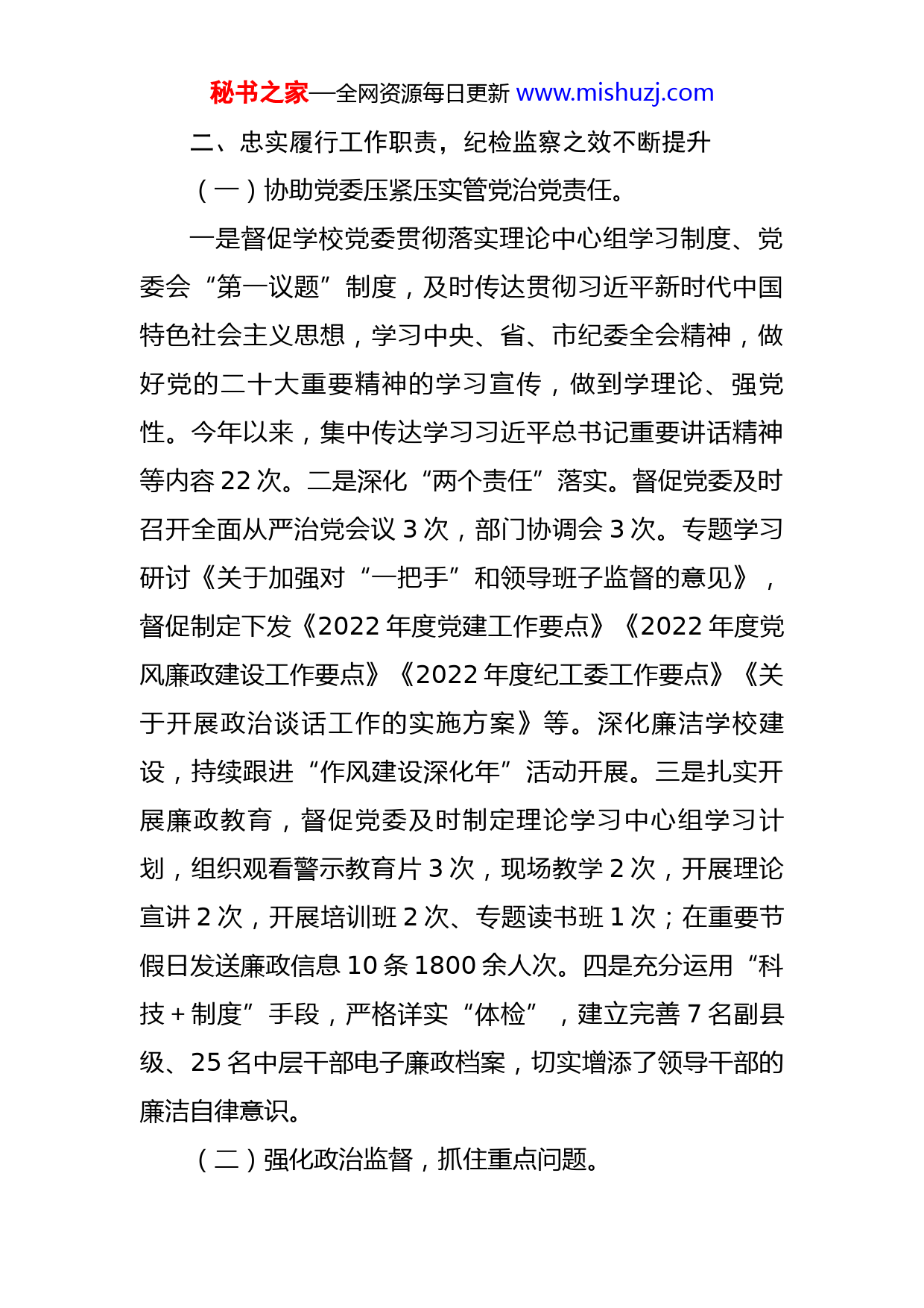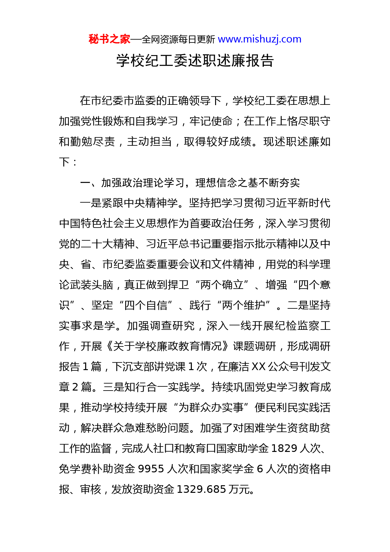 秘书之家—全网资源每日更新www.mishuzj.com学校纪工委述职述廉报告在市纪委市监委的正确领导下,学校纪工委在思想上加强党性锻炼和自我学习,牢记使命;在工作上恪尽职守和勤勉尽责,主动担当,取得较好成绩。现述职述廉如下:一、加强政治理论学习,理想信念之基不断夯实一是紧跟中央精神学。坚持把学习贯彻习近平新时代中国特色社会主义思想作为首要政治任务,深入学习贯彻党的二十大精神、习近平总书记重要指示批示精神以及中央、省、市纪委监委重要会议和文件精神,用党的科学理论武装头脑,真正做到捍卫“两个确立”、增强“四个意识”、坚定“四个自信”、践行“两个维护”。二是坚持实事求是学。加强调查研究,深入一线开展纪检监察工作,开展《关于学校廉政教育情况》课题调研,形成调研报告1篇,下沉支部讲党课1次,在廉洁XX公众号刊发文章2篇。三是知行合一实践学。持续巩固党史学习教育成果,推动学校持续开展“为群众办实事”便民利民实践活动,解决群众急难愁盼问题。加强了对困难学生资贫助贫工作的监督,完成人社口和教育口国家助学金1829人次、免学费补助资金9955人次和国家奖学金6人次的资格申报、审核,发放资助资金1329.685万元。秘书之家—全网资源每日更新www.mishuzj.com二、忠实履行工作职责,纪检监察之效不断提升(一)协助党委压紧压实管党治党责任。一是督促学校党委贯彻落实理论中心组学习制度、党委会“第一议题”制度,及时传达贯彻习近平新时代中国特色社会主义思想,学习中央、省、市纪委全会精神,做好党的二十大重要精神的学习宣传,做到学理论、强党性。今年以来,集中传达学习习近平总书记重要讲话精神等内容22次。二是深化“两个责任”落实。督促党委及时召开全面从严治党会议3次,部门协调会3次。专题学习研讨《关于加强对“一把手”和领导班子监督的意见》,督促制定下发《2022年度党建工作要点》《2022年度党风廉政建设工作要点》《2022年度纪工委工作要点》《关于开展政治谈话工作的实施方案》等。深化廉洁学校建设,持续跟进“作风建设深化年”活动开展。三是扎实开展廉政教育,督促党委及时制定理论学习中心组学习计划,组织观看警示教育片3次,现场教学2次,开展理论宣讲2次,开展培训班2次、专题读书班1次;在重要节假日发送廉政信息10条1800余人次。四是充分运用“科技+制度”手段,严格详实“体检”,建立完善7名副县级、25名中层干部电子廉政档案,切实增添了领导干部的廉洁自律意识。(二)强化政治监督,抓住重点问题。秘书之家—全网资源每日更新www.mishuzj.com一是抓住“廉洁工程”重点工作。以新校区建设为重点,切实推进“廉洁工程”项目。督促党委贯彻落实民主集中制、《党委会议事规则》、“三重一大”项目集体决策制度,重大决策全程纪实制度,主要领导“五不直接分管”和重大事项决策末位表态制度,确保权力行使有法可依,有章可循。今年以来共监督“三重一大”项目67个,对项目招标及物资采购等进行全程监督。2022年新校区建设项目通过招标方式选定监理工程、一标段、智慧校园建设、正式用电10V新建线路工程及配电工程设计单位,中标金额累计XXXXX万元;通过询价方式确定一桩一孔工勘项目、基桩检测及护坡监测项目设施单位及单价。对整个招标过程进行全过程、全方位的监督,规避权力寻租的风险和空间。二是开展专项检查和专项治理。围绕贯彻重大决策部署、教育收费工作、疫情防控、教师招聘、绩效工资考核发放、职称晋级以及资助工作等重点工作开展了12次专项监督检查。以“作风建设提升年”为契机,聚焦专项整治活动,督促党委开展了教育领域群众反映强烈问题专项整治工作、酒驾醉驾吃喝送礼歪风专项治理活动、公职人员不作为乱作为专项整治活动、“七个有之“专项治理活动以及严肃会风会纪整治活动等。三是抓住典型案例严肃执纪问责。在开展专项整治活动过程中,纪工委对2018年以来教育领域问题线索进行了过筛起底,建立了管秘书之家—全网资源每日更新www.mishuzj.com理台账,对2个信访件进行了筛查核实,严肃查处通报了3起工作履职不到位、违反工作纪律等问题,对1起酒驾事件进行倒查过筛、立案审查并给予党内警告处分,进一步严明了党的政治纪律和政治规矩,发挥警示教育作用。三、不足和打算回顾一年来的工作,虽然取得了一定的成效,但还存在一些问题和不足,主要是:政治监督方式方法有差距。目前,政治监督的方式主要还是听取汇报、个别谈话、查看台账资料等常规途径,容易造成重复监督,精细化、精准化发现问题的能力不够;调查研究还不够深入,特别是在构建基层监督体系、推进纪检干部队伍建设等方面,工作思路还不够开阔,改革创新意识还不够强,等等。对存在的这些问题和不足,将努力在今后的工作中认真加以改进。