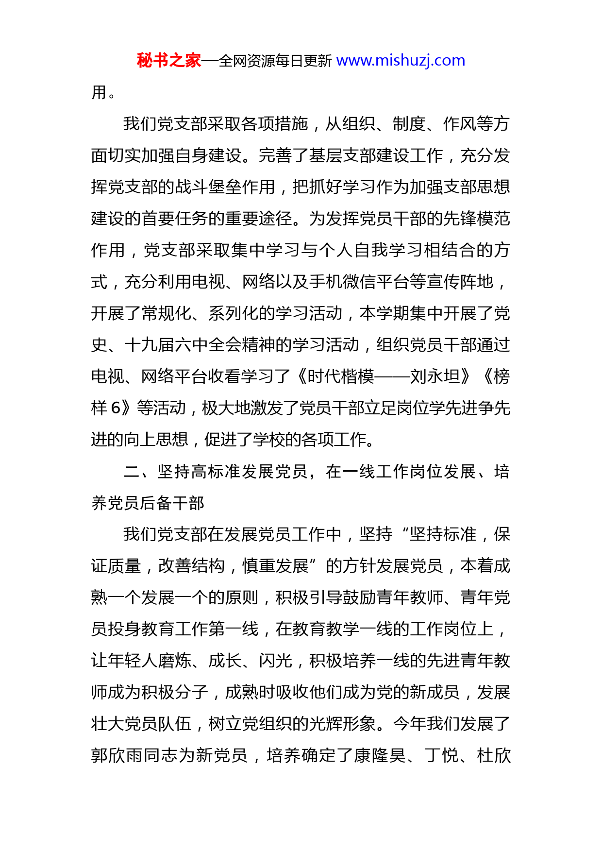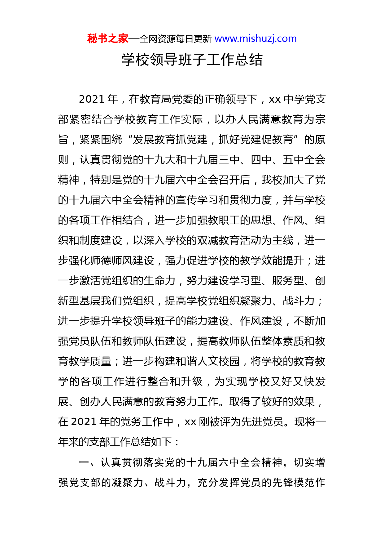 秘书之家—全网资源每日更新www.mishuzj.com学校领导班子工作总结2021年,在教育局党委的正确领导下,xx中学党支部紧密结合学校教育工作实际,以办人民满意教育为宗旨,紧紧围绕“发展教育抓党建,抓好党建促教育”的原则,认真贯彻党的十九大和十九届三中、四中、五中全会精神,特别是党的十九届六中全会召开后,我校加大了党的十九届六中全会精神的宣传学习和贯彻力度,并与学校的各项工作相结合,进一步加强教职工的思想、作风、组织和制度建设,以深入学校的双减教育活动为主线,进一步强化师德师风建设,强力促进学校的教学效能提升;进一步激活党组织的生命力,努力建设学习型、服务型、创新型基层我们党组织,提高学校党组织凝聚力、战斗力;进一步提升学校领导班子的能力建设、作风建设,不断加强党员队伍和教师队伍建设,提高教师队伍整体素质和教育教学质量;进一步构建和谐人文校园,将学校的教育教学的各项工作进行整合和升级,为实现学校又好又快发展、创办人民满意的教育努力工作。取得了较好的效果,在2021年的党务工作中,xx刚被评为先进党员。现将一年来的支部工作总结如下:一、认真贯彻落实党的十九届六中全会精神,切实增强党支部的凝聚力、战斗力,充分发挥党员的先锋模范作秘书之家—全网资源每日更新www.mishuzj.com用。我们党支部采取各项措施,从组织、制度、作风等方面切实加强自身建设。完善了基层支部建设工作,充分发挥党支部的战斗堡垒作用,把抓好学习作为加强支部思想建设的首要任务的重要途径。为发挥党员干部的先锋模范作用,党支部采取集中学习与个人自我学习相结合的方式,充分利用电视、网络以及手机微信平台等宣传阵地,开展了常规化、系列化的学习活动,本学期集中开展了党史、十九届六中全会精神的学习活动,组织党员干部通过电视、网络平台收看学习了《时代楷模——刘永坦》《榜样6》等活动,极大地激发了党员干部立足岗位学先进争先进的向上思想,促进了学校的各项工作。二、坚持高标准发展党员,在一线工作岗位发展、培养党员后备干部我们党支部在发展党员工作中,坚持“坚持标准,保证质量,改善结构,慎重发展”的方针发展党员,本着成熟一个发展一个的原则,积极引导鼓励青年教师、青年党员投身教育工作第一线,在教育教学一线的工作岗位上,让年轻人磨炼、成长、闪光,积极培养一线的先进青年教师成为积极分子,成熟时吸收他们成为党的新成员,发展壮大党员队伍,树立党组织的光辉形象。今年我们发展了郭欣雨同志为新党员,培养确定了康隆昊、丁悦、杜欣秘书之家—全网资源每日更新www.mishuzj.com宇、张琦为党员积极分子,在一线岗位上培养年轻党员教师冯琳琳、郭欣雨、宋丽娜、尹婉玉、窦玲玲、丁悦为学校年轻后备干部。在工作中给他们压担子,培养他们尽快成长,堪当大任。思想上进、工作踏实的年轻党员冯琳琳由于工作中的出色表现在今年被提拔为学校团委书记,并且被广大教职工推举为县委的新一届党代表。三、加强制度建设,进一步巩固党的基层组织建设,助力学校教育工作。加强制度建设,建立健全各项管理制度,进一步增强党员的政治意识、大局意识和责任意识,努力提高全体党员的政治素质,是党员发挥先进性的重要保证。党支部建立和完善了《“三会一课”制定》、《民主评议党员制定》、《党内民主监督制定》、《党内民主生活会制度》、《党支部议事制度》、《组织生活制度》、《教职工谈心制度》、《党员干部联系群众制度》、《党费收缴制度》、《教职工政治学习制度》等制度。“三会一课”制度是学校基层党组织长期坚持的重要制度,也是健全党的组织生活,严格党员管理,加强党员教育的重要制度。“三会一课”是加强党员党性意识的重要措施,是促使党员干部践行习近平新时期中国特色社会主义思想,做到增强“四个意识”、坚定“四个自信”、做到“两个维护”;全面贯彻党的教育方针,创造性地开展秘书之家—全网资源每日更新www.mishuzj.com教育教学工作的重要保障。在新的历史条件下,加强党的自身建设,仍需重视和坚持这一行之有效的制度,认真坚持“三会一课”制度,对于加强党支部建设,提高基层党组织的战斗力具有重要作用。健全“三会一课”,确保学习落到实处。根据学校教育工作实际,结合行政例会和学校各项教育教学工作活动会议,开展常态学习活动,力求形式多样化,提高活动的实效性。做到活动有主体、有活动记录和信息宣传报道,保证党内活动质量,增强党性观念,提高党员的政治素养。本学期我们党支部结合学校教育工作实际制定了《桦南县第三中学推进十九届六中全会精神进校园进课堂》活动方案。加大十九届六中全会精神的贯策学习,使之能进一步知道和促进我们的教育工作,提升办学质量,更好的创办人民满意的教育。四、结合“双减”工作转变工作作风加强师德建设,助力教学工作提高办学质量。结合“双减”工作的开展和师德师风建设,我们学校党支部组织党员同志及广大教职工认真学习国家“双减”工作的总体部署和工作要求,要求全体教师全面、准确地理解新时期教师职业道德的基本要求,进一步将规范要求秘书之家—全网资源每日更新www.mishuzj.com内化为教师的自觉行为,全面提高师德素养