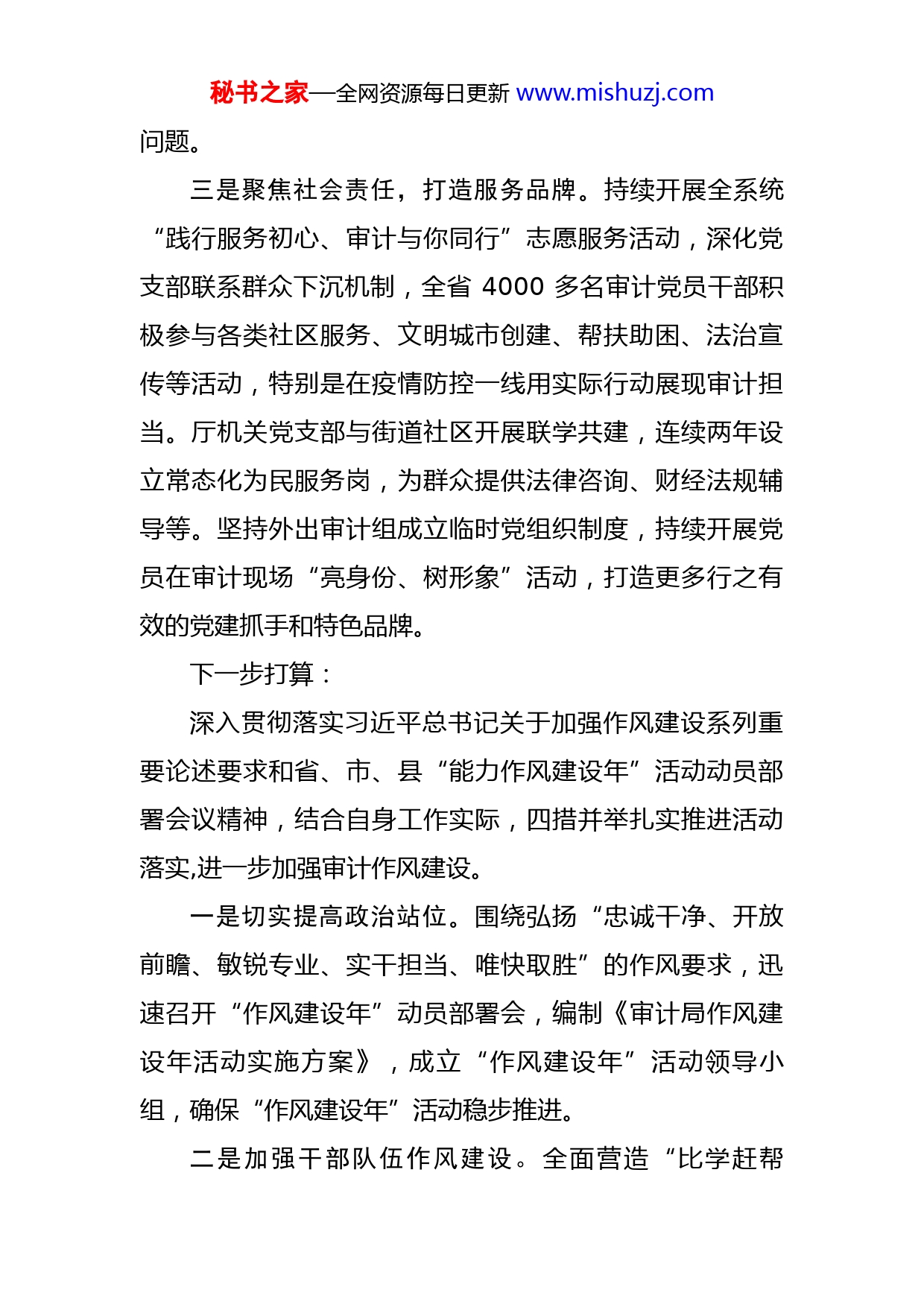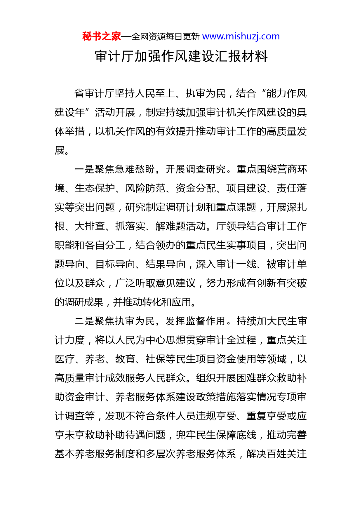 秘书之家—全网资源每日更新www.mishuzj.com审计厅加强作风建设汇报材料省审计厅坚持人民至上、执审为民,结合“能力作风建设年”活动开展,制定持续加强审计机关作风建设的具体举措,以机关作风的有效提升推动审计工作的高质量发展。一是聚焦急难愁盼,开展调查研究。重点围绕营商环境、生态保护、风险防范、资金分配、项目建设、责任落实等突出问题,研究制定调研计划和重点课题,开展深扎根、大排查、抓落实、解难题活动。厅领导结合审计工作职能和各自分工,结合领办的重点民生实事项目,突出问题导向、目标导向、结果导向,深入审计一线、被审计单位以及群众,广泛听取意见建议,努力形成有创新有突破的调研成果,并推动转化和应用。二是聚焦执审为民,发挥监督作用。持续加大民生审计力度,将以人民为中心思想贯穿审计全过程,重点关注医疗、养老、教育、社保等民生项目资金使用等领域,以高质量审计成效服务人民群众。组织开展困难群众救助补助资金审计、养老服务体系建设政策措施落实情况专项审计调查等,发现不符合条件人员违规享受、重复享受或应享未享救助补助待遇问题,兜牢民生保障底线,推动完善基本养老服务制度和多层次养老服务体系,解决百姓关注秘书之家—全网资源每日更新www.mishuzj.com问题。三是聚焦社会责任,打造服务品牌。持续开展全系统“践行服务初心、审计与你同行”志愿服务活动,深化党支部联系群众下沉机制,全省4000多名审计党员干部积极参与各类社区服务、文明城市创建、帮扶助困、法治宣传等活动,特别是在疫情防控一线用实际行动展现审计担当。厅机关党支部与街道社区开展联学共建,连续两年设立常态化为民服务岗,为群众提供法律咨询、财经法规辅导等。坚持外出审计组成立临时党组织制度,持续开展党员在审计现场“亮身份、树形象”活动,打造更多行之有效的党建抓手和特色品牌。下一步打算:深入贯彻落实习近平总书记关于加强作风建设系列重要论述要求和省、市、县“能力作风建设年”活动动员部署会议精神,结合自身工作实际,四措并举扎实推进活动落实,进一步加强审计作风建设。一是切实提高政治站位。围绕弘扬“忠诚干净、开放前瞻、敏锐专业、实干担当、唯快取胜”的作风要求,迅速召开“作风建设年”动员部署会,编制《审计局作风建设年活动实施方案》,成立“作风建设年”活动领导小组,确保“作风建设年”活动稳步推进。二是加强干部队伍作风建设。全面营造“比学赶帮秘书之家—全网资源每日更新www.mishuzj.com超”工作氛围,牢固树立“有为才有位”工作导向,强化责任、改进作风、狠抓落实,强化审计人员实干担当精神,确保在审计中敢于直面各种困难、矛盾和阻力,做到求真务实、敬业奉献。三是提升业务执行能力。坚持问题导向、目标导向、结果导向,明确整改措施、整改责任、整改期限,做到整改一个销号一个,切实解决干部纪律、执行落实等作风方面的存在问题,在全局树立改进作风、提升状态、破解难题的新风貌。四是开展能力作风建设知识测评。结合第十三届纪委二次全会和县委经济工作会暨三级干部会会议内容,在全局范围内开展能力作风建设应知应会知识测评,从而增强全体干部职工自我净化、自我完善、自我革新、自我提高的能力,更好的把“能力作风建设年”活动抓好抓实抓出成效。