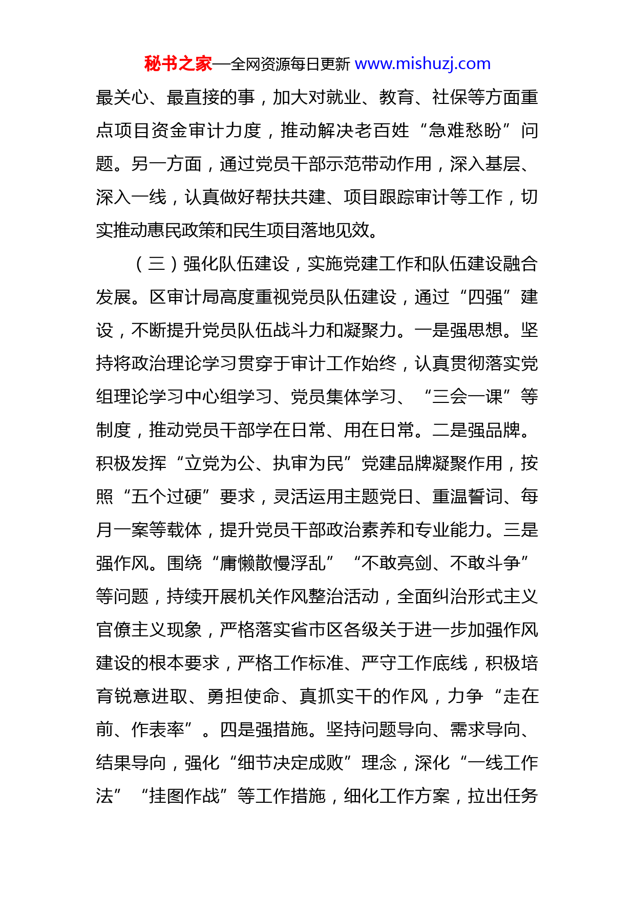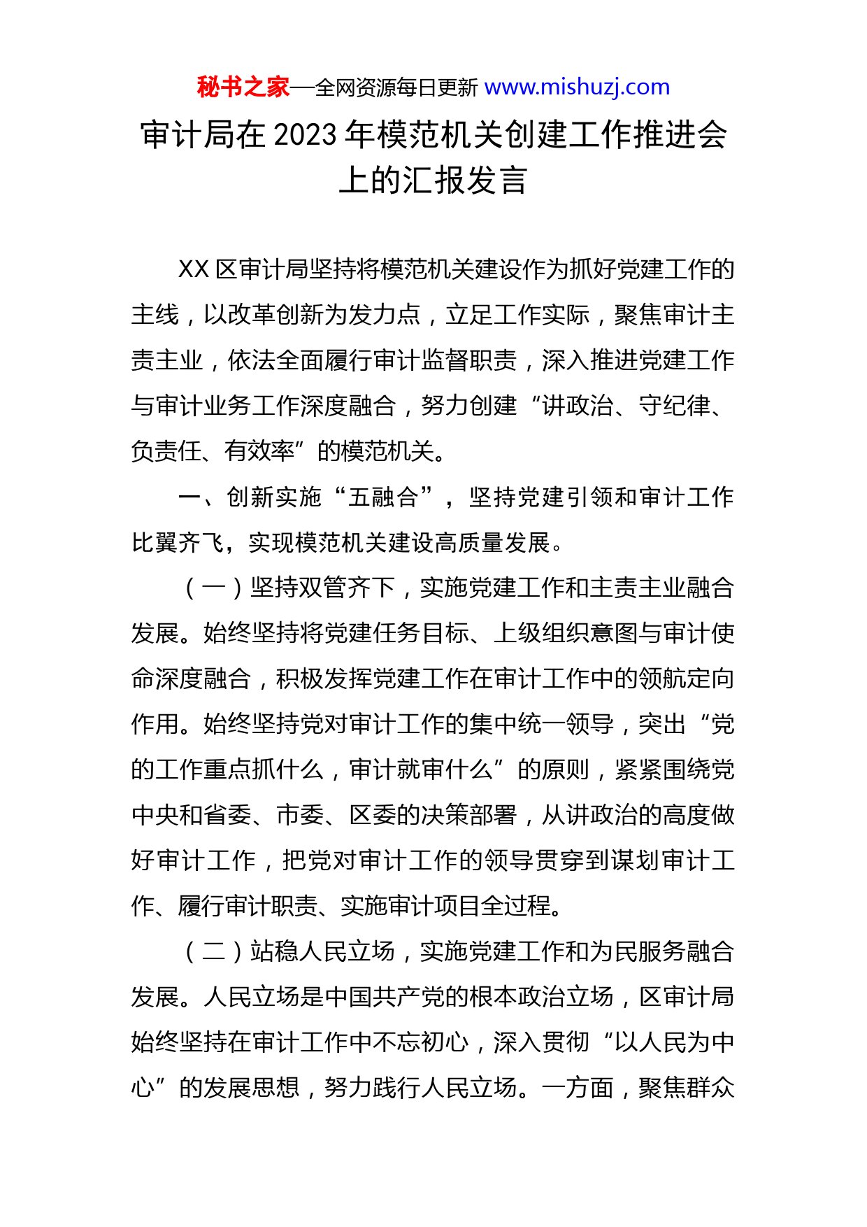 秘书之家—全网资源每日更新www.mishuzj.com审计局在2023年模范机关创建工作推进会上的汇报发言XX区审计局坚持将模范机关建设作为抓好党建工作的主线,以改革创新为发力点,立足工作实际,聚焦审计主责主业,依法全面履行审计监督职责,深入推进党建工作与审计业务工作深度融合,努力创建“讲政治、守纪律、负责任、有效率”的模范机关。一、创新实施“五融合”,坚持党建引领和审计工作比翼齐飞,实现模范机关建设高质量发展。(一)坚持双管齐下,实施党建工作和主责主业融合发展。始终坚持将党建任务目标、上级组织意图与审计使命深度融合,积极发挥党建工作在审计工作中的领航定向作用。始终坚持党对审计工作的集中统一领导,突出“党的工作重点抓什么,审计就审什么”的原则,紧紧围绕党中央和省委、市委、区委的决策部署,从讲政治的高度做好审计工作,把党对审计工作的领导贯穿到谋划审计工作、履行审计职责、实施审计项目全过程。(二)站稳人民立场,实施党建工作和为民服务融合发展。人民立场是中国共产党的根本政治立场,区审计局始终坚持在审计工作中不忘初心,深入贯彻“以人民为中心”的发展思想,努力践行人民立场。一方面,聚焦群众秘书之家—全网资源每日更新www.mishuzj.com最关心、最直接的事,加大对就业、教育、社保等方面重点项目资金审计力度,推动解决老百姓“急难愁盼”问题。另一方面,通过党员干部示范带动作用,深入基层、深入一线,认真做好帮扶共建、项目跟踪审计等工作,切实推动惠民政策和民生项目落地见效。(三)强化队伍建设,实施党建工作和队伍建设融合发展。区审计局高度重视党员队伍建设,通过“四强”建设,不断提升党员队伍战斗力和凝聚力。一是强思想。坚持将政治理论学习贯穿于审计工作始终,认真贯彻落实党组理论学习中心组学习、党员集体学习、“三会一课”等制度,推动党员干部学在日常、用在日常。二是强品牌。积极发挥“立党为公、执审为民”党建品牌凝聚作用,按照“五个过硬”要求,灵活运用主题党日、重温誓词、每月一案等载体,提升党员干部政治素养和专业能力。三是强作风。围绕“庸懒散慢浮乱”“不敢亮剑、不敢斗争”等问题,持续开展机关作风整治活动,全面纠治形式主义官僚主义现象,严格落实省市区各级关于进一步加强作风建设的根本要求,严格工作标准、严守工作底线,积极培育锐意进取、勇担使命、真抓实干的作风,力争“走在前、作表率”。四是强措施。坚持问题导向、需求导向、结果导向,强化“细节决定成败”理念,深化“一线工作法”“挂图作战”等工作措施,细化工作方案,拉出任务秘书之家—全网资源每日更新www.mishuzj.com清单、责任清单、进度清单,紧盯抓牢各个环节,坚持把每个细节做到位、做扎实。(四)聚焦务实创新,实施党建工作和创新创优融合发展。按照省委“十大创新”和市委“XX项改革创新行动”要求,积极向新技术、新模式、新方式要效益,以争先创优来体现党员的先进性。一是在审计质量上争先创优。突出质量第一,走在全市前列,积极推进审计项目落实,全力抓好审计项目质量。二是在审计方式上争先创优。解放思想,大胆探索,深入推进以大数据审计为核心的“智慧审计”建设。三是在审计理念上争先创优。在投资审计工作中,将审计视野从单纯造价审核拓展到项目建设管理全流程,进一步强化政府投资项目审计监督。(五)筑牢廉洁防线,实施党建工作和党风廉政融合发展。始终坚持把党风廉政建设作为审计工作的“高压线”和“生命线”,通过建立“四项制度”、把好“四关”,进一步织牢制度治审防火墙。一是建立审前廉政谈话制度,把好审前提醒关。在项目审计进点前,实行廉政承诺制和集体谈话制度,提前抓好提醒警示,压实廉政责任。二是建立进点公示制度,把好进点公示纪律关。审计组进点时,主动在被审计单位醒目位置张贴审计公示和审计人员廉政纪律,公布举报监督电话,主动接受被审计单位监督。三是建立现场监督制度,把好现场审计关。通过秘书之家—全网资源每日更新www.mishuzj.com开展不定期督查检查,督促审计组严格履行相关廉政规定,做到发现问题早纠正、早处理。四是建立审后回访制度,把好审后廉政回访关。对已完成的审计项目,通过发放廉政回访问卷调查表的形式,进行廉政回访,进一步深化廉政建设,维护风清气正的政治生态。二、立足审计抓党建、抓好党建促审计的工作思路全面落实新时代党的建设总要求,通过积极实施党建工作和审计工作“五融合”发展,实现了党建工作与审计工作的同频共振、创新发展。(一)实现了政治建审,提高了政治站位,强化了机关建设。通过融合发展,促使局党组牢牢把握审计机关首先是政治机关定位,做到坚决扛起管党治党主体责任,强化了党组书记“第一责任人”职责和班子成员“一岗双责”,层层压实了各级党建工作责任。通过从思想建设入手,严格落实党组理论中心组集中学习、党员集体学习等制度,教育引导党员干部深刻领会了“两个确立”的决定性意义,自觉在审计实践中把握政治导向、落实政治要求,以实际行动坚决做到了“两个维护”。通过牢固树立“党的一切工作到支部”的鲜明导向,持续推进局党建工作取得良好成绩。(二)实现了业务强审,强化