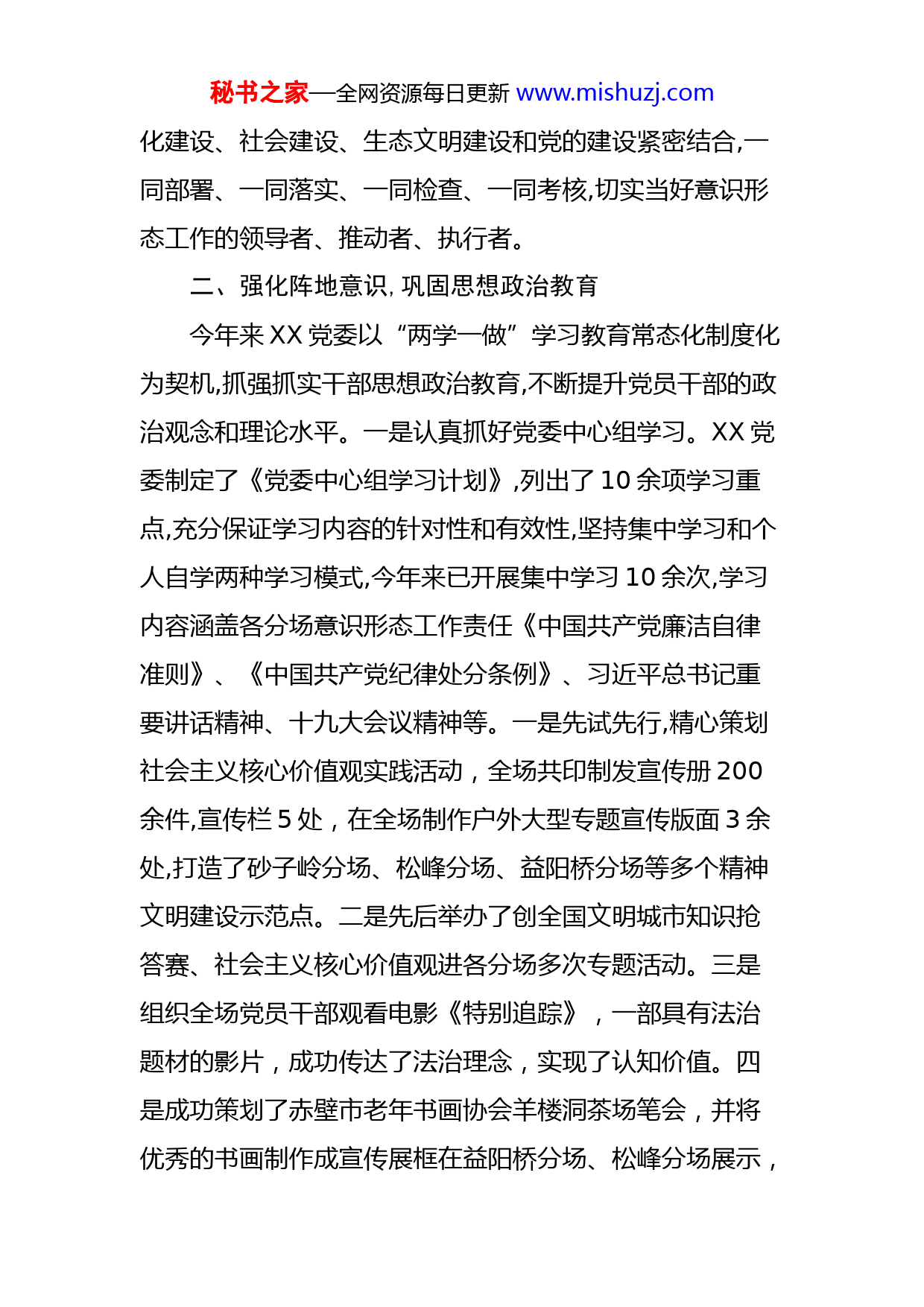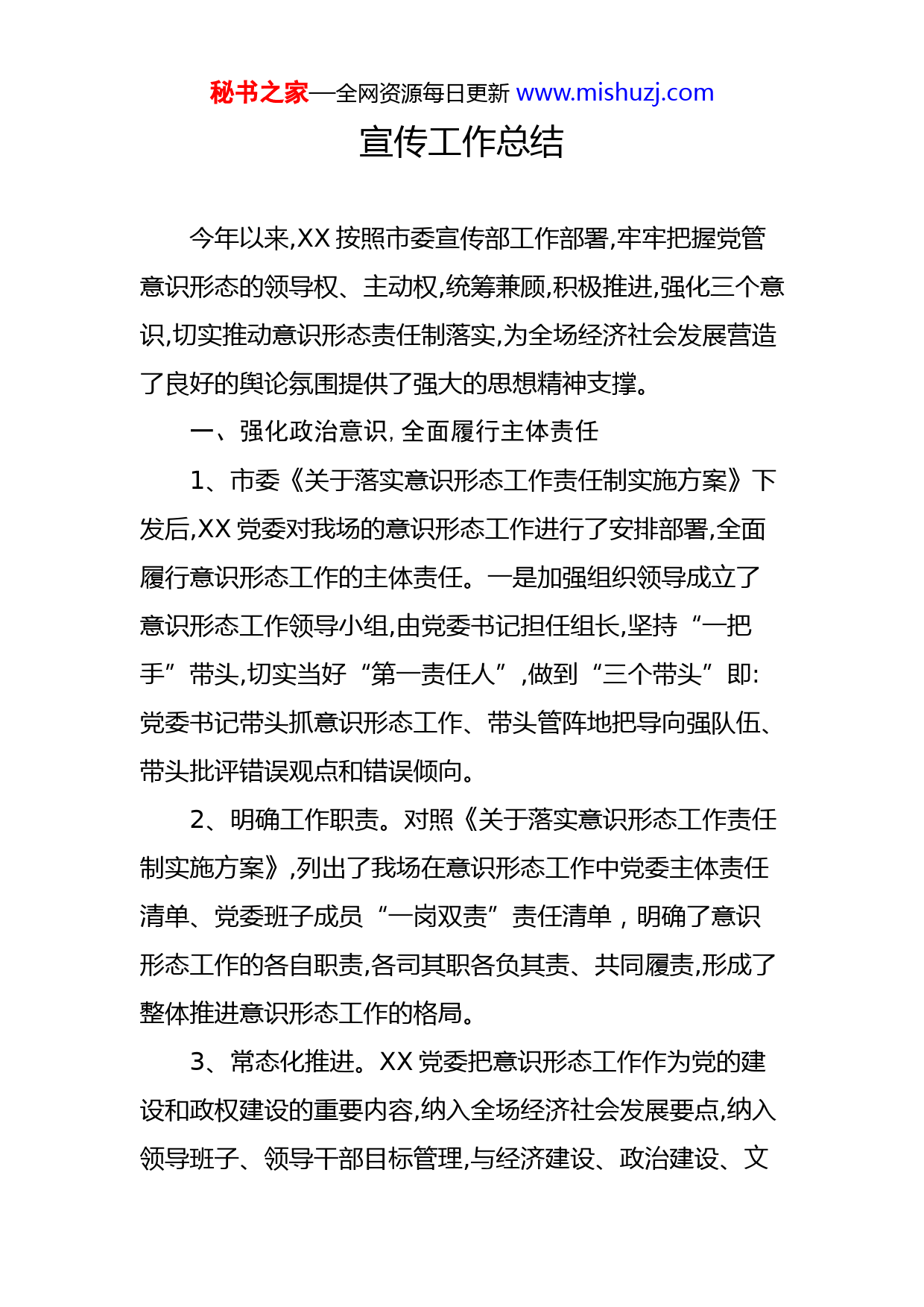 秘书之家—全网资源每日更新www.mishuzj.com宣传工作总结今年以来,XX按照市委宣传部工作部署,牢牢把握党管意识形态的领导权、主动权,统筹兼顾,积极推进,强化三个意识,切实推动意识形态责任制落实,为全场经济社会发展营造了良好的舆论氛围提供了强大的思想精神支撑。一、强化政治意识,全面履行主体责任1、市委《关于落实意识形态工作责任制实施方案》下发后,XX党委对我场的意识形态工作进行了安排部署,全面履行意识形态工作的主体责任。一是加强组织领导成立了意识形态工作领导小组,由党委书记担任组长,坚持“一把手”带头,切实当好“第一责任人”,做到“三个带头”即:党委书记带头抓意识形态工作、带头管阵地把导向强队伍、带头批评错误观点和错误倾向。2、明确工作职责。对照《关于落实意识形态工作责任制实施方案》,列出了我场在意识形态工作中党委主体责任清单、党委班子成员“一岗双责”责任清单,明确了意识形态工作的各自职责,各司其职各负其责、共同履责,形成了整体推进意识形态工作的格局。3、常态化推进。XX党委把意识形态工作作为党的建设和政权建设的重要内容,纳入全场经济社会发展要点,纳入领导班子、领导干部目标管理,与经济建设、政治建设、文秘书之家—全网资源每日更新www.mishuzj.com化建设、社会建设、生态文明建设和党的建设紧密结合,一同部署、一同落实、一同检查、一同考核,切实当好意识形态工作的领导者、推动者、执行者。二、强化阵地意识,巩固思想政治教育今年来XX党委以“两学一做”学习教育常态化制度化为契机,抓强抓实干部思想政治教育,不断提升党员干部的政治观念和理论水平。一是认真抓好党委中心组学习。XX党委制定了《党委中心组学习计划》,列出了10余项学习重点,充分保证学习内容的针对性和有效性,坚持集中学习和个人自学两种学习模式,今年来已开展集中学习10余次,学习内容涵盖各分场意识形态工作责任《中国共产党廉洁自律准则》、《中国共产党纪律处分条例》、习近平总书记重要讲话精神、十九大会议精神等。一是先试先行,精心策划社会主义核心价值观实践活动,全场共印制发宣传册200余件,宣传栏5处,在全场制作户外大型专题宣传版面3余处,打造了砂子岭分场、松峰分场、益阳桥分场等多个精神文明建设示范点。二是先后举办了创全国文明城市知识抢答赛、社会主义核心价值观进各分场多次专题活动。三是组织全场党员干部观看电影《特别追踪》,一部具有法治题材的影片,成功传达了法治理念,实现了认知价值。四是成功策划了赤壁市老年书画协会羊楼洞茶场笔会,并将优秀的书画制作成宣传展框在益阳桥分场、松峰分场展示,秘书之家—全网资源每日更新www.mishuzj.com在全场营造了,良好茶园文化风尚,受到全场的关注。五是庆祝中华人民共和国成立70周年举行了全市“我和我的祖国”大型群众性合唱比赛,展现了积极向上的的精神面貌,丰富了党员干部的文化生活。三、强化创新意识,夯实宣传思想基础今年来,XX党委树立创新意识,善待、善管、善用网络媒体牢牢掌控网络意识形态主动权。一是加大新闻宣传力度。全场共上稿30余篇,其中:云上咸宁8篇、云上赤壁9篇,同时,积极上报每月分析研判工作。二是全面提升志愿服务活动。统一定制了30余件羊楼洞茶场志愿者服装,积极参加全场洁城活动、各分场垃圾清理工作、XX党委“不忘初心、牢记使命”烈士陵园志愿者扫墓活动。同时,我们也清醒地看到我场的宣传思想工作,还存在着一定的差距和不足。在今后的工作中,我们将继续按照市委宣传部的统一部署,坚持把意识形态工作放在心上、扛在肩上、抓在手上、落实在行动上,切实做到守土有责、守土负责、守土尽责,建设美丽幸福和谐新正和提供有力的思想保障和舆论支撑。