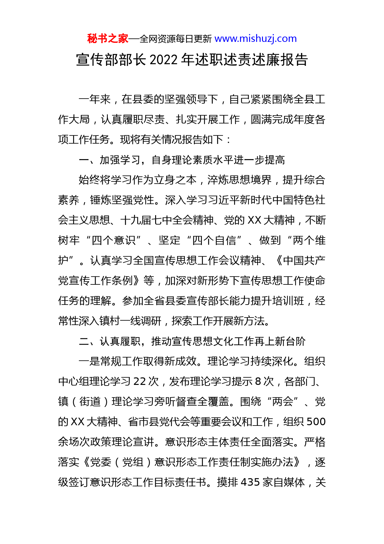 秘书之家—全网资源每日更新www.mishuzj.com宣传部部长2022年述职述责述廉报告一年来,在县委的坚强领导下,自己紧紧围绕全县工作大局,认真履职尽责、扎实开展工作,圆满完成年度各项工作任务。现将有关情况报告如下:一、加强学习,自身理论素质水平进一步提高始终将学习作为立身之本,淬炼思想境界,提升综合素养,锤炼坚强党性。深入学习习近平新时代中国特色社会主义思想、十九届七中全会精神、党的XX大精神,不断树牢“四个意识”、坚定“四个自信”、做到“两个维护”。认真学习全国宣传思想工作会议精神、《中国共产党宣传工作条例》等,加深对新形势下宣传思想工作使命任务的理解。参加全省县委宣传部长能力提升培训班,经常性深入镇村一线调研,探索工作开展新方法。二、认真履职,推动宣传思想文化工作再上新台阶一是常规工作取得新成效。理论学习持续深化。组织中心组理论学习22次,发布理论学习提示8次,各部门、镇(街道)理论学习旁听督查全覆盖。围绕“两会”、党的XX大精神、省市县党代会等重要会议和工作,组织500余场次政策理论宣讲。意识形态主体责任全面落实。严格落实《党委(党组)意识形态工作责任制实施办法》,逐级签订意识形态工作目标责任书。摸排435家自媒体,关秘书之家—全网资源每日更新www.mishuzj.com停违法违规微信公众号7个,共监测200余条舆情,督办回复率100%,为党的XX大等重大活动营造了良好舆论环境。认真开展“四力”教育,优化职能配置,选优配强干部队伍,建立基层宣传思想文化战线干部选调学习锻炼机制,广大干部职工理论水平不断提升、工作本领持续增强。“扫黄打非”进基层站点全覆盖,有效维护了基层意识形态和文化安全。精神文明创建蓬勃开展。持续推进社会主义核心价值观“八进”工程,印制《社会主义核心价值观宣传教育指导手册》。持续深化“美丽乡村文明家园”建设工程,扎实推进农村移风易俗工作,设立“道德红黑榜”,“一约四会”制度进一步修订完善,105个单位获县级和市级先进集体。二是重要安排部署取得新进展。全力推动以“两中心一平台”为主的宣传思想工作新安排、新部署。新时代文明实践中心试点工作,展厅建成开放,全县1399个阵地资源完成整合,镇所村站建设全面完成。编印《新时代文明实践工作手册》,开展知识答题。开发新时代文明实践智慧云网络信息管理平台,实现了PC端、APP端和微信端工作联动,组建三级志愿服务队,首批骨干志愿者孵化培训班顺利开班,全县志愿服务队242支,志愿者15233人,服务项目75个,开展活动1000多场次。融媒体中心顺利挂牌,新建300平方米指挥调度中心,全年播发新闻、专秘书之家—全网资源每日更新www.mishuzj.com题5000多条。市级以上媒体刊播(发)稿件1000余条(篇),中省级200条(篇)。“学习强国”学习平台实现党员注册全覆盖,供稿链路全打通,全年向上供稿60余篇。三是推动文化事业不断满足人民群众精神文化生活新需求。文化产业实力日益提升。新增规上文化企业3户,全年规上文化企业完成销售收入6420万元,同比增长29.97%,举办大合唱比赛、红歌快闪、诗词大赛、朗诵比赛等活动。围绕乡村振兴、扫黑除恶、文化进基层等,开展文化讲坛、数字电影放映等活动1400余场次。三、廉洁从政,纪律意识和规矩意识更加牢固始终保持忠诚坚定。坚决拥护县委权威,深刻学习党史、新中国史,理想信念更强化,对党的宗旨理解更深刻。严格遵守党章党规,自觉按程序办事、按准则办事,守住共产党员为人、做事基准和底线。自觉维护班子团结,服从大局,听从指挥。严格履行“一岗双责”,严格管好自己亲属和身边工作人员,朋友圈更纯洁、生活圈更净化。一年来,自己虽然取得了一定成绩,但与组织要求和人民群众期待相比,还有一定差距。今后工作中,我将更加严格要求自己,不忘初心、牢记使命,奋力进取、开拓创新,更好完成新形势下宣传思想工作使命任务,为助推秘书之家—全网资源每日更新www.mishuzj.com县域经济高质量发展做出更大贡献。