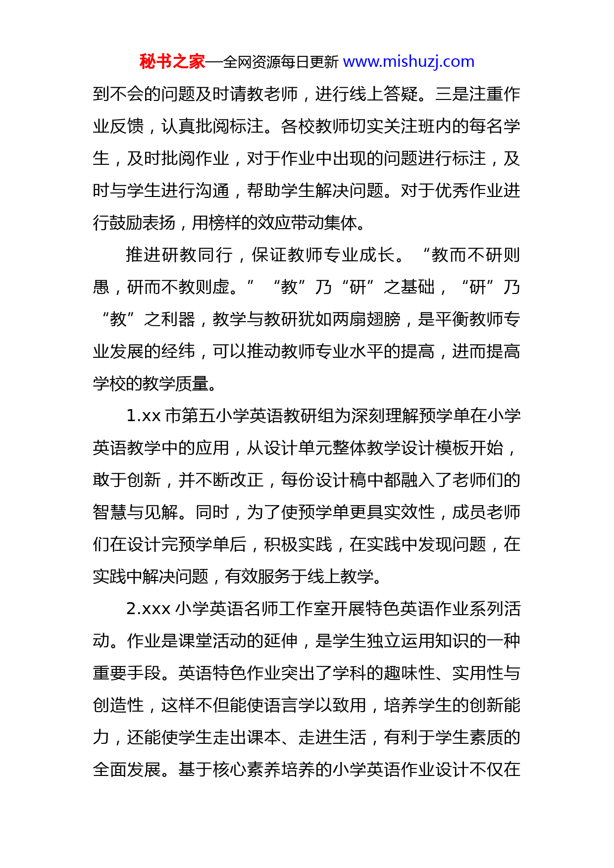 秘书之家—全网资源每日更新www.mishuzj.com小学线上教学工作情况汇报xx区教育和体育局认真贯彻学习《xx省教育厅关于做好线上教学有关工作的通知》,同时结合我区实际情况,总结以往线上教学经验,第一时间就线上教学进行安排部署,相继下发《xx市xx区教育和体育局关于做好线上教学工作的通知》和《xx市xx区教育和体育局关于开展线上教学工作中重点注意事项的通知》。对于线上教学中的课程、课时、时长、内容、作业、教学资源等方面进行了详细、科学的布置。制定科学合理方案,保证线上教学有序进行。一是各校成立线上教学领导小组,从工作协调安排,课程的统筹安排、信息技术攻关、教学资源保障、教学质量监督、学生参与普及等方面安排专人负责,制定本校科学合理的线上教学指导方案。二是各校学科组长、教研组长、年级组长针对本年级、本学科的实际教学情况,制定个人教学计划、授课计划、课件制作、教学重难点、作业布置批阅等研讨方案,确保线上教学有序开展。创设多种形式教学,保证学生学有所获。一是各校结合本校实际采用钉钉群、晓黑板、腾讯会议、微信群等网络平台,开展线上教学。二是开展线上答疑,鼓励学生遇秘书之家—全网资源每日更新www.mishuzj.com到不会的问题及时请教老师,进行线上答疑。三是注重作业反馈,认真批阅标注。各校教师切实关注班内的每名学生,及时批阅作业,对于作业中出现的问题进行标注,及时与学生进行沟通,帮助学生解决问题。对于优秀作业进行鼓励表扬,用榜样的效应带动集体。推进研教同行,保证教师专业成长。“教而不研则愚,研而不教则虚。”“教”乃“研”之基础,“研”乃“教”之利器,教学与教研犹如两扇翅膀,是平衡教师专业发展的经纬,可以推动教师专业水平的提高,进而提高学校的教学质量。1.xx市第五小学英语教研组为深刻理解预学单在小学英语教学中的应用,从设计单元整体教学设计模板开始,敢于创新,并不断改正,每份设计稿中都融入了老师们的智慧与见解。同时,为了使预学单更具实效性,成员老师们在设计完预学单后,积极实践,在实践中发现问题,在实践中解决问题,有效服务于线上教学。2.xxx小学英语名师工作室开展特色英语作业系列活动。作业是课堂活动的延伸,是学生独立运用知识的一种重要手段。英语特色作业突出了学科的趣味性、实用性与创造性,这样不但能使语言学以致用,培养学生的创新能力,还能使学生走出课本、走进生活,有利于学生素质的全面发展。基于核心素养培养的小学英语作业设计不仅在秘书之家—全网资源每日更新www.mishuzj.com于鼓励学生积极完成作业,更在于培养学生的思维品质、学习能力、文化品格和语言能力,激发学生进行多方面的感官体验,在愉悦的情境中获取知识,积累愉快而丰富的经历,使学生的知、情、意、行得到协调发展。